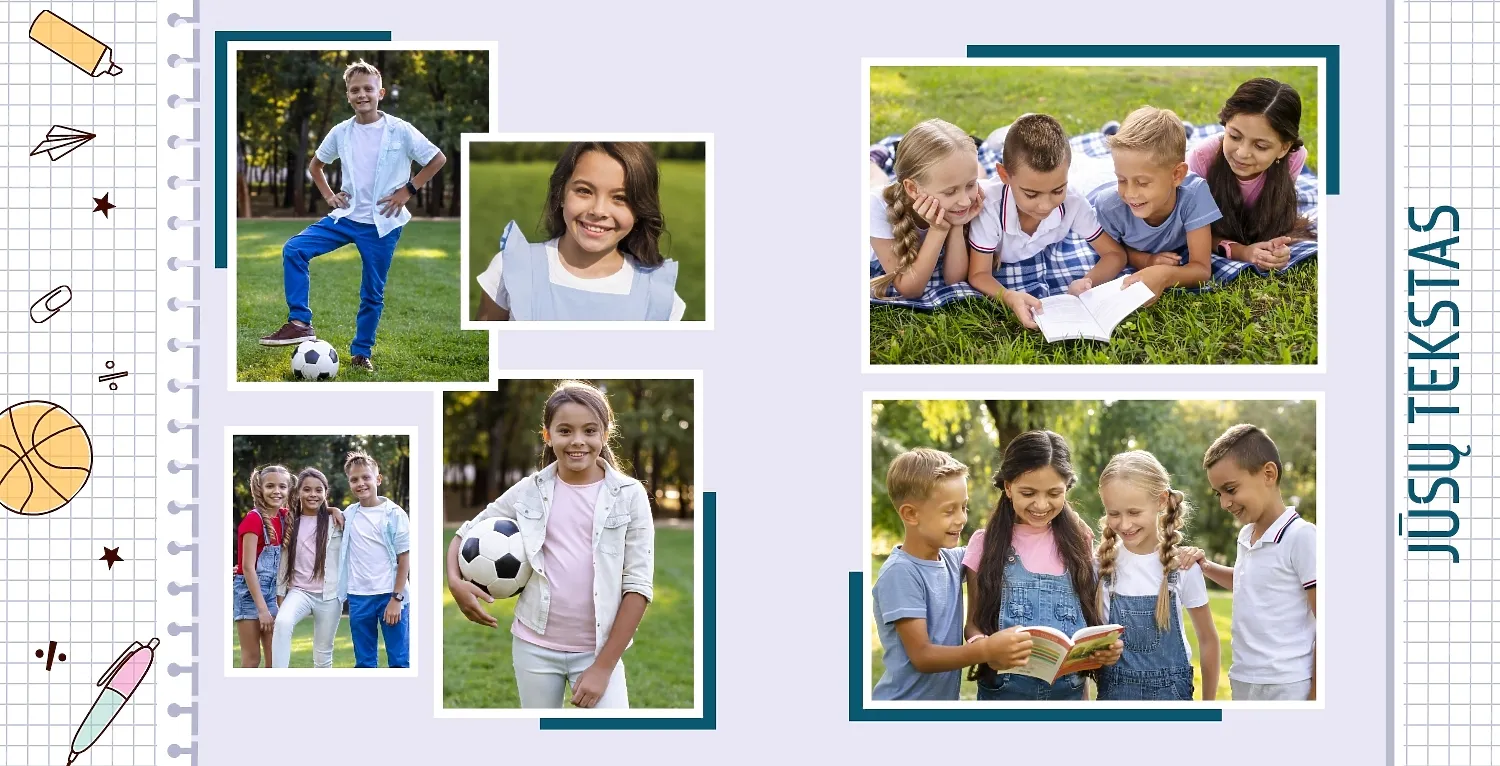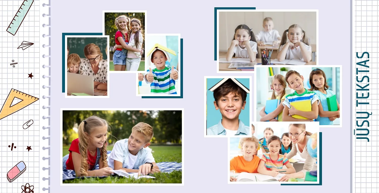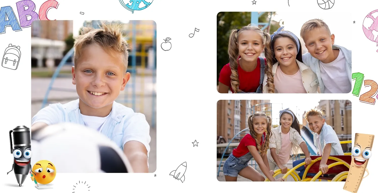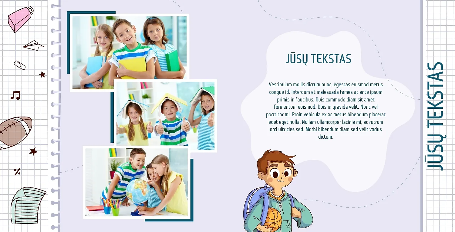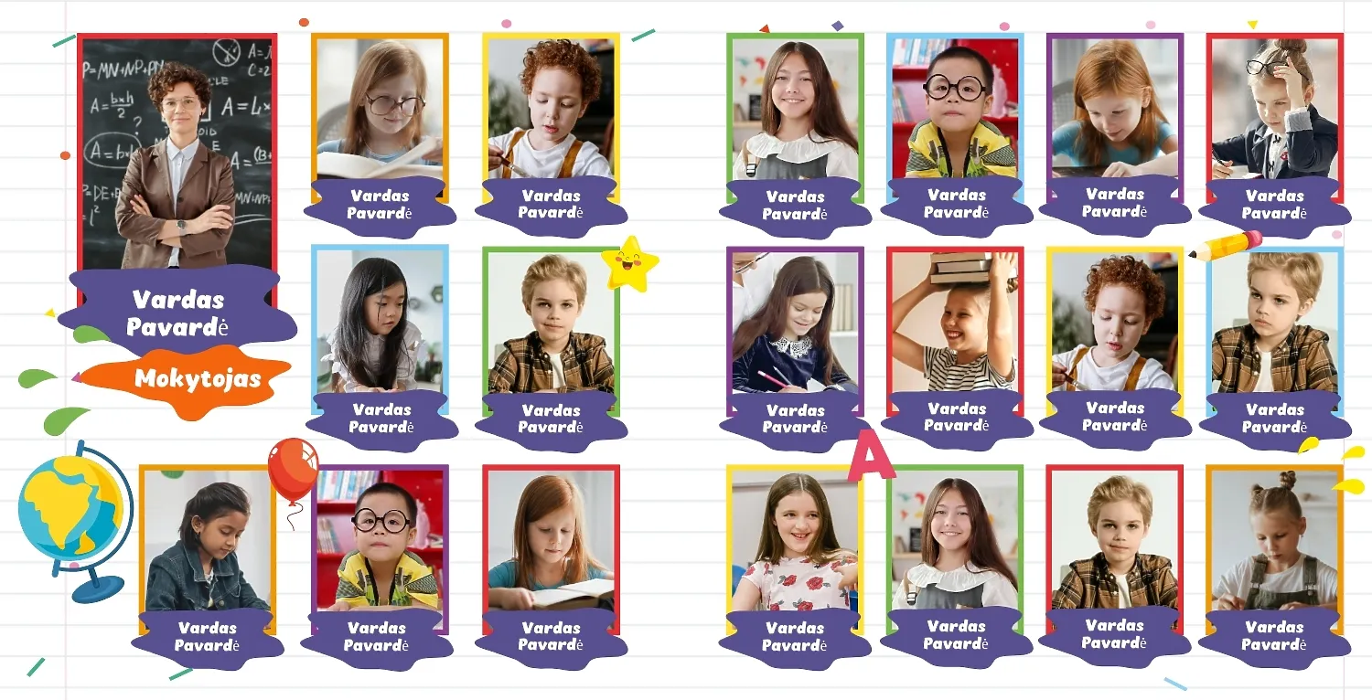 Baigimo fotoknygos šablonas jaunesniajai mokyklai-spalvingas ir jaudinantis apipavidalinimas, kuris padės išsaugoti pačius šilčiausius pirmųjų mokyklinių metų prisiminimus. Šablono dizainas sukurtas atsižvelgiant į vaikų temą: ryškios iliustracijos, subtilios spalvos, elementai, primenantys mokyklos gyvenimą – knygos, pieštukai, įrašų lentos. Internetiniame dizaineryje šį šabloną galima lengvai pakeisti, kad jis būtų unikalus. Vartotojas gali pridėti ir perkelti nuotraukas, keisti šriftus, redaguoti teksto blokus su pageidavimais ir parašais, taip pat pakeisti dekoratyvinius elementus tinkamesniu stiliumi. Galimybė pasirinkti spalvų schemą leidžia fotoknygą padaryti švelnesnę arba, atvirkščiai, prisotintą, priklausomai nuo pageidavimų. Jei pageidaujate, galite įterpti mokyklos logotipą arba individualias iliustracijas, kad pabrėžtumėte išleidimo ypatybę.