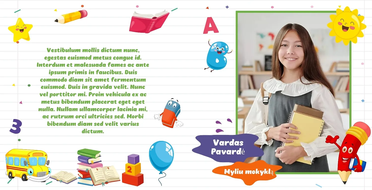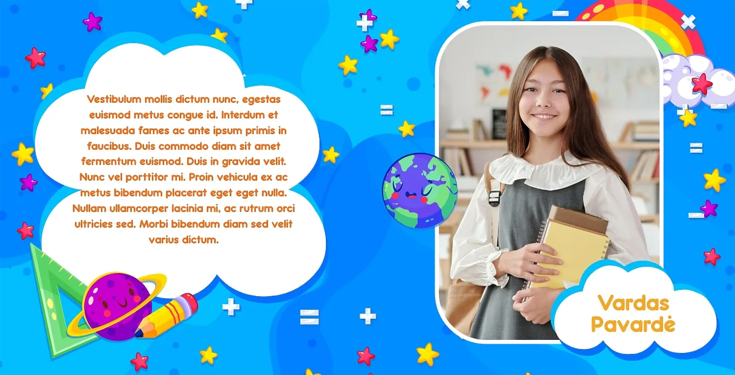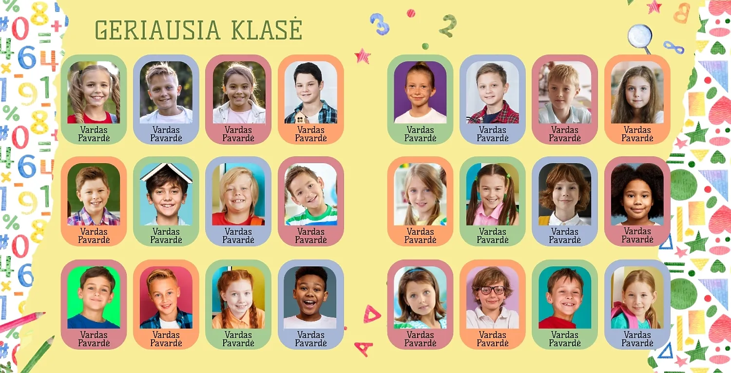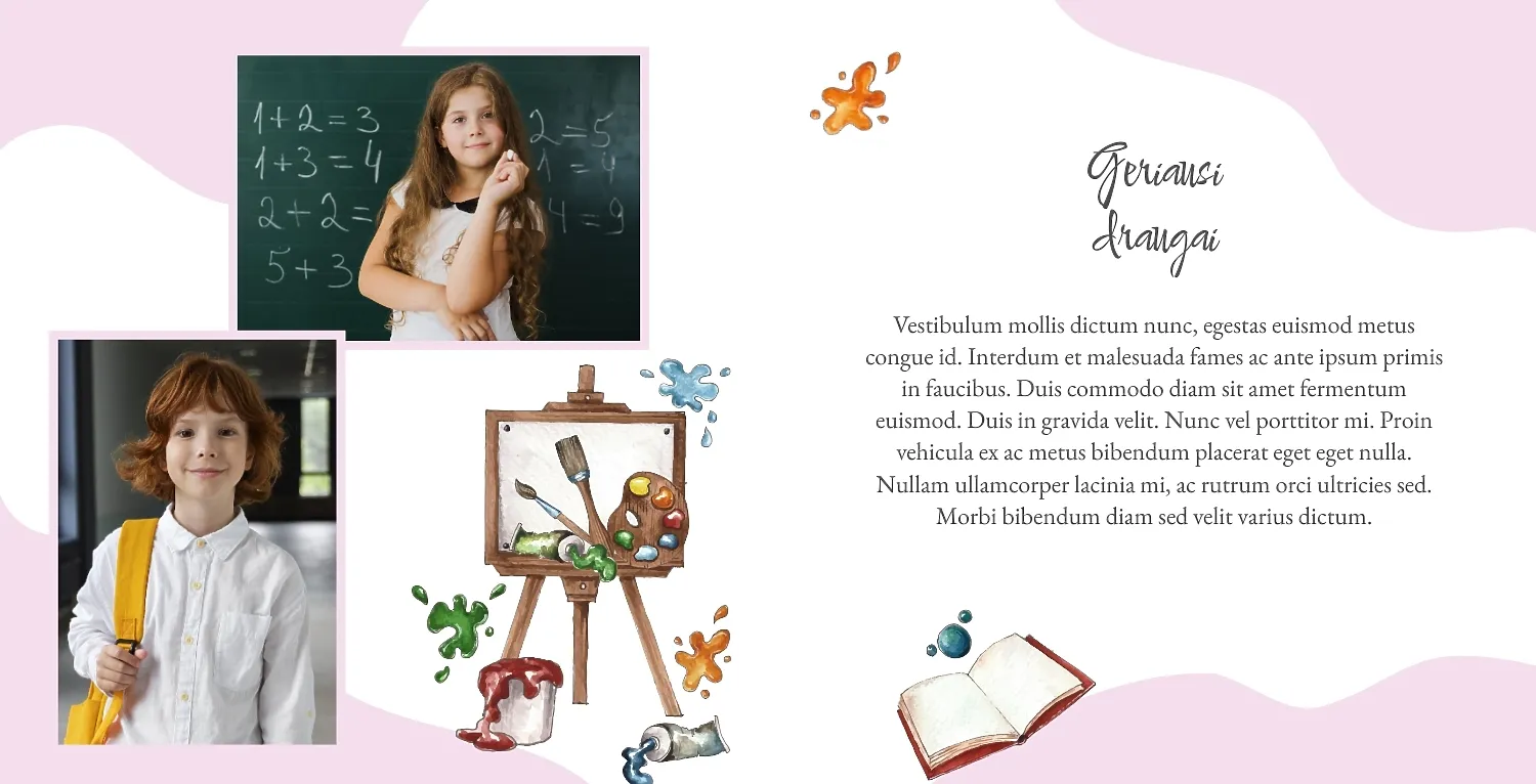 Baigimo fotoknygos šablonas jaunesniajai mokyklai-spalvingas ir jaudinantis apipavidalinimas, kuris padės išsaugoti pačius šilčiausius pirmųjų mokyklinių metų prisiminimus. Šablono dizainas sukurtas atsižvelgiant į vaikų temą: ryškios iliustracijos, subtilios spalvos, elementai, primenantys mokyklos gyvenimą – knygos, pieštukai, įrašų lentos. Internetiniame dizaineryje šį šabloną galima lengvai pakeisti, kad jis būtų unikalus. Vartotojas gali pridėti ir perkelti nuotraukas, keisti šriftus, redaguoti teksto blokus su pageidavimais ir parašais, taip pat pakeisti dekoratyvinius elementus tinkamesniu stiliumi. Galimybė pasirinkti spalvų schemą leidžia fotoknygą padaryti švelnesnę arba, atvirkščiai, prisotintą, priklausomai nuo pageidavimų. Jei pageidaujate, galite įterpti mokyklos logotipą arba individualias iliustracijas, kad pabrėžtumėte išleidimo ypatybę.