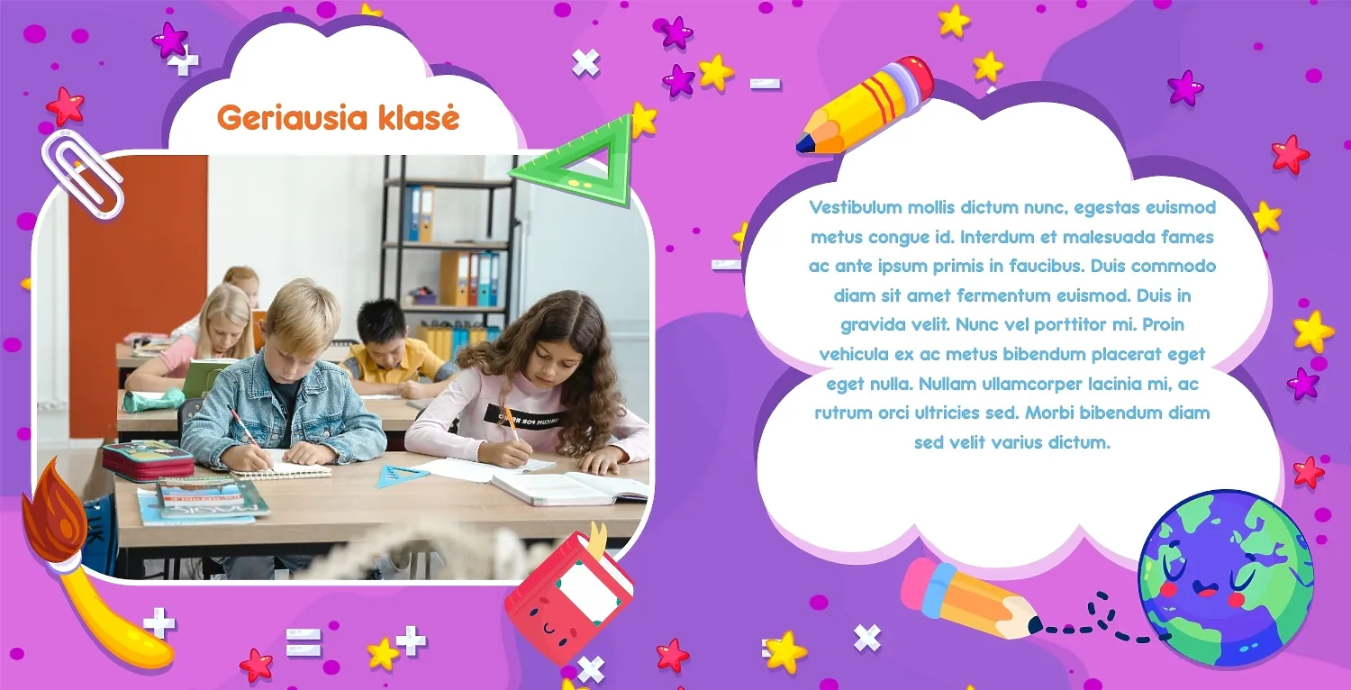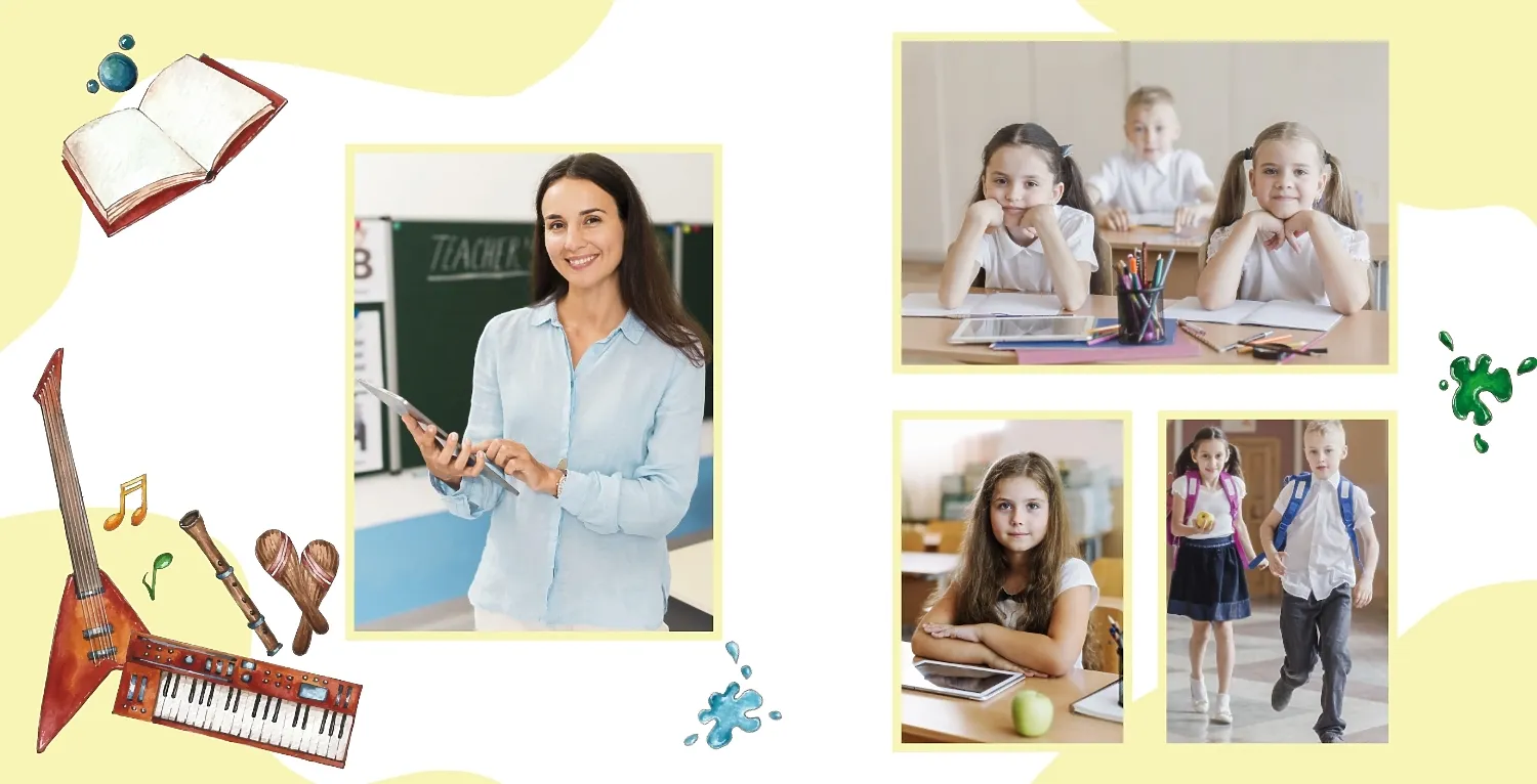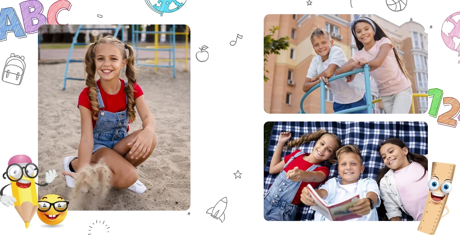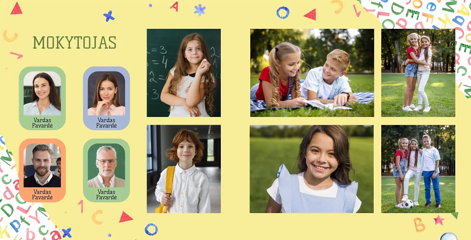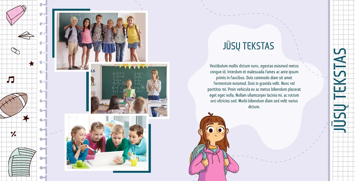 Baigimo fotoknygos šablonas jaunesniajai mokyklai-spalvingas ir jaudinantis apipavidalinimas, kuris padės išsaugoti pačius šilčiausius pirmųjų mokyklinių metų prisiminimus. Šablono dizainas sukurtas atsižvelgiant į vaikų temą: ryškios iliustracijos, subtilios spalvos, elementai, primenantys mokyklos gyvenimą – knygos, pieštukai, įrašų lentos. Internetiniame dizaineryje šį šabloną galima lengvai pakeisti, kad jis būtų unikalus. Vartotojas gali pridėti ir perkelti nuotraukas, keisti šriftus, redaguoti teksto blokus su pageidavimais ir parašais, taip pat pakeisti dekoratyvinius elementus tinkamesniu stiliumi. Galimybė pasirinkti spalvų schemą leidžia fotoknygą padaryti švelnesnę arba, atvirkščiai, prisotintą, priklausomai nuo pageidavimų. Jei pageidaujate, galite įterpti mokyklos logotipą arba individualias iliustracijas, kad pabrėžtumėte išleidimo ypatybę.