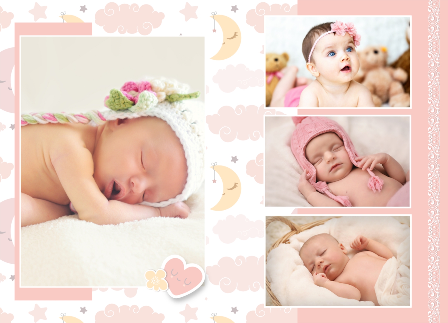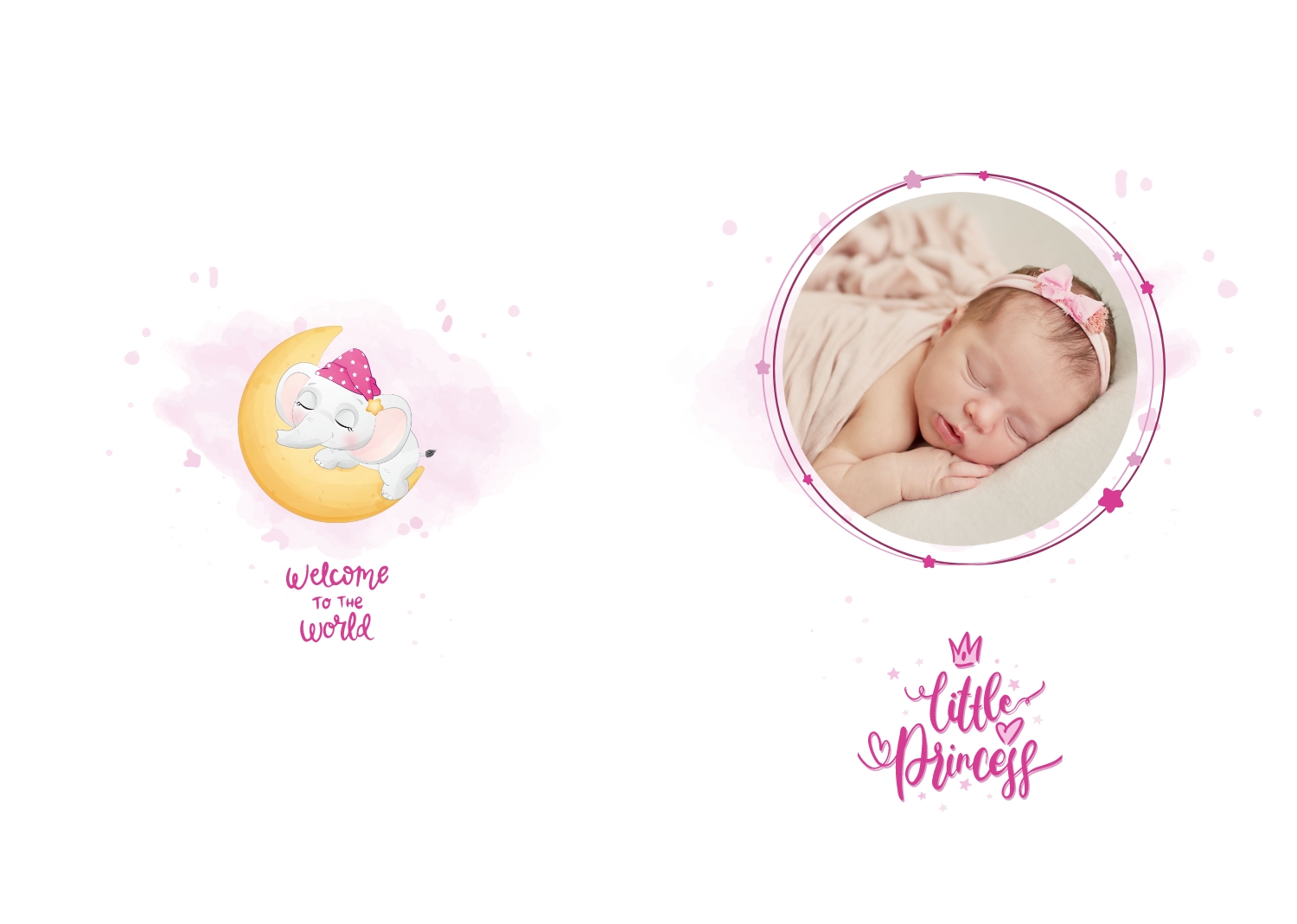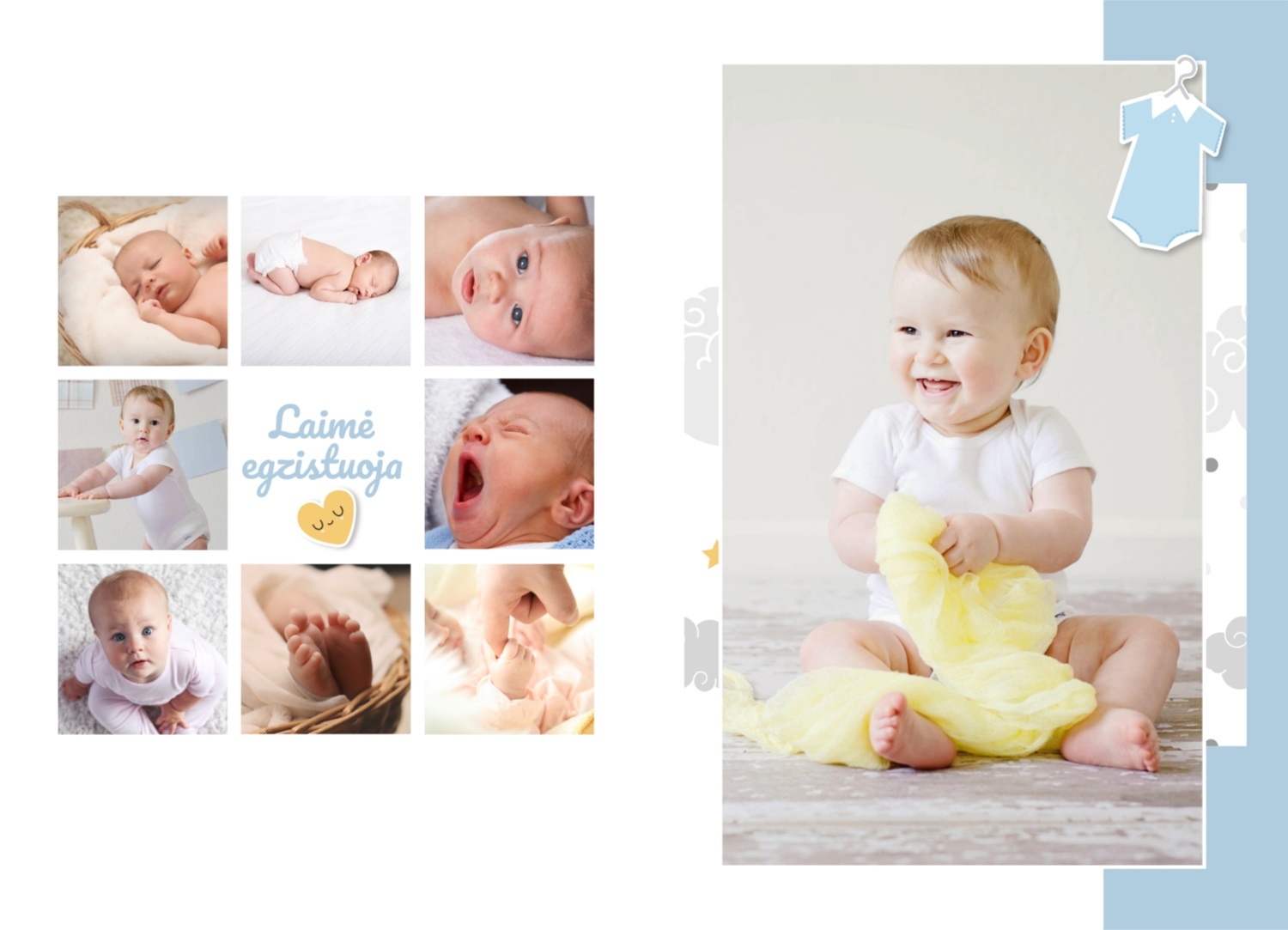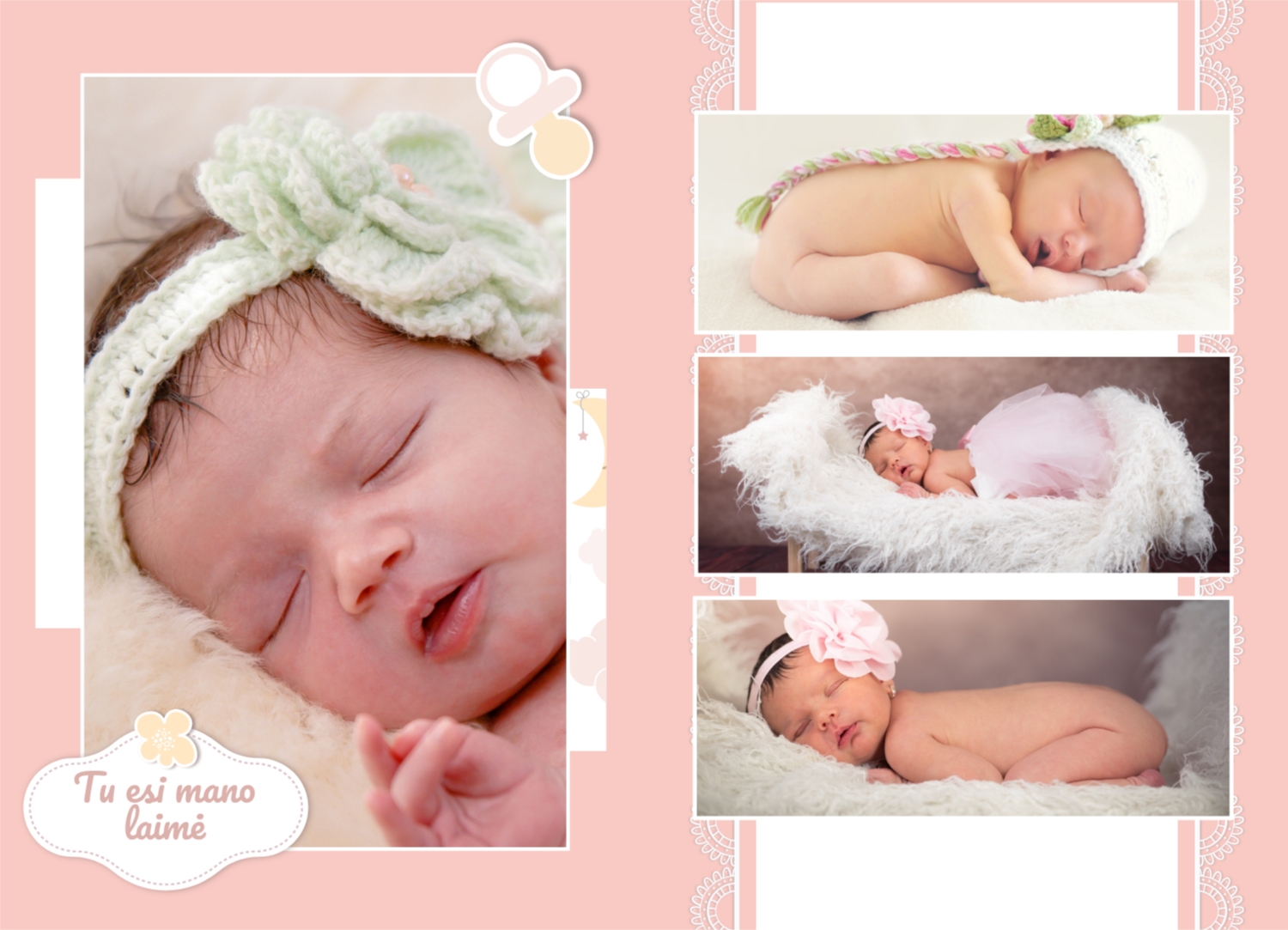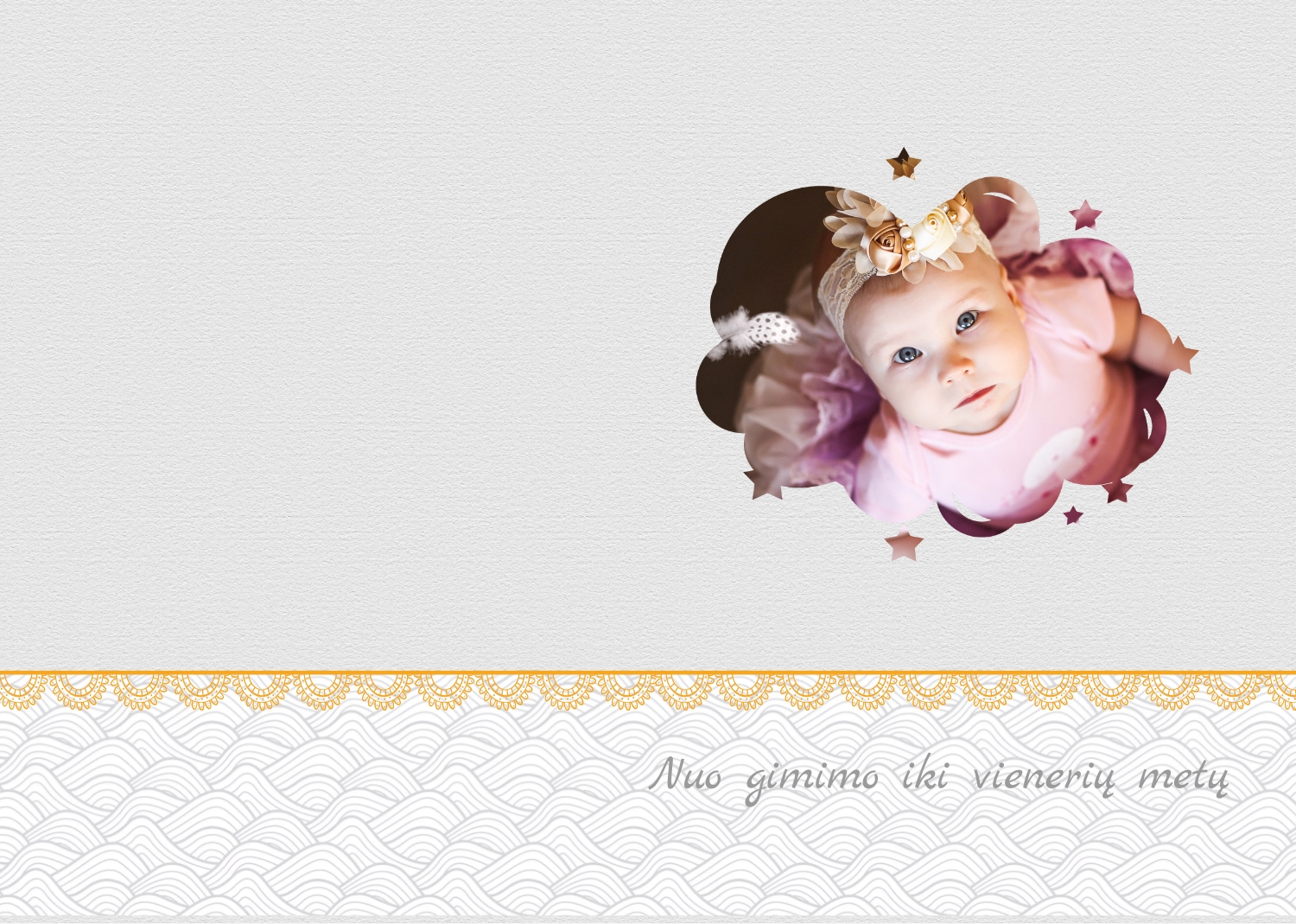 Paruoštas vertikalios fotoknygos šablonas kietame viršelyje naujagimio nuotraukai "mažoji princesė" - tai švelnus ir jaudinantis maketas, kuris padės išsaugoti pačias vertingiausias pirmųjų mažylio gyvenimo dienų akimirkas. Dizainas Pagamintas minkštomis pastelinėmis spalvomis su elegantiškais dekoratyviniais elementais: oro debesimis, mielais žaislais, gėlių modeliais ir nuostabiais motyvais. Šis šablonas gali būti naudojamas ne tik asmeniniais tikslais, bet ir profesinėje srityje. Tai bus puikus pagrindas fotografams, dizaineriams ir specialistams, užsiimantiems vaikų nuotraukų albumų dizainu. Jis taip pat tinka fotostudijų darbuotojams, kurie siūlo klientams sukurti išskirtines knygas su vaikų nuotraukomis. Internetiniame dizaineryje maketas yra lengvai redaguojamas, todėl jis tikrai unikalus. Galite pakeisti foną, pridėti papildomų dekoratyvinių elementų arba pašalinti nereikalingas dalis. Laukai su tekstu ir nuotraukomis yra visiškai pritaikomi: galite pakeisti nuotraukų dydį ir vietą, pasirinkti tinkamą parašų šriftą ir spalvą, pridėti šiltų norų ar juokingų komentarų. Nuotraukos patogiai įkeliamos tiesiai į konstruktorių, kur jas galima apipjaustyti, redaguoti ir patalpinti reikiama tvarka.