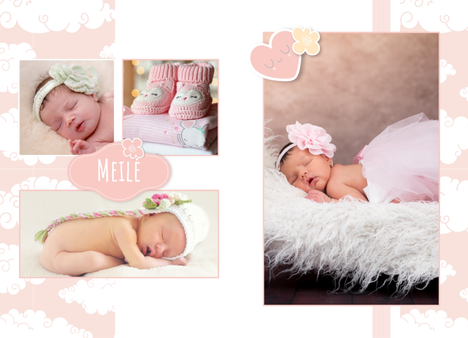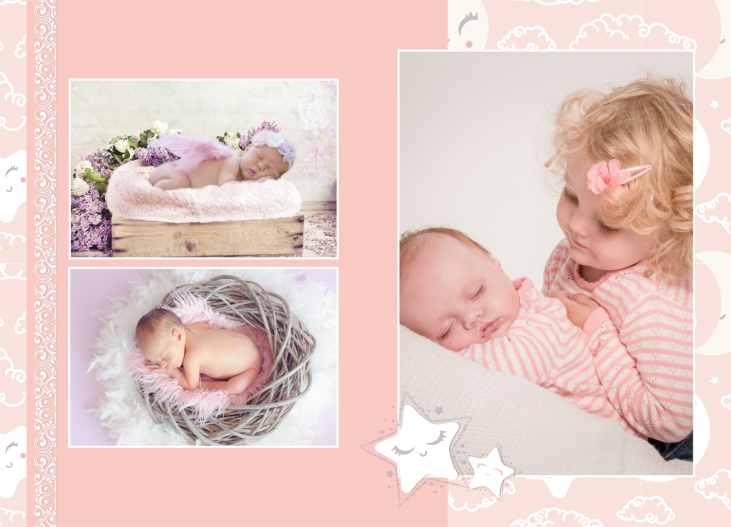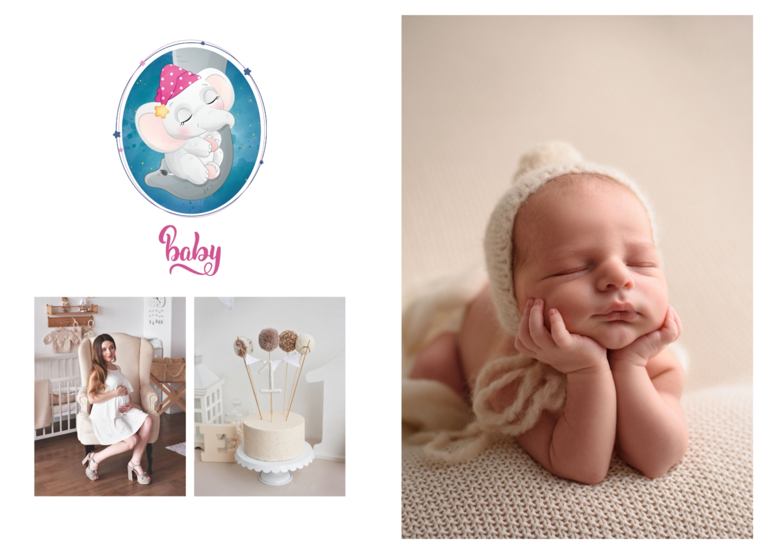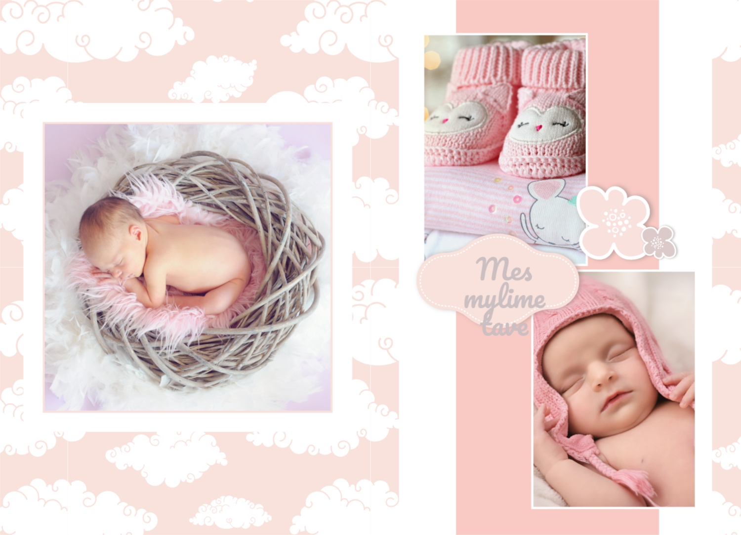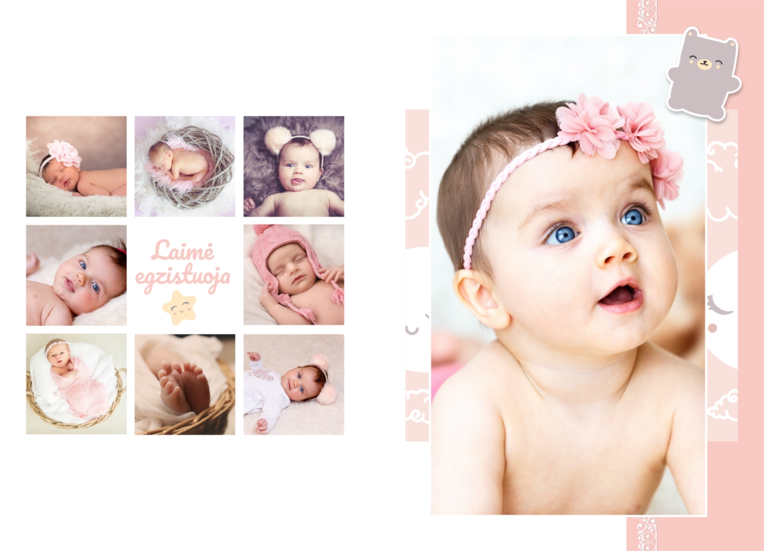 Paruoštas vertikalios fotoknygos šablonas kietame viršelyje naujagimio nuotraukai "mažoji princesė" - tai švelnus ir jaudinantis maketas, kuris padės išsaugoti pačias vertingiausias pirmųjų mažylio gyvenimo dienų akimirkas. Dizainas Pagamintas minkštomis pastelinėmis spalvomis su elegantiškais dekoratyviniais elementais: oro debesimis, mielais žaislais, gėlių modeliais ir nuostabiais motyvais. Šis šablonas gali būti naudojamas ne tik asmeniniais tikslais, bet ir profesinėje srityje. Tai bus puikus pagrindas fotografams, dizaineriams ir specialistams, užsiimantiems vaikų nuotraukų albumų dizainu. Jis taip pat tinka fotostudijų darbuotojams, kurie siūlo klientams sukurti išskirtines knygas su vaikų nuotraukomis. Internetiniame dizaineryje maketas yra lengvai redaguojamas, todėl jis tikrai unikalus. Galite pakeisti foną, pridėti papildomų dekoratyvinių elementų arba pašalinti nereikalingas dalis. Laukai su tekstu ir nuotraukomis yra visiškai pritaikomi: galite pakeisti nuotraukų dydį ir vietą, pasirinkti tinkamą parašų šriftą ir spalvą, pridėti šiltų norų ar juokingų komentarų. Nuotraukos patogiai įkeliamos tiesiai į konstruktorių, kur jas galima apipjaustyti, redaguoti ir patalpinti reikiama tvarka.