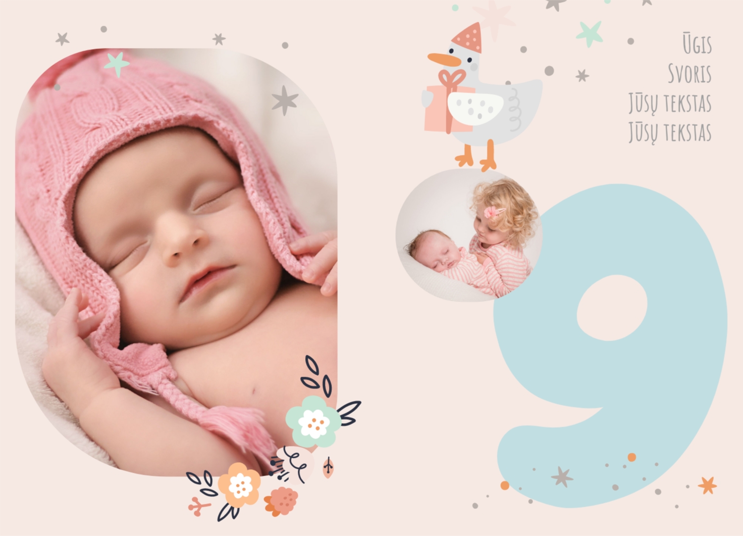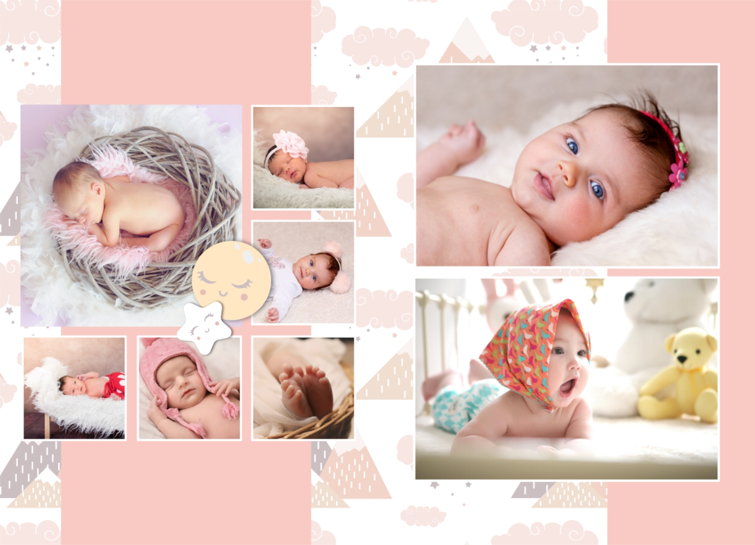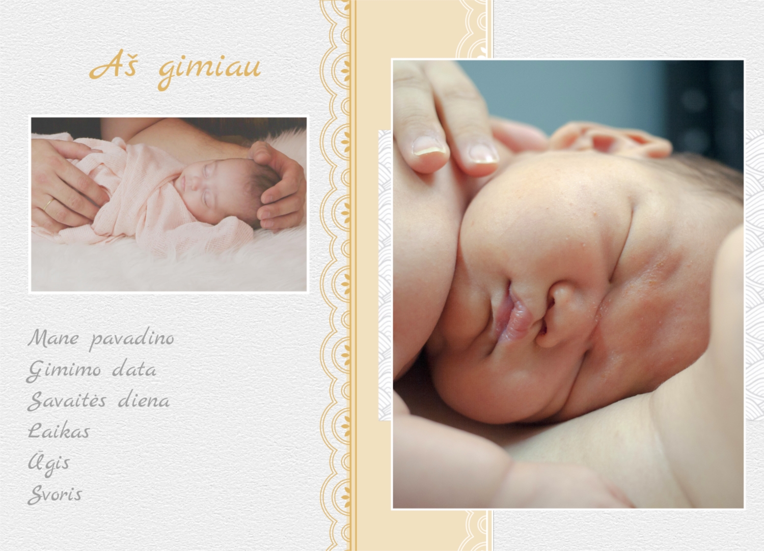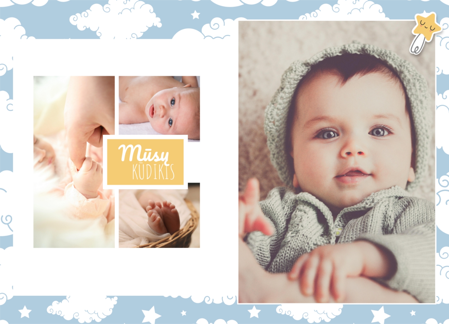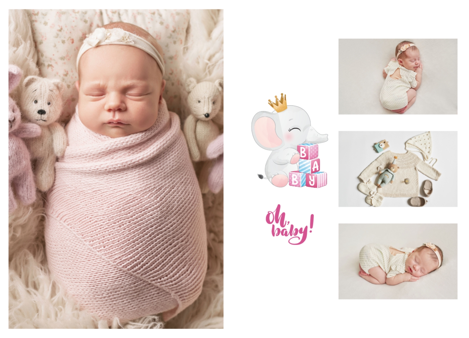 Paruoštas vertikalios fotoknygos šablonas kietame viršelyje naujagimio nuotraukai "mažoji princesė" - tai švelnus ir jaudinantis maketas, kuris padės išsaugoti pačias vertingiausias pirmųjų mažylio gyvenimo dienų akimirkas. Dizainas Pagamintas minkštomis pastelinėmis spalvomis su elegantiškais dekoratyviniais elementais: oro debesimis, mielais žaislais, gėlių modeliais ir nuostabiais motyvais. Šis šablonas gali būti naudojamas ne tik asmeniniais tikslais, bet ir profesinėje srityje. Tai bus puikus pagrindas fotografams, dizaineriams ir specialistams, užsiimantiems vaikų nuotraukų albumų dizainu. Jis taip pat tinka fotostudijų darbuotojams, kurie siūlo klientams sukurti išskirtines knygas su vaikų nuotraukomis. Internetiniame dizaineryje maketas yra lengvai redaguojamas, todėl jis tikrai unikalus. Galite pakeisti foną, pridėti papildomų dekoratyvinių elementų arba pašalinti nereikalingas dalis. Laukai su tekstu ir nuotraukomis yra visiškai pritaikomi: galite pakeisti nuotraukų dydį ir vietą, pasirinkti tinkamą parašų šriftą ir spalvą, pridėti šiltų norų ar juokingų komentarų. Nuotraukos patogiai įkeliamos tiesiai į konstruktorių, kur jas galima apipjaustyti, redaguoti ir patalpinti reikiama tvarka.