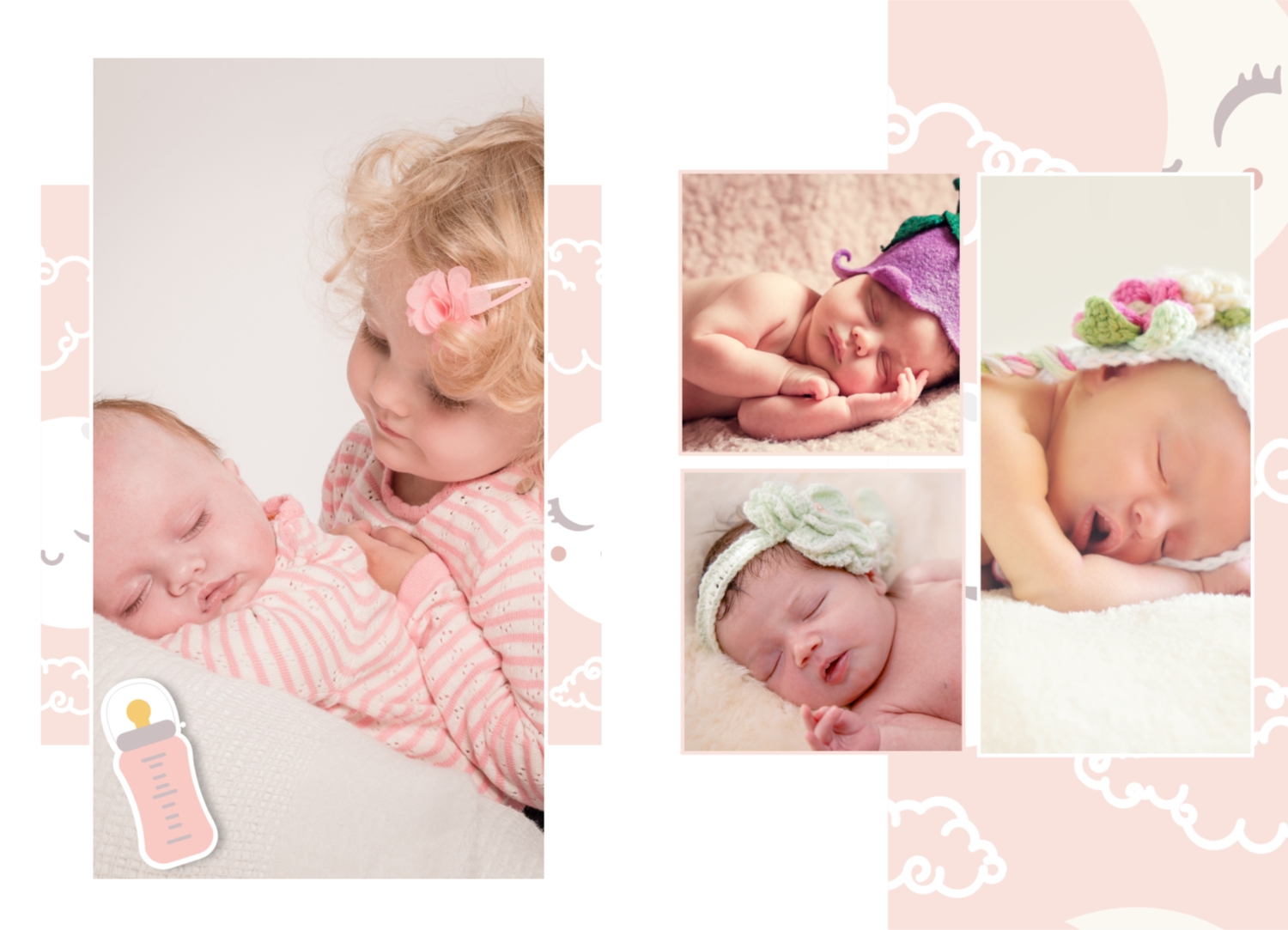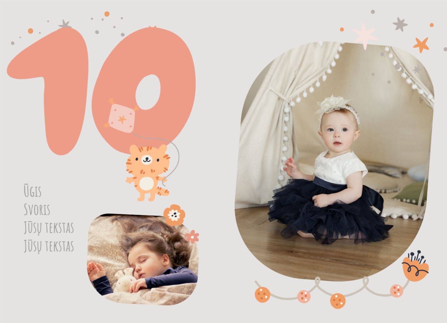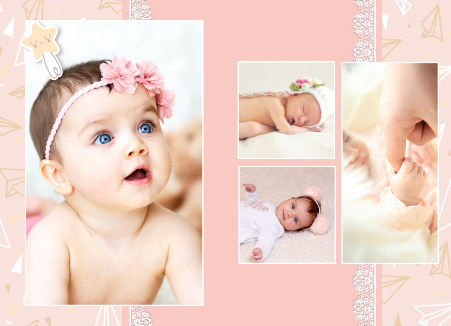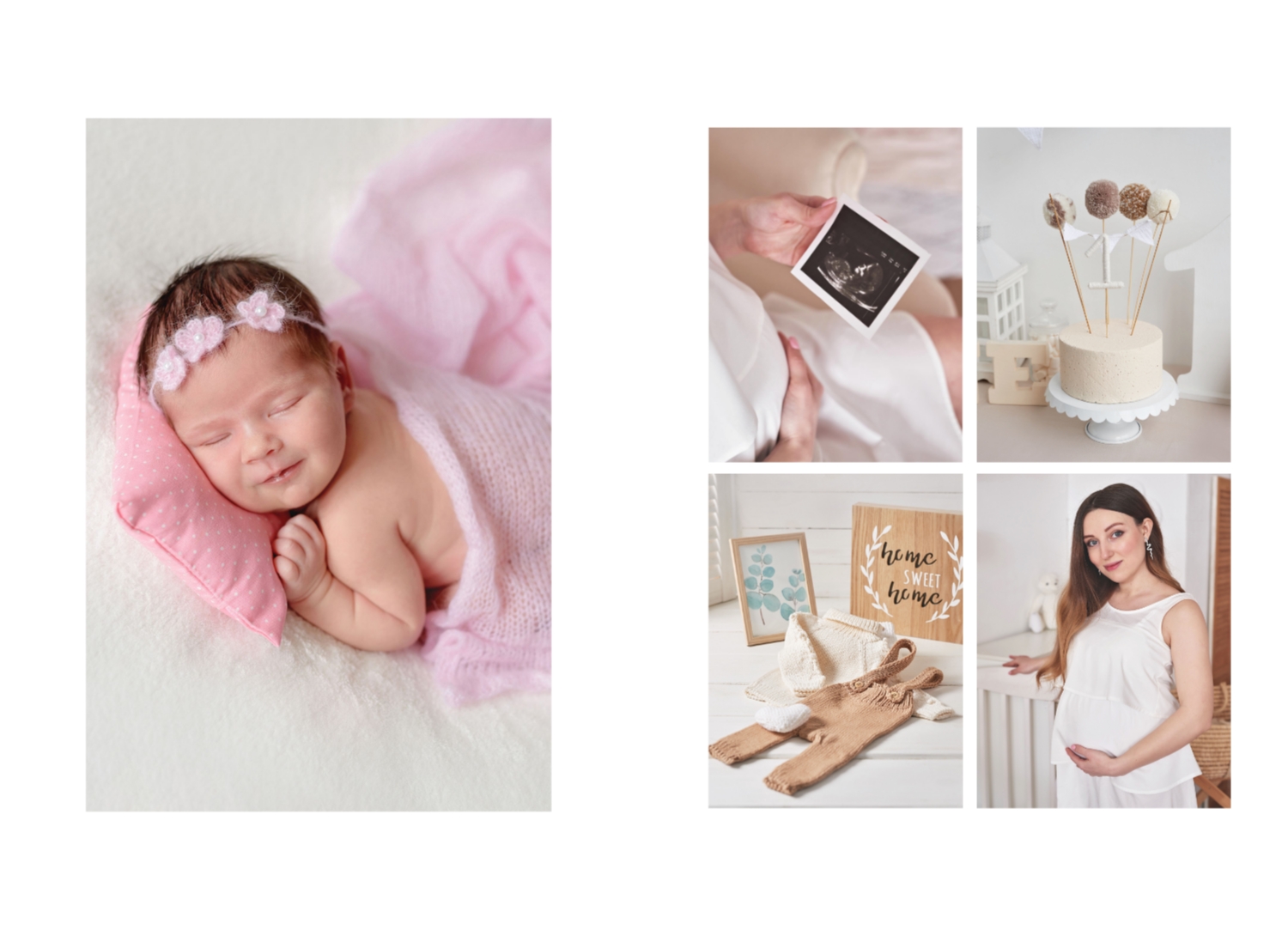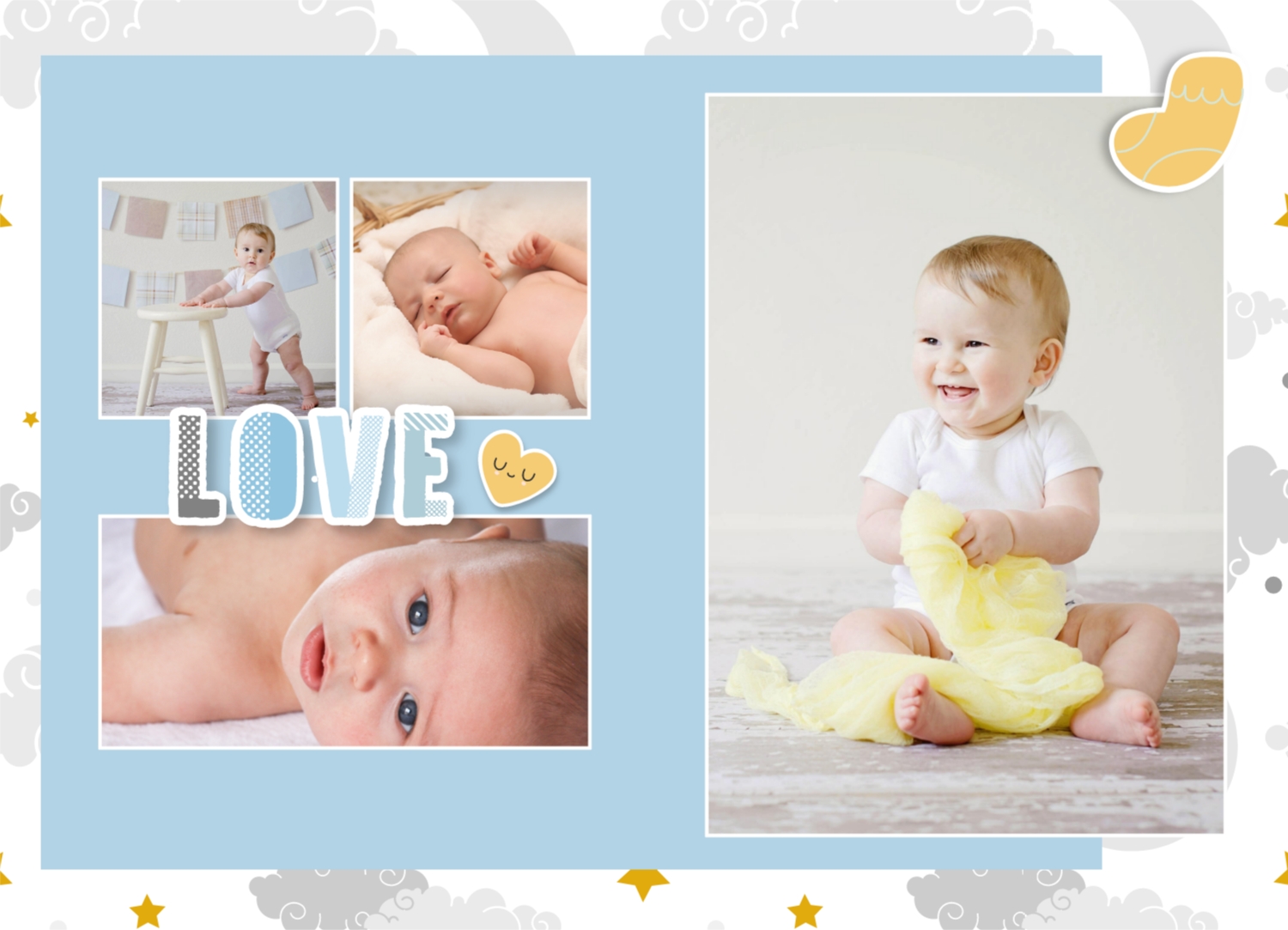 Paruoštas vertikalios fotoknygos šablonas kietame viršelyje naujagimio nuotraukai "mažoji princesė" - tai švelnus ir jaudinantis maketas, kuris padės išsaugoti pačias vertingiausias pirmųjų mažylio gyvenimo dienų akimirkas. Dizainas Pagamintas minkštomis pastelinėmis spalvomis su elegantiškais dekoratyviniais elementais: oro debesimis, mielais žaislais, gėlių modeliais ir nuostabiais motyvais. Šis šablonas gali būti naudojamas ne tik asmeniniais tikslais, bet ir profesinėje srityje. Tai bus puikus pagrindas fotografams, dizaineriams ir specialistams, užsiimantiems vaikų nuotraukų albumų dizainu. Jis taip pat tinka fotostudijų darbuotojams, kurie siūlo klientams sukurti išskirtines knygas su vaikų nuotraukomis. Internetiniame dizaineryje maketas yra lengvai redaguojamas, todėl jis tikrai unikalus. Galite pakeisti foną, pridėti papildomų dekoratyvinių elementų arba pašalinti nereikalingas dalis. Laukai su tekstu ir nuotraukomis yra visiškai pritaikomi: galite pakeisti nuotraukų dydį ir vietą, pasirinkti tinkamą parašų šriftą ir spalvą, pridėti šiltų norų ar juokingų komentarų. Nuotraukos patogiai įkeliamos tiesiai į konstruktorių, kur jas galima apipjaustyti, redaguoti ir patalpinti reikiama tvarka.