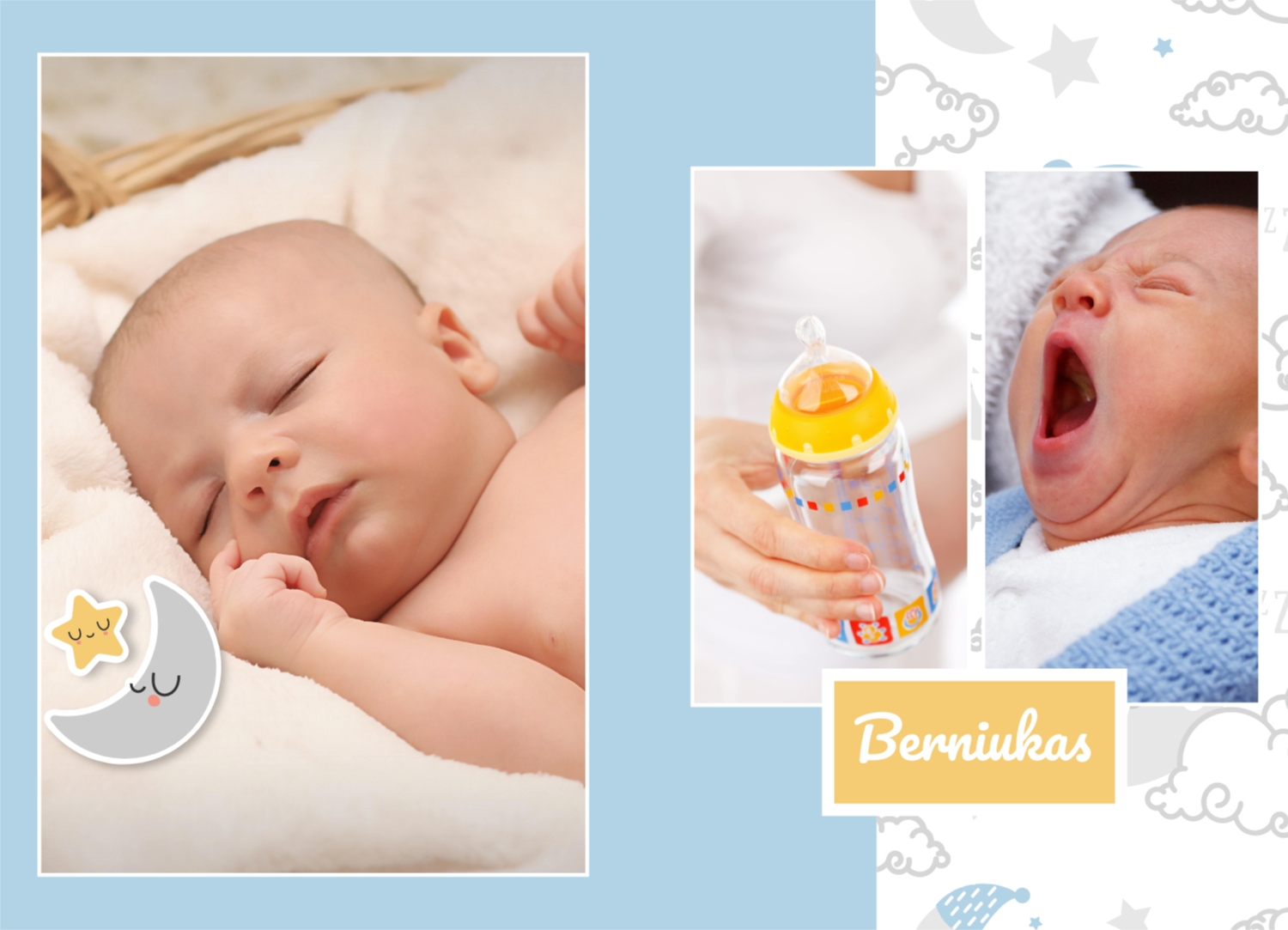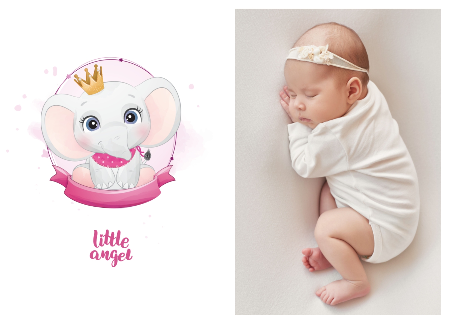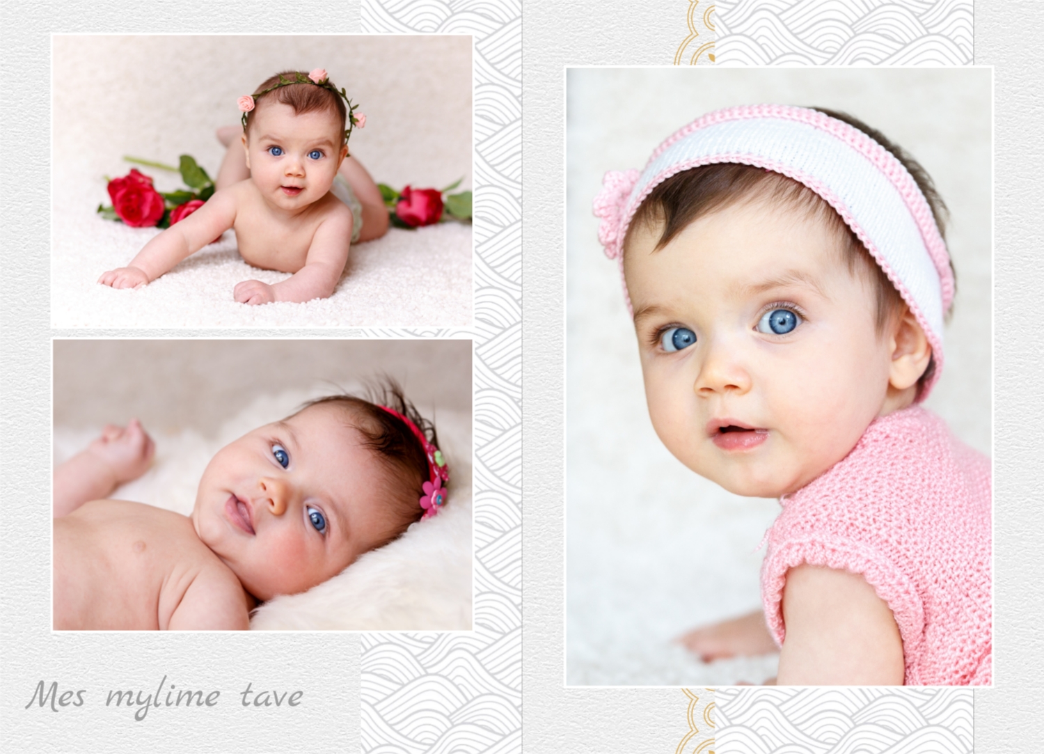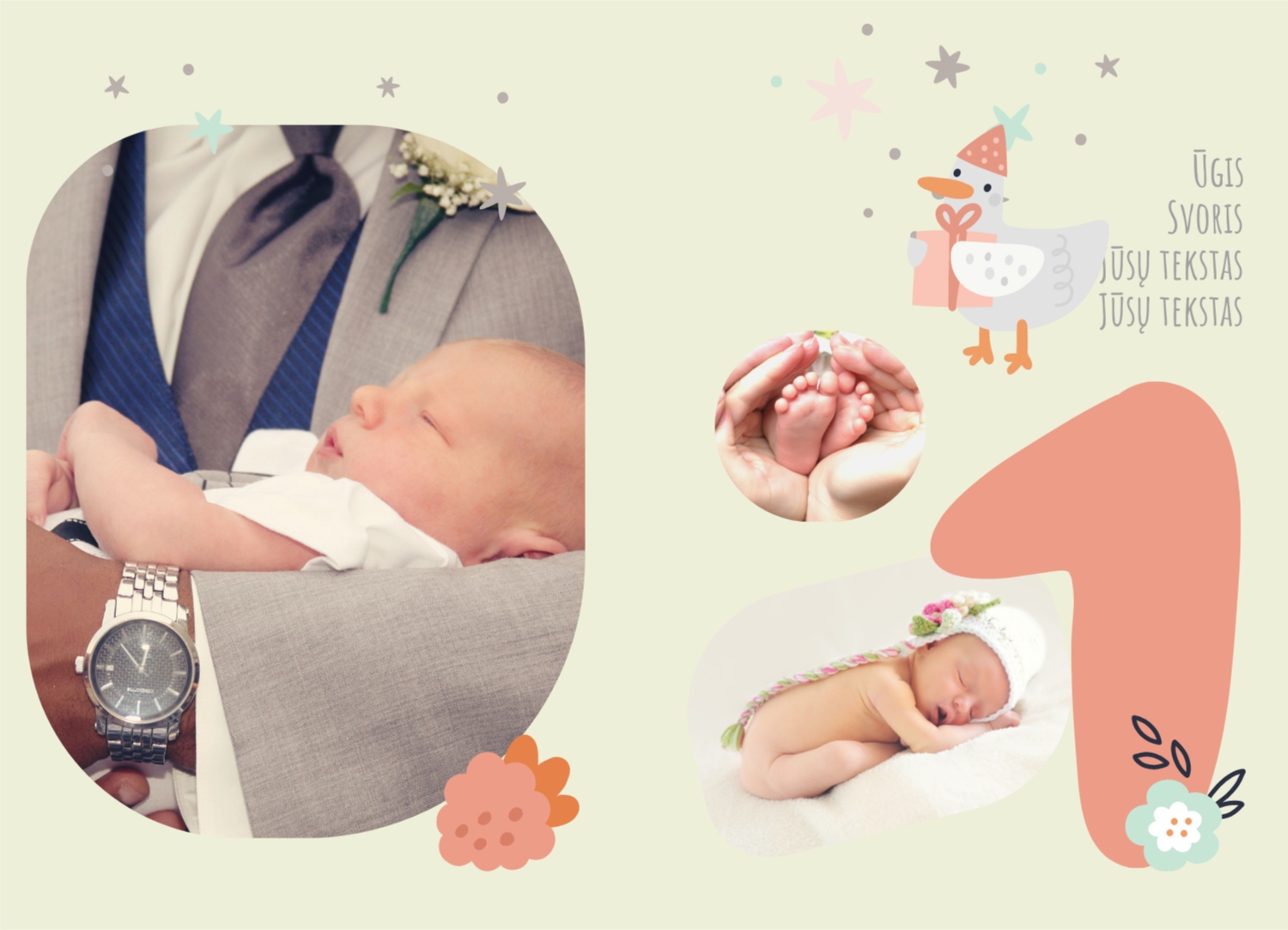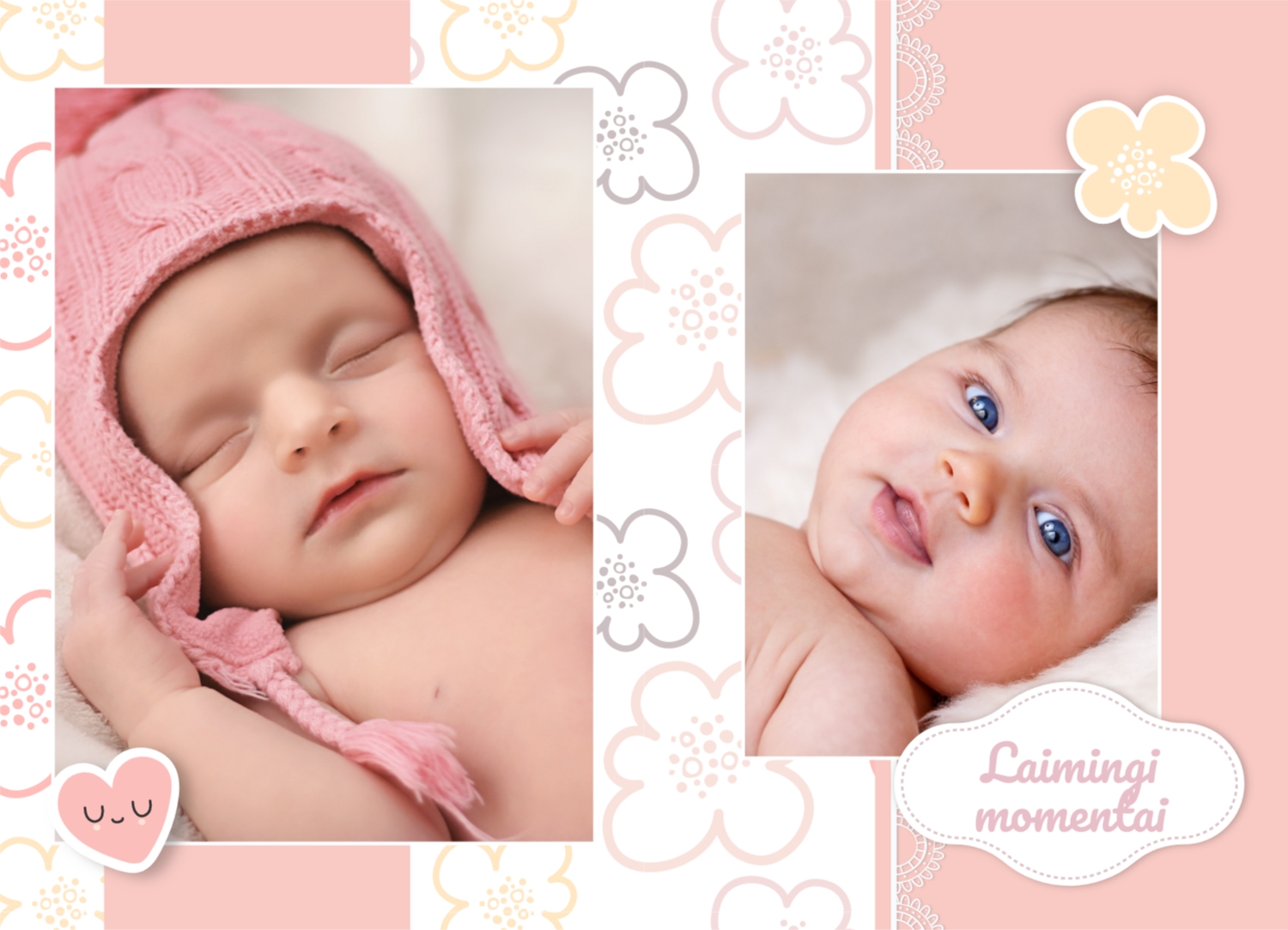 Paruoštas vertikalios fotoknygos šablonas kietame viršelyje naujagimio nuotraukai "mažoji princesė" - tai švelnus ir jaudinantis maketas, kuris padės išsaugoti pačias vertingiausias pirmųjų mažylio gyvenimo dienų akimirkas. Dizainas Pagamintas minkštomis pastelinėmis spalvomis su elegantiškais dekoratyviniais elementais: oro debesimis, mielais žaislais, gėlių modeliais ir nuostabiais motyvais. Šis šablonas gali būti naudojamas ne tik asmeniniais tikslais, bet ir profesinėje srityje. Tai bus puikus pagrindas fotografams, dizaineriams ir specialistams, užsiimantiems vaikų nuotraukų albumų dizainu. Jis taip pat tinka fotostudijų darbuotojams, kurie siūlo klientams sukurti išskirtines knygas su vaikų nuotraukomis. Internetiniame dizaineryje maketas yra lengvai redaguojamas, todėl jis tikrai unikalus. Galite pakeisti foną, pridėti papildomų dekoratyvinių elementų arba pašalinti nereikalingas dalis. Laukai su tekstu ir nuotraukomis yra visiškai pritaikomi: galite pakeisti nuotraukų dydį ir vietą, pasirinkti tinkamą parašų šriftą ir spalvą, pridėti šiltų norų ar juokingų komentarų. Nuotraukos patogiai įkeliamos tiesiai į konstruktorių, kur jas galima apipjaustyti, redaguoti ir patalpinti reikiama tvarka.