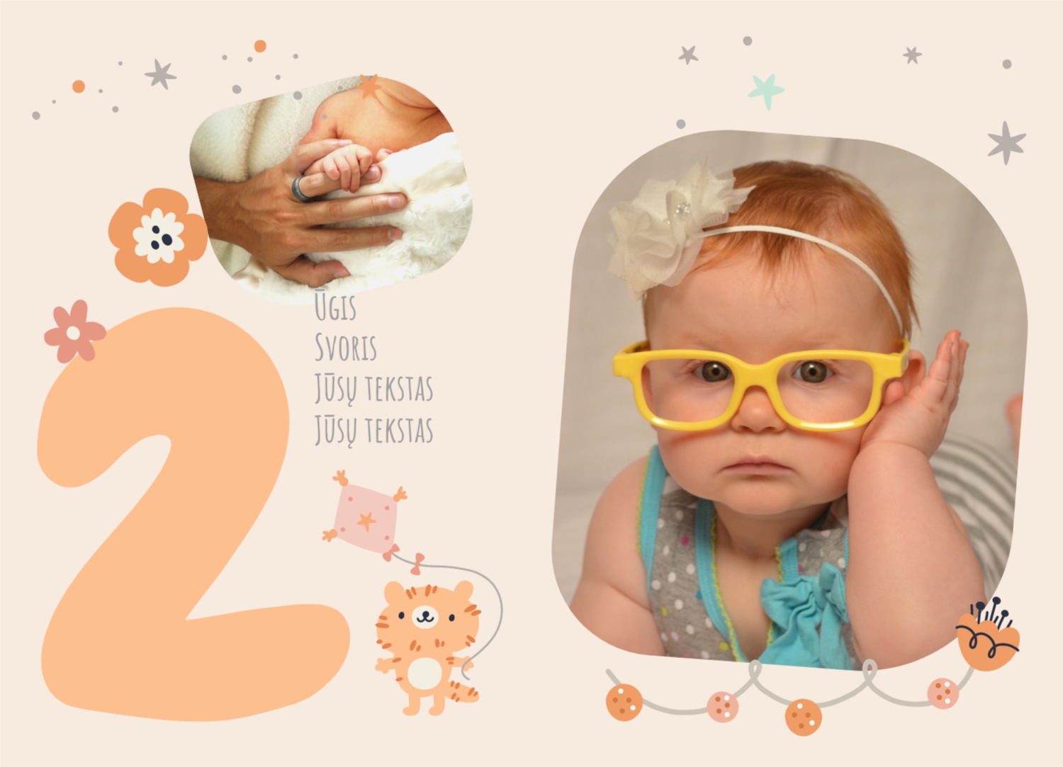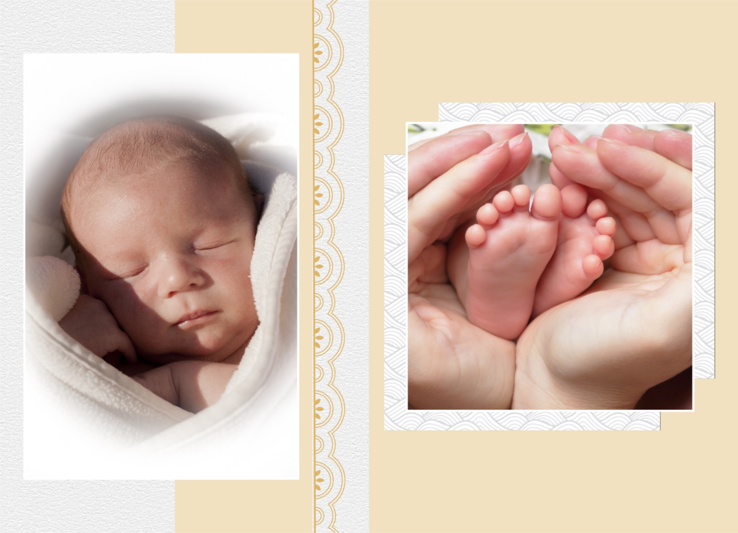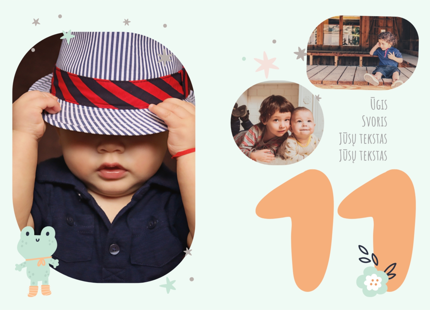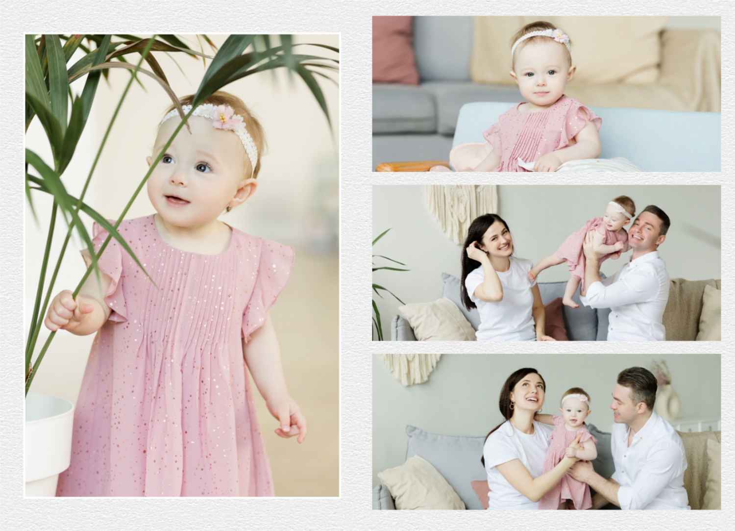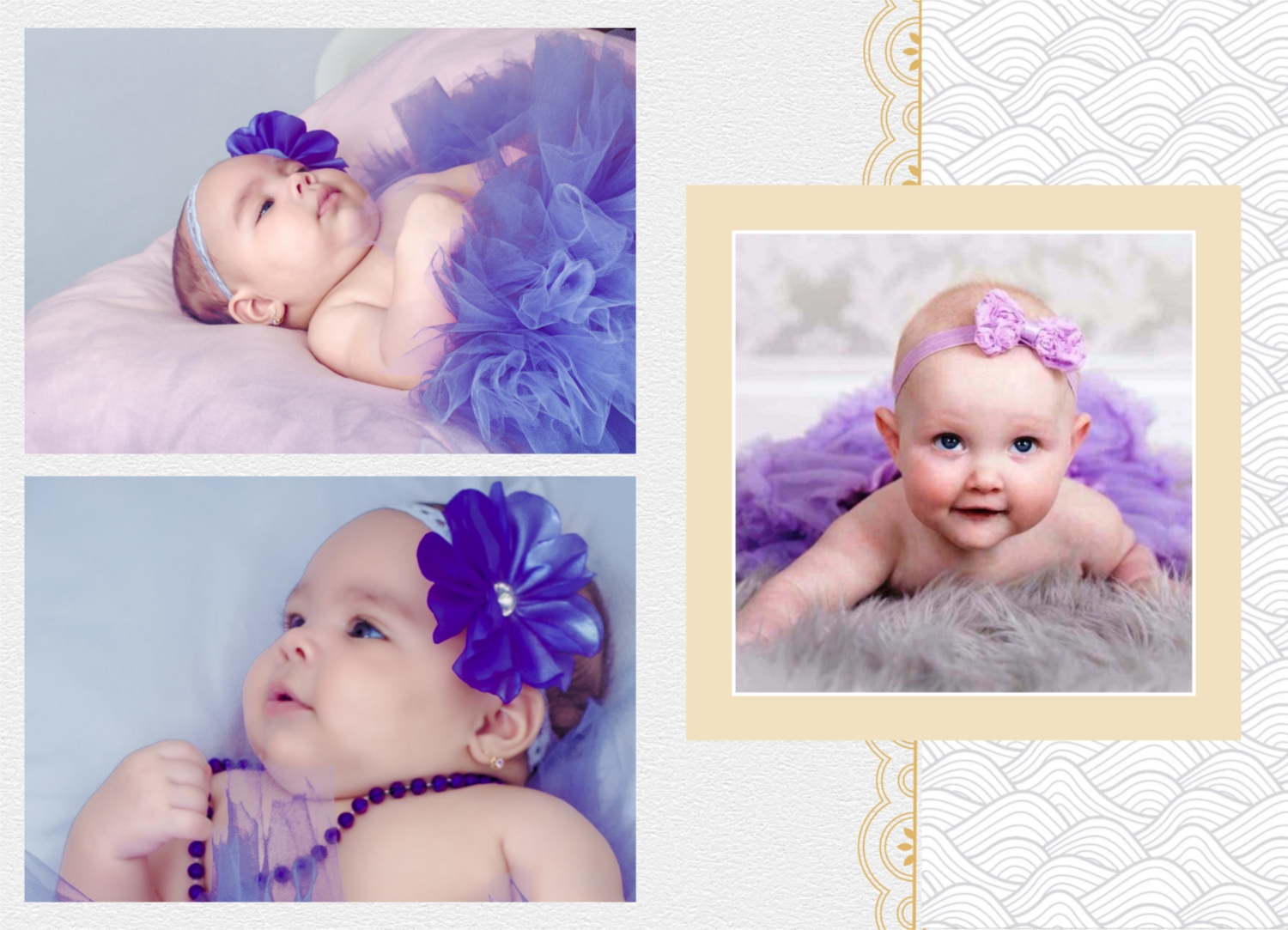 Paruoštas vertikalios fotoknygos šablonas kietame viršelyje naujagimio nuotraukai "mažoji princesė" - tai švelnus ir jaudinantis maketas, kuris padės išsaugoti pačias vertingiausias pirmųjų mažylio gyvenimo dienų akimirkas. Dizainas Pagamintas minkštomis pastelinėmis spalvomis su elegantiškais dekoratyviniais elementais: oro debesimis, mielais žaislais, gėlių modeliais ir nuostabiais motyvais. Šis šablonas gali būti naudojamas ne tik asmeniniais tikslais, bet ir profesinėje srityje. Tai bus puikus pagrindas fotografams, dizaineriams ir specialistams, užsiimantiems vaikų nuotraukų albumų dizainu. Jis taip pat tinka fotostudijų darbuotojams, kurie siūlo klientams sukurti išskirtines knygas su vaikų nuotraukomis. Internetiniame dizaineryje maketas yra lengvai redaguojamas, todėl jis tikrai unikalus. Galite pakeisti foną, pridėti papildomų dekoratyvinių elementų arba pašalinti nereikalingas dalis. Laukai su tekstu ir nuotraukomis yra visiškai pritaikomi: galite pakeisti nuotraukų dydį ir vietą, pasirinkti tinkamą parašų šriftą ir spalvą, pridėti šiltų norų ar juokingų komentarų. Nuotraukos patogiai įkeliamos tiesiai į konstruktorių, kur jas galima apipjaustyti, redaguoti ir patalpinti reikiama tvarka.