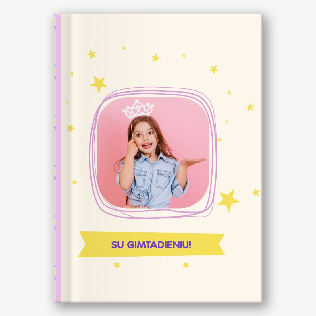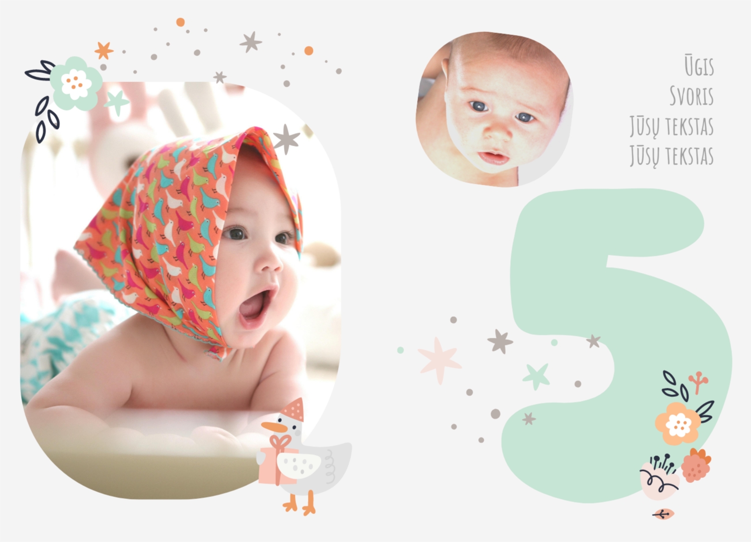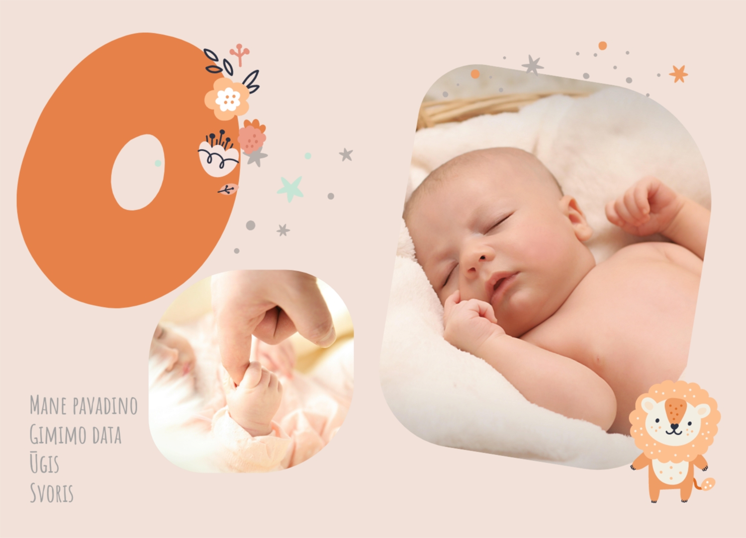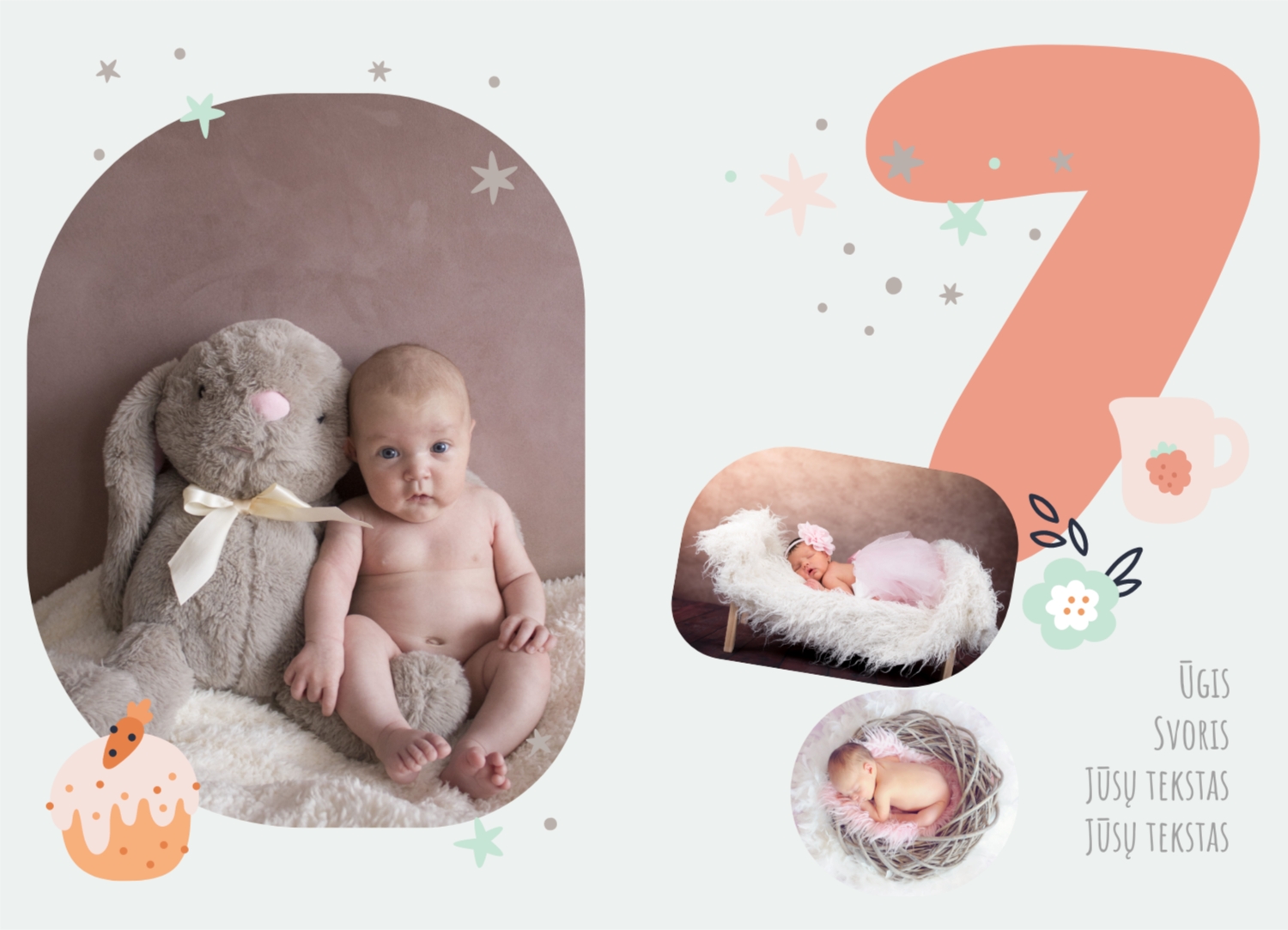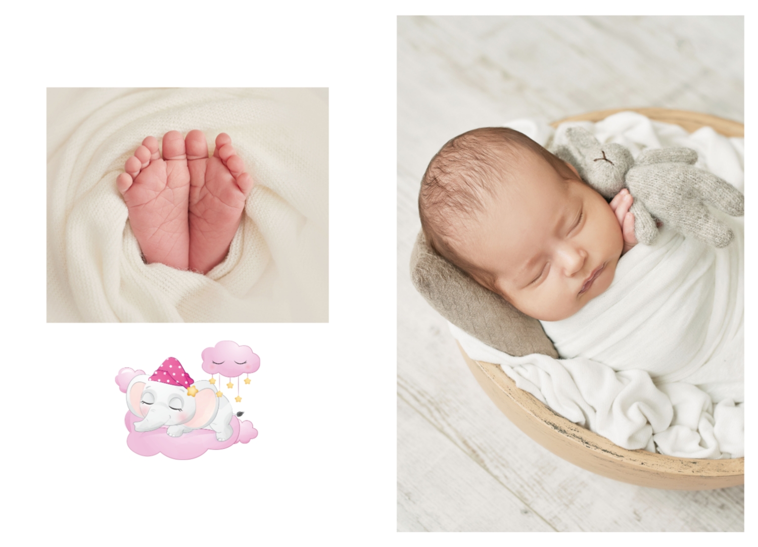 Paruoštas vertikalios fotoknygos šablonas kietame viršelyje naujagimio nuotraukai "mažoji princesė" - tai švelnus ir jaudinantis maketas, kuris padės išsaugoti pačias vertingiausias pirmųjų mažylio gyvenimo dienų akimirkas. Dizainas Pagamintas minkštomis pastelinėmis spalvomis su elegantiškais dekoratyviniais elementais: oro debesimis, mielais žaislais, gėlių modeliais ir nuostabiais motyvais. Šis šablonas gali būti naudojamas ne tik asmeniniais tikslais, bet ir profesinėje srityje. Tai bus puikus pagrindas fotografams, dizaineriams ir specialistams, užsiimantiems vaikų nuotraukų albumų dizainu. Jis taip pat tinka fotostudijų darbuotojams, kurie siūlo klientams sukurti išskirtines knygas su vaikų nuotraukomis. Internetiniame dizaineryje maketas yra lengvai redaguojamas, todėl jis tikrai unikalus. Galite pakeisti foną, pridėti papildomų dekoratyvinių elementų arba pašalinti nereikalingas dalis. Laukai su tekstu ir nuotraukomis yra visiškai pritaikomi: galite pakeisti nuotraukų dydį ir vietą, pasirinkti tinkamą parašų šriftą ir spalvą, pridėti šiltų norų ar juokingų komentarų. Nuotraukos patogiai įkeliamos tiesiai į konstruktorių, kur jas galima apipjaustyti, redaguoti ir patalpinti reikiama tvarka.