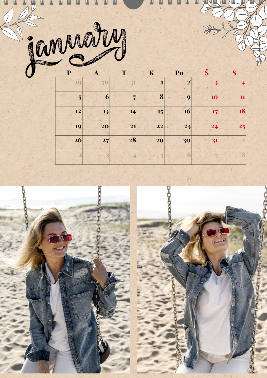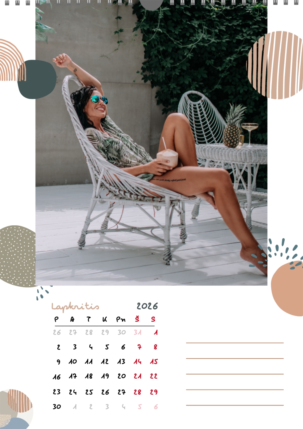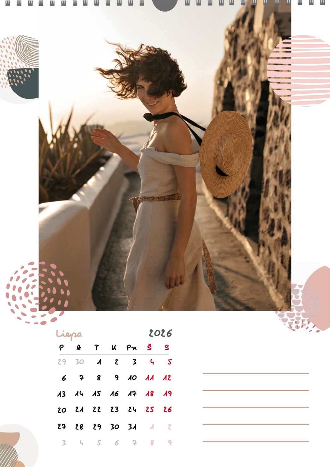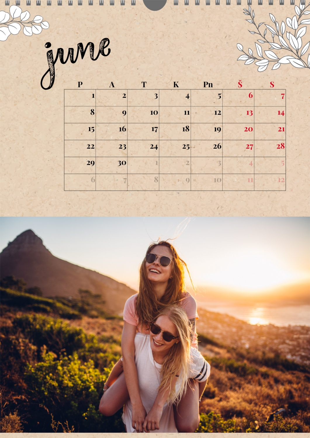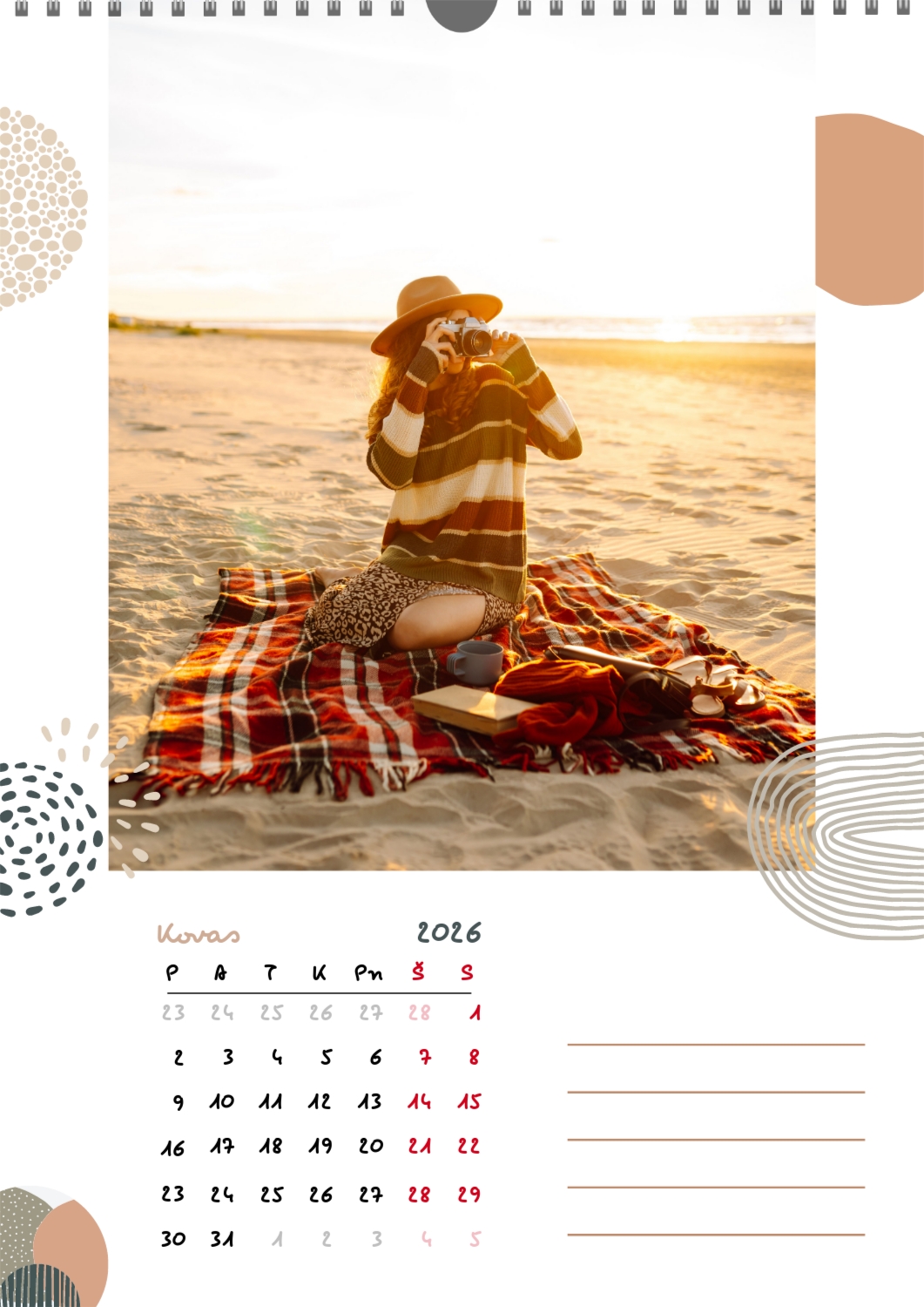 Paruoštas kalendoriaus "prisiminimai" šablonas sukurtas tiems, kurie vertina šiltus momentus ir nori juos išsaugoti kasdieniame gyvenime. Jo minkšta kompozicija, šviesi paletė ir tvarkingos dekoratyvinės detalės leidžia pabrėžti šeimos komforto, kelionių, renginių ir brangių susitikimų atmosferą. Šis šablonas tinka tėvams, mokytojams, fotografams, kūrybinėms studijoms, mažų prekių ženklų savininkams, taip pat visiems, kurie nori sukurti asmenines ar darbo erdves su dvasiniu akcentu. Jis vienodai tinka tiek namuose, tiek biure — tiek studijoje-visur, kur svarbios emocijos ir vizualinė estetika. Internetiniame dizaineryje šis kalendorius gali būti lengvai pritaikytas prie jūsų stiliaus. Kiekvieną puslapį galima užpildyti savo nuotraukomis - nuo šeimos nuotraukų iki mokinių portretų ar renginių personalo. Parašai ir datos redaguojami: galite pakeisti mėnesių pavadinimus, pridėti svarbių įvykių, pažymėti gimtadienius, įsimintinas datas ar kultūrinius renginius savo organizacijoje. Užrašų šriftai ir spalvos taip pat nustatomi, kad kalendorius būtų ryškesnis, griežtesnis arba, atvirkščiai, kuo švelnesnis. Jei pageidaujate, galite pridėti įmonės logotipą, šūkį, kontaktinę informaciją arba palikti dizainą visiškai asmeninį ir namų dizainą. "Prisiminimų" šablonas skirtas savarankiškai sukurti unikalų kalendorių tiesiai internetiniame dizaineryje, nereikia turėti profesionalių grafikos programų. Visi redagavimai vyksta intuityviai ir žingsnis po žingsnio, o rezultatas atrodys profesionalus ir harmoningas. Toks kalendorius tampa ne tik Sienų apdaila,bet ir tikra istorija, kuri kasdien primins svarbiausią dalyką.