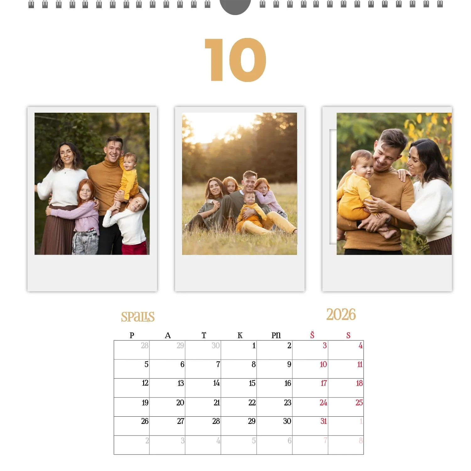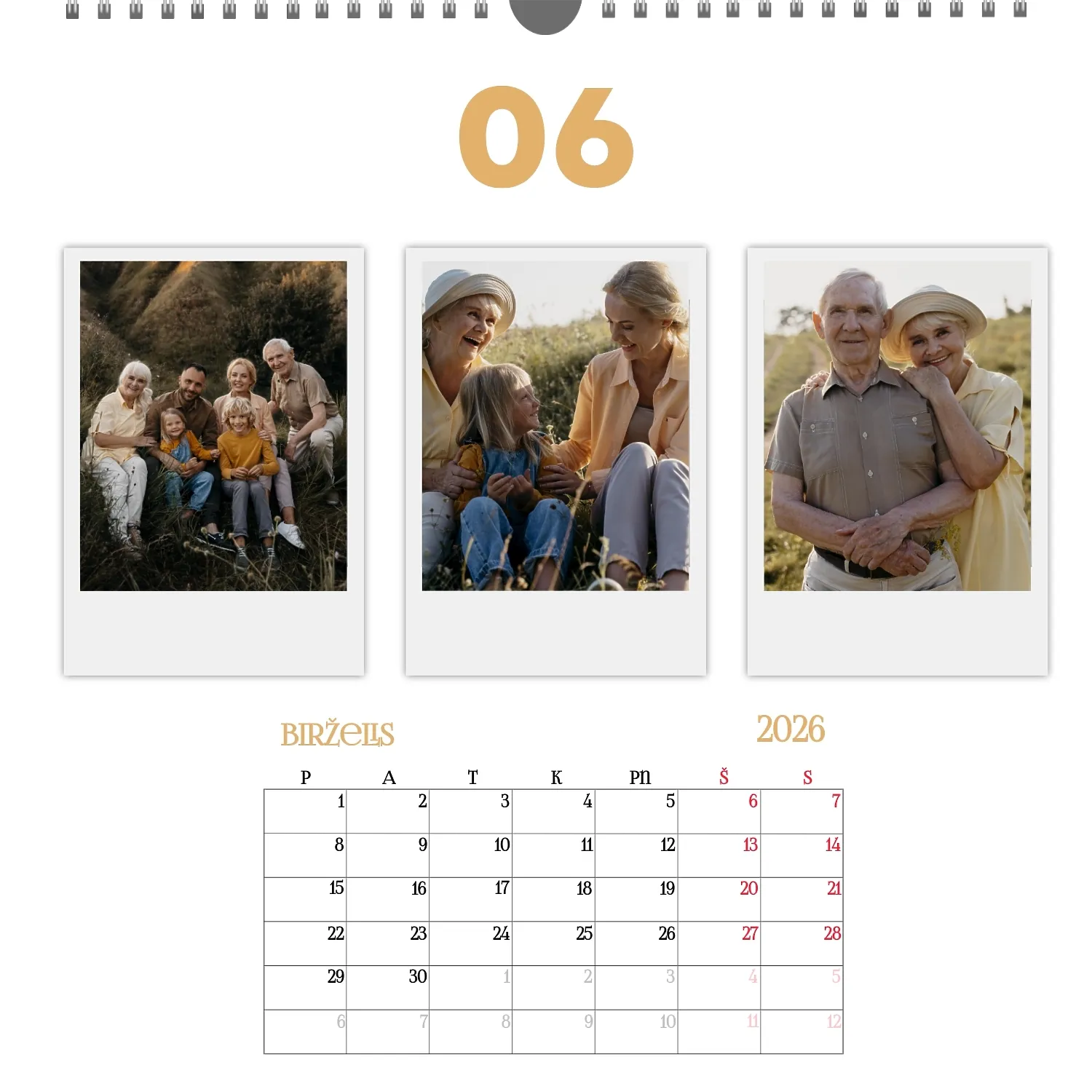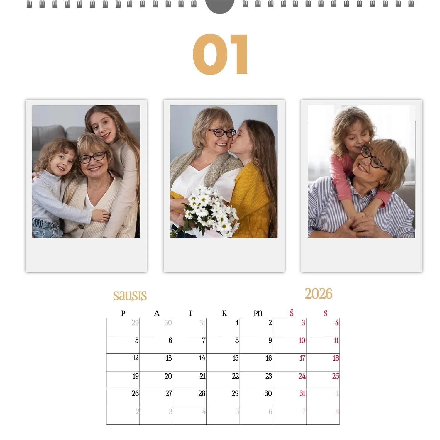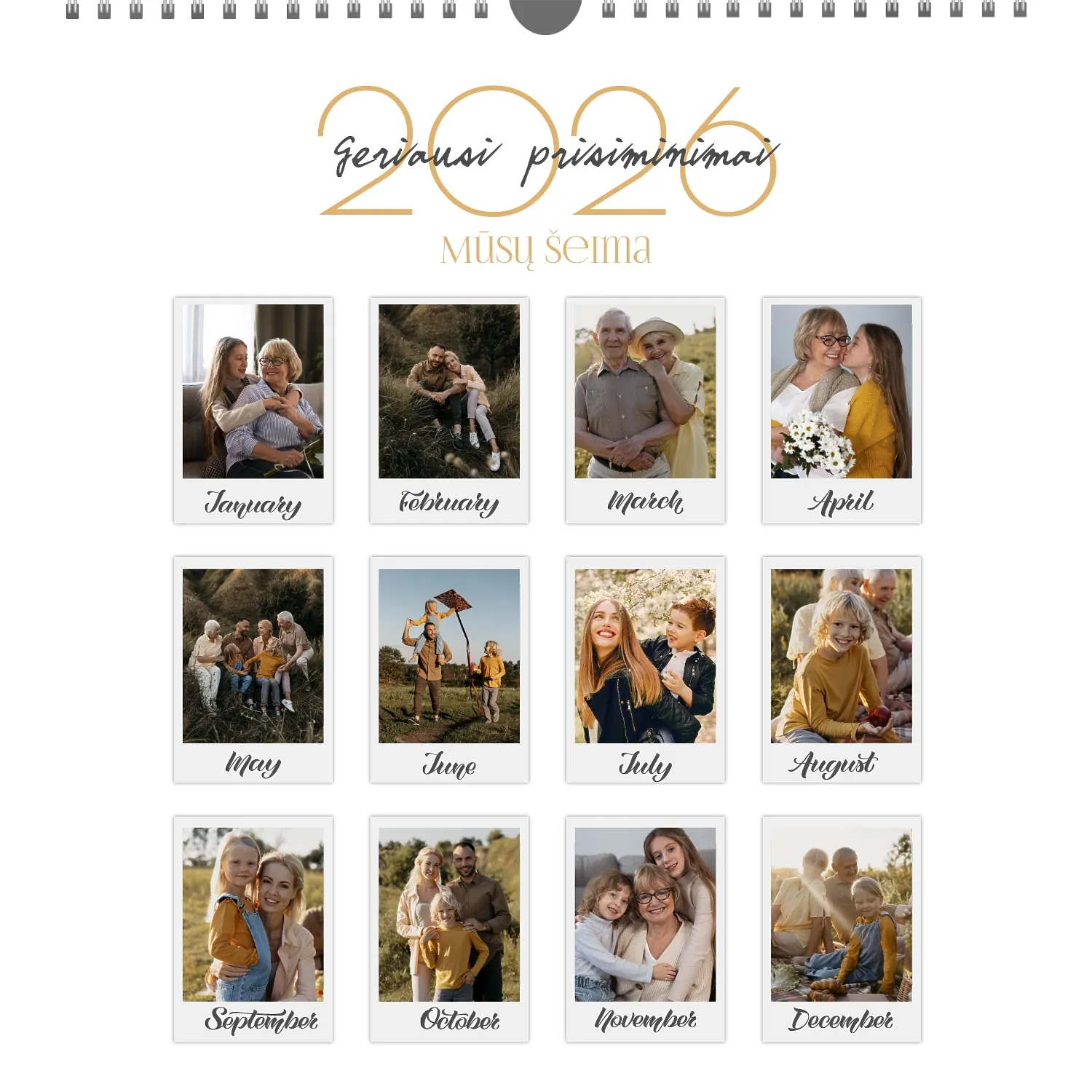 Šeimos nuotraukų kalendorius yra ne tik praktiškas planavimo įrankis, bet ir šiltas priminimas apie artimiausius žmones. Jau paruoštas šablonas leidžia lengvai sukurti unikalų sieninį kvadratinį kalendorių, kuris jus džiugins ištisus metus. Šis šablonas Idealiai tinka šeimoms, norinčioms išsaugoti prisiminimus, taip pat profesionalams, kurie vertina individualumą ir nori pridėti asmeninį dėmesį į savo projektus. Kalendorius su šeimos nuotraukomis gali būti naudojamas įvairiose srityse. Tai bus puikus sprendimas pedagogams ir pedagogams, kurie kuria individualizuotas dovanas tėvams. Fotografai gali pasiūlyti klientams originalų būdą išsaugoti šeimos fotografijas. Tai taip pat bus naudinga dizaineriams ir rinkodaros specialistams, dirbantiems su asmeniniais produktais dovanoms ar akcijoms. Mūsų internetiniame dizaineryje galite pridėti savo nuotraukas, keisti elementų vietą, pasirinkti šriftų stilių ir net pasirinkti spalvų schemą pagal savo skonį. Dizaineris turi patogius įrankius, kad galėtumėte kuo tiksliau pritaikyti kalendorių pagal savo poreikius. Norite palikti daugiau vietos pastaboms ar pabrėžti svarbias datas? Tai lengva padaryti dėl lankstumo nustatymų.