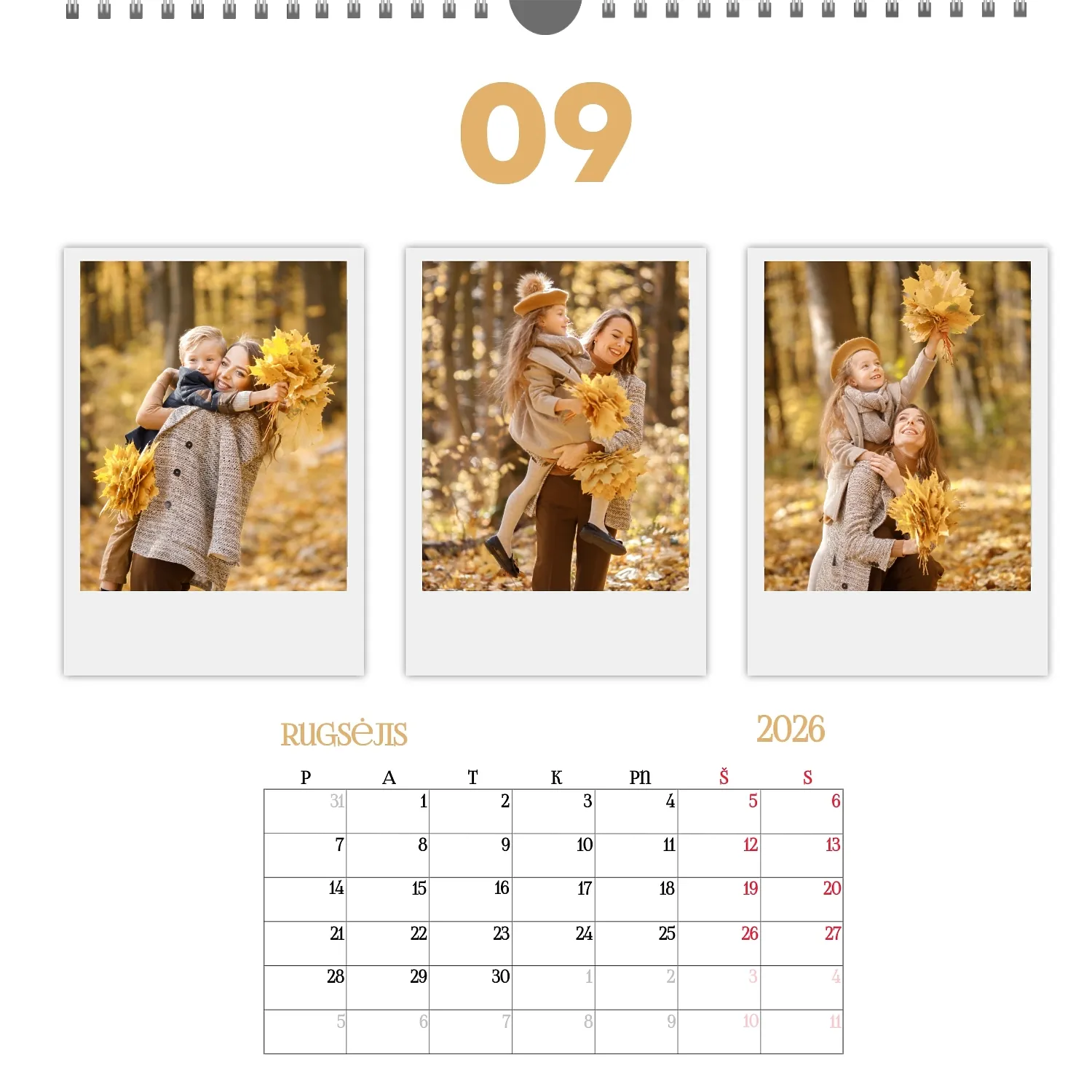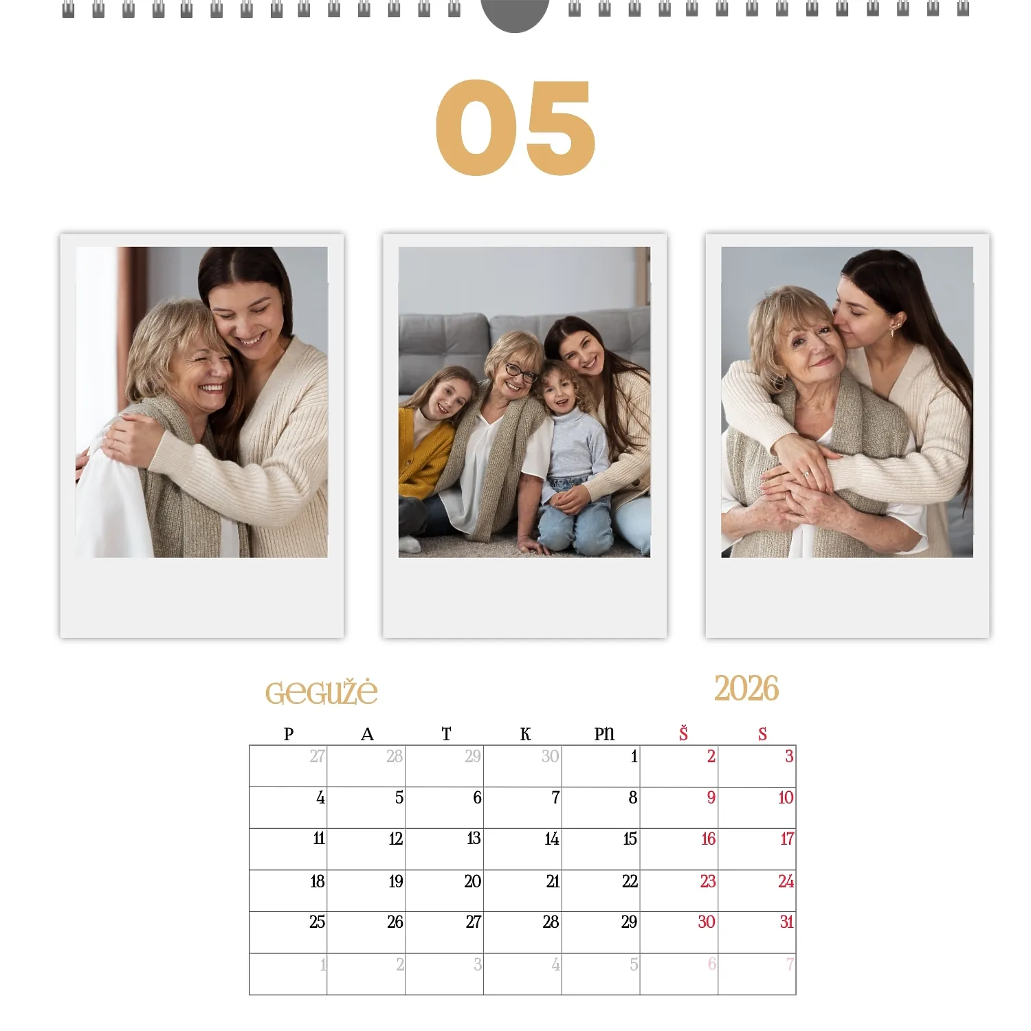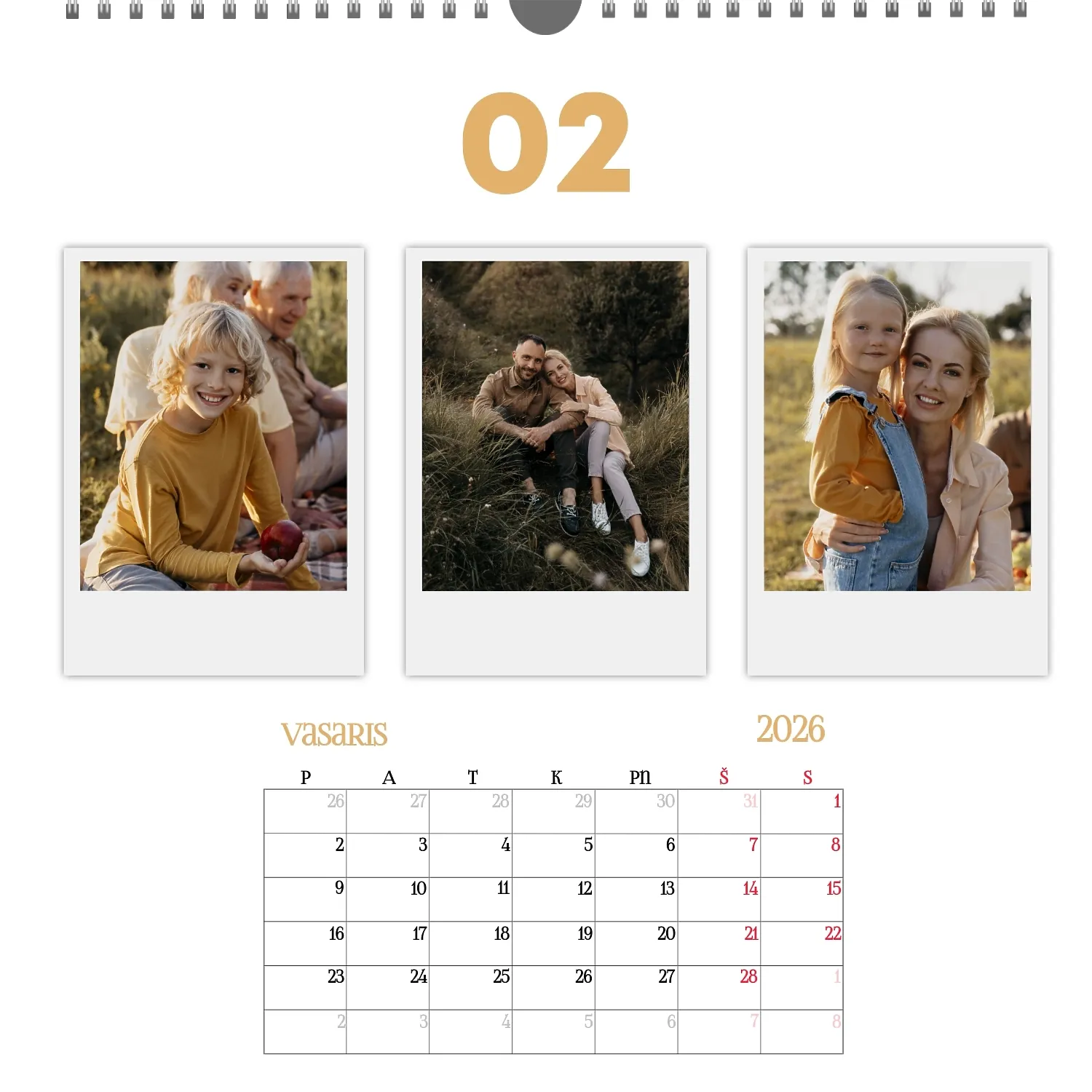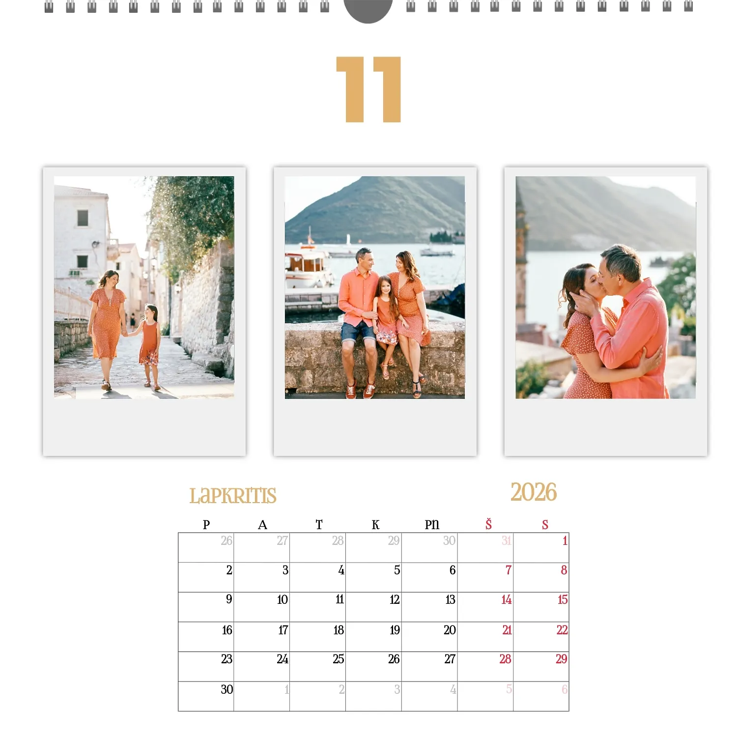 Šeimos nuotraukų kalendorius yra ne tik praktiškas planavimo įrankis, bet ir šiltas priminimas apie artimiausius žmones. Jau paruoštas šablonas leidžia lengvai sukurti unikalų sieninį kvadratinį kalendorių, kuris jus džiugins ištisus metus. Šis šablonas Idealiai tinka šeimoms, norinčioms išsaugoti prisiminimus, taip pat profesionalams, kurie vertina individualumą ir nori pridėti asmeninį dėmesį į savo projektus. Kalendorius su šeimos nuotraukomis gali būti naudojamas įvairiose srityse. Tai bus puikus sprendimas pedagogams ir pedagogams, kurie kuria individualizuotas dovanas tėvams. Fotografai gali pasiūlyti klientams originalų būdą išsaugoti šeimos fotografijas. Tai taip pat bus naudinga dizaineriams ir rinkodaros specialistams, dirbantiems su asmeniniais produktais dovanoms ar akcijoms. Mūsų internetiniame dizaineryje galite pridėti savo nuotraukas, keisti elementų vietą, pasirinkti šriftų stilių ir net pasirinkti spalvų schemą pagal savo skonį. Dizaineris turi patogius įrankius, kad galėtumėte kuo tiksliau pritaikyti kalendorių pagal savo poreikius. Norite palikti daugiau vietos pastaboms ar pabrėžti svarbias datas? Tai lengva padaryti dėl lankstumo nustatymų.