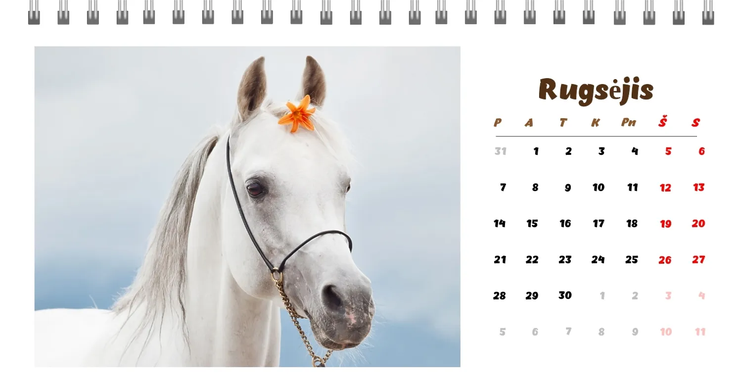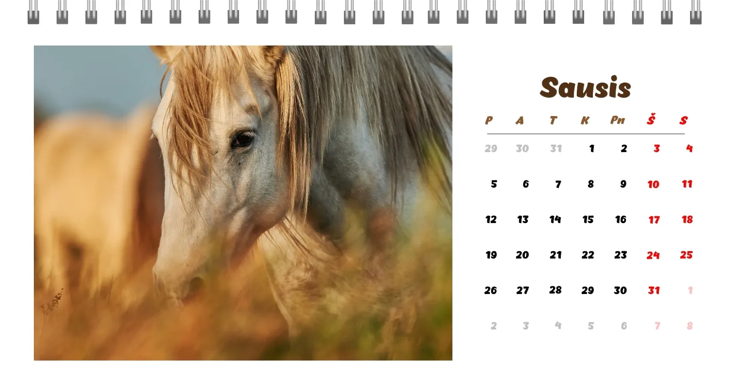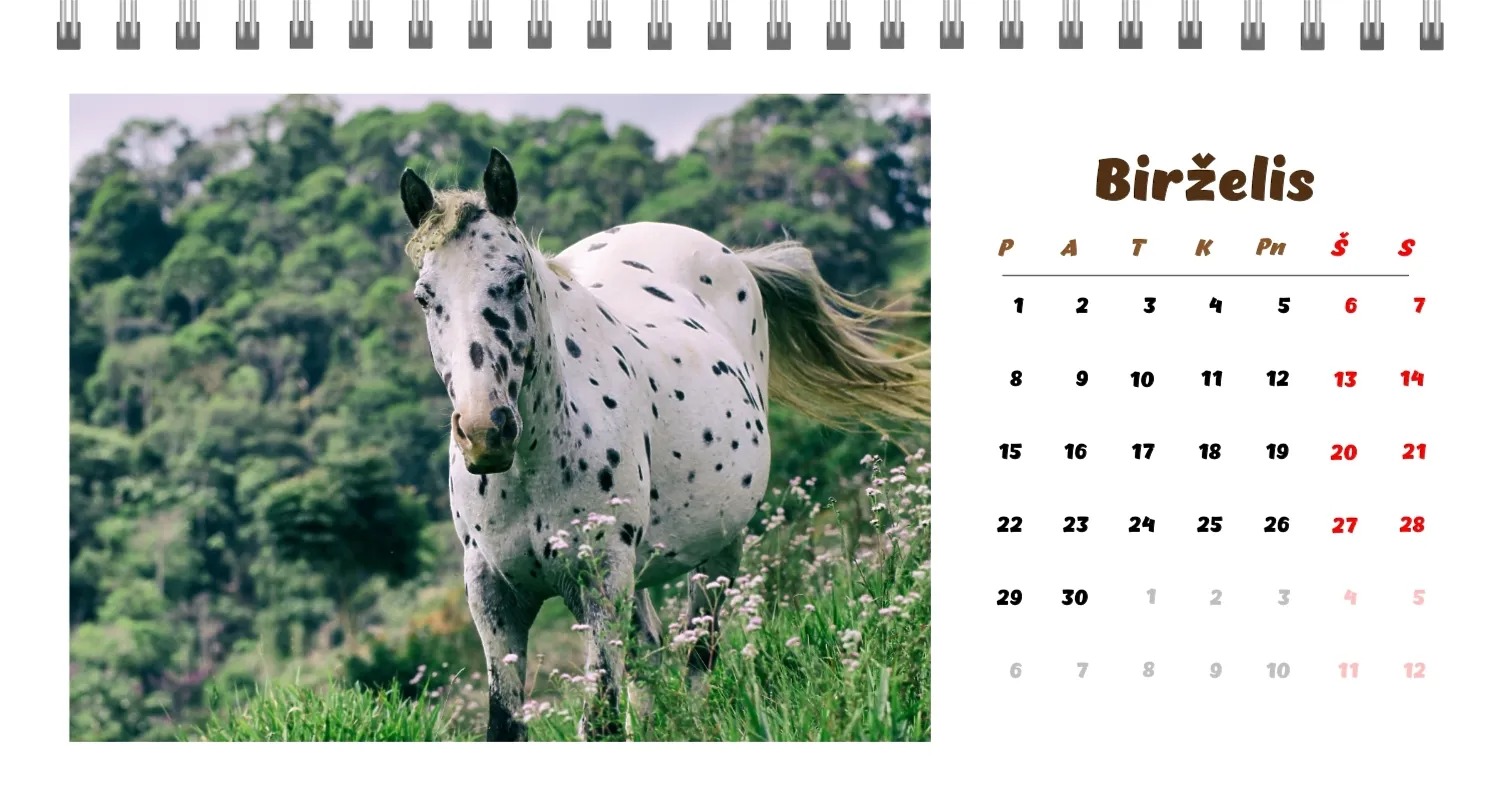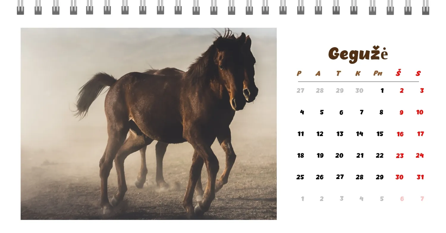 Gatavas horizontalaus persidengiančio kalendoriaus šablonas su žirgais sukurtas tiems, kurie vertina natūralią harmoniją, dinamiką ir jėgos simboliką. Nuotraukose pavaizduoti galingi ir kilnūs gyvūnai, kurie asocijuojasi su laisve, siekiu į priekį ir vidine pusiausvyra. Šis kalendorius puikiai tinka žirgų klubams, ūkiams, veterinarijos centrams, naminių gyvūnėlių parduotuvėms, taip pat treneriams, instruktoriams, fotografams ir visiems, kurie mėgsta žirgų sportą ar tiesiog myli arklius. Jis bus vienodai tinkamas tiek darbo kambaryje, tiek namų interjere, sukuriant ramybės ir įkvėpimo atmosferą. Mūsų internetiniame dizaineryje šį šabloną galima lengvai pritaikyti prie asmeninių pageidavimų. Galite pakeisti nuotraukas į savo arklių nuotraukas, pridėti klubo ar ūkio logotipą, pakeisti šriftus, spalvas ir elementų išdėstymą. Yra galimybė pasirašyti mėnesius, pabrėžti svarbias datas, pažymėti varžybas, treniruotes, gimtadienius ir kitus įvykius. Bet koks kalendoriaus elementas – nuo fono iki smulkių detalių - gali būti redaguojamas, o tai leidžia sukurti tikrai individualizuotą versiją. Internetinis dizaineris veikia kuo patogiau ir paprasčiau: visi pakeitimai rodomi iš karto, galite eksperimentuoti su kompozicijomis, išbandyti skirtingus stilius ir išsaugoti keletą variantų.