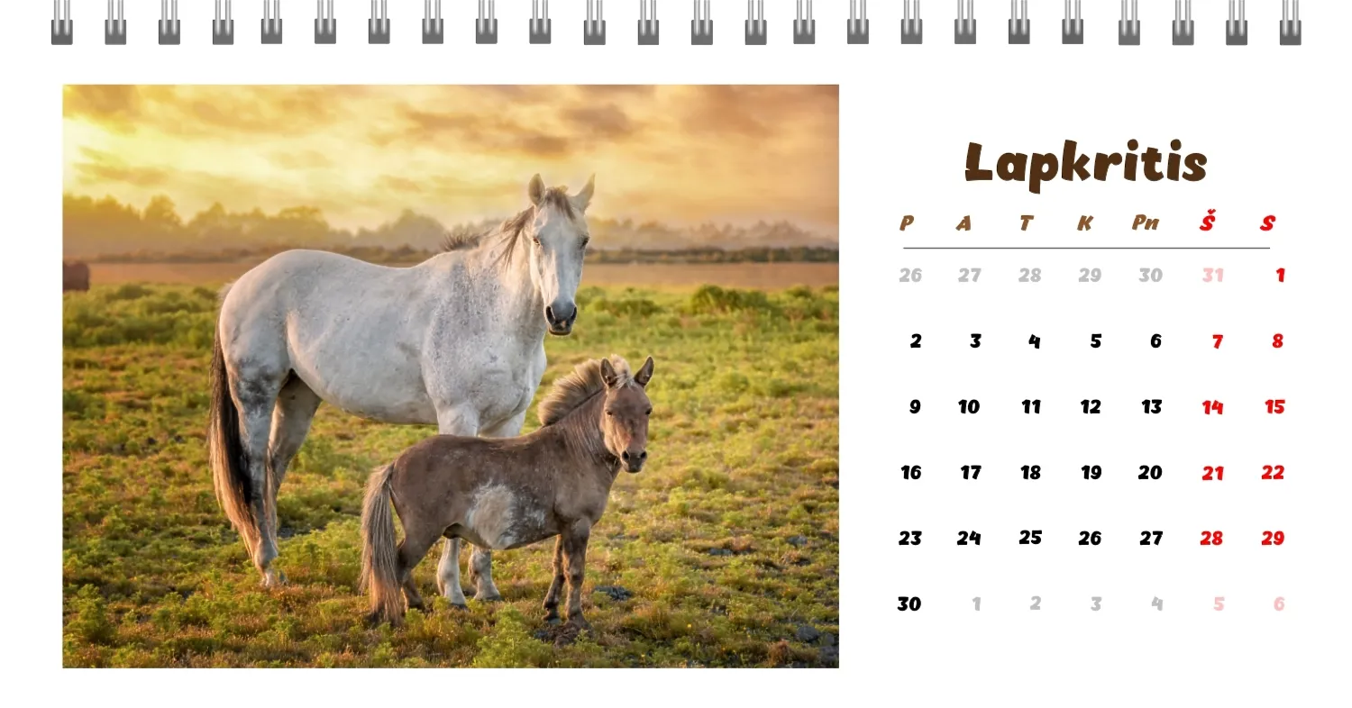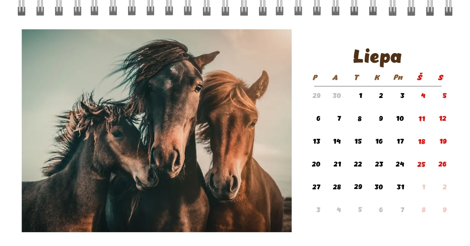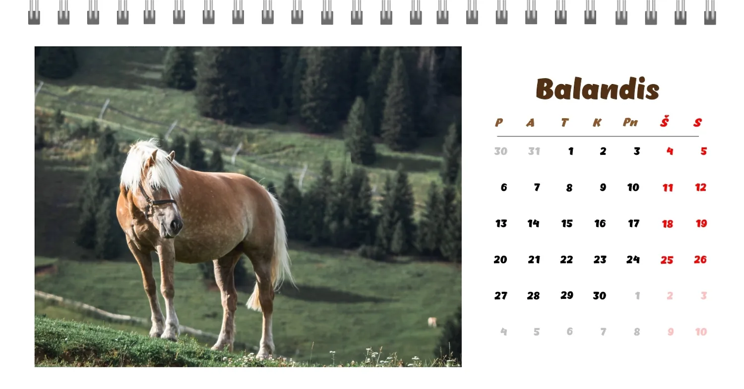Gatavas horizontalaus persidengiančio kalendoriaus šablonas su žirgais sukurtas tiems, kurie vertina natūralią harmoniją, dinamiką ir jėgos simboliką. Nuotraukose pavaizduoti galingi ir kilnūs gyvūnai, kurie asocijuojasi su laisve, siekiu į priekį ir vidine pusiausvyra. Šis kalendorius puikiai tinka žirgų klubams, ūkiams, veterinarijos centrams, naminių gyvūnėlių parduotuvėms, taip pat treneriams, instruktoriams, fotografams ir visiems, kurie mėgsta žirgų sportą ar tiesiog myli arklius. Jis bus vienodai tinkamas tiek darbo kambaryje, tiek namų interjere, sukuriant ramybės ir įkvėpimo atmosferą. Mūsų internetiniame dizaineryje šį šabloną galima lengvai pritaikyti prie asmeninių pageidavimų. Galite pakeisti nuotraukas į savo arklių nuotraukas, pridėti klubo ar ūkio logotipą, pakeisti šriftus, spalvas ir elementų išdėstymą. Yra galimybė pasirašyti mėnesius, pabrėžti svarbias datas, pažymėti varžybas, treniruotes, gimtadienius ir kitus įvykius. Bet koks kalendoriaus elementas – nuo fono iki smulkių detalių - gali būti redaguojamas, o tai leidžia sukurti tikrai individualizuotą versiją. Internetinis dizaineris veikia kuo patogiau ir paprasčiau: visi pakeitimai rodomi iš karto, galite eksperimentuoti su kompozicijomis, išbandyti skirtingus stilius ir išsaugoti keletą variantų.