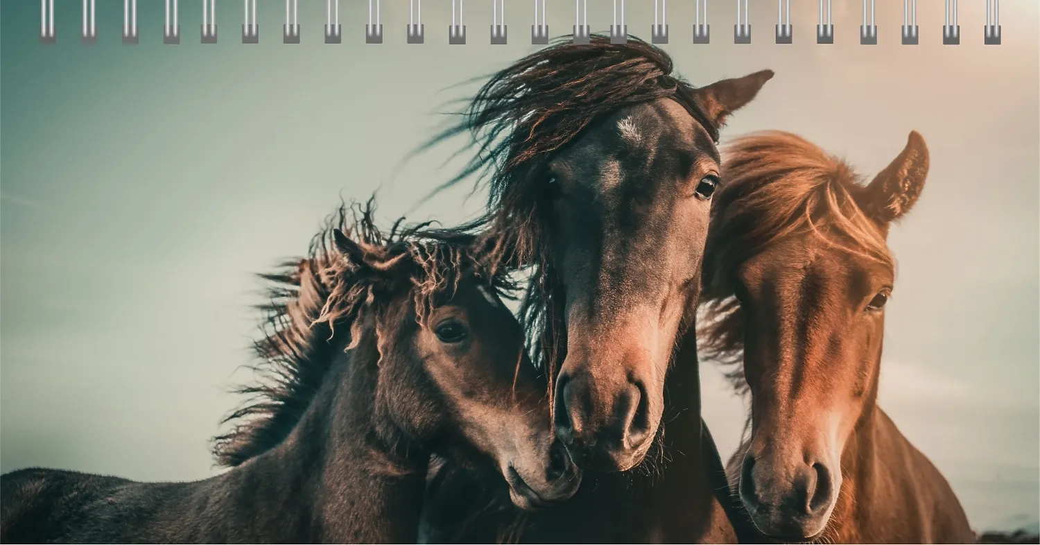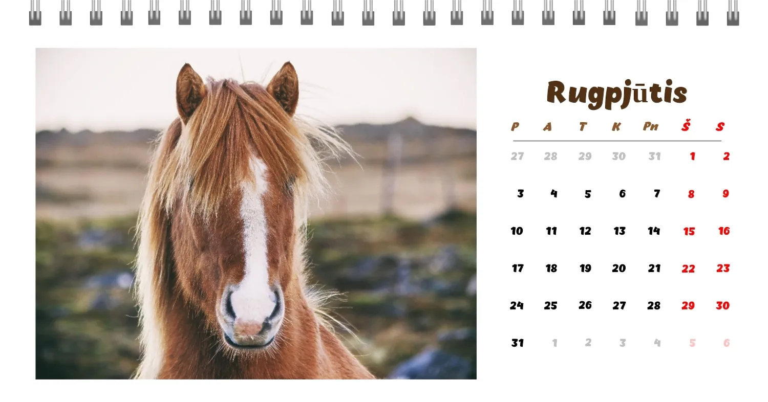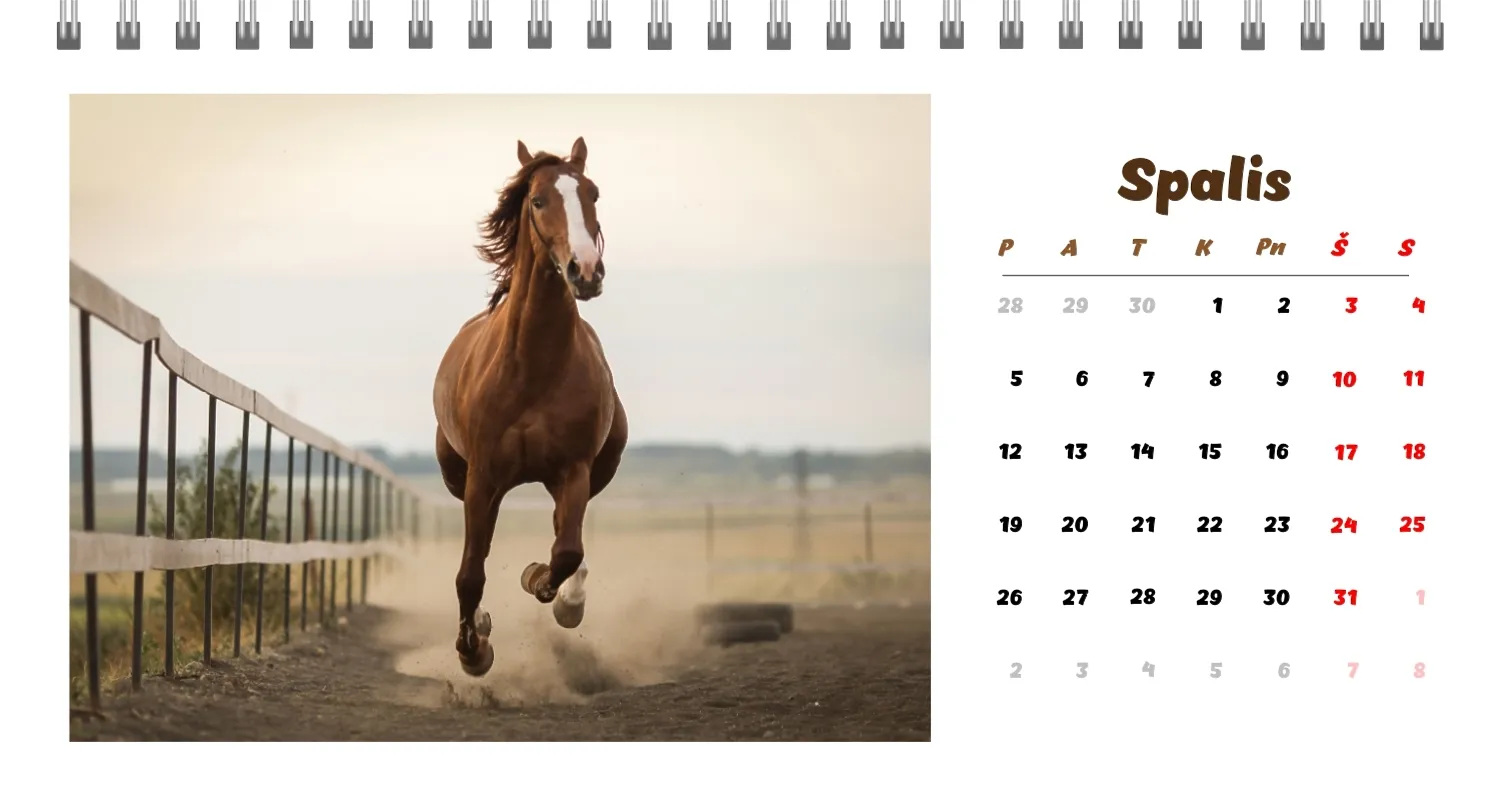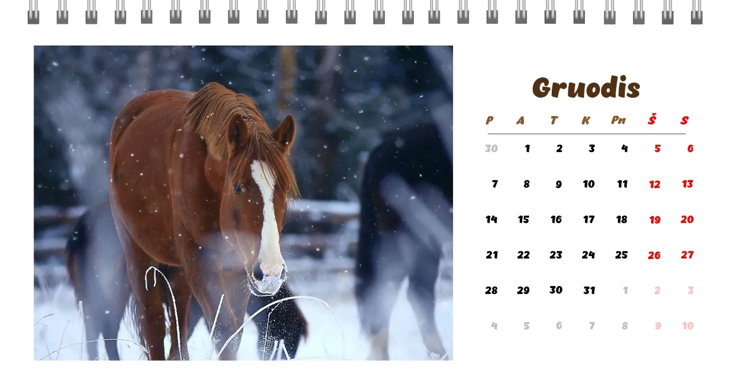 Gatavas horizontalaus persidengiančio kalendoriaus šablonas su žirgais sukurtas tiems, kurie vertina natūralią harmoniją, dinamiką ir jėgos simboliką. Nuotraukose pavaizduoti galingi ir kilnūs gyvūnai, kurie asocijuojasi su laisve, siekiu į priekį ir vidine pusiausvyra. Šis kalendorius puikiai tinka žirgų klubams, ūkiams, veterinarijos centrams, naminių gyvūnėlių parduotuvėms, taip pat treneriams, instruktoriams, fotografams ir visiems, kurie mėgsta žirgų sportą ar tiesiog myli arklius. Jis bus vienodai tinkamas tiek darbo kambaryje, tiek namų interjere, sukuriant ramybės ir įkvėpimo atmosferą. Mūsų internetiniame dizaineryje šį šabloną galima lengvai pritaikyti prie asmeninių pageidavimų. Galite pakeisti nuotraukas į savo arklių nuotraukas, pridėti klubo ar ūkio logotipą, pakeisti šriftus, spalvas ir elementų išdėstymą. Yra galimybė pasirašyti mėnesius, pabrėžti svarbias datas, pažymėti varžybas, treniruotes, gimtadienius ir kitus įvykius. Bet koks kalendoriaus elementas – nuo fono iki smulkių detalių - gali būti redaguojamas, o tai leidžia sukurti tikrai individualizuotą versiją. Internetinis dizaineris veikia kuo patogiau ir paprasčiau: visi pakeitimai rodomi iš karto, galite eksperimentuoti su kompozicijomis, išbandyti skirtingus stilius ir išsaugoti keletą variantų.