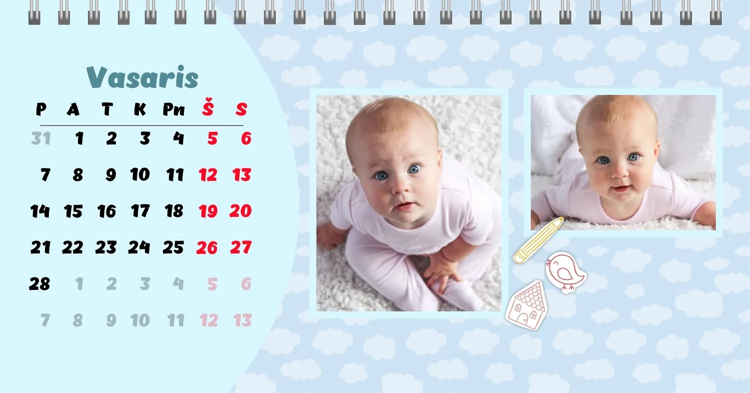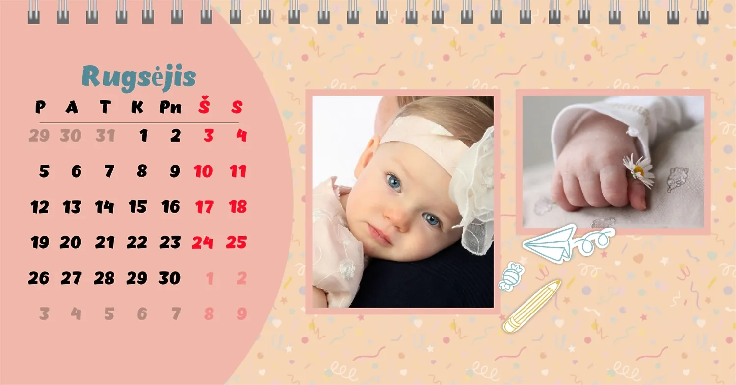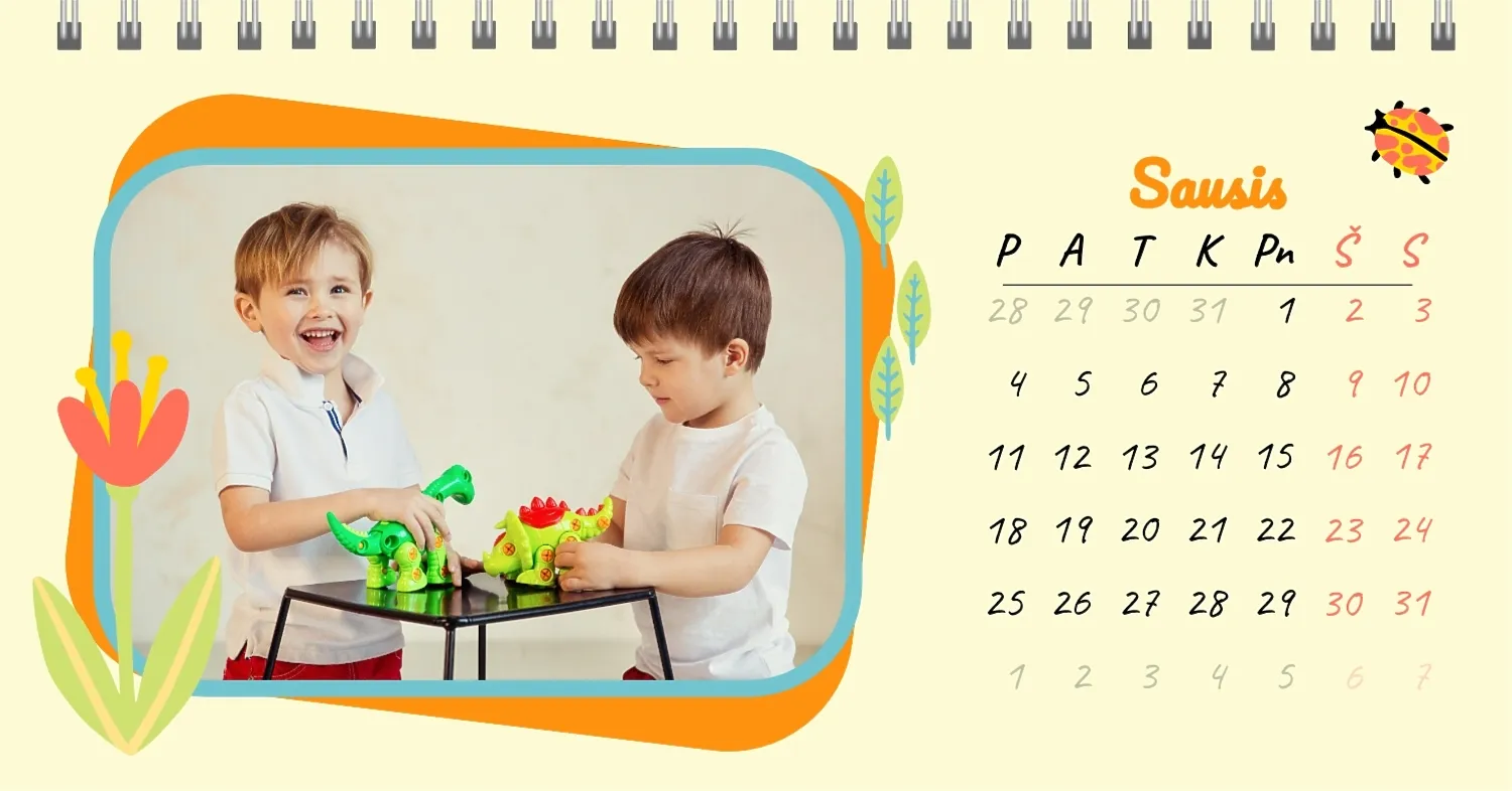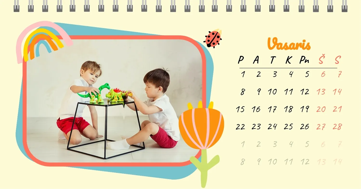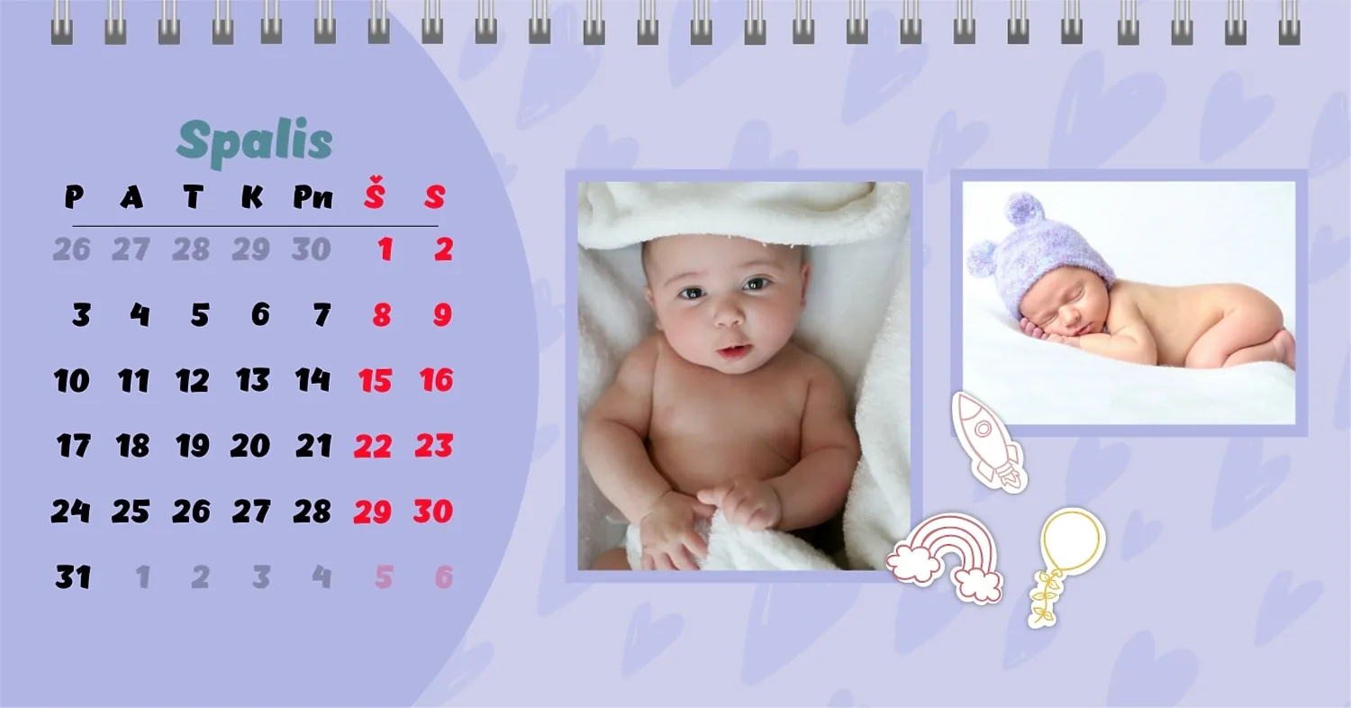 Gatavų šabloną stalinis перекидного kalendorių su nuotrauka vaikams ir keturiems декоративным оформлением sukurtas tiems, kurie vertina šiltas šeimos emocijas ir nori paversti įprastą kalendorių į jaukius asmeninį priedą. Konkurso пастельные pilki, tvarkingas, iliustracijos, vaikų dekoro elementai ir dėmesys nuotraukas daro toks kalendorius yra ypač patraukli tėvų, воспитателей, mokytojai kūrybinės studijos, vaikų fotografai ir visiems, kurie dirba su vaikais ar sukuria jų turinį. Jis tinka šeimos archyvų, vaikų sodų, mokomųjų centrų ir mažų studijos, kurie nori savo klientams pasiūlyti malonus ir emocinis produktas. Mūsų internetiniame dizaineryje šį šabloną lengva paversti savo užduotimis. Jūs galite pakeisti savo nuotraukas, keisti elementus, redaguoti teksto laukelius, pasirinkti kitų šriftai ir spalvos, pridėti ženklelius arba atvirkščiai — nuima nereikalingus, sukurti daugiau минималистичную dainą. Kiekvieną mėnesį galite užsisakyti skirtingai, pridedant svarbias datas, individualios pastabos ar mažus paveikslėlius, kurios pabrėžia charakterį vaiko ar тематику nuotraukos.