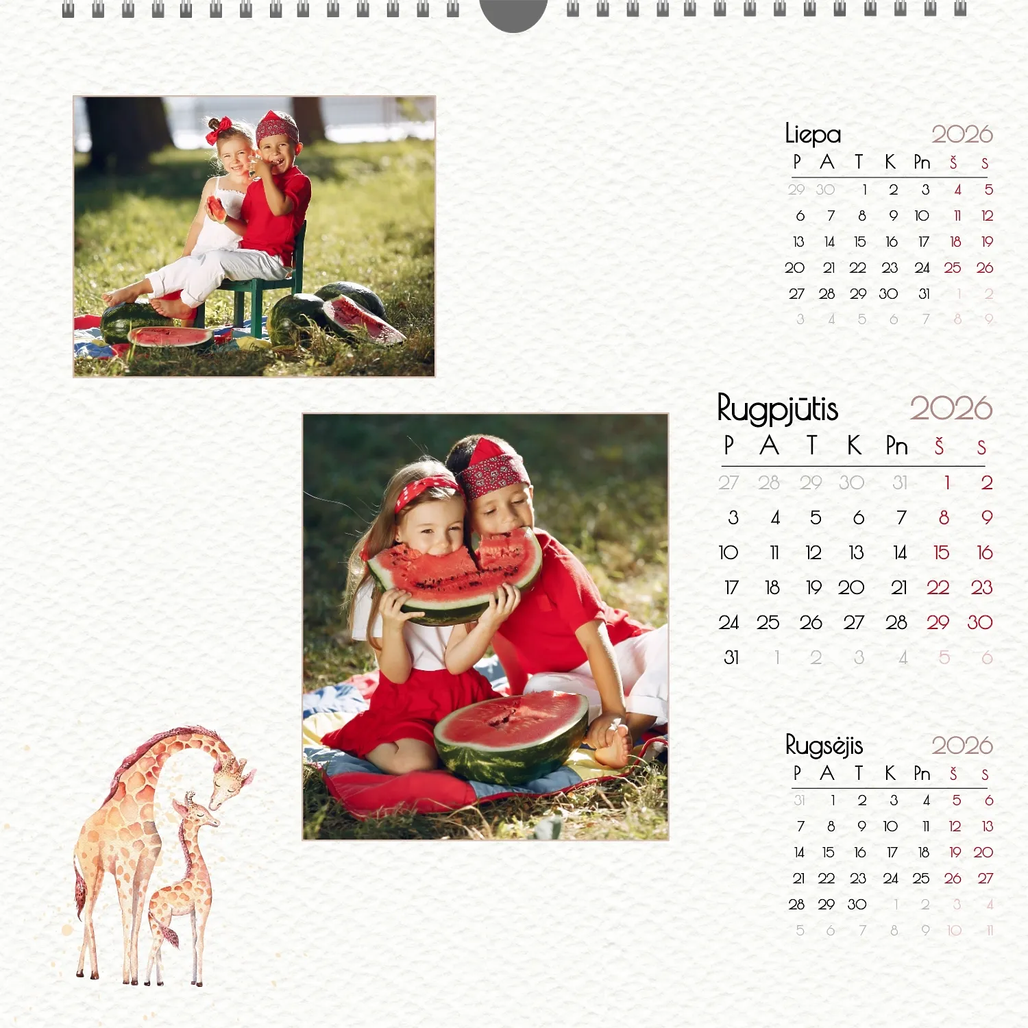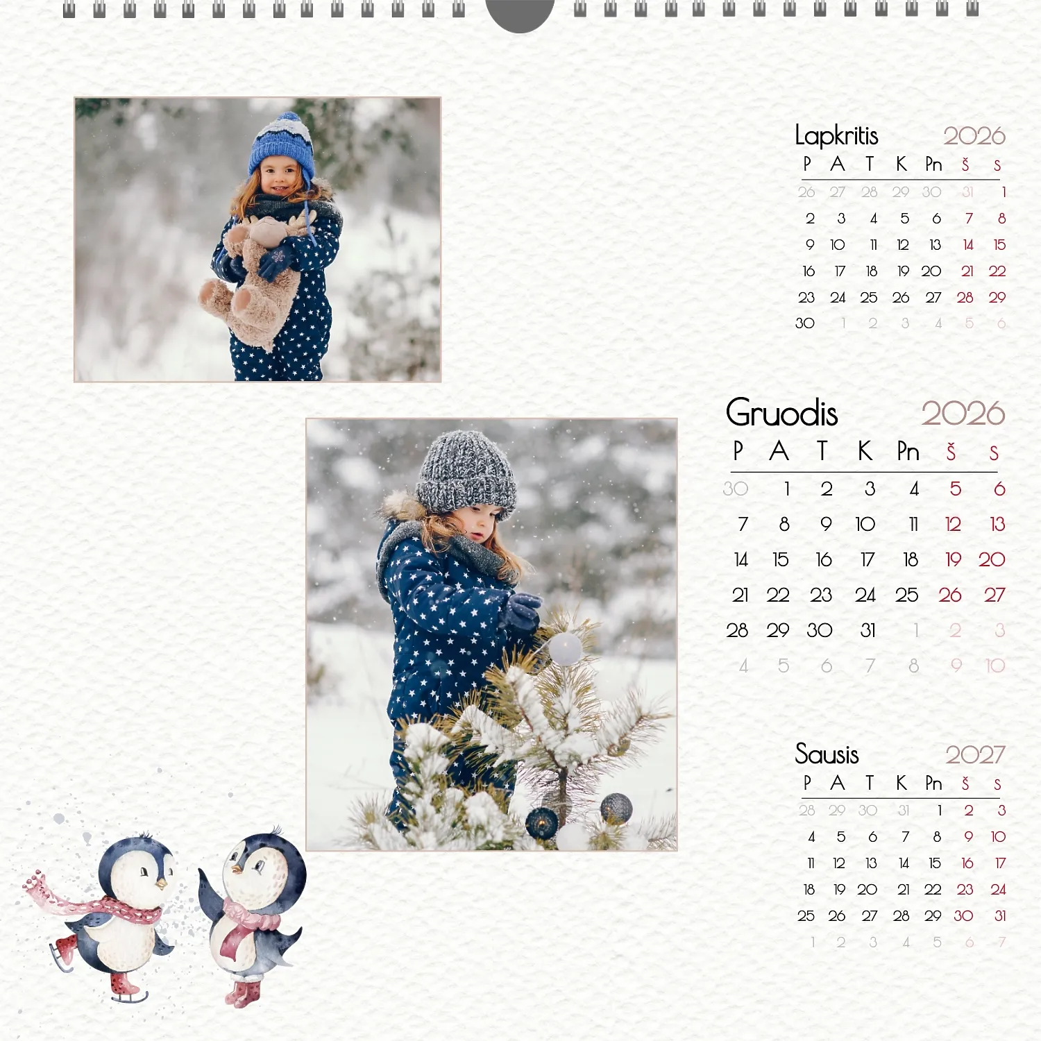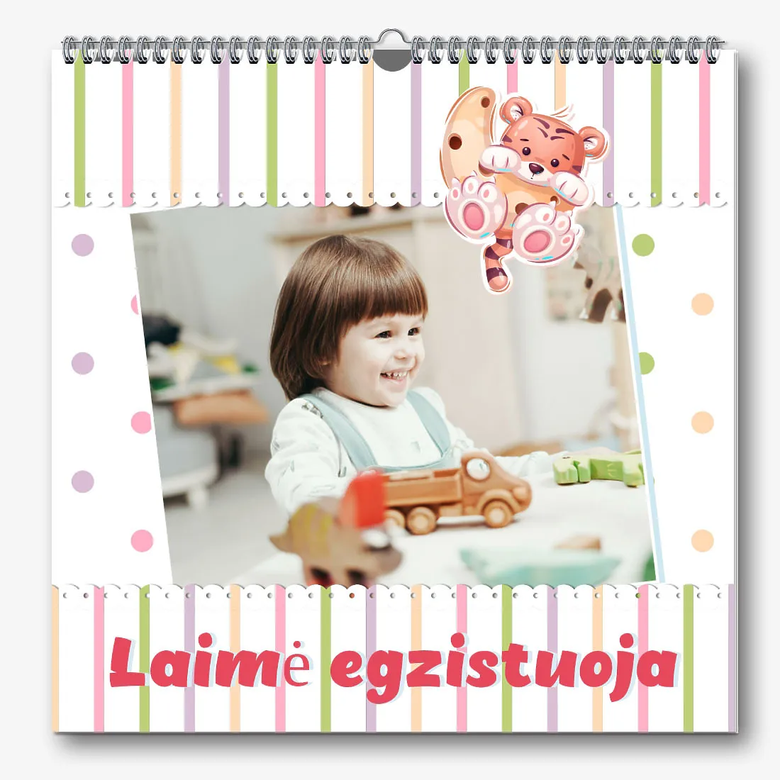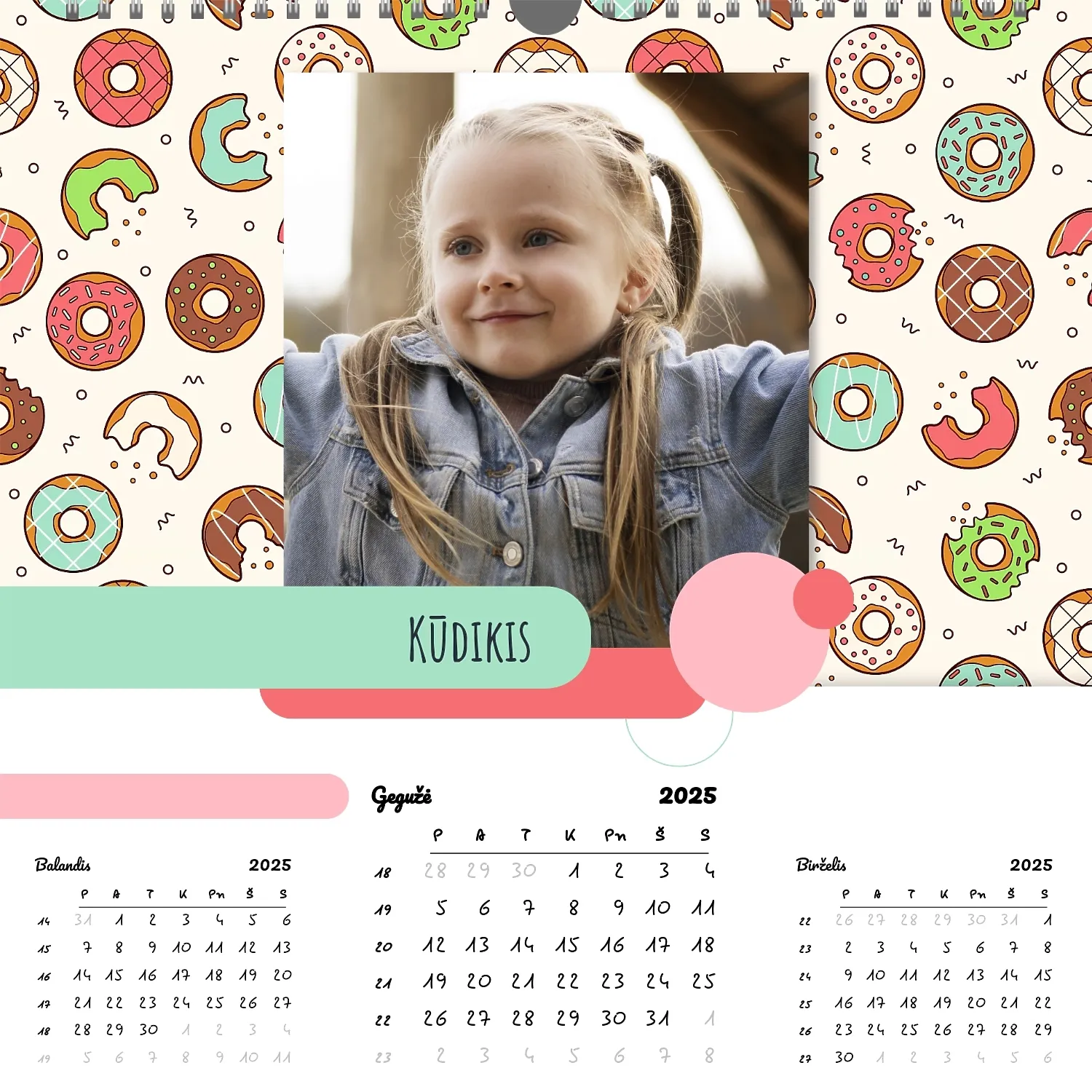 Paruoštas sienos kvadratinio kalendoriaus šablonas su vaikų nuotraukomis ir mielu dekoratyviniu dizainu sukurtas tiems, kurie vertina šiltas šeimos emocijas ir nori paversti įprastą kalendorių jaukiu asmeniniu priedu. Švelnūs pasteliniai atspalviai, tvarkingos iliustracijos, Vaikiški dekoro elementai ir fotografijos akcentas daro tokį kalendorių ypač patraukliu tėvams, pedagogams, kūrybinių studijų pedagogams, vaikų fotografams ir visiems, dirbantiems su vaikais ar kuriantiems jiems turinį. . Mūsų internetiniame dizaineryje šį šabloną lengva paversti savo užduotimis. Galite pakeisti nuotraukas, keisti elementų išdėstymą, redaguoti užrašus, pasirinkti kitus šriftus ir atspalvius, pridėti dekoratyvinių įdėklų arba atvirkščiai — pašalinti nereikalingus, kad būtų sukurta minimalistinė kompozicija. Kiekvieną mėnesį galite organizuoti įvairiais būdais, pridedant svarbias datas, atskiras pastabas ar mažus paveikslėlius, kurie pabrėžia vaiko charakterį ar fotografijos temą. Dėl intuityvaus valdymo ir nustatymų lankstumo jūs visiškai kontroliuojate būsimo kalendoriaus išvaizdą. Net ir be dizaino įgūdžių galite sukurti profesionaliai atrodantį išdėstymą, kuris džiugins visus metus. Šablonas yra tik pagrindas-dizaineryje jis virsta unikaliu, šiltu ir tikrai asmeniniu sienų kalendoriumi, pagamintu savo rankomis.