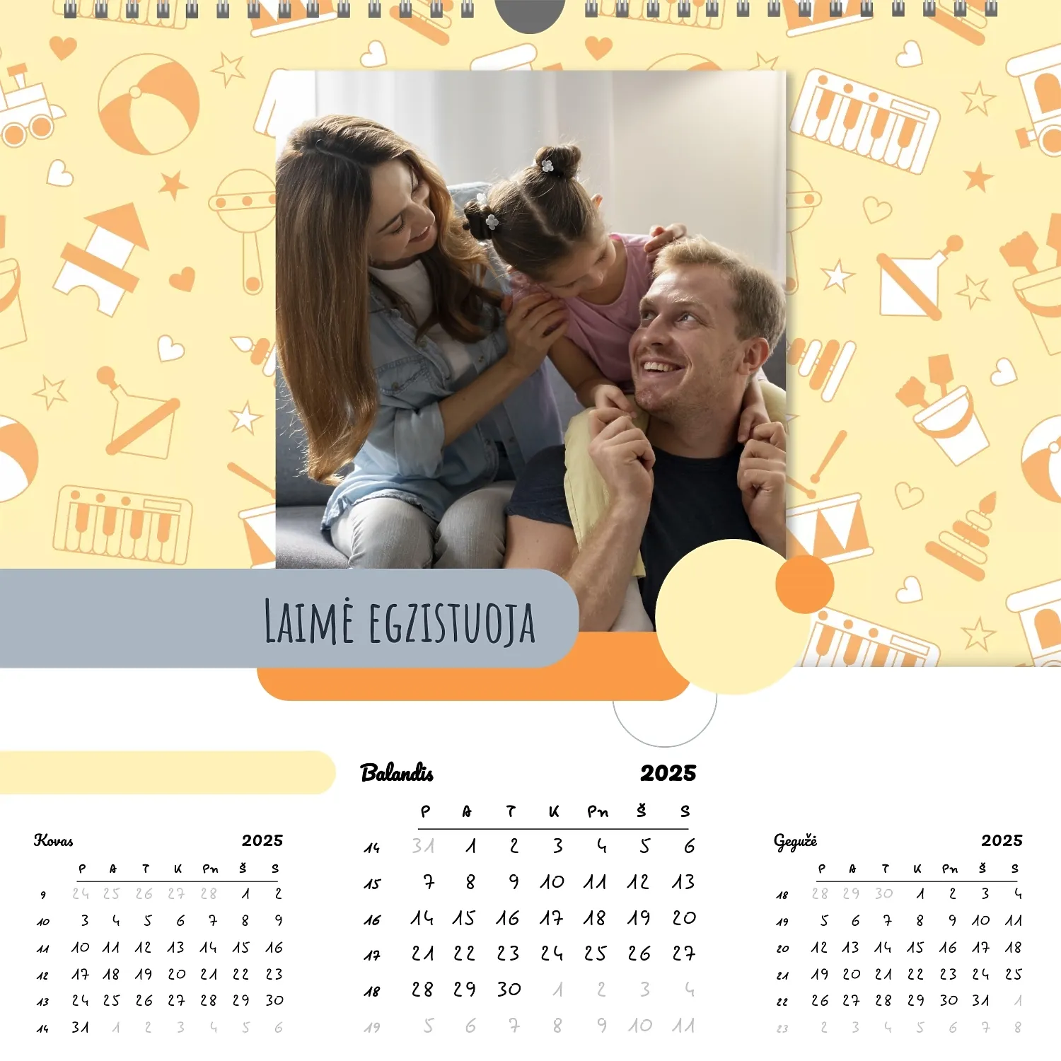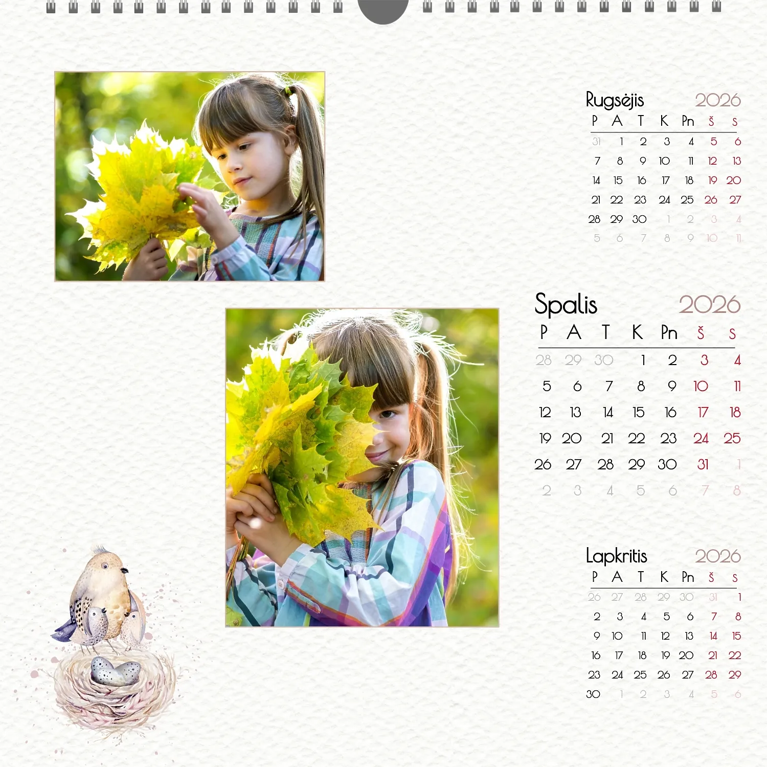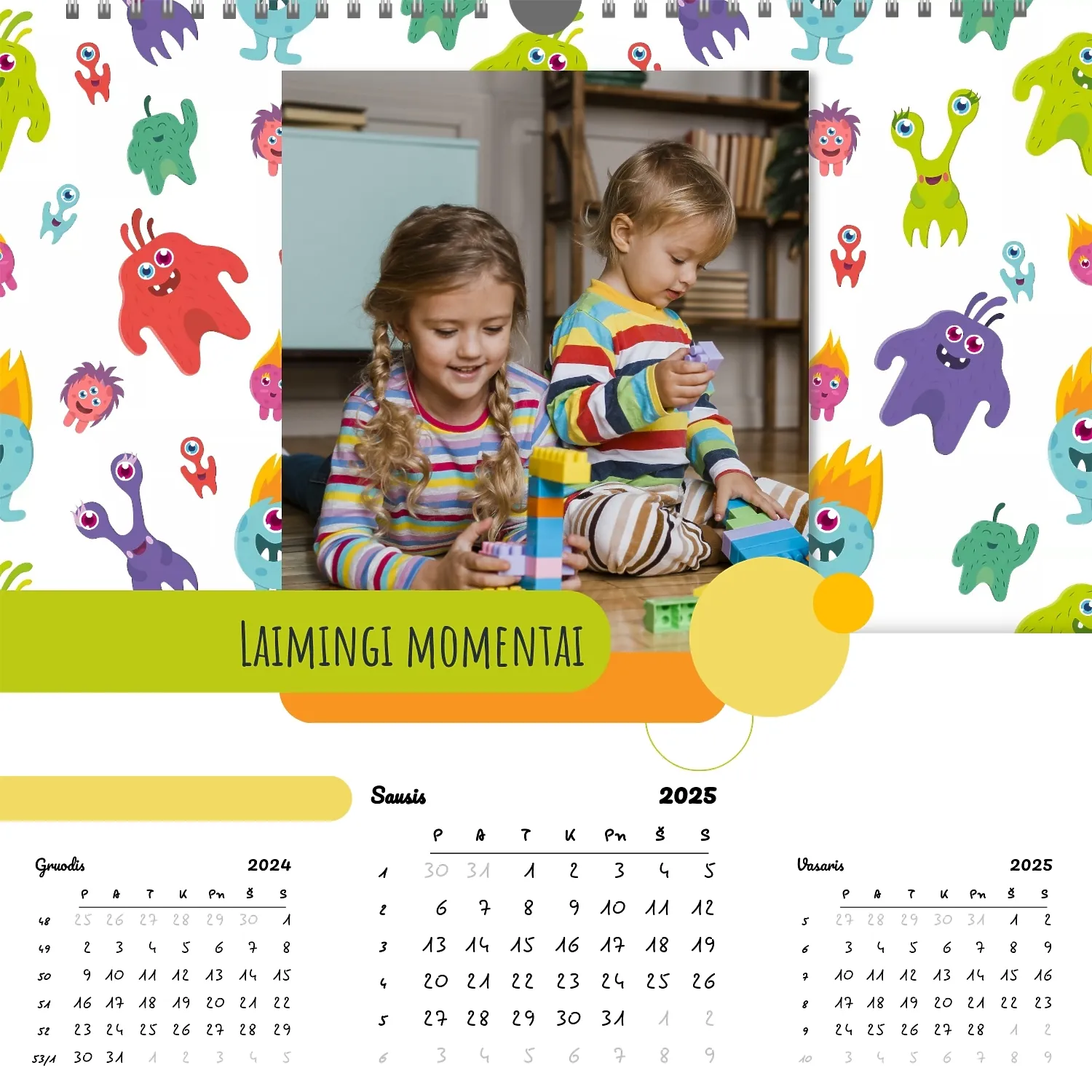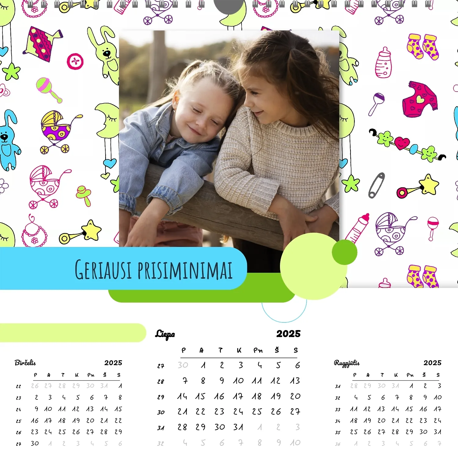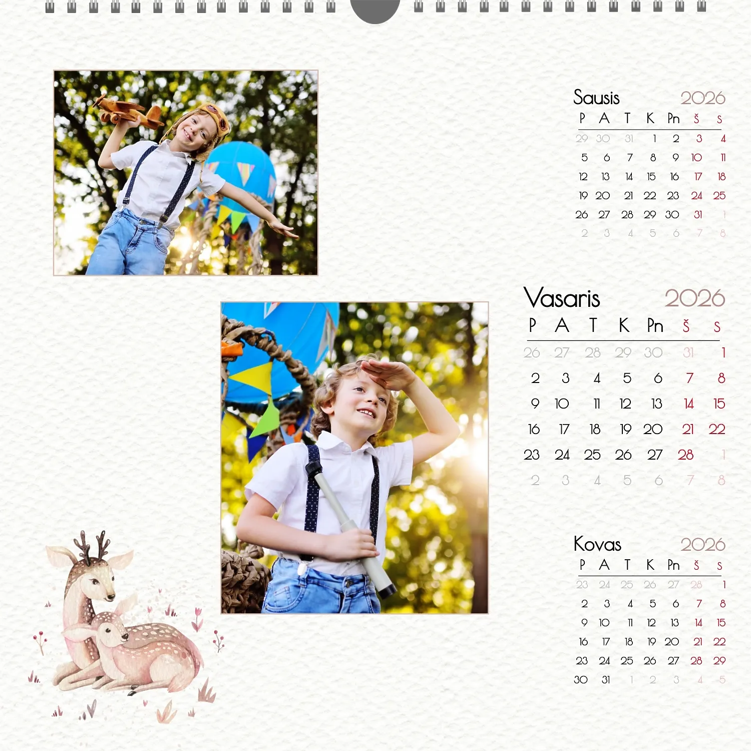 Paruoštas sienos kvadratinio kalendoriaus šablonas su vaikų nuotraukomis ir mielu dekoratyviniu dizainu sukurtas tiems, kurie vertina šiltas šeimos emocijas ir nori paversti įprastą kalendorių jaukiu asmeniniu priedu. Švelnūs pasteliniai atspalviai, tvarkingos iliustracijos, Vaikiški dekoro elementai ir fotografijos akcentas daro tokį kalendorių ypač patraukliu tėvams, pedagogams, kūrybinių studijų pedagogams, vaikų fotografams ir visiems, dirbantiems su vaikais ar kuriantiems jiems turinį. . Mūsų internetiniame dizaineryje šį šabloną lengva paversti savo užduotimis. Galite pakeisti nuotraukas, keisti elementų išdėstymą, redaguoti užrašus, pasirinkti kitus šriftus ir atspalvius, pridėti dekoratyvinių įdėklų arba atvirkščiai — pašalinti nereikalingus, kad būtų sukurta minimalistinė kompozicija. Kiekvieną mėnesį galite organizuoti įvairiais būdais, pridedant svarbias datas, atskiras pastabas ar mažus paveikslėlius, kurie pabrėžia vaiko charakterį ar fotografijos temą. Dėl intuityvaus valdymo ir nustatymų lankstumo jūs visiškai kontroliuojate būsimo kalendoriaus išvaizdą. Net ir be dizaino įgūdžių galite sukurti profesionaliai atrodantį išdėstymą, kuris džiugins visus metus. Šablonas yra tik pagrindas-dizaineryje jis virsta unikaliu, šiltu ir tikrai asmeniniu sienų kalendoriumi, pagamintu savo rankomis.