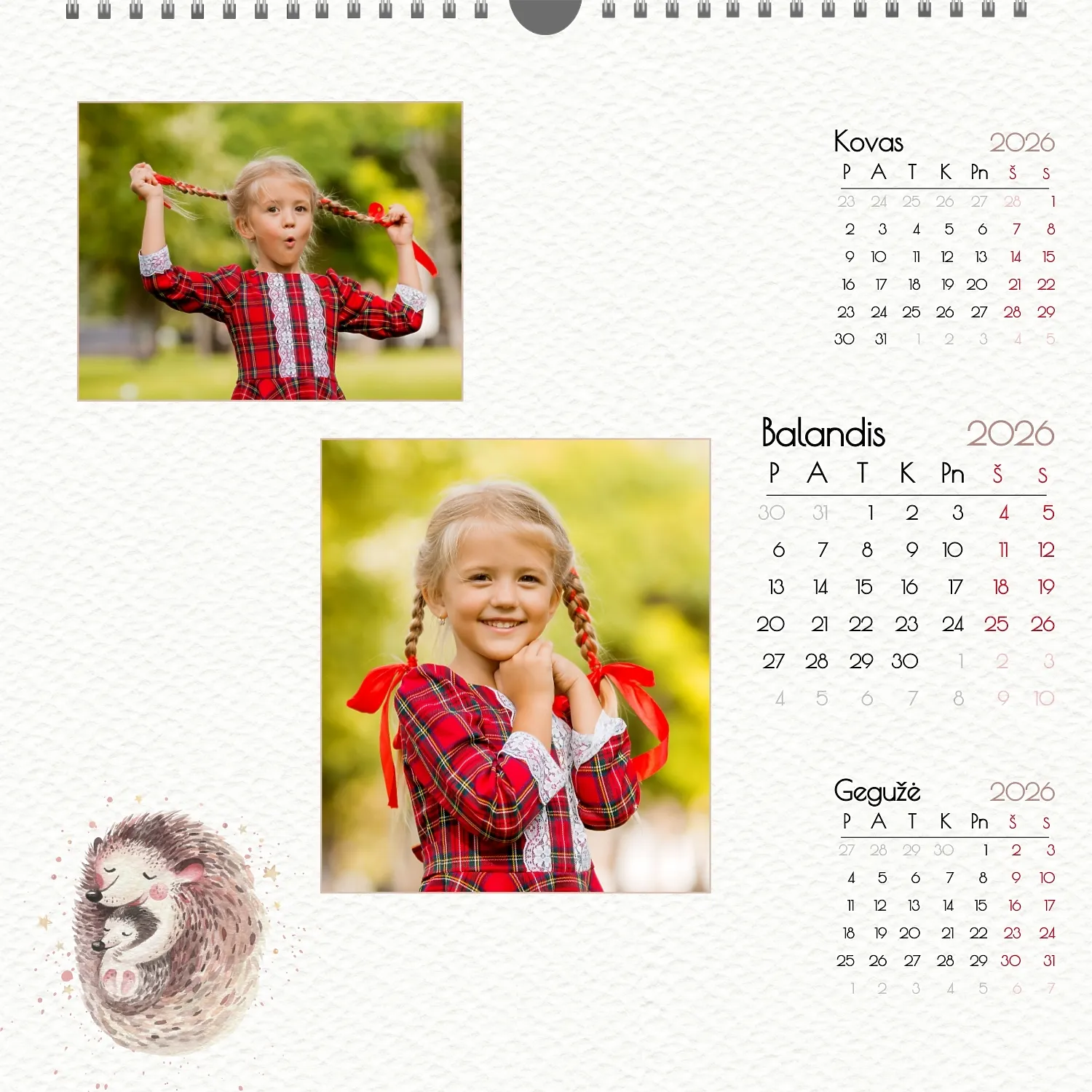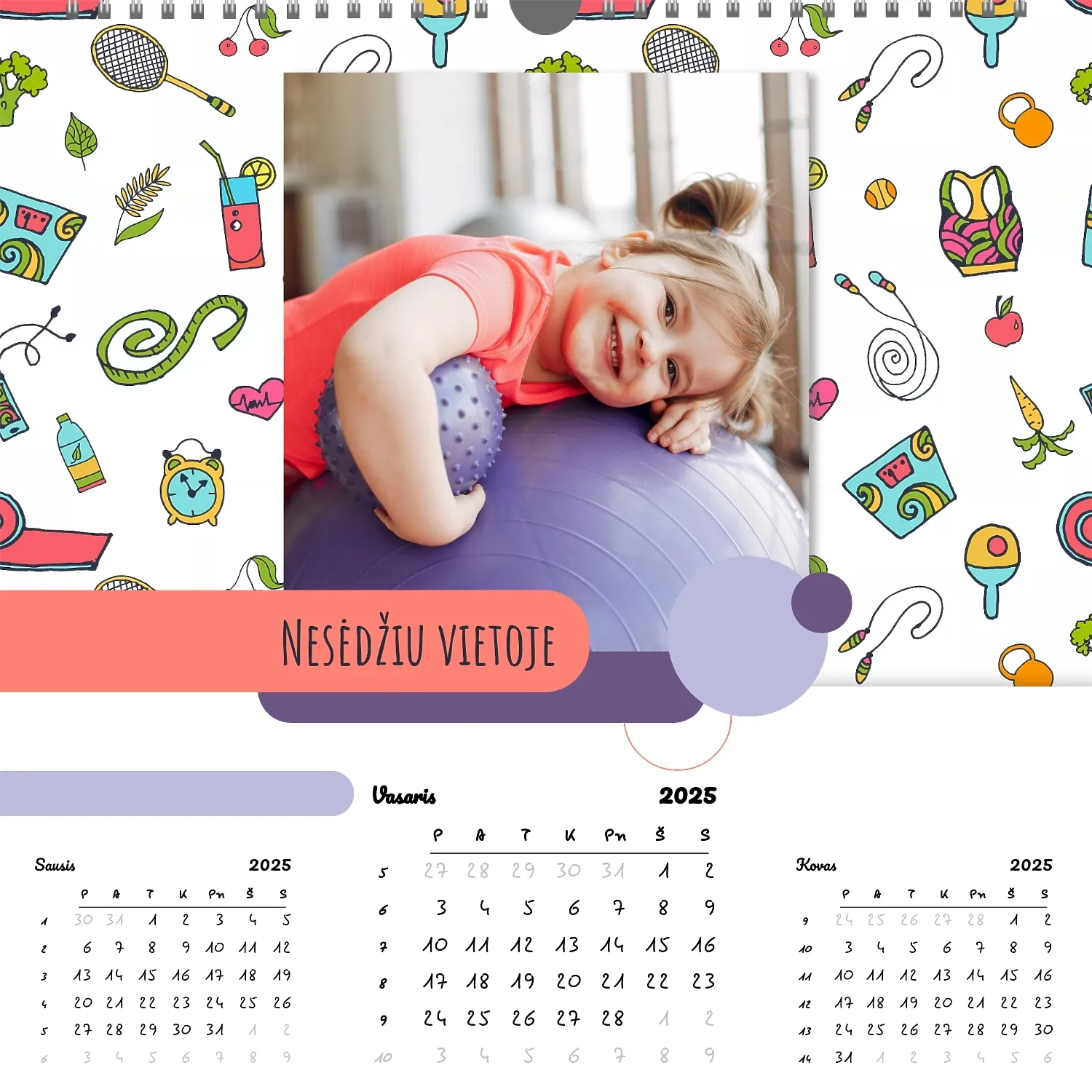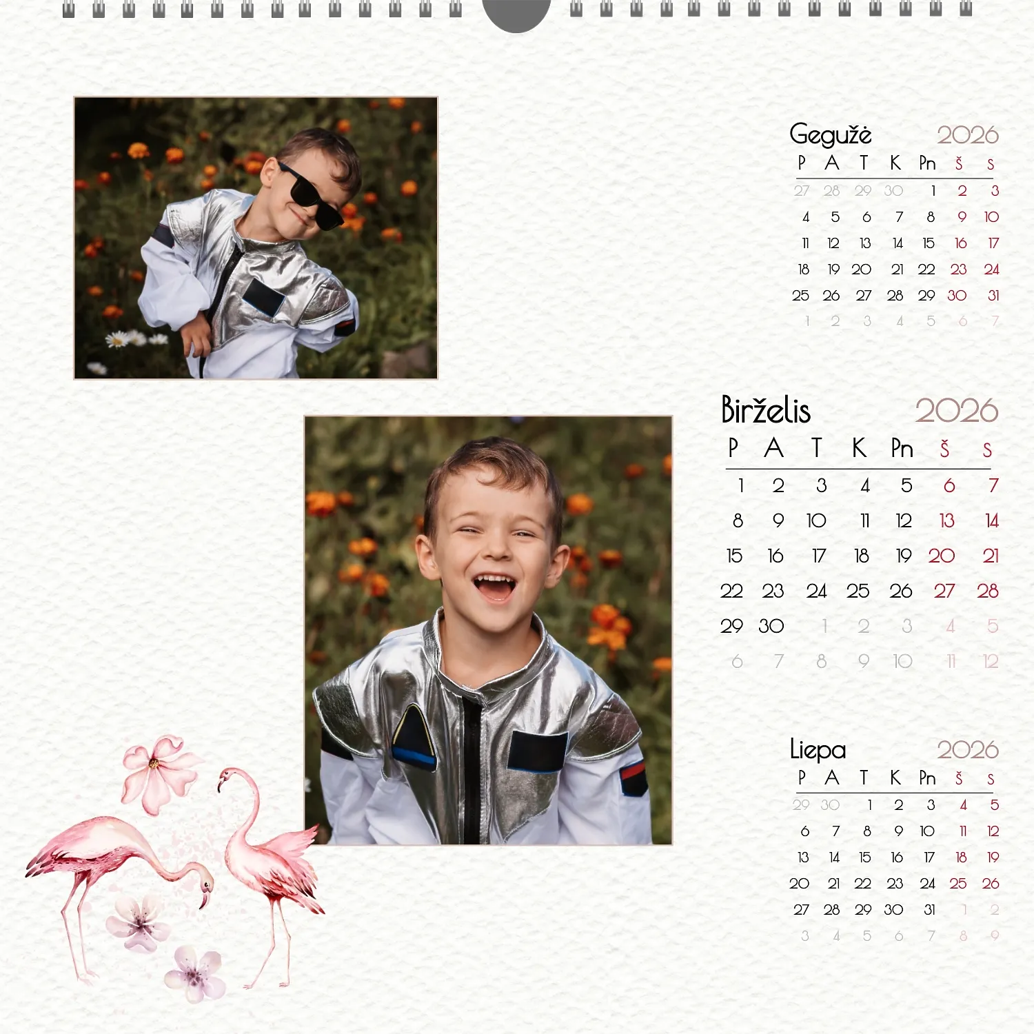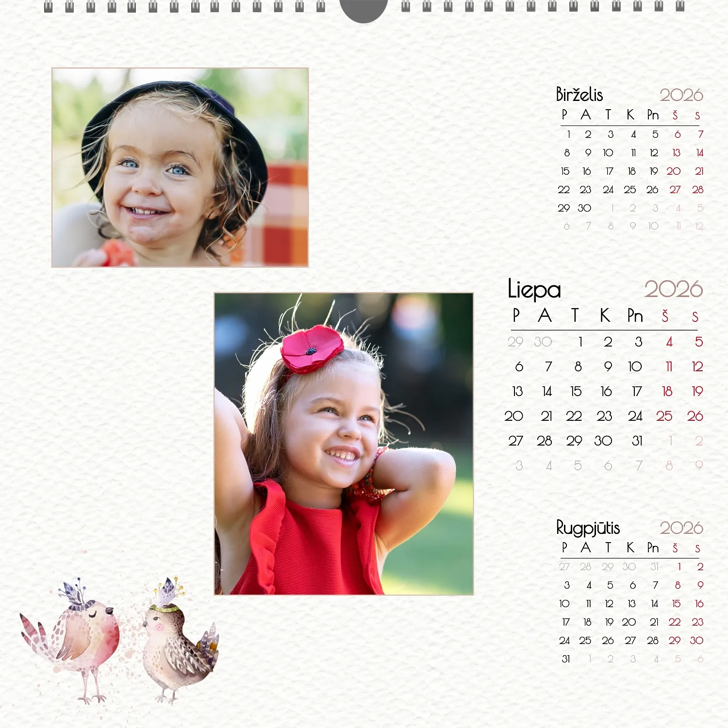 Paruoštas sienos kvadratinio kalendoriaus šablonas su vaikų nuotraukomis ir mielu dekoratyviniu dizainu sukurtas tiems, kurie vertina šiltas šeimos emocijas ir nori paversti įprastą kalendorių jaukiu asmeniniu priedu. Švelnūs pasteliniai atspalviai, tvarkingos iliustracijos, Vaikiški dekoro elementai ir fotografijos akcentas daro tokį kalendorių ypač patraukliu tėvams, pedagogams, kūrybinių studijų pedagogams, vaikų fotografams ir visiems, dirbantiems su vaikais ar kuriantiems jiems turinį. . Mūsų internetiniame dizaineryje šį šabloną lengva paversti savo užduotimis. Galite pakeisti nuotraukas, keisti elementų išdėstymą, redaguoti užrašus, pasirinkti kitus šriftus ir atspalvius, pridėti dekoratyvinių įdėklų arba atvirkščiai — pašalinti nereikalingus, kad būtų sukurta minimalistinė kompozicija. Kiekvieną mėnesį galite organizuoti įvairiais būdais, pridedant svarbias datas, atskiras pastabas ar mažus paveikslėlius, kurie pabrėžia vaiko charakterį ar fotografijos temą. Dėl intuityvaus valdymo ir nustatymų lankstumo jūs visiškai kontroliuojate būsimo kalendoriaus išvaizdą. Net ir be dizaino įgūdžių galite sukurti profesionaliai atrodantį išdėstymą, kuris džiugins visus metus. Šablonas yra tik pagrindas-dizaineryje jis virsta unikaliu, šiltu ir tikrai asmeniniu sienų kalendoriumi, pagamintu savo rankomis.