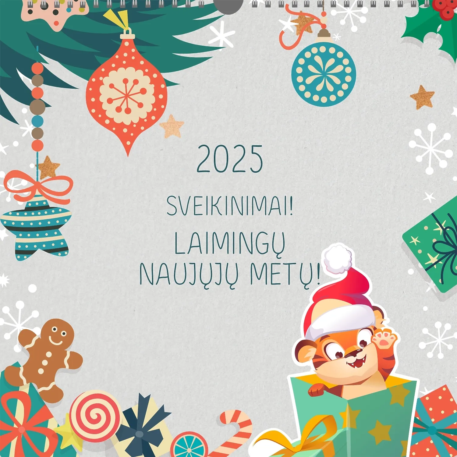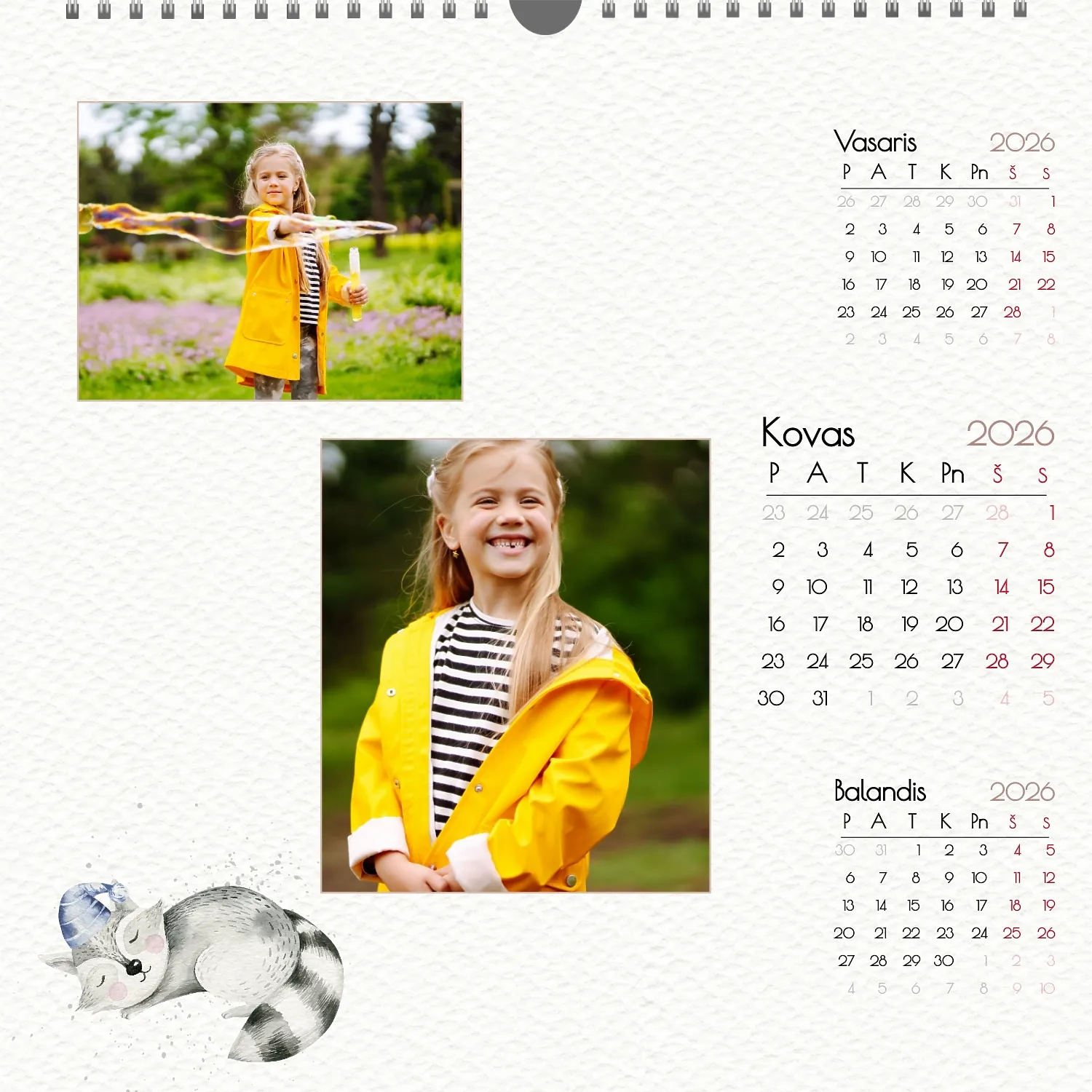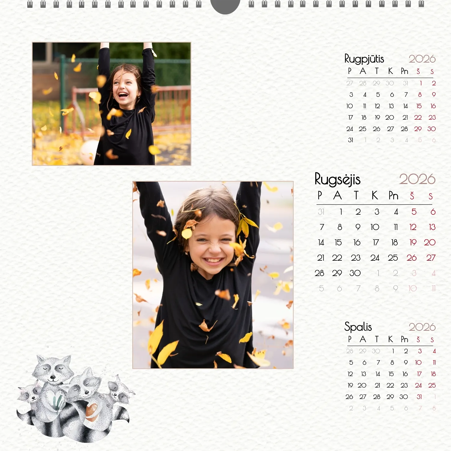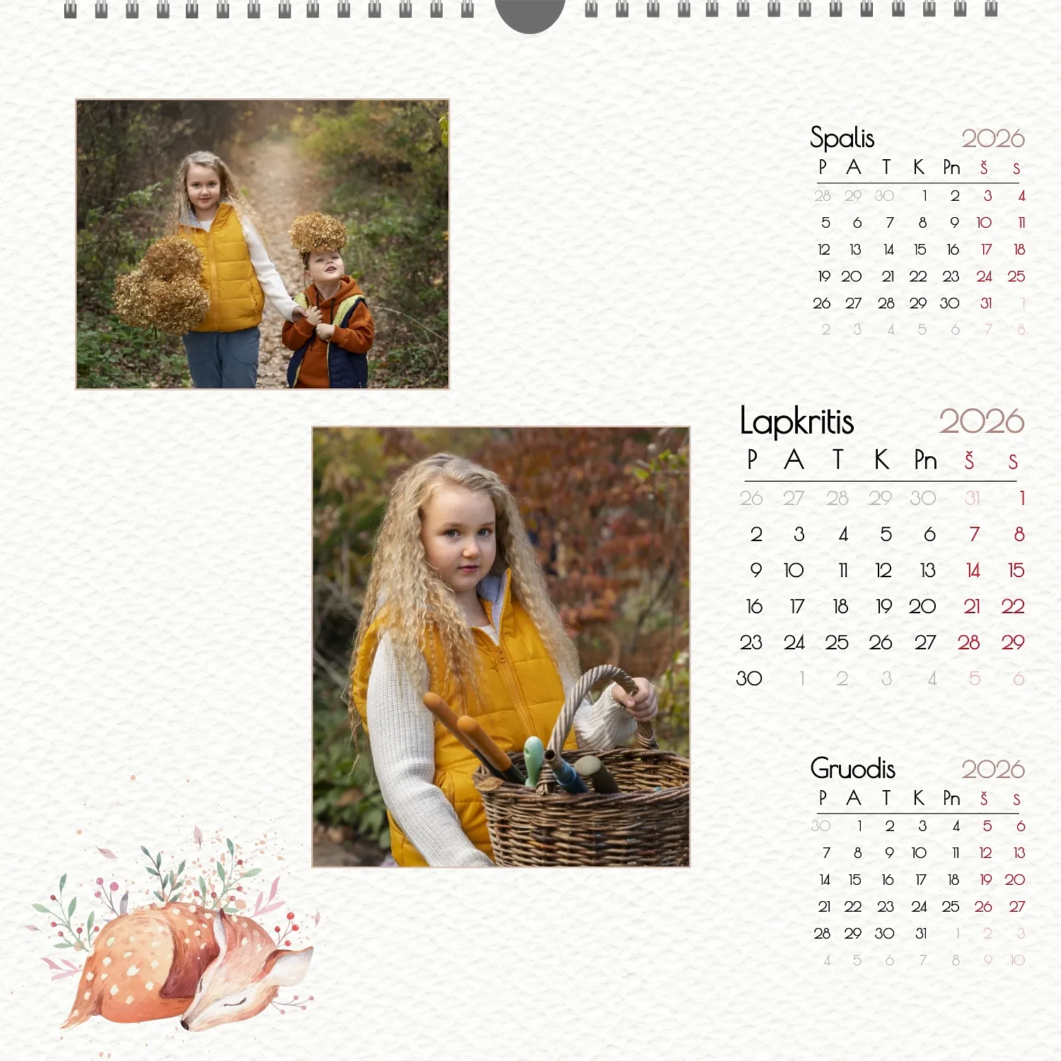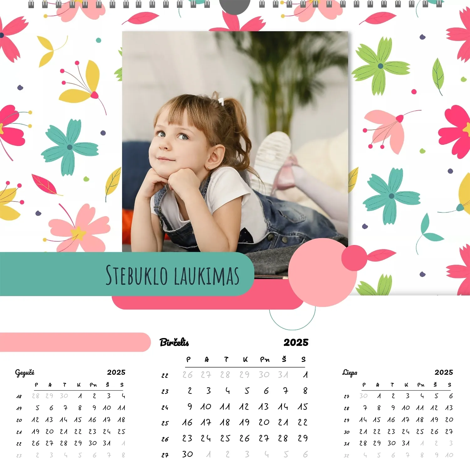 Paruoštas sienos kvadratinio kalendoriaus šablonas su vaikų nuotraukomis ir mielu dekoratyviniu dizainu sukurtas tiems, kurie vertina šiltas šeimos emocijas ir nori paversti įprastą kalendorių jaukiu asmeniniu priedu. Švelnūs pasteliniai atspalviai, tvarkingos iliustracijos, Vaikiški dekoro elementai ir fotografijos akcentas daro tokį kalendorių ypač patraukliu tėvams, pedagogams, kūrybinių studijų pedagogams, vaikų fotografams ir visiems, dirbantiems su vaikais ar kuriantiems jiems turinį. . Mūsų internetiniame dizaineryje šį šabloną lengva paversti savo užduotimis. Galite pakeisti nuotraukas, keisti elementų išdėstymą, redaguoti užrašus, pasirinkti kitus šriftus ir atspalvius, pridėti dekoratyvinių įdėklų arba atvirkščiai — pašalinti nereikalingus, kad būtų sukurta minimalistinė kompozicija. Kiekvieną mėnesį galite organizuoti įvairiais būdais, pridedant svarbias datas, atskiras pastabas ar mažus paveikslėlius, kurie pabrėžia vaiko charakterį ar fotografijos temą. Dėl intuityvaus valdymo ir nustatymų lankstumo jūs visiškai kontroliuojate būsimo kalendoriaus išvaizdą. Net ir be dizaino įgūdžių galite sukurti profesionaliai atrodantį išdėstymą, kuris džiugins visus metus. Šablonas yra tik pagrindas-dizaineryje jis virsta unikaliu, šiltu ir tikrai asmeniniu sienų kalendoriumi, pagamintu savo rankomis.