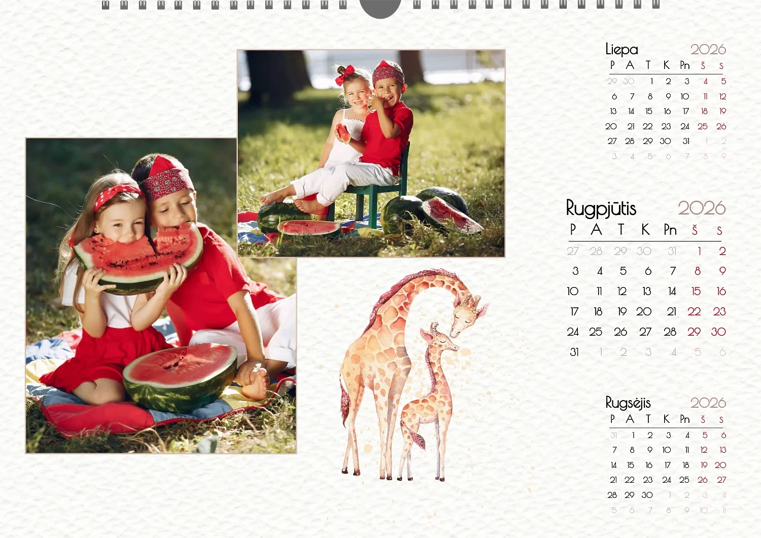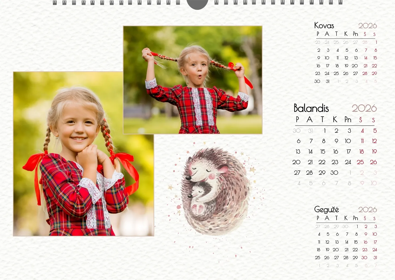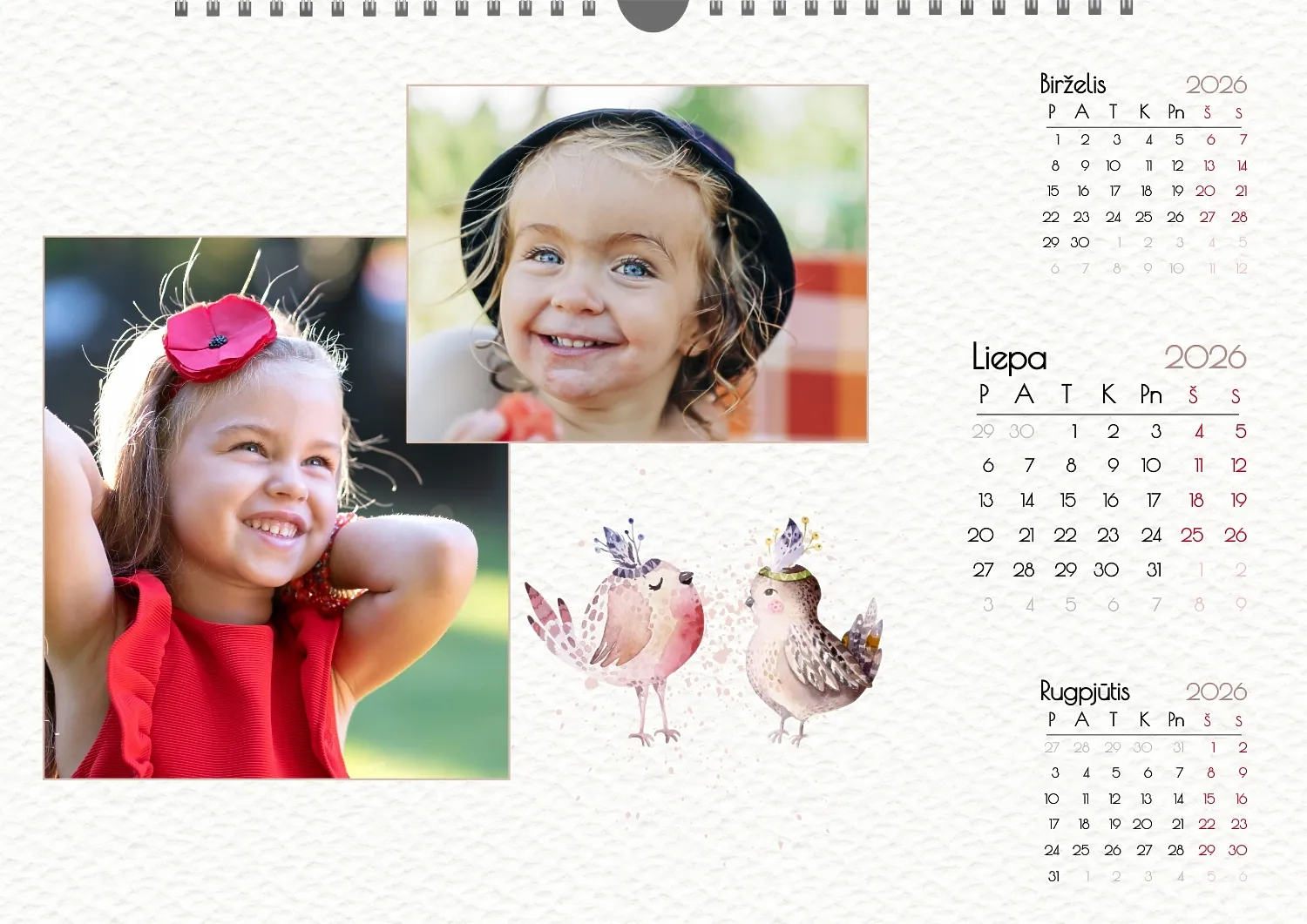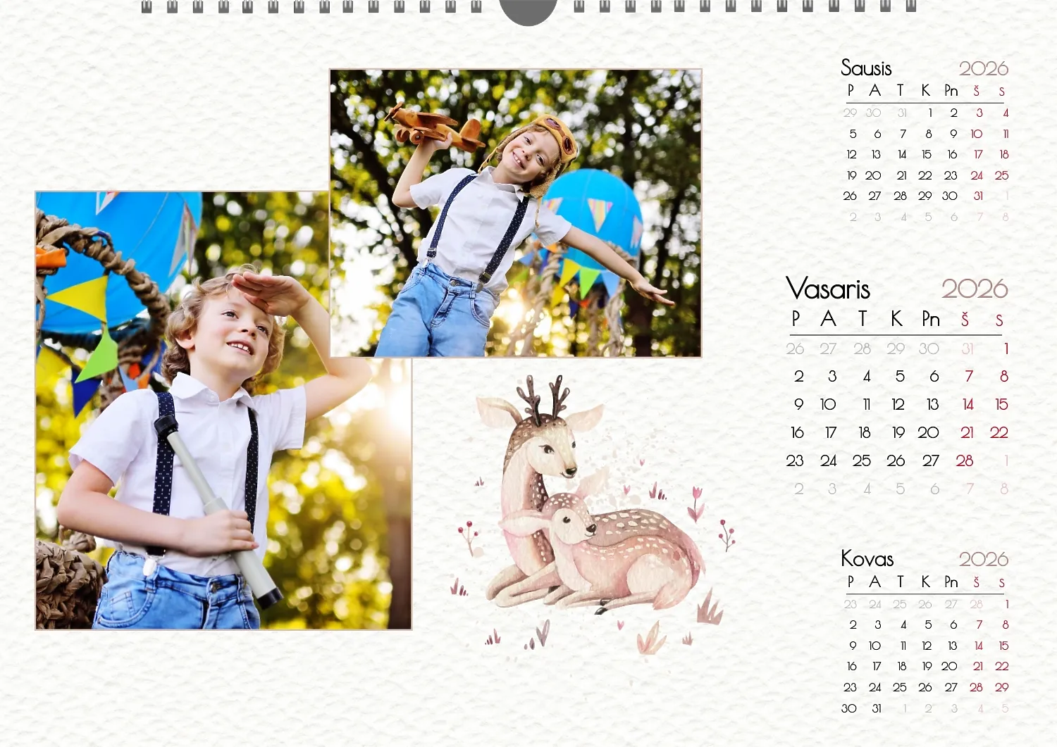 Paruoštas sieninio horizontalaus peroksidinio kalendoriaus su vaikų nuotraukomis ir mielu dekoratyviniu dizainu šablonas sukurtas tiems, kurie vertina šiltas šeimos emocijas ir nori paversti įprastą kalendorių jaukiu asmeniniu priedu. Švelnūs pasteliniai atspalviai, tvarkingos iliustracijos, Vaikiški dekoro elementai ir fotografijos akcentas daro tokį kalendorių ypač patraukliu tėvams, pedagogams, kūrybinių studijų pedagogams, vaikų fotografams ir visiems, dirbantiems su vaikais ar kuriantiems jiems turinį. Tai tinka šeimos archyvams, darželiams, plėtros centrams ir mažoms studijoms, norinčioms pasiūlyti klientams malonų ir emocinį produktą. Mūsų internetiniame dizaineryje šį šabloną lengva paversti savo užduotimis. Galite pakeisti nuotraukas, keisti elementų išdėstymą, redaguoti užrašus, pasirinkti kitus šriftus ir atspalvius, pridėti dekoratyvinių įdėklų arba atvirkščiai — pašalinti nereikalingus, kad būtų sukurta minimalistinė kompozicija. Kiekvieną mėnesį galite organizuoti įvairiais būdais, pridedant svarbias datas, atskiras pastabas ar mažus paveikslėlius, kurie pabrėžia vaiko charakterį ar fotografijos temą.