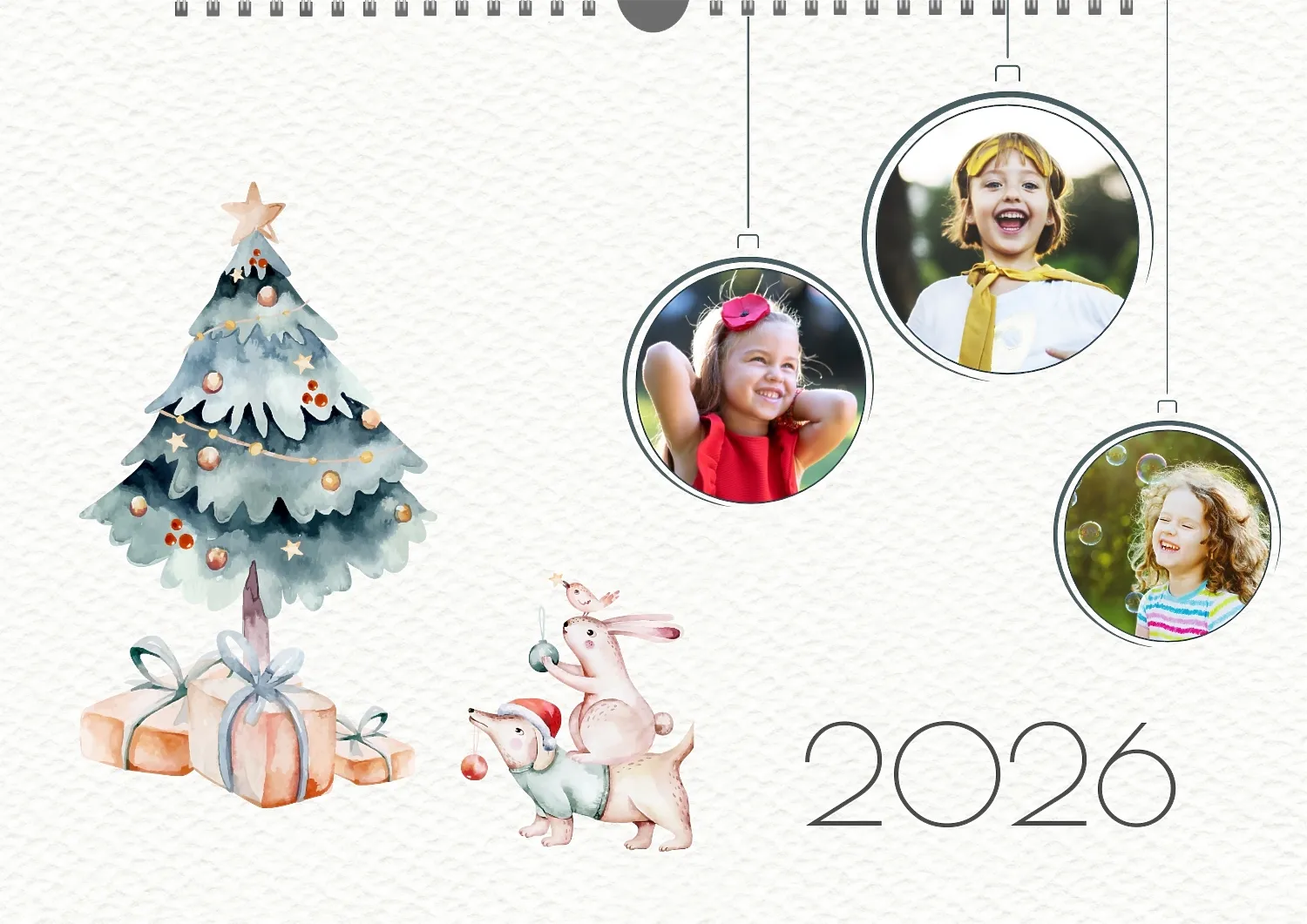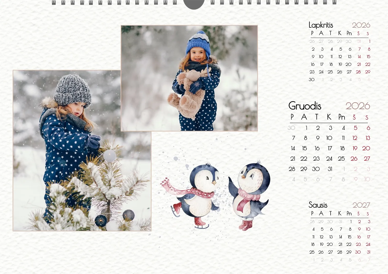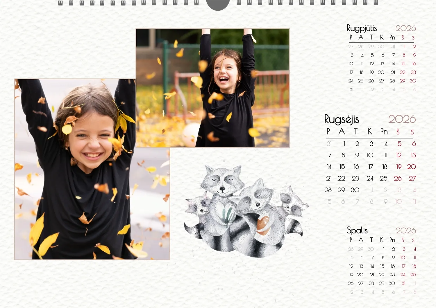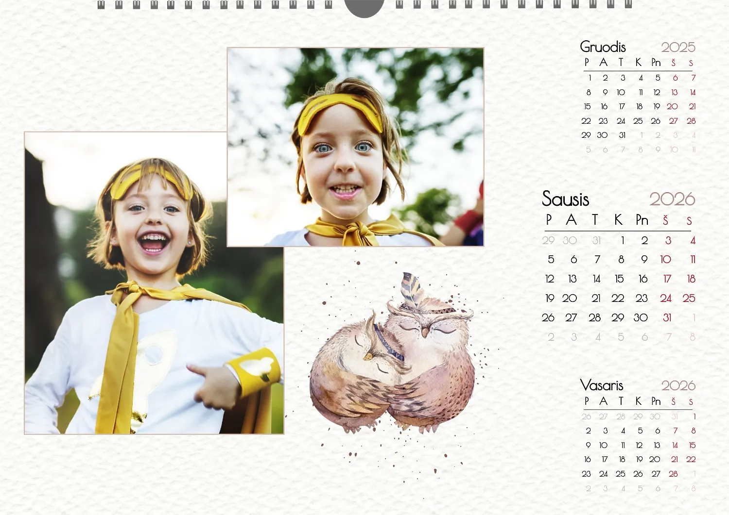 Paruoštas sieninio horizontalaus peroksidinio kalendoriaus su vaikų nuotraukomis ir mielu dekoratyviniu dizainu šablonas sukurtas tiems, kurie vertina šiltas šeimos emocijas ir nori paversti įprastą kalendorių jaukiu asmeniniu priedu. Švelnūs pasteliniai atspalviai, tvarkingos iliustracijos, Vaikiški dekoro elementai ir fotografijos akcentas daro tokį kalendorių ypač patraukliu tėvams, pedagogams, kūrybinių studijų pedagogams, vaikų fotografams ir visiems, dirbantiems su vaikais ar kuriantiems jiems turinį. Tai tinka šeimos archyvams, darželiams, plėtros centrams ir mažoms studijoms, norinčioms pasiūlyti klientams malonų ir emocinį produktą. Mūsų internetiniame dizaineryje šį šabloną lengva paversti savo užduotimis. Galite pakeisti nuotraukas, keisti elementų išdėstymą, redaguoti užrašus, pasirinkti kitus šriftus ir atspalvius, pridėti dekoratyvinių įdėklų arba atvirkščiai — pašalinti nereikalingus, kad būtų sukurta minimalistinė kompozicija. Kiekvieną mėnesį galite organizuoti įvairiais būdais, pridedant svarbias datas, atskiras pastabas ar mažus paveikslėlius, kurie pabrėžia vaiko charakterį ar fotografijos temą.