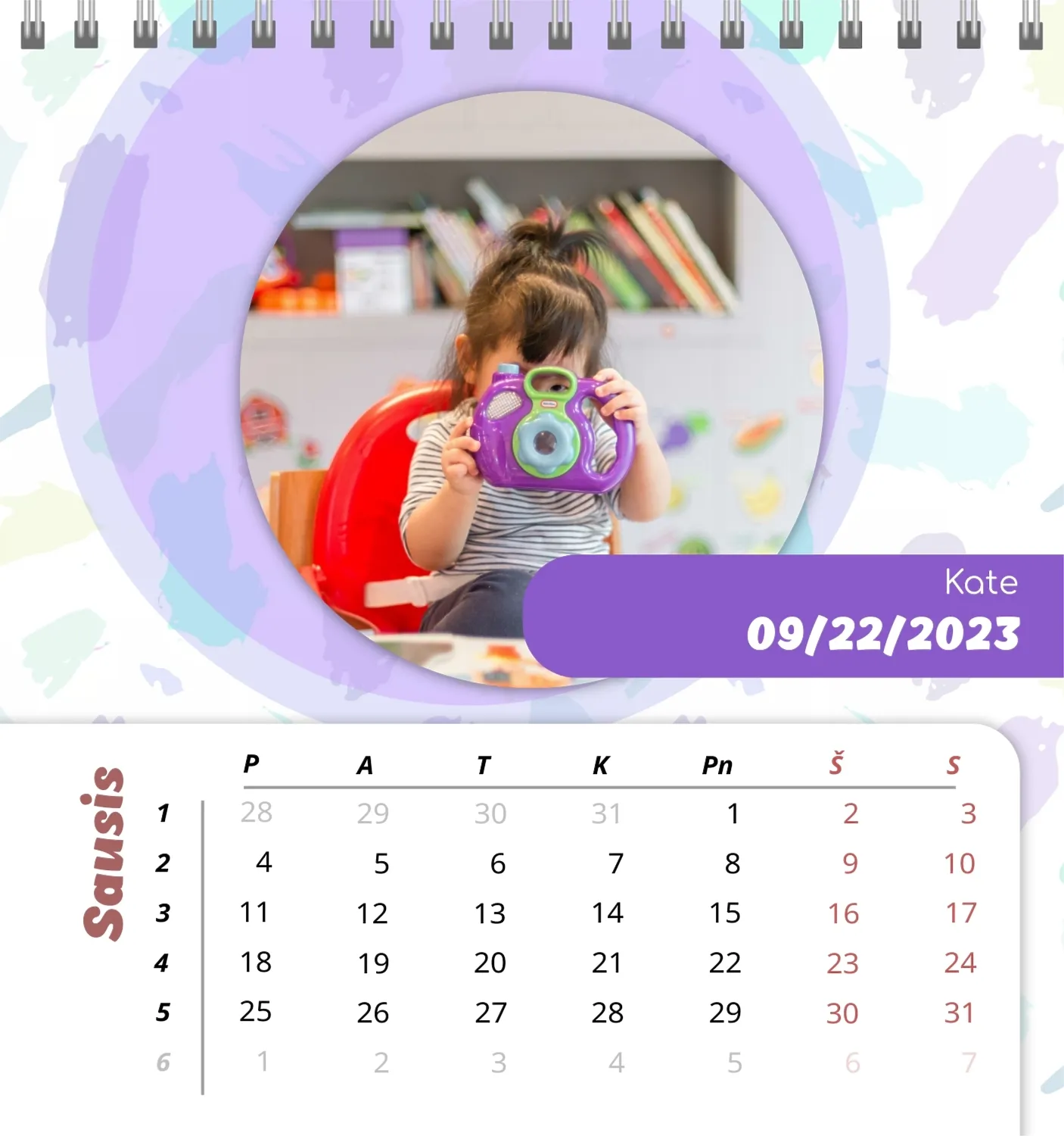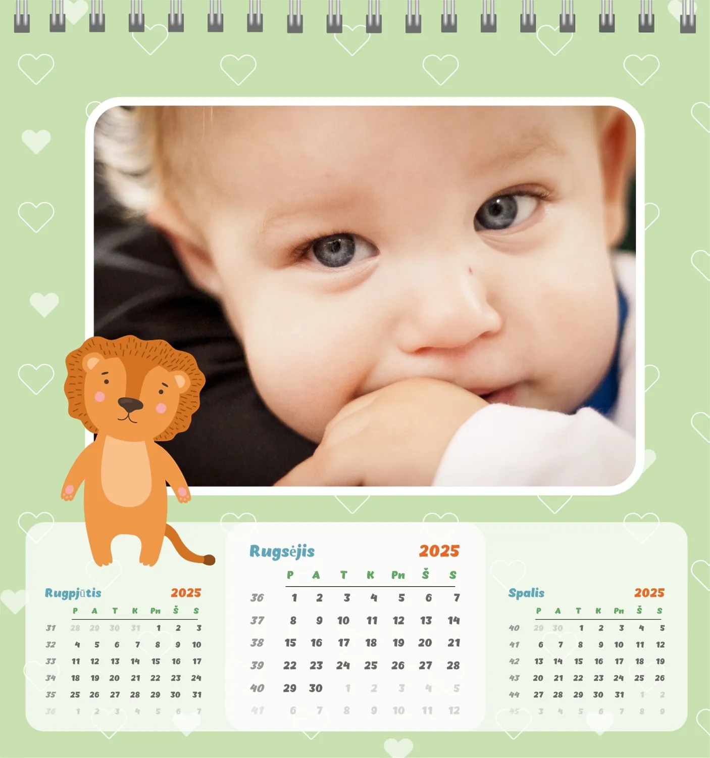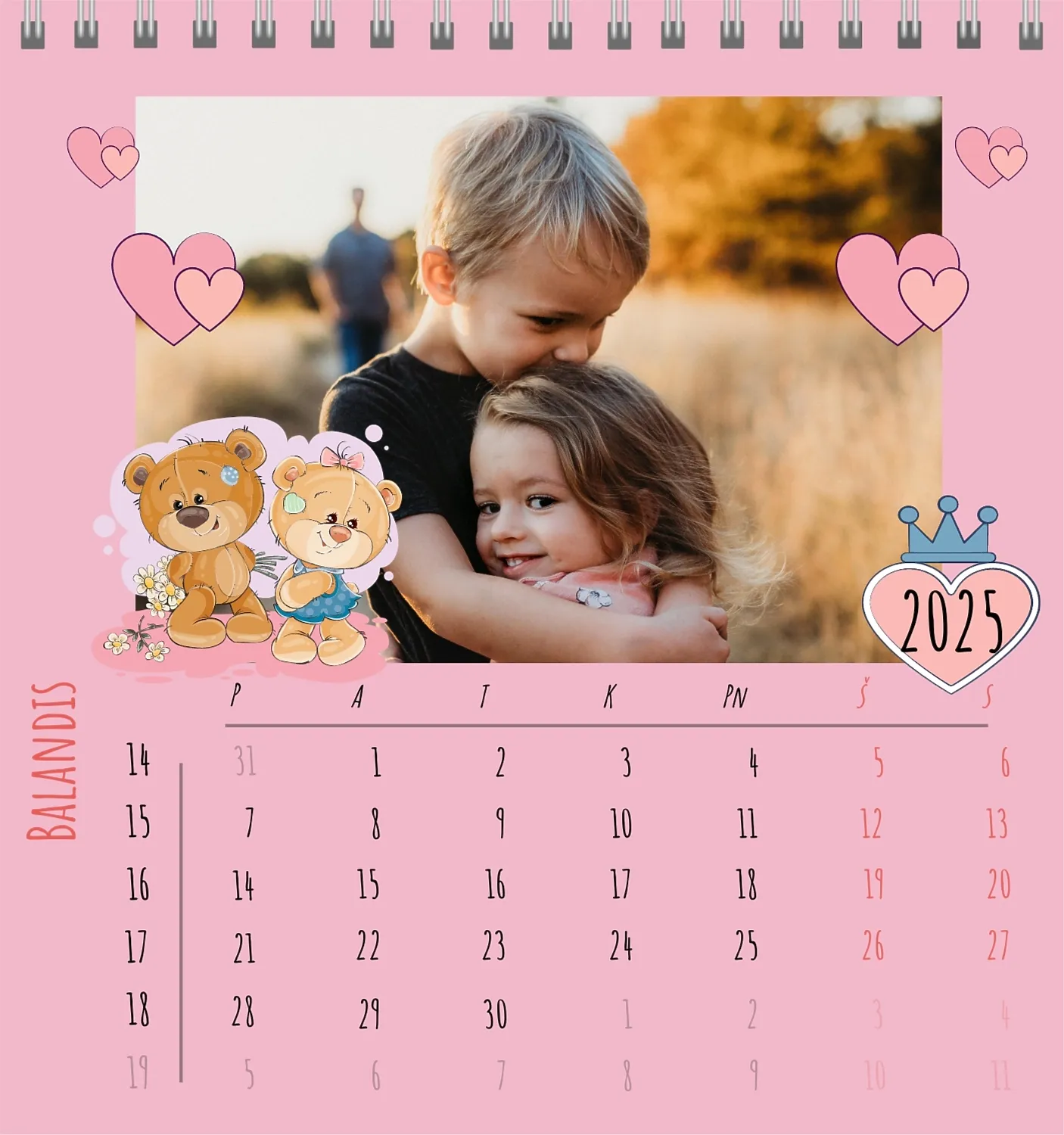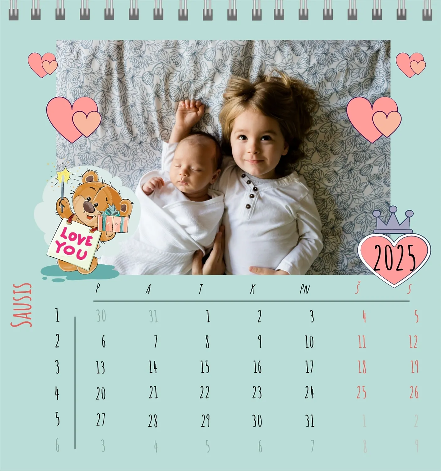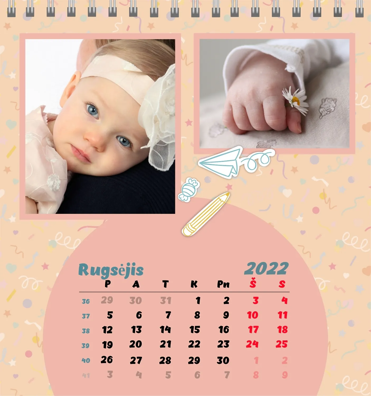 Paruoštas stalinio kompaktiško kalendoriaus su vaikų nuotraukomis ir mielu dekoratyviniu dizainu šablonas sukurtas tiems, kurie vertina šiltas šeimos emocijas ir nori paversti įprastą kalendorių jaukiu asmeniniu priedu. Švelnūs pasteliniai atspalviai, tvarkingos iliustracijos, Vaikiški dekoro elementai ir fotografijos akcentas daro tokį kalendorių ypač patraukliu tėvams, pedagogams, kūrybinių studijų pedagogams, vaikų fotografams ir visiems, dirbantiems su vaikais ar kuriantiems jiems turinį. Tai tinka šeimos archyvams, darželiams, plėtros centrams ir mažoms studijoms, norinčioms pasiūlyti klientams malonų ir emocinį produktą. Mūsų internetiniame dizaineryje šį šabloną lengva paversti savo užduotimis. Galite pakeisti nuotraukas, keisti elementų išdėstymą, redaguoti užrašus, pasirinkti kitus šriftus ir atspalvius, pridėti dekoratyvinių įdėklų arba atvirkščiai — pašalinti nereikalingus, kad būtų sukurta minimalistinė kompozicija. Kiekvieną mėnesį galite organizuoti įvairiais būdais, pridedant svarbias datas, atskiras pastabas ar mažus paveikslėlius, kurie pabrėžia vaiko charakterį ar fotografijos temą.