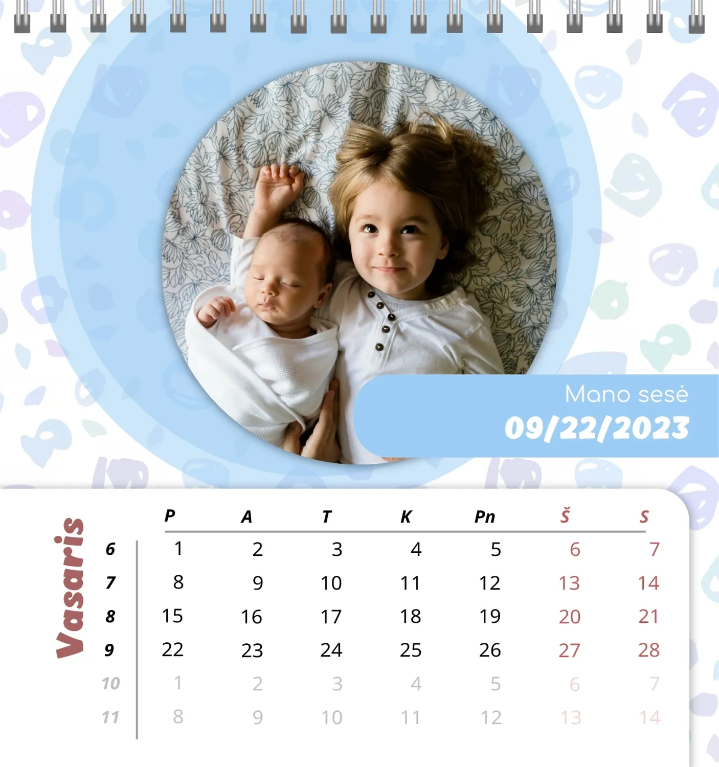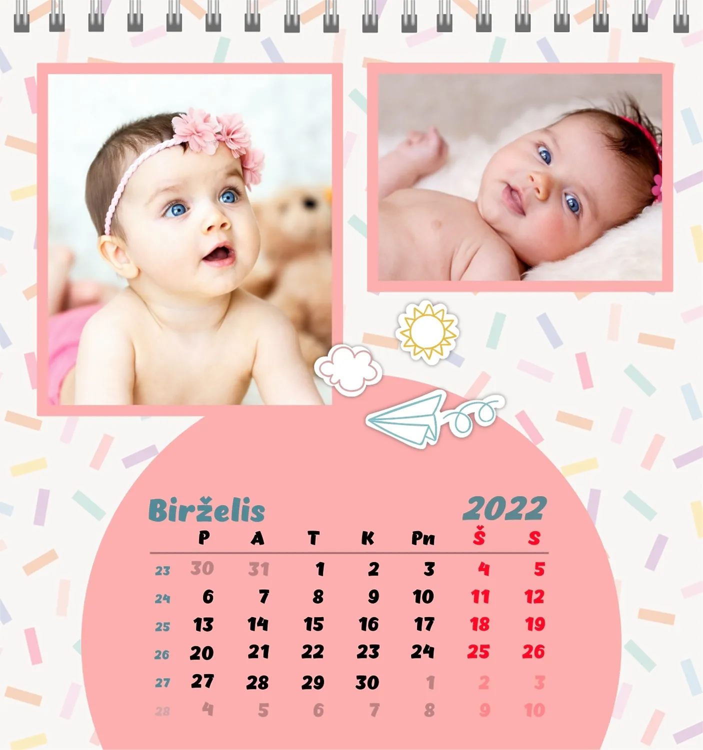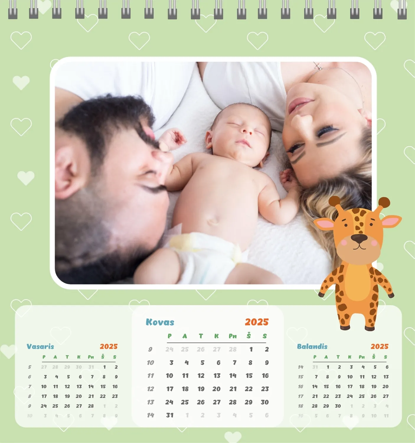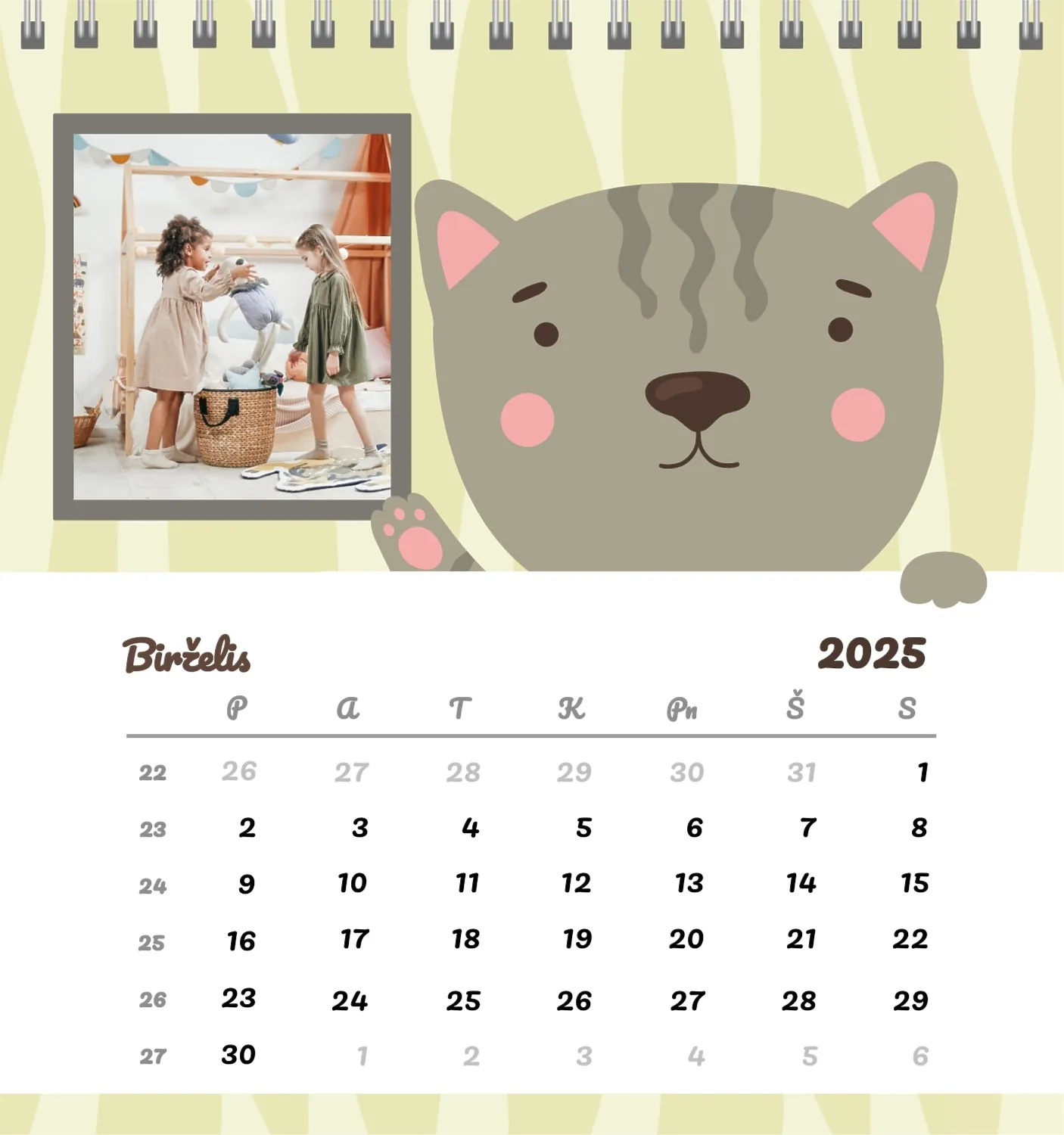 Paruoštas stalinio kompaktiško kalendoriaus su vaikų nuotraukomis ir mielu dekoratyviniu dizainu šablonas sukurtas tiems, kurie vertina šiltas šeimos emocijas ir nori paversti įprastą kalendorių jaukiu asmeniniu priedu. Švelnūs pasteliniai atspalviai, tvarkingos iliustracijos, Vaikiški dekoro elementai ir fotografijos akcentas daro tokį kalendorių ypač patraukliu tėvams, pedagogams, kūrybinių studijų pedagogams, vaikų fotografams ir visiems, dirbantiems su vaikais ar kuriantiems jiems turinį. Tai tinka šeimos archyvams, darželiams, plėtros centrams ir mažoms studijoms, norinčioms pasiūlyti klientams malonų ir emocinį produktą. Mūsų internetiniame dizaineryje šį šabloną lengva paversti savo užduotimis. Galite pakeisti nuotraukas, keisti elementų išdėstymą, redaguoti užrašus, pasirinkti kitus šriftus ir atspalvius, pridėti dekoratyvinių įdėklų arba atvirkščiai — pašalinti nereikalingus, kad būtų sukurta minimalistinė kompozicija. Kiekvieną mėnesį galite organizuoti įvairiais būdais, pridedant svarbias datas, atskiras pastabas ar mažus paveikslėlius, kurie pabrėžia vaiko charakterį ar fotografijos temą.