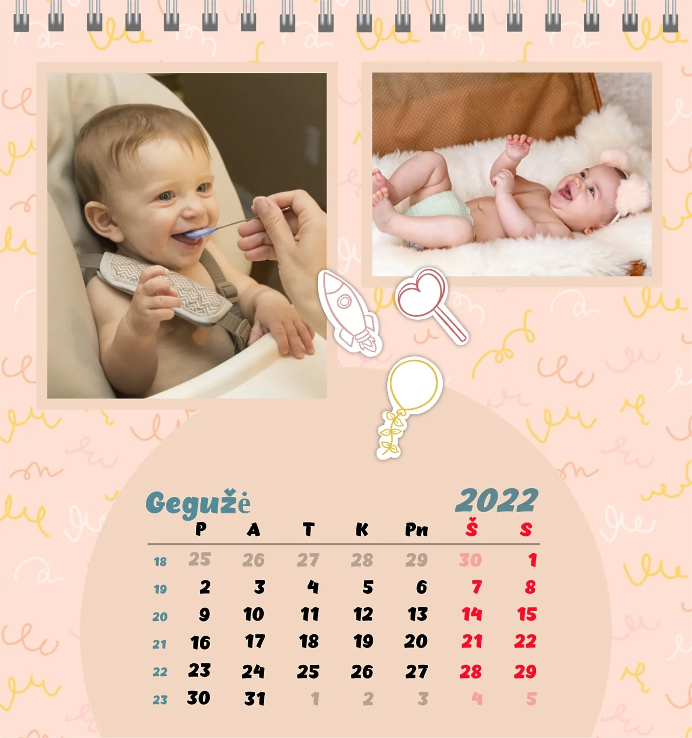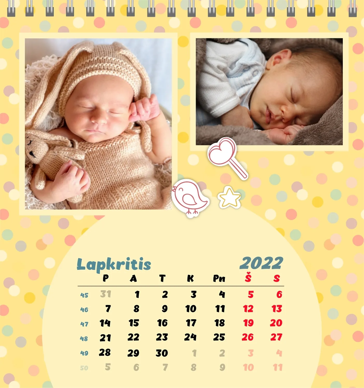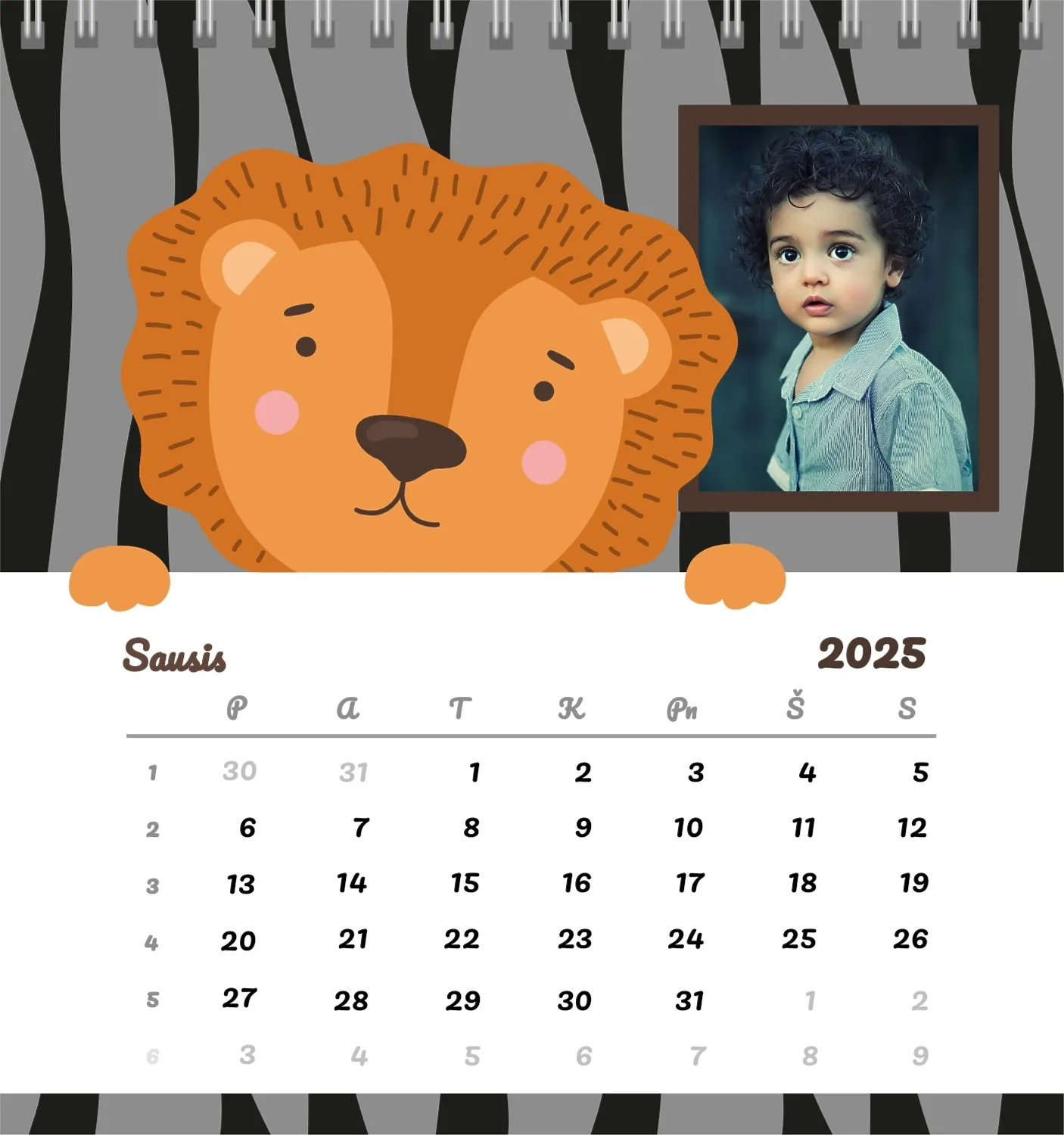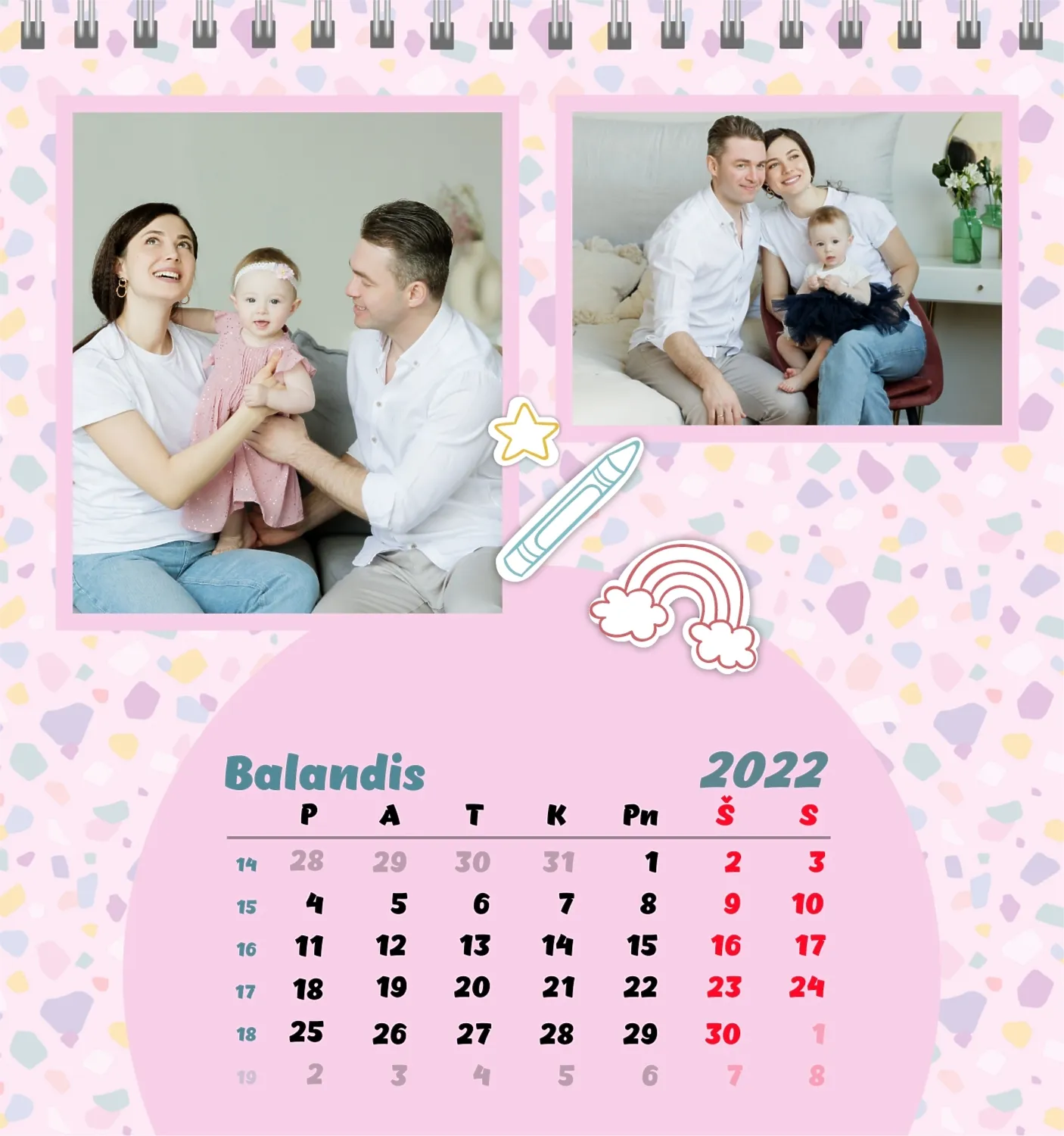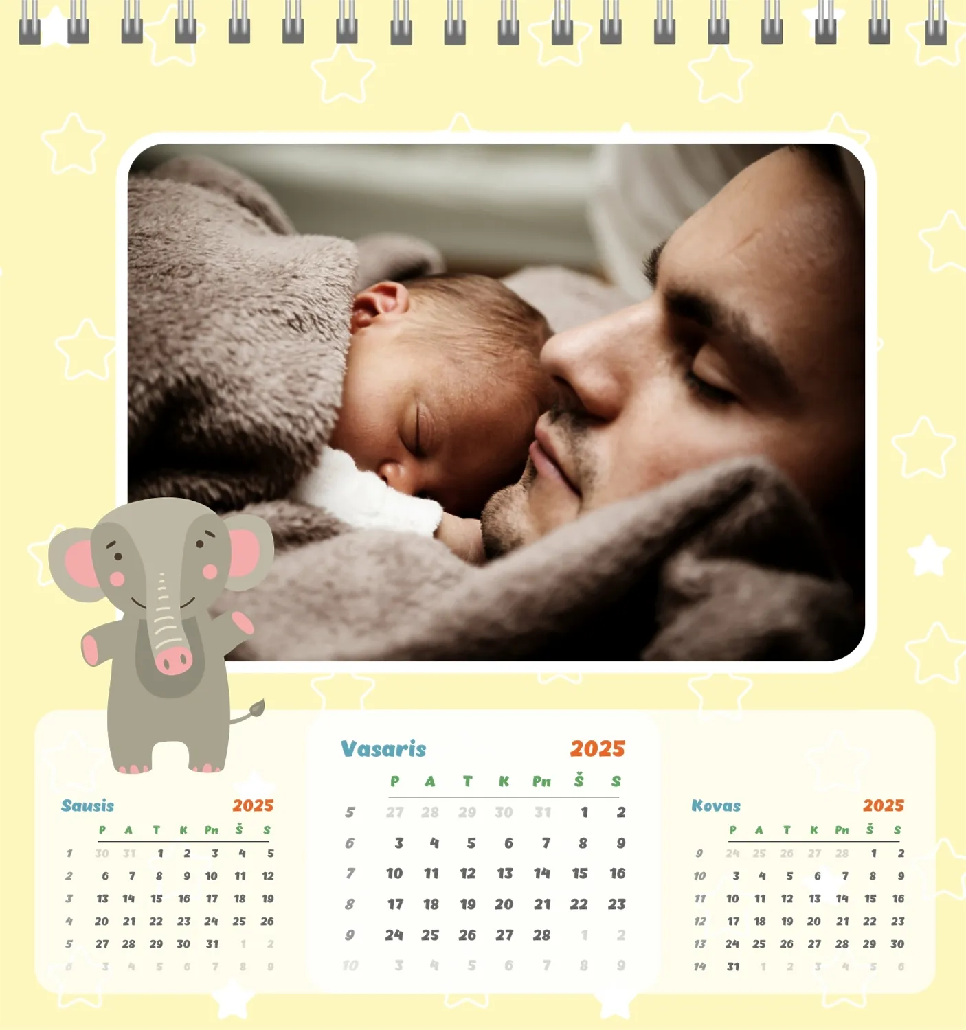 Paruoštas stalinio kompaktiško kalendoriaus su vaikų nuotraukomis ir mielu dekoratyviniu dizainu šablonas sukurtas tiems, kurie vertina šiltas šeimos emocijas ir nori paversti įprastą kalendorių jaukiu asmeniniu priedu. Švelnūs pasteliniai atspalviai, tvarkingos iliustracijos, Vaikiški dekoro elementai ir fotografijos akcentas daro tokį kalendorių ypač patraukliu tėvams, pedagogams, kūrybinių studijų pedagogams, vaikų fotografams ir visiems, dirbantiems su vaikais ar kuriantiems jiems turinį. Tai tinka šeimos archyvams, darželiams, plėtros centrams ir mažoms studijoms, norinčioms pasiūlyti klientams malonų ir emocinį produktą. Mūsų internetiniame dizaineryje šį šabloną lengva paversti savo užduotimis. Galite pakeisti nuotraukas, keisti elementų išdėstymą, redaguoti užrašus, pasirinkti kitus šriftus ir atspalvius, pridėti dekoratyvinių įdėklų arba atvirkščiai — pašalinti nereikalingus, kad būtų sukurta minimalistinė kompozicija. Kiekvieną mėnesį galite organizuoti įvairiais būdais, pridedant svarbias datas, atskiras pastabas ar mažus paveikslėlius, kurie pabrėžia vaiko charakterį ar fotografijos temą.