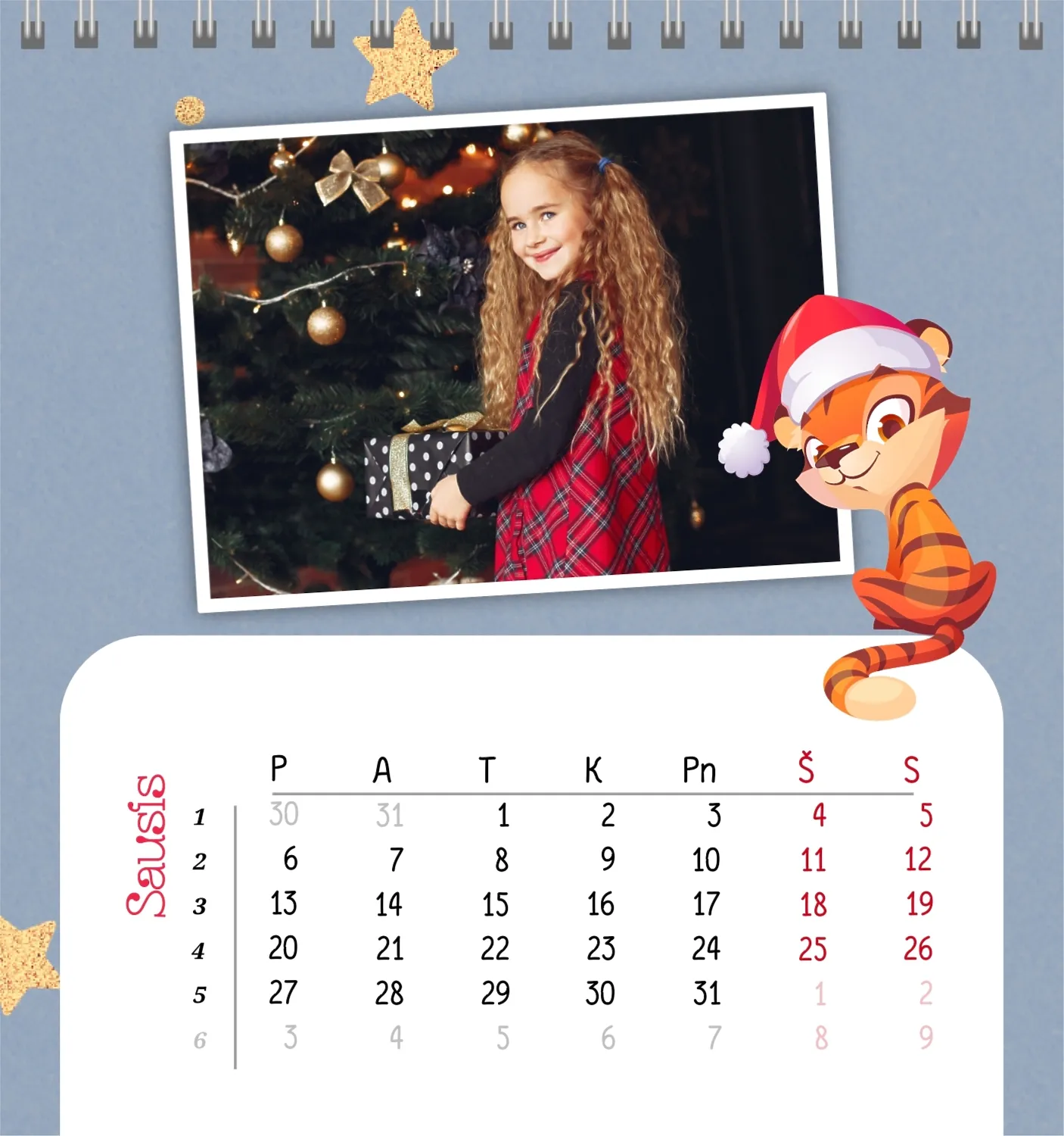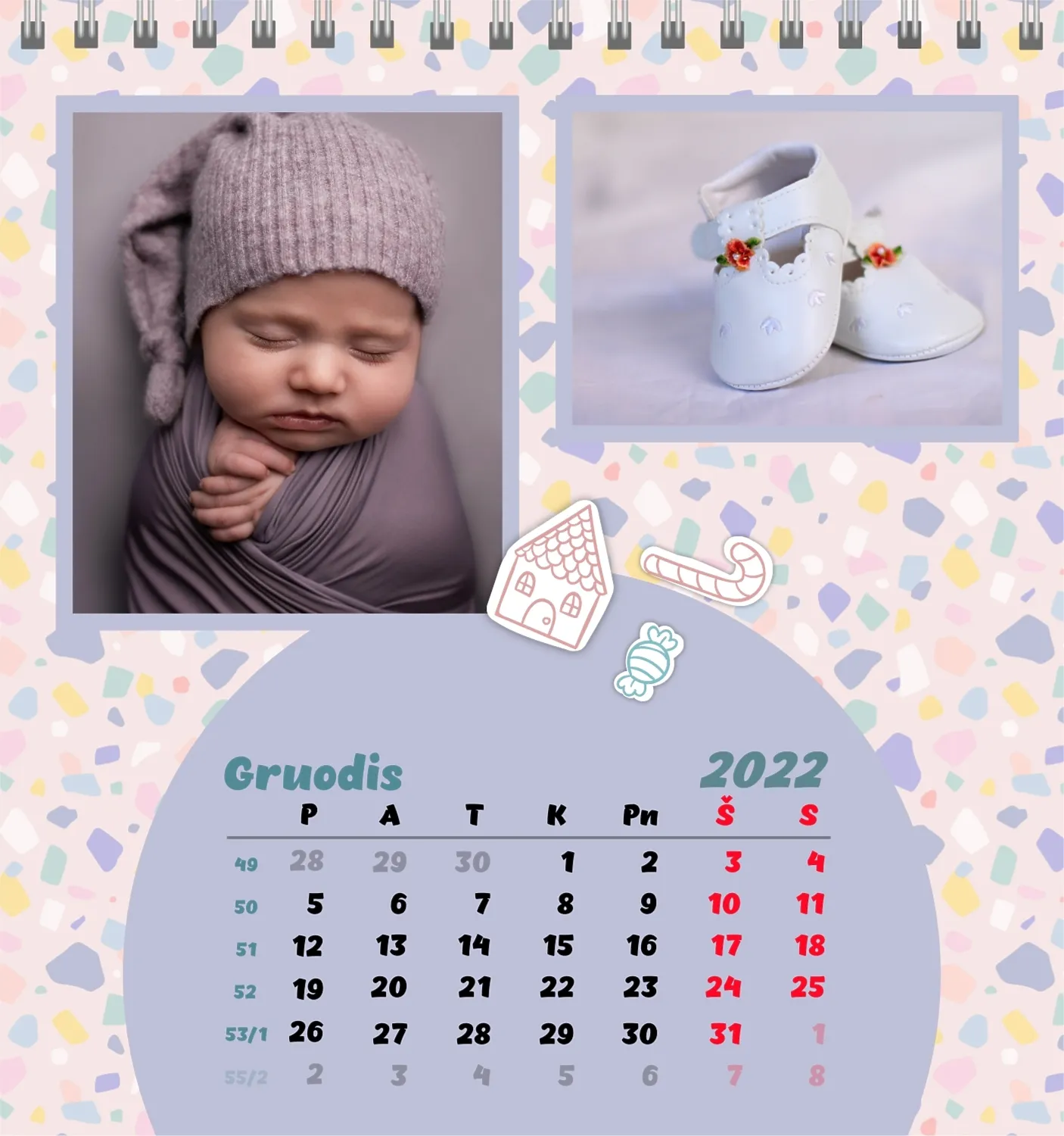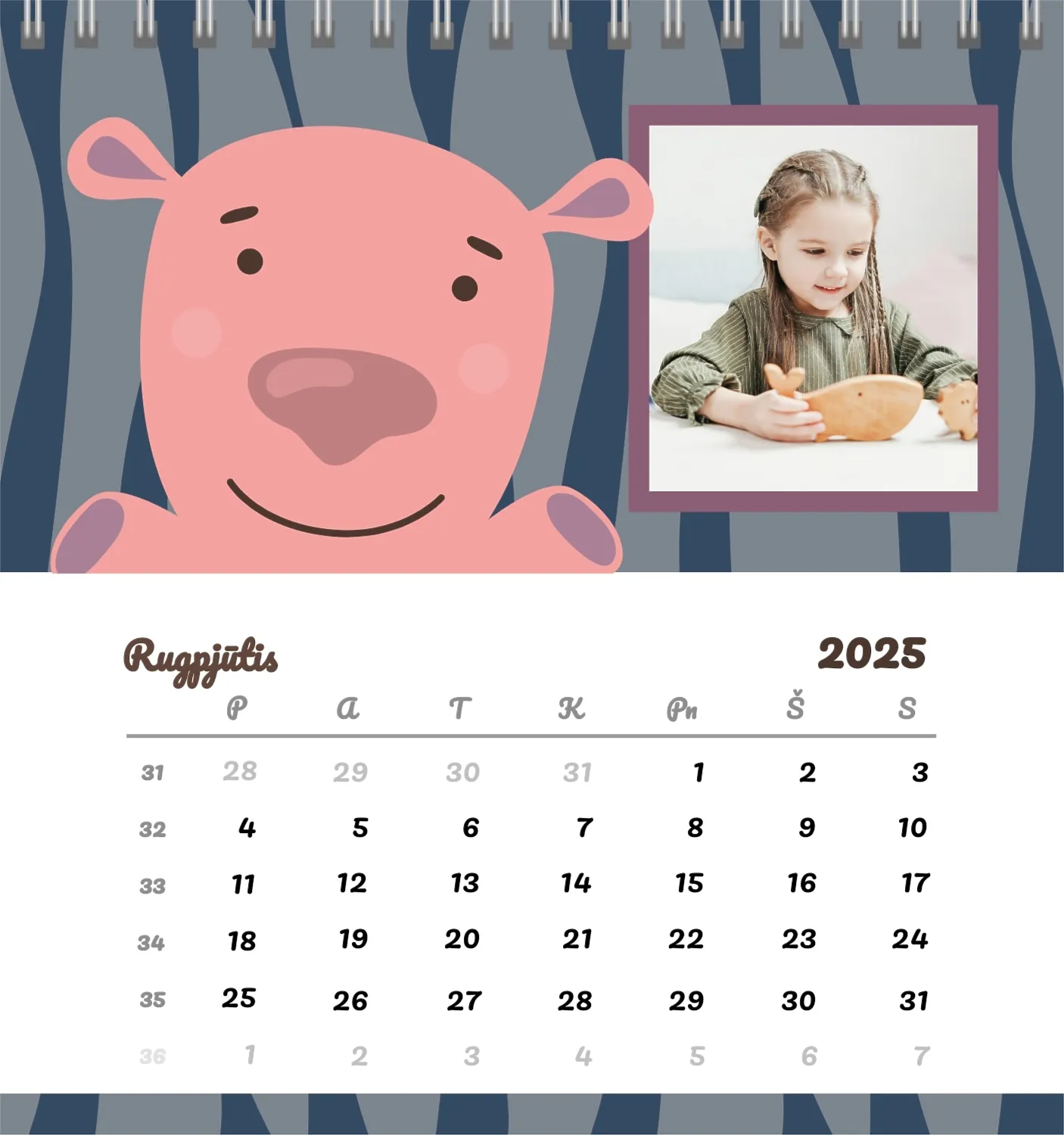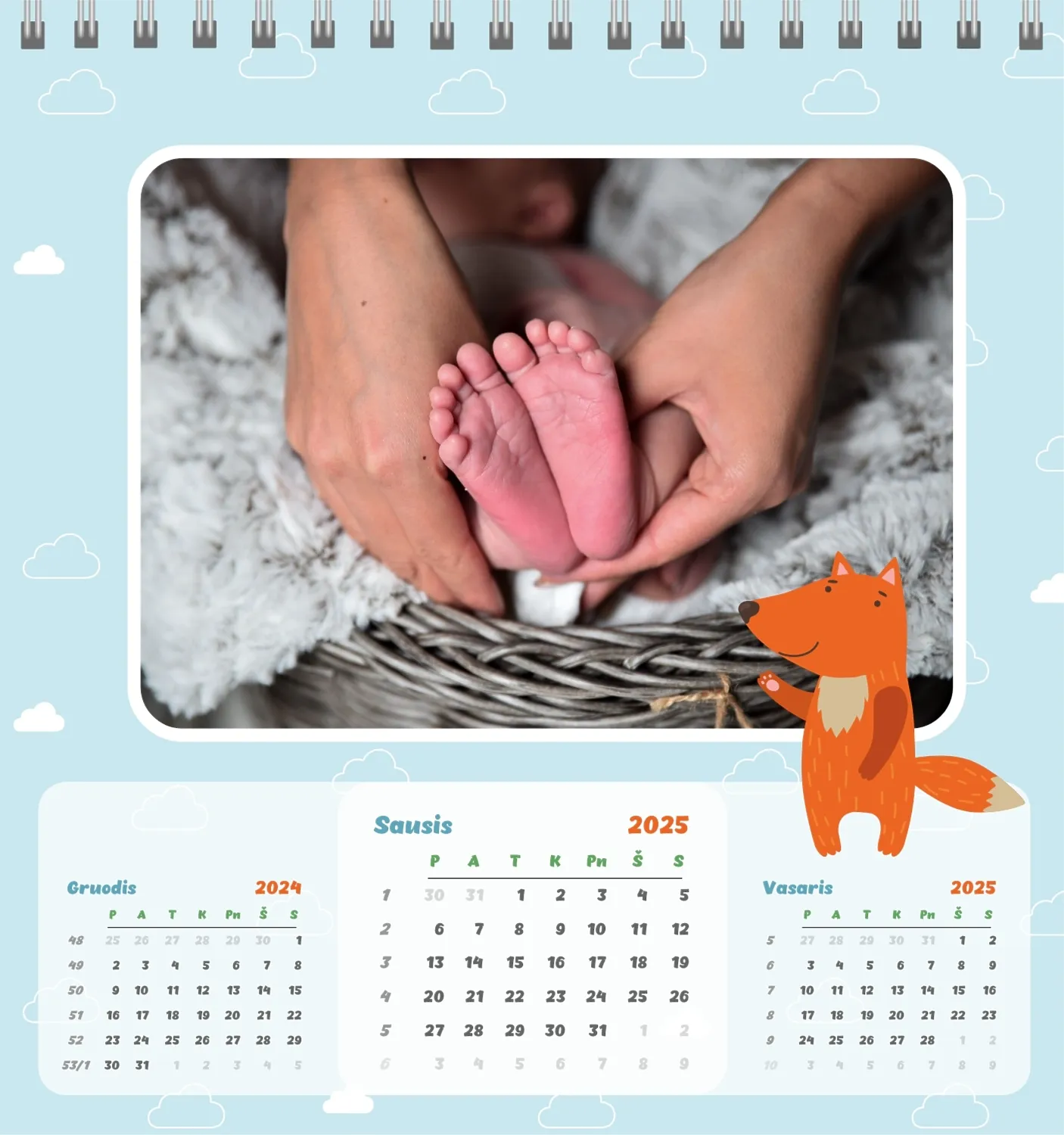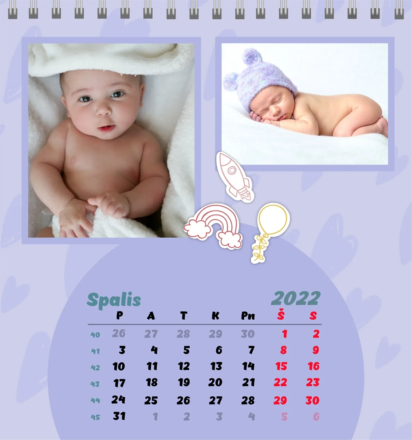 Paruoštas stalinio kompaktiško kalendoriaus su vaikų nuotraukomis ir mielu dekoratyviniu dizainu šablonas sukurtas tiems, kurie vertina šiltas šeimos emocijas ir nori paversti įprastą kalendorių jaukiu asmeniniu priedu. Švelnūs pasteliniai atspalviai, tvarkingos iliustracijos, Vaikiški dekoro elementai ir fotografijos akcentas daro tokį kalendorių ypač patraukliu tėvams, pedagogams, kūrybinių studijų pedagogams, vaikų fotografams ir visiems, dirbantiems su vaikais ar kuriantiems jiems turinį. Tai tinka šeimos archyvams, darželiams, plėtros centrams ir mažoms studijoms, norinčioms pasiūlyti klientams malonų ir emocinį produktą. Mūsų internetiniame dizaineryje šį šabloną lengva paversti savo užduotimis. Galite pakeisti nuotraukas, keisti elementų išdėstymą, redaguoti užrašus, pasirinkti kitus šriftus ir atspalvius, pridėti dekoratyvinių įdėklų arba atvirkščiai — pašalinti nereikalingus, kad būtų sukurta minimalistinė kompozicija. Kiekvieną mėnesį galite organizuoti įvairiais būdais, pridedant svarbias datas, atskiras pastabas ar mažus paveikslėlius, kurie pabrėžia vaiko charakterį ar fotografijos temą.