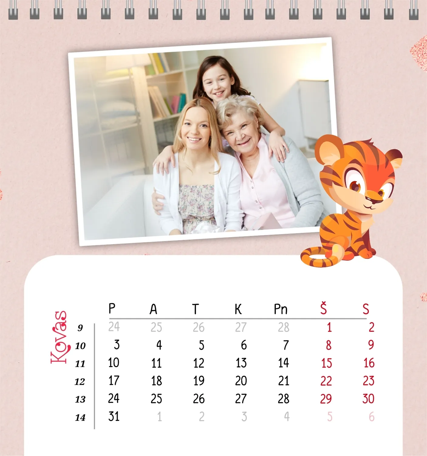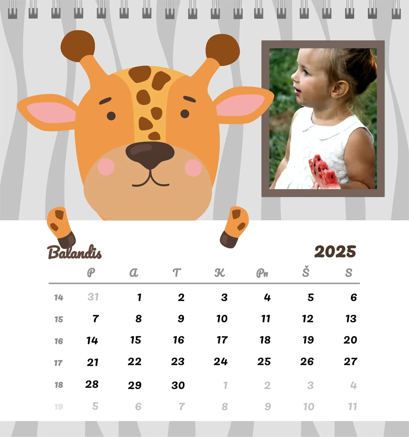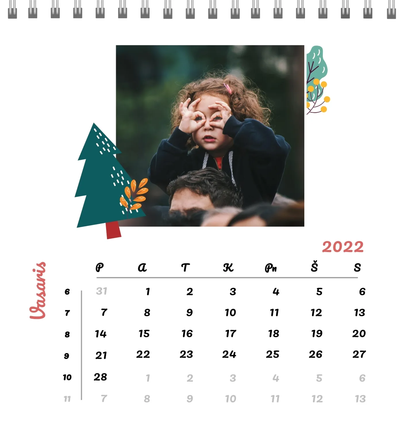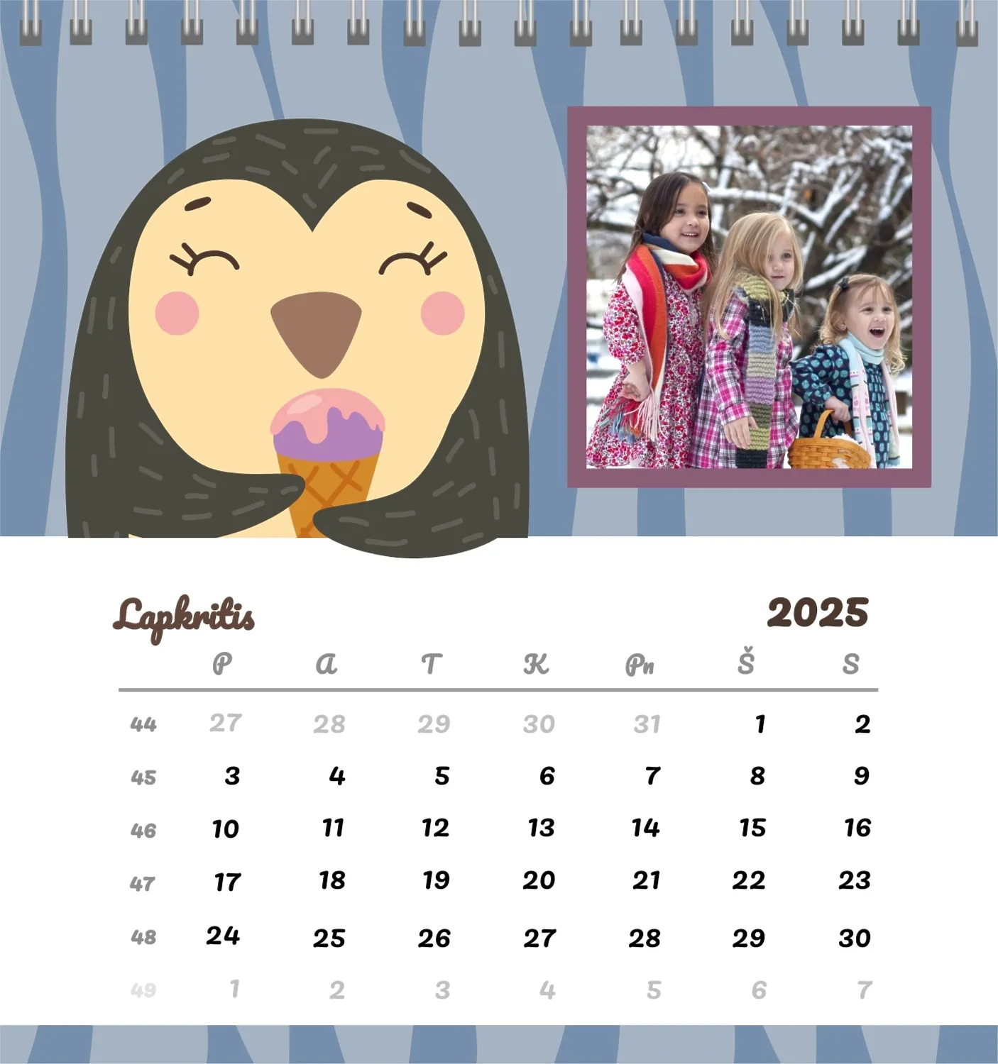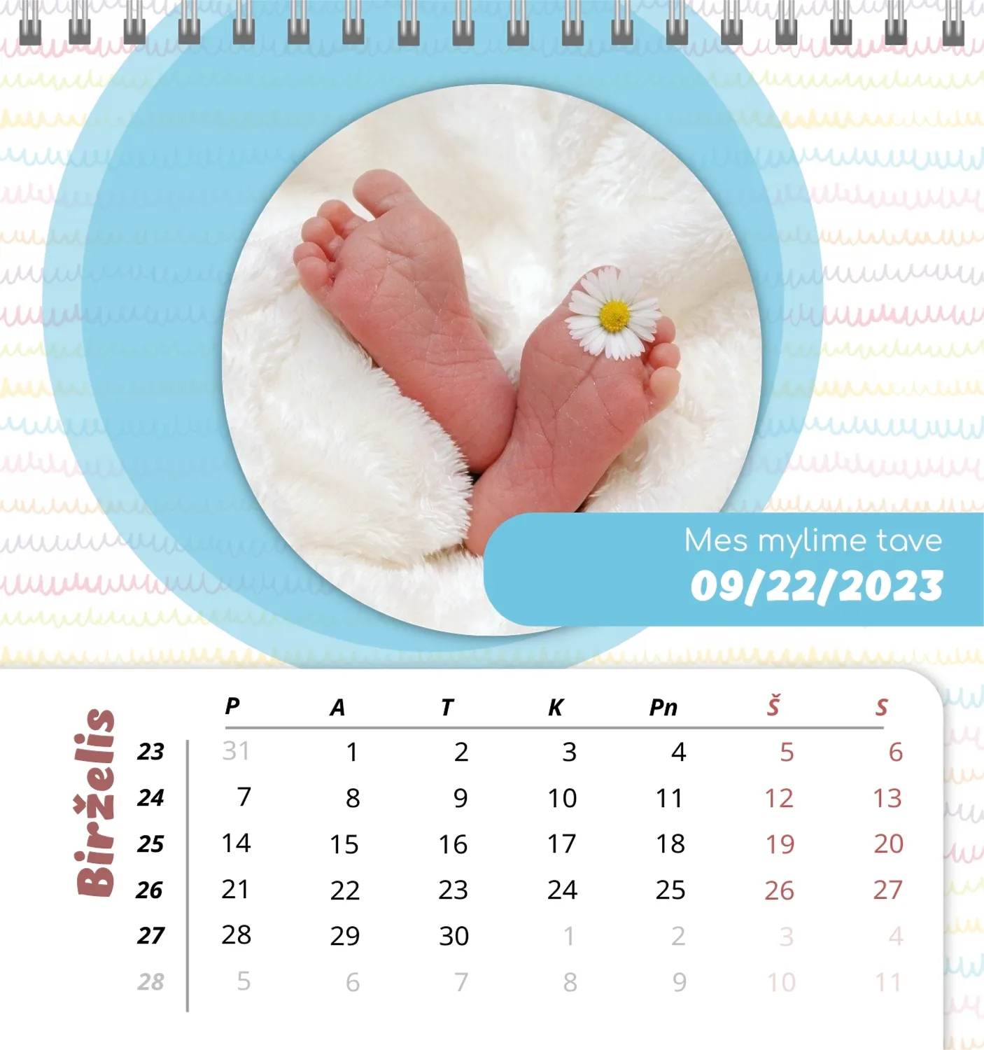 Paruoštas stalinio kompaktiško kalendoriaus su vaikų nuotraukomis ir mielu dekoratyviniu dizainu šablonas sukurtas tiems, kurie vertina šiltas šeimos emocijas ir nori paversti įprastą kalendorių jaukiu asmeniniu priedu. Švelnūs pasteliniai atspalviai, tvarkingos iliustracijos, Vaikiški dekoro elementai ir fotografijos akcentas daro tokį kalendorių ypač patraukliu tėvams, pedagogams, kūrybinių studijų pedagogams, vaikų fotografams ir visiems, dirbantiems su vaikais ar kuriantiems jiems turinį. Tai tinka šeimos archyvams, darželiams, plėtros centrams ir mažoms studijoms, norinčioms pasiūlyti klientams malonų ir emocinį produktą. Mūsų internetiniame dizaineryje šį šabloną lengva paversti savo užduotimis. Galite pakeisti nuotraukas, keisti elementų išdėstymą, redaguoti užrašus, pasirinkti kitus šriftus ir atspalvius, pridėti dekoratyvinių įdėklų arba atvirkščiai — pašalinti nereikalingus, kad būtų sukurta minimalistinė kompozicija. Kiekvieną mėnesį galite organizuoti įvairiais būdais, pridedant svarbias datas, atskiras pastabas ar mažus paveikslėlius, kurie pabrėžia vaiko charakterį ar fotografijos temą.