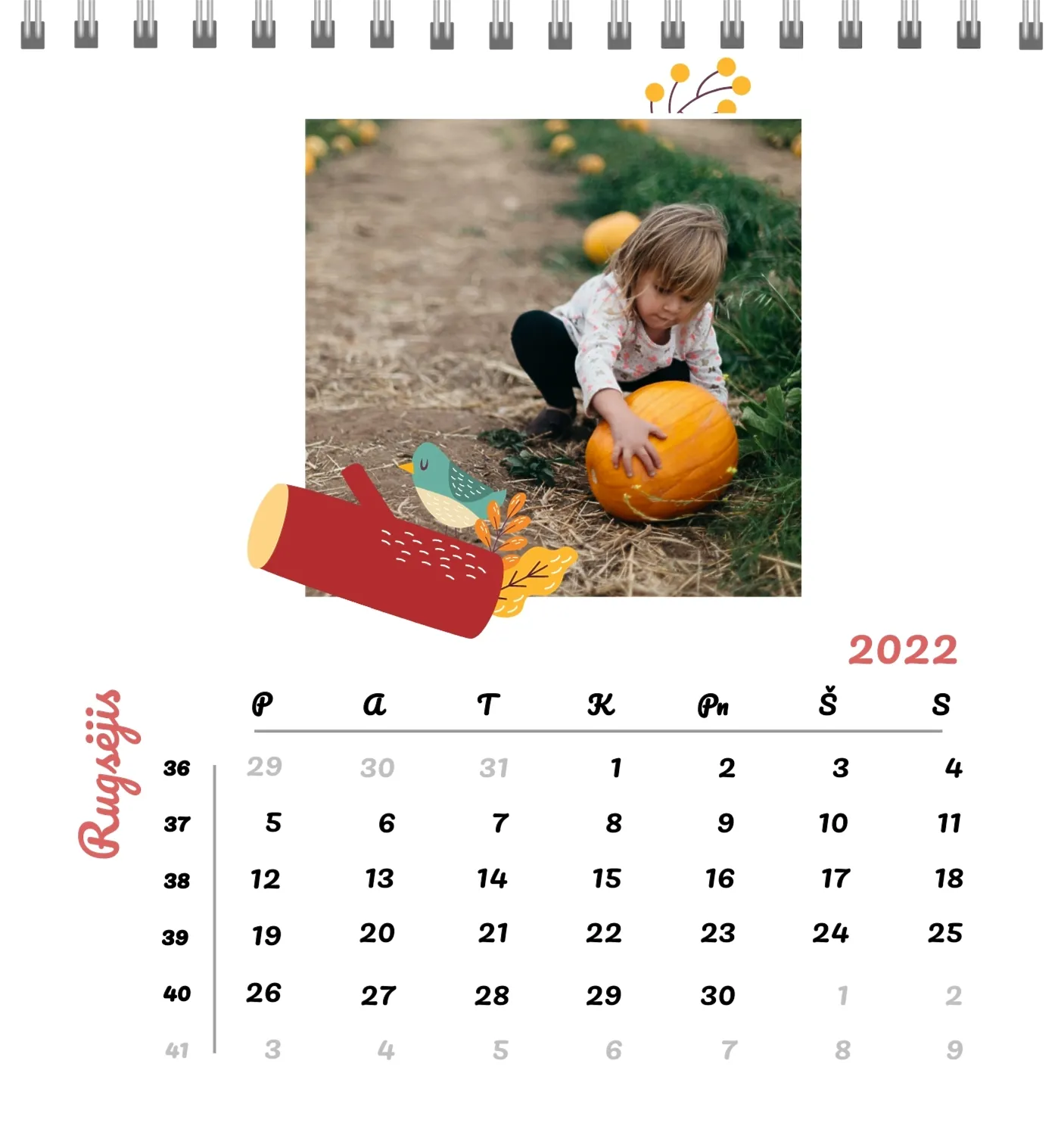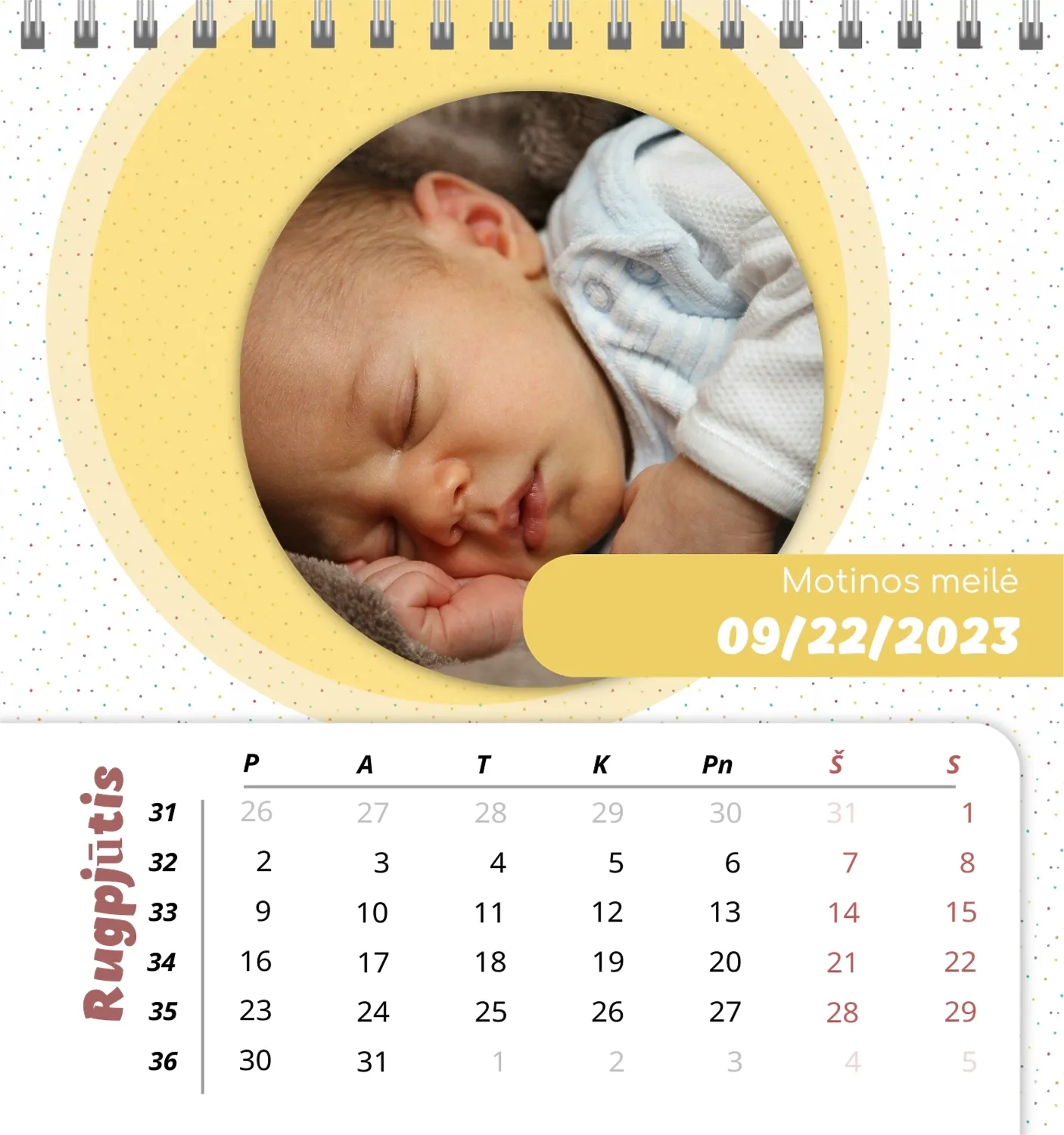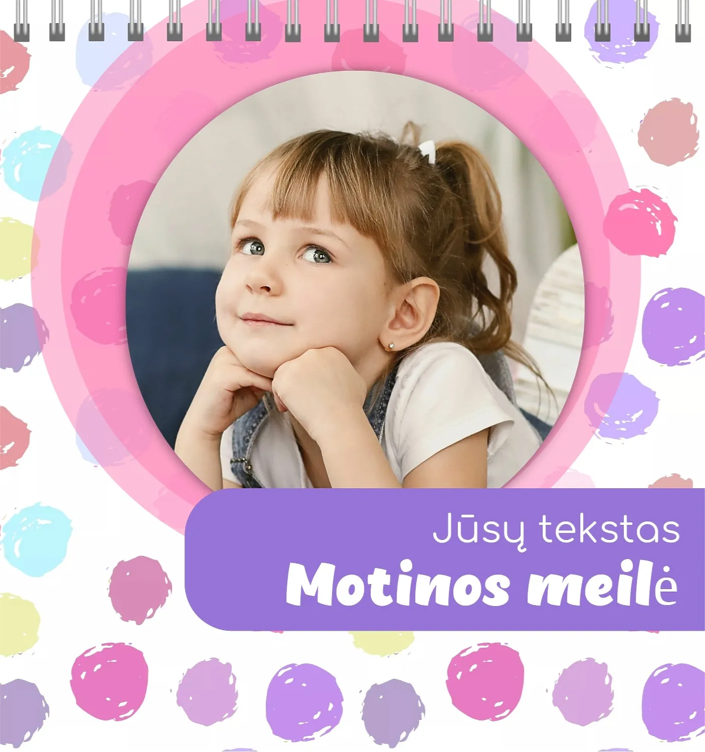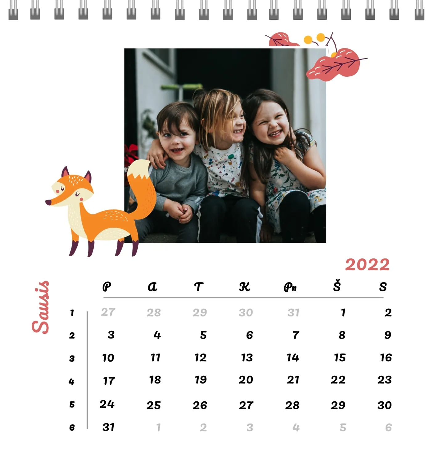 Paruoštas stalinio kompaktiško kalendoriaus su vaikų nuotraukomis ir mielu dekoratyviniu dizainu šablonas sukurtas tiems, kurie vertina šiltas šeimos emocijas ir nori paversti įprastą kalendorių jaukiu asmeniniu priedu. Švelnūs pasteliniai atspalviai, tvarkingos iliustracijos, Vaikiški dekoro elementai ir fotografijos akcentas daro tokį kalendorių ypač patraukliu tėvams, pedagogams, kūrybinių studijų pedagogams, vaikų fotografams ir visiems, dirbantiems su vaikais ar kuriantiems jiems turinį. Tai tinka šeimos archyvams, darželiams, plėtros centrams ir mažoms studijoms, norinčioms pasiūlyti klientams malonų ir emocinį produktą. Mūsų internetiniame dizaineryje šį šabloną lengva paversti savo užduotimis. Galite pakeisti nuotraukas, keisti elementų išdėstymą, redaguoti užrašus, pasirinkti kitus šriftus ir atspalvius, pridėti dekoratyvinių įdėklų arba atvirkščiai — pašalinti nereikalingus, kad būtų sukurta minimalistinė kompozicija. Kiekvieną mėnesį galite organizuoti įvairiais būdais, pridedant svarbias datas, atskiras pastabas ar mažus paveikslėlius, kurie pabrėžia vaiko charakterį ar fotografijos temą.