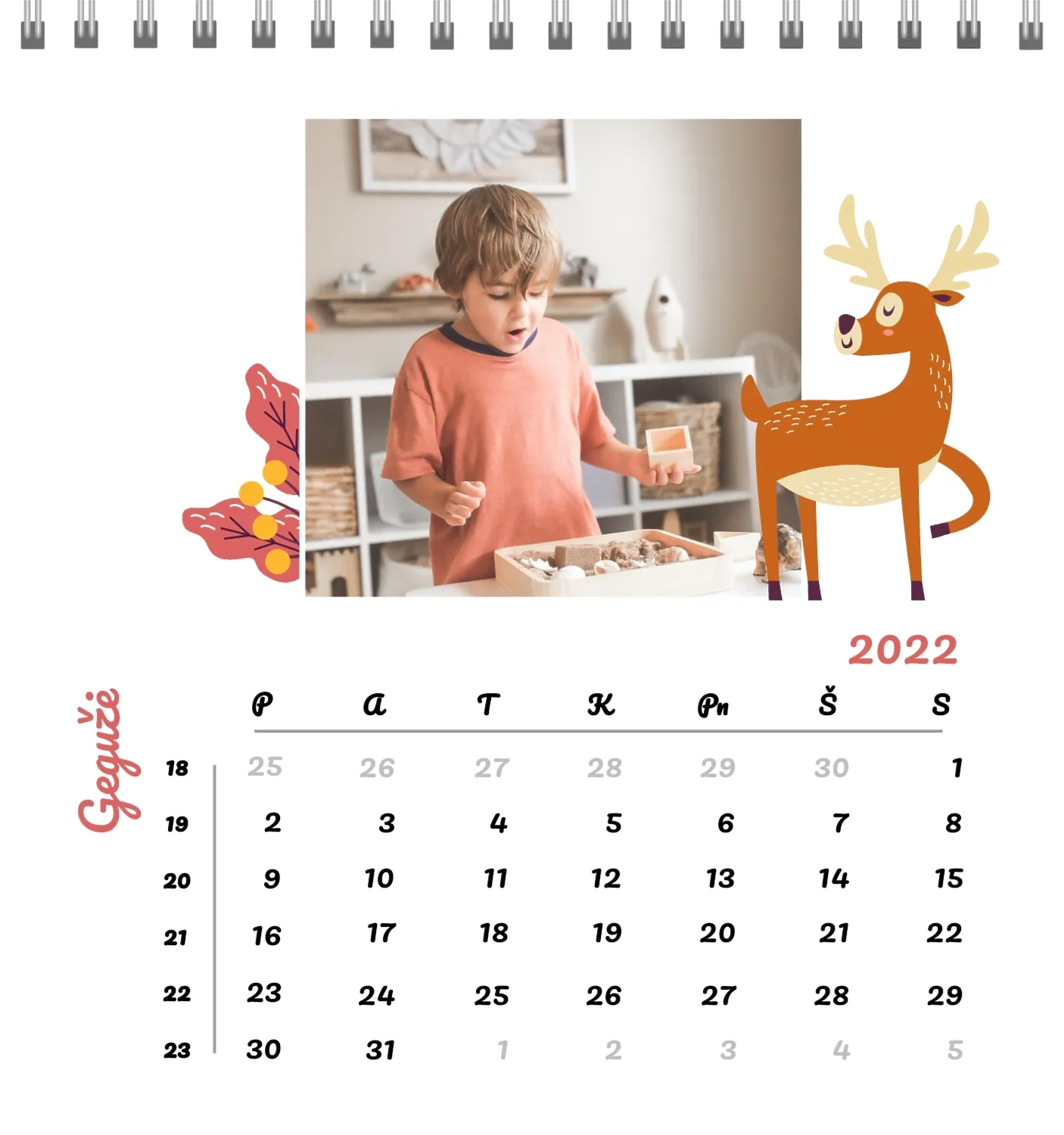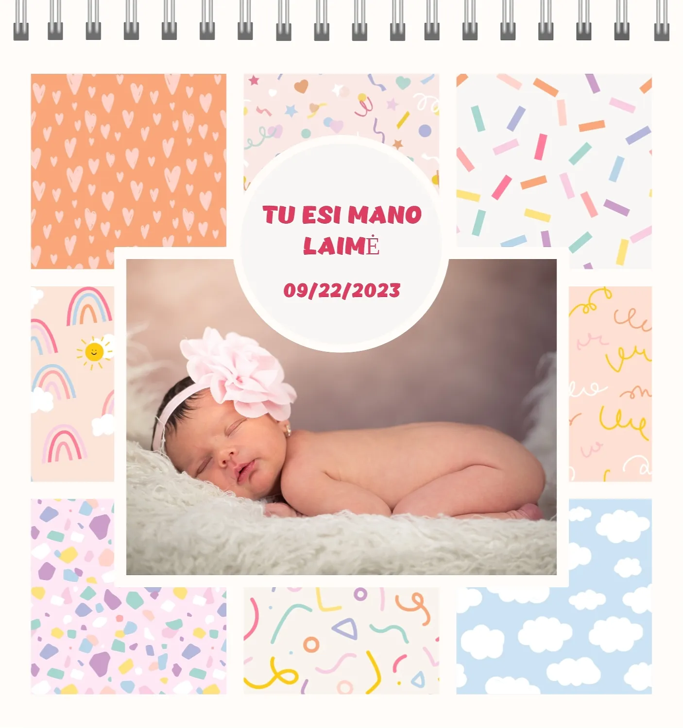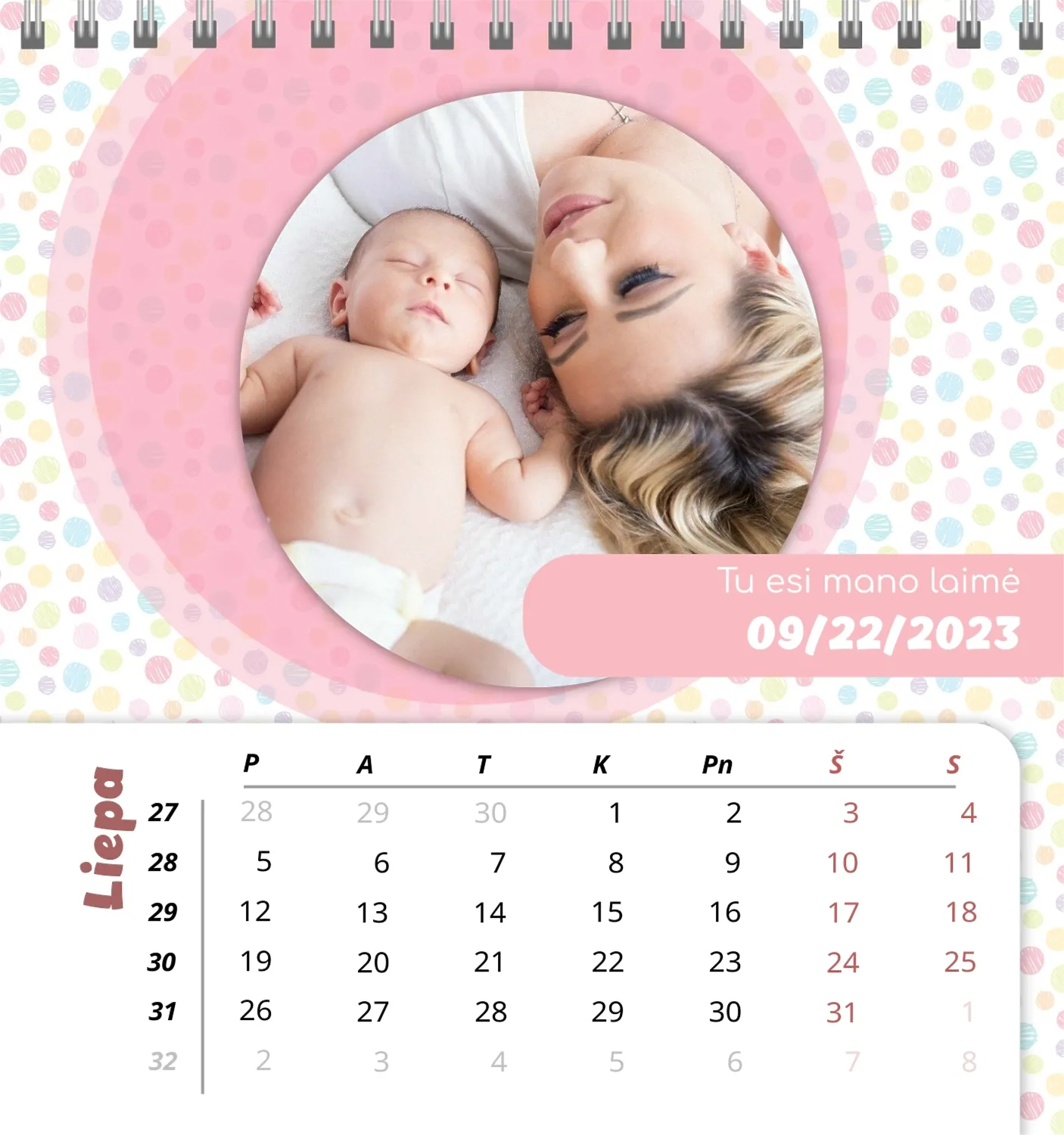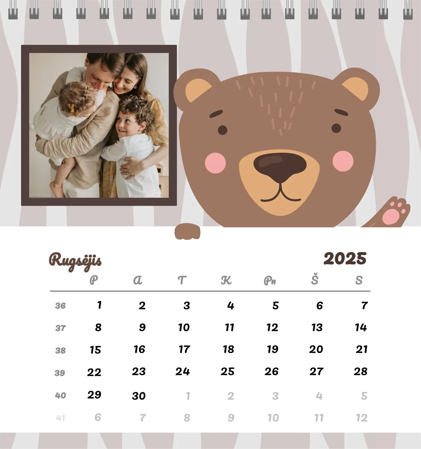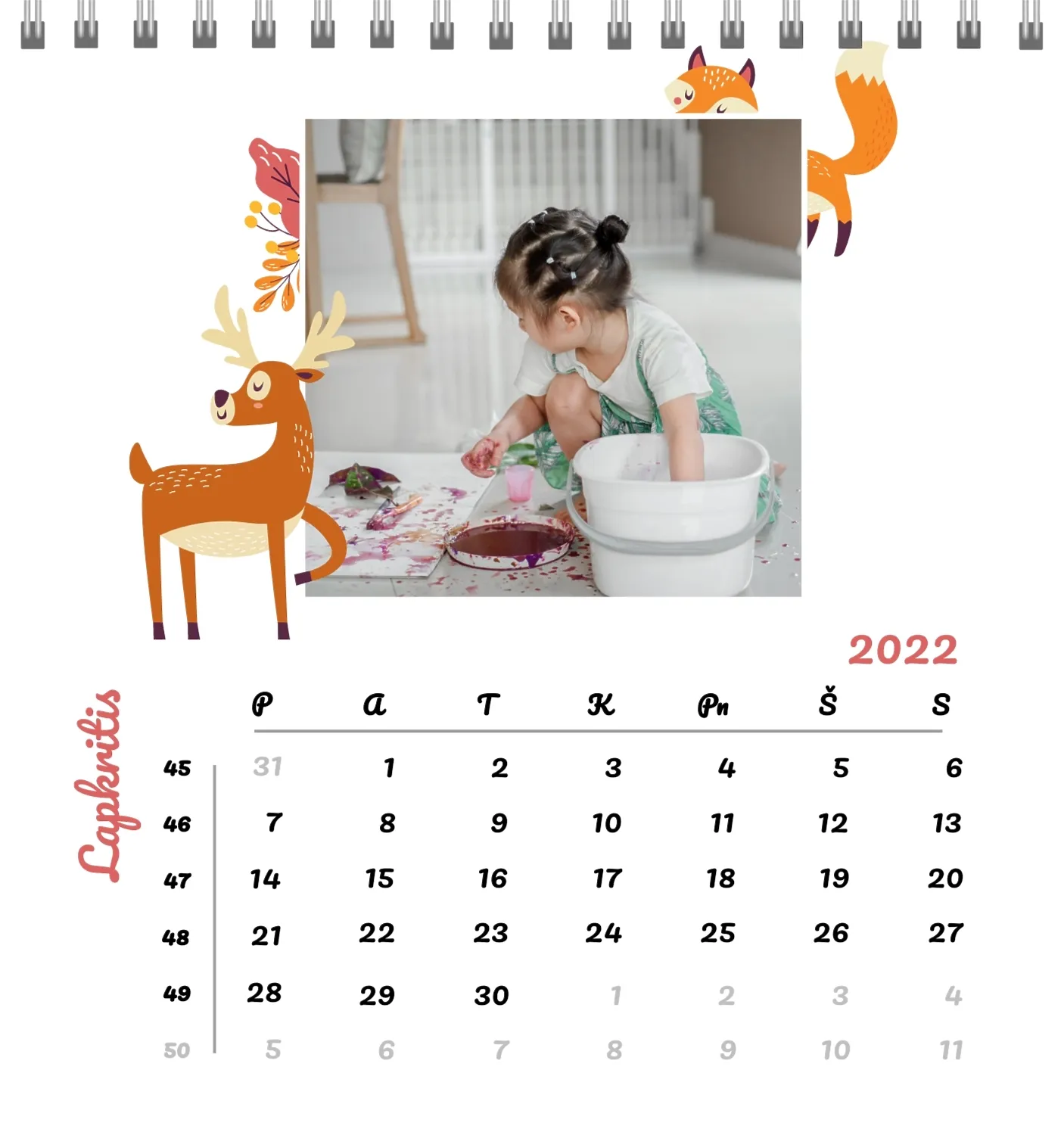 Paruoštas stalinio kompaktiško kalendoriaus su vaikų nuotraukomis ir mielu dekoratyviniu dizainu šablonas sukurtas tiems, kurie vertina šiltas šeimos emocijas ir nori paversti įprastą kalendorių jaukiu asmeniniu priedu. Švelnūs pasteliniai atspalviai, tvarkingos iliustracijos, Vaikiški dekoro elementai ir fotografijos akcentas daro tokį kalendorių ypač patraukliu tėvams, pedagogams, kūrybinių studijų pedagogams, vaikų fotografams ir visiems, dirbantiems su vaikais ar kuriantiems jiems turinį. Tai tinka šeimos archyvams, darželiams, plėtros centrams ir mažoms studijoms, norinčioms pasiūlyti klientams malonų ir emocinį produktą. Mūsų internetiniame dizaineryje šį šabloną lengva paversti savo užduotimis. Galite pakeisti nuotraukas, keisti elementų išdėstymą, redaguoti užrašus, pasirinkti kitus šriftus ir atspalvius, pridėti dekoratyvinių įdėklų arba atvirkščiai — pašalinti nereikalingus, kad būtų sukurta minimalistinė kompozicija. Kiekvieną mėnesį galite organizuoti įvairiais būdais, pridedant svarbias datas, atskiras pastabas ar mažus paveikslėlius, kurie pabrėžia vaiko charakterį ar fotografijos temą.