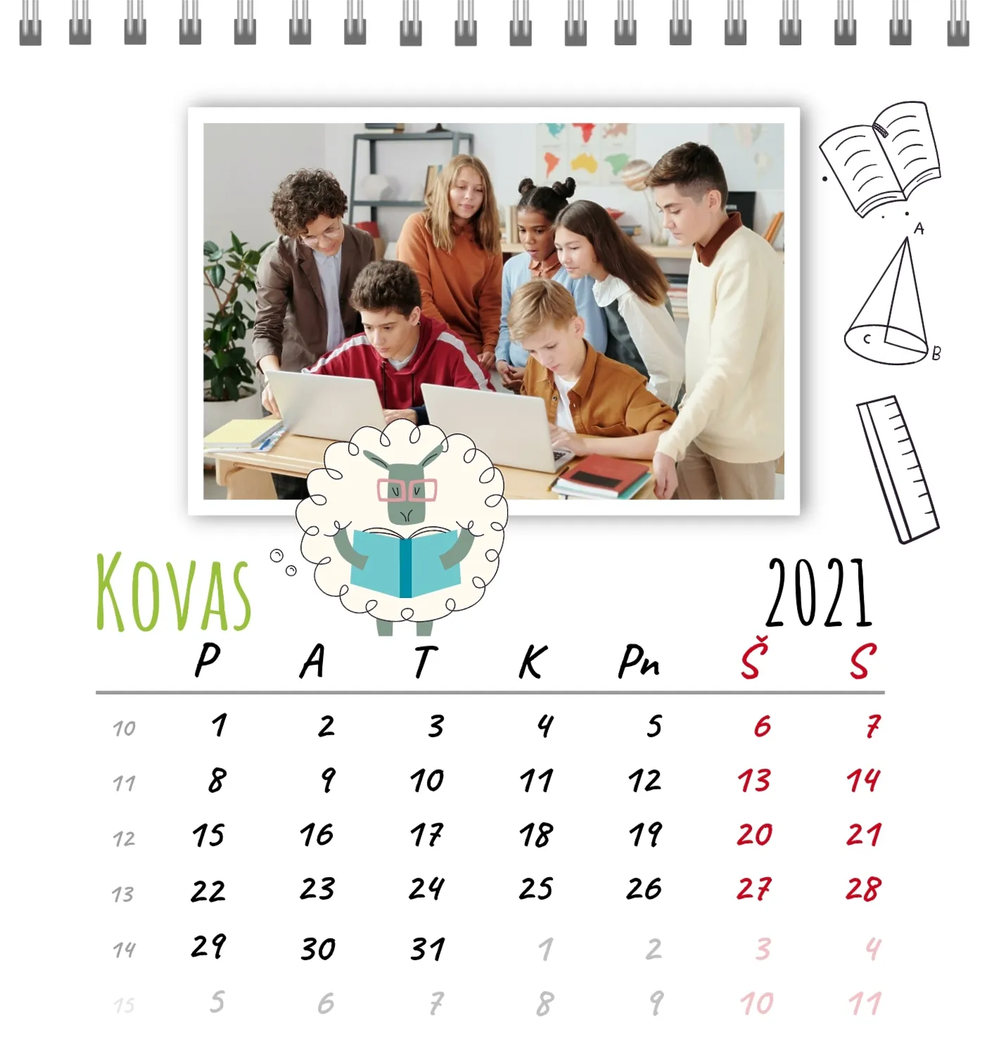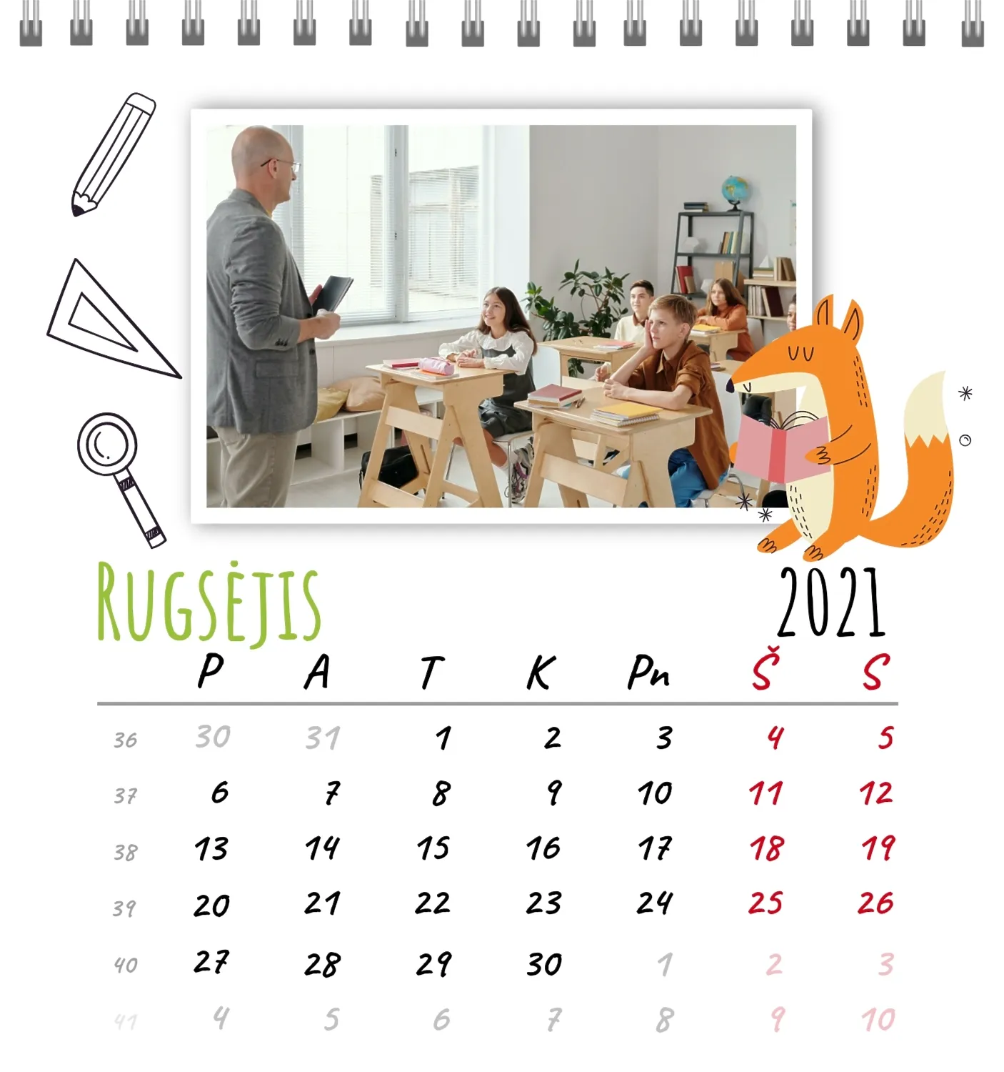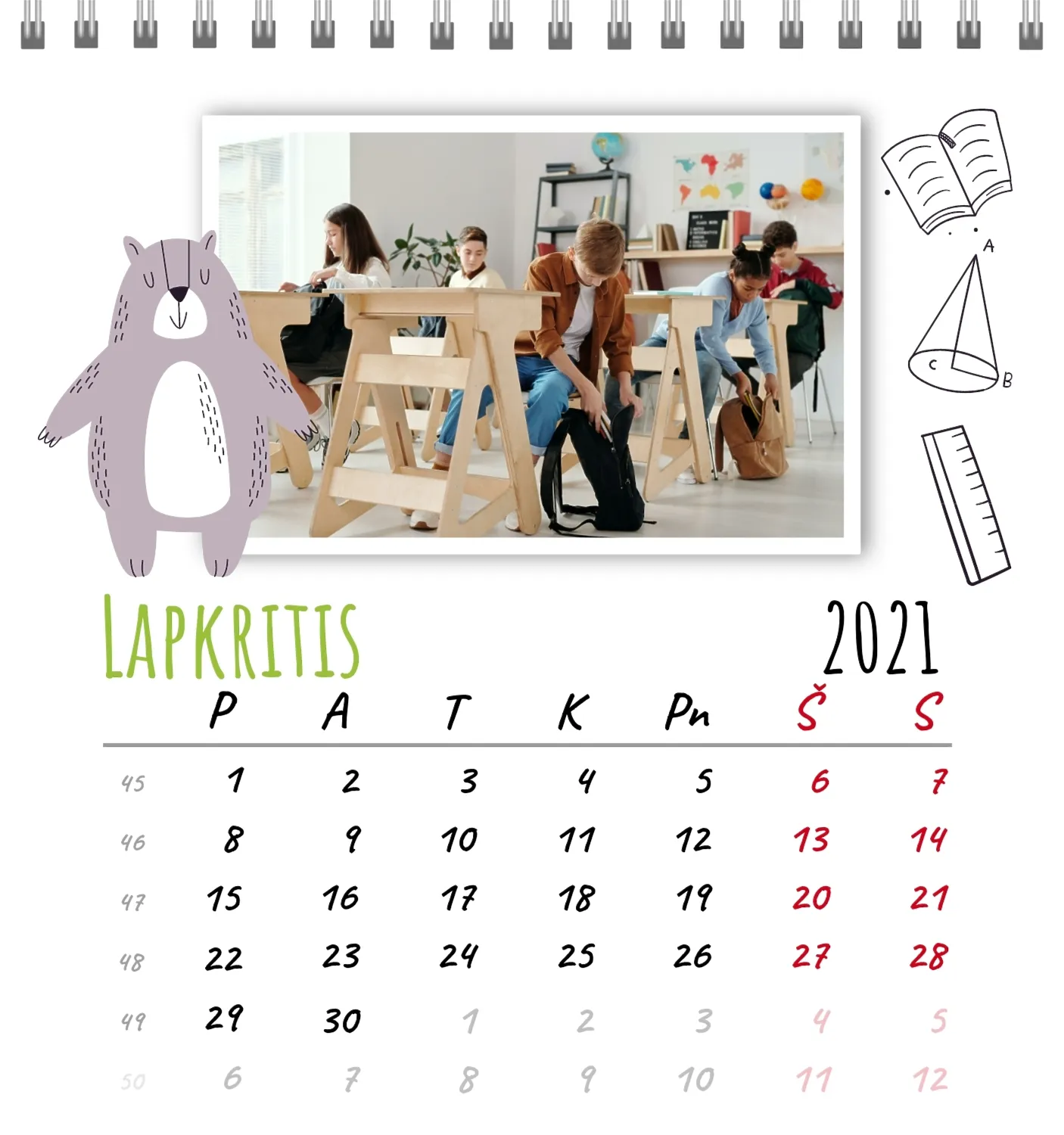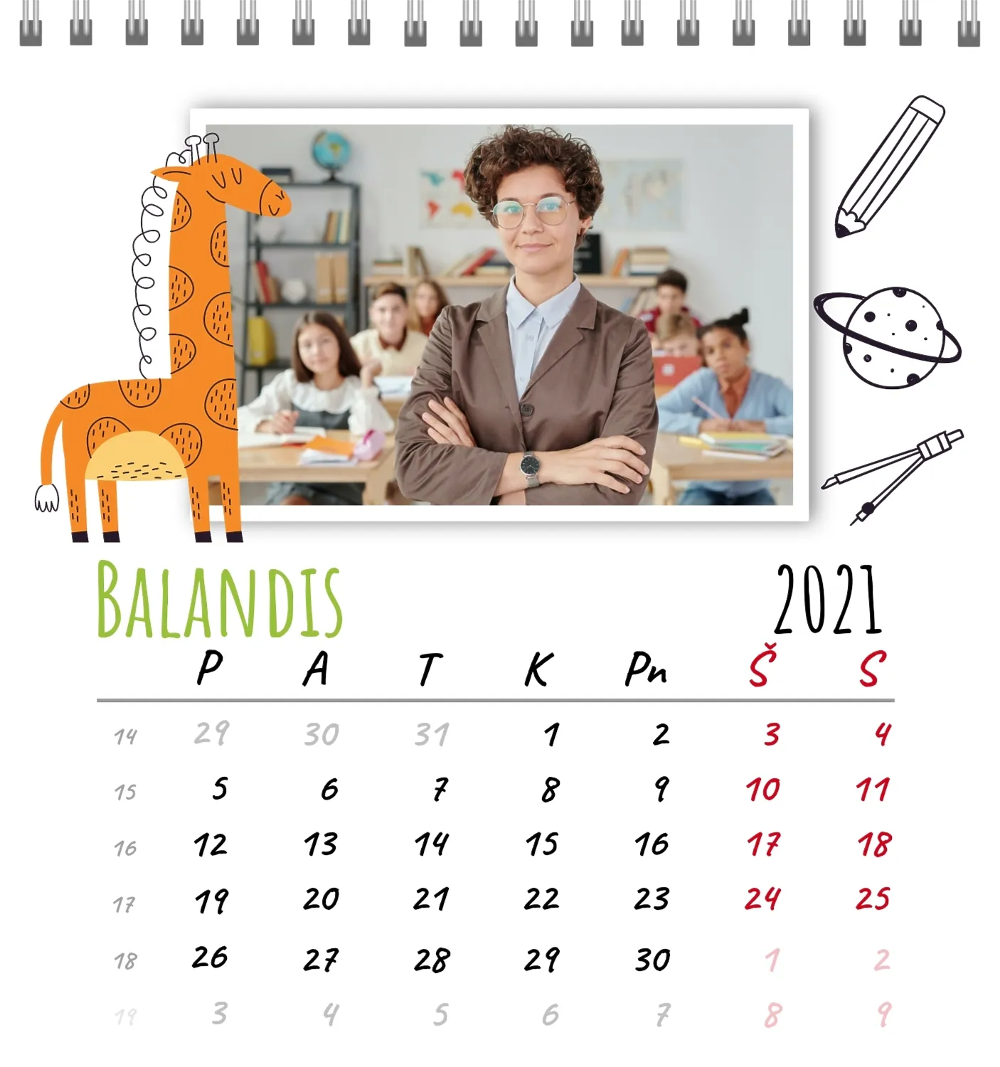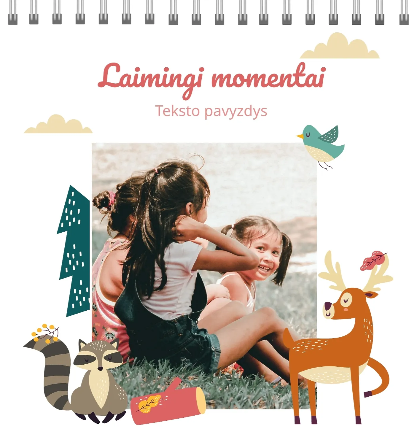 Paruoštas stalinio kompaktiško kalendoriaus su vaikų nuotraukomis ir mielu dekoratyviniu dizainu šablonas sukurtas tiems, kurie vertina šiltas šeimos emocijas ir nori paversti įprastą kalendorių jaukiu asmeniniu priedu. Švelnūs pasteliniai atspalviai, tvarkingos iliustracijos, Vaikiški dekoro elementai ir fotografijos akcentas daro tokį kalendorių ypač patraukliu tėvams, pedagogams, kūrybinių studijų pedagogams, vaikų fotografams ir visiems, dirbantiems su vaikais ar kuriantiems jiems turinį. Tai tinka šeimos archyvams, darželiams, plėtros centrams ir mažoms studijoms, norinčioms pasiūlyti klientams malonų ir emocinį produktą. Mūsų internetiniame dizaineryje šį šabloną lengva paversti savo užduotimis. Galite pakeisti nuotraukas, keisti elementų išdėstymą, redaguoti užrašus, pasirinkti kitus šriftus ir atspalvius, pridėti dekoratyvinių įdėklų arba atvirkščiai — pašalinti nereikalingus, kad būtų sukurta minimalistinė kompozicija. Kiekvieną mėnesį galite organizuoti įvairiais būdais, pridedant svarbias datas, atskiras pastabas ar mažus paveikslėlius, kurie pabrėžia vaiko charakterį ar fotografijos temą.
