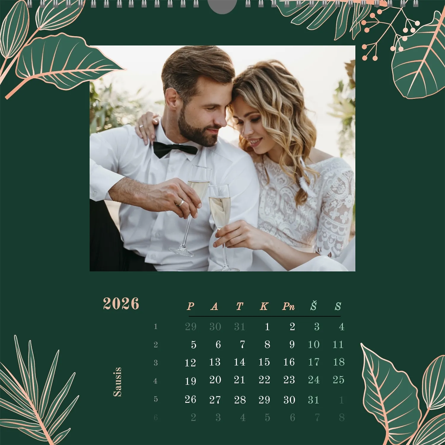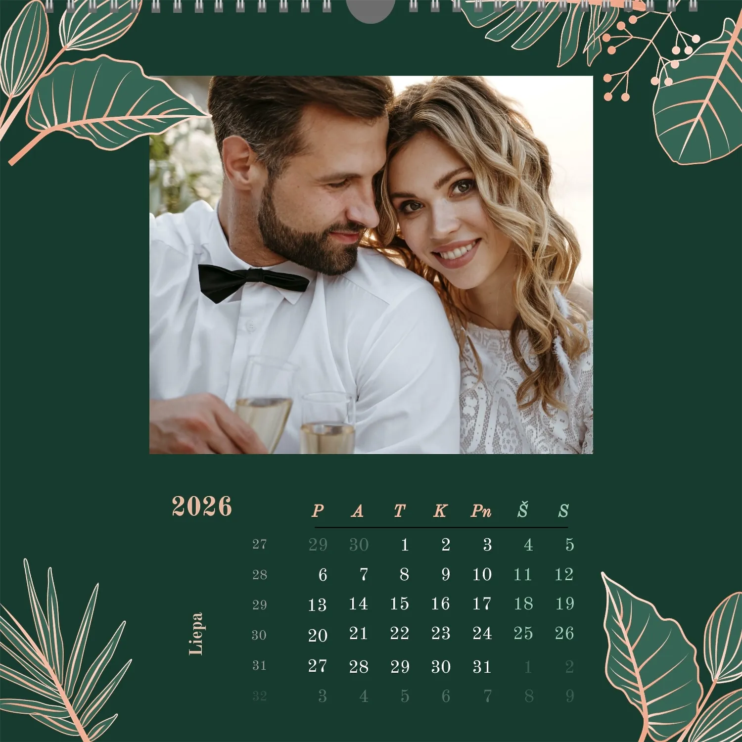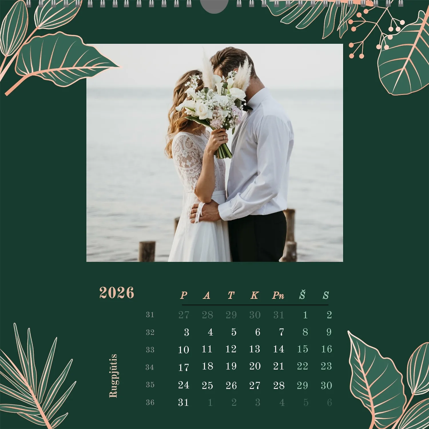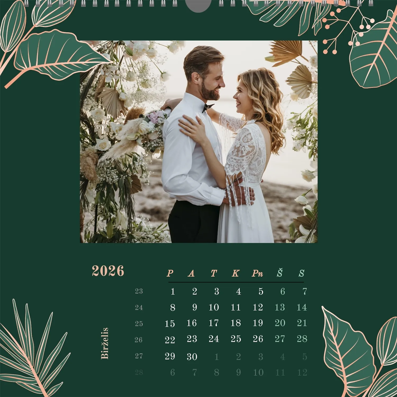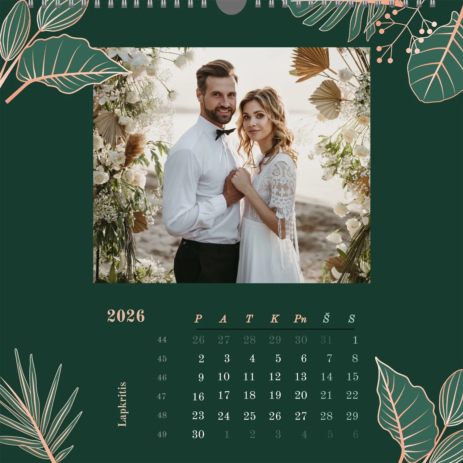 Baigtas kvadratinio kalendoriaus šablonas su vestuvių nuotraukomis yra universalus pagrindas, sukurtas specialiai tiems, kurie nori išsaugoti šventės atmosferą gražiu ir funkcionaliu formatu. Internetiniame dizaineryje šis šablonas yra visiškai redaguojamas, todėl jį galima pritaikyti bet kokiai istorijai ar vestuvių stiliui. Galite pakeisti foną, keisti nuotraukų vietą, koreguoti spalvų schemą, pridėti užrašus, svarbias datas ir individualius pageidavimus. Visi elementai lengvai perkeliami, išplečiami ir pritaikomi kompozicijai - tai daro kūrimo procesą kuo patogesnį net tiems, kurie neturi dizaino patirties. Jei reikia, galite pridėti dekoratyvinių elementų, firminių šriftų ar net stilizuoti maketą tam tikrai vestuvių temai, ar tai būtų klasika, Boho, minimalizmas ar derlius. Naudodamiesi mūsų internetiniu dizaineriu galite sukurti tikrai unikalų sienų kalendorių, kuris taps gražiu priminimu apie svarbią dieną ir džiugins visus metus.