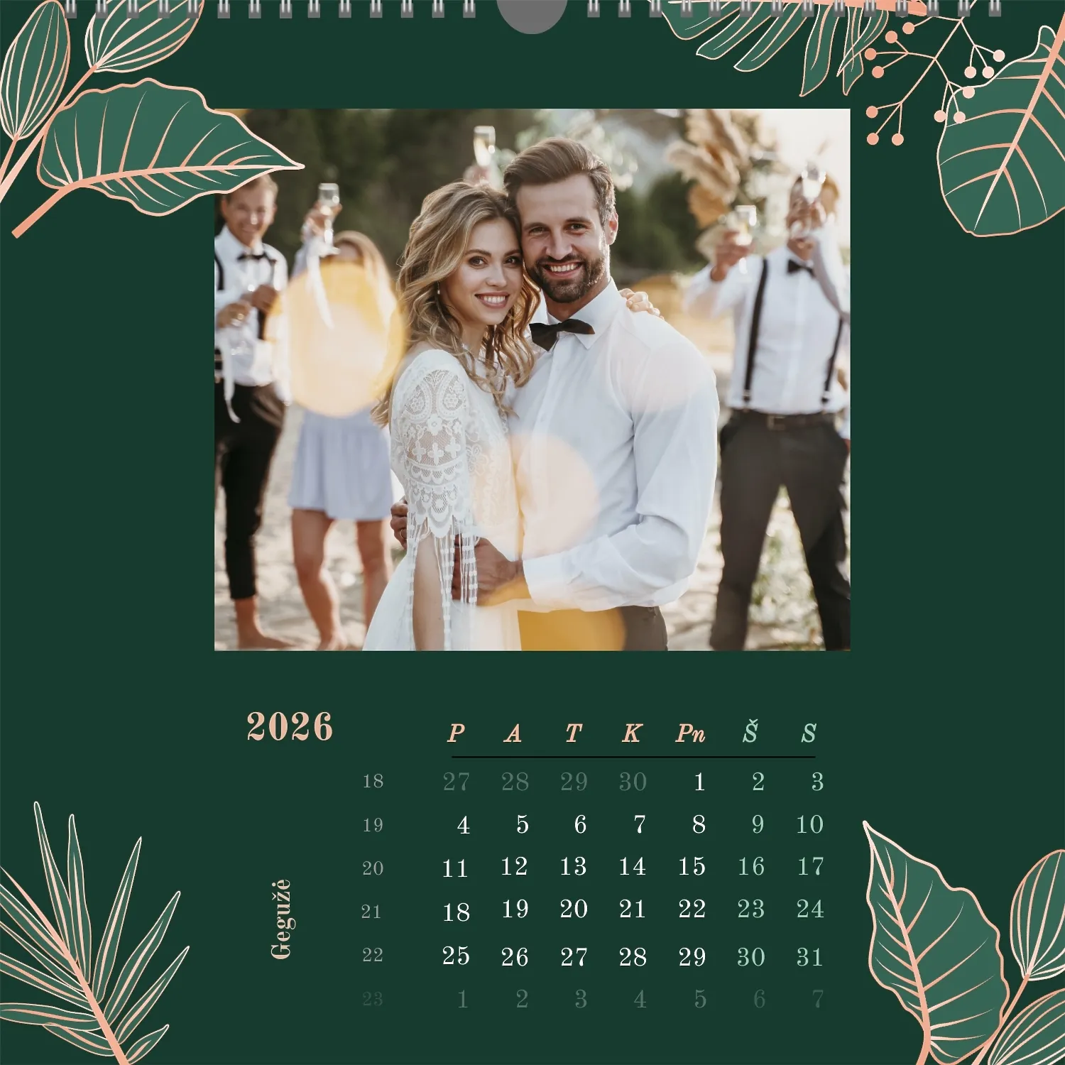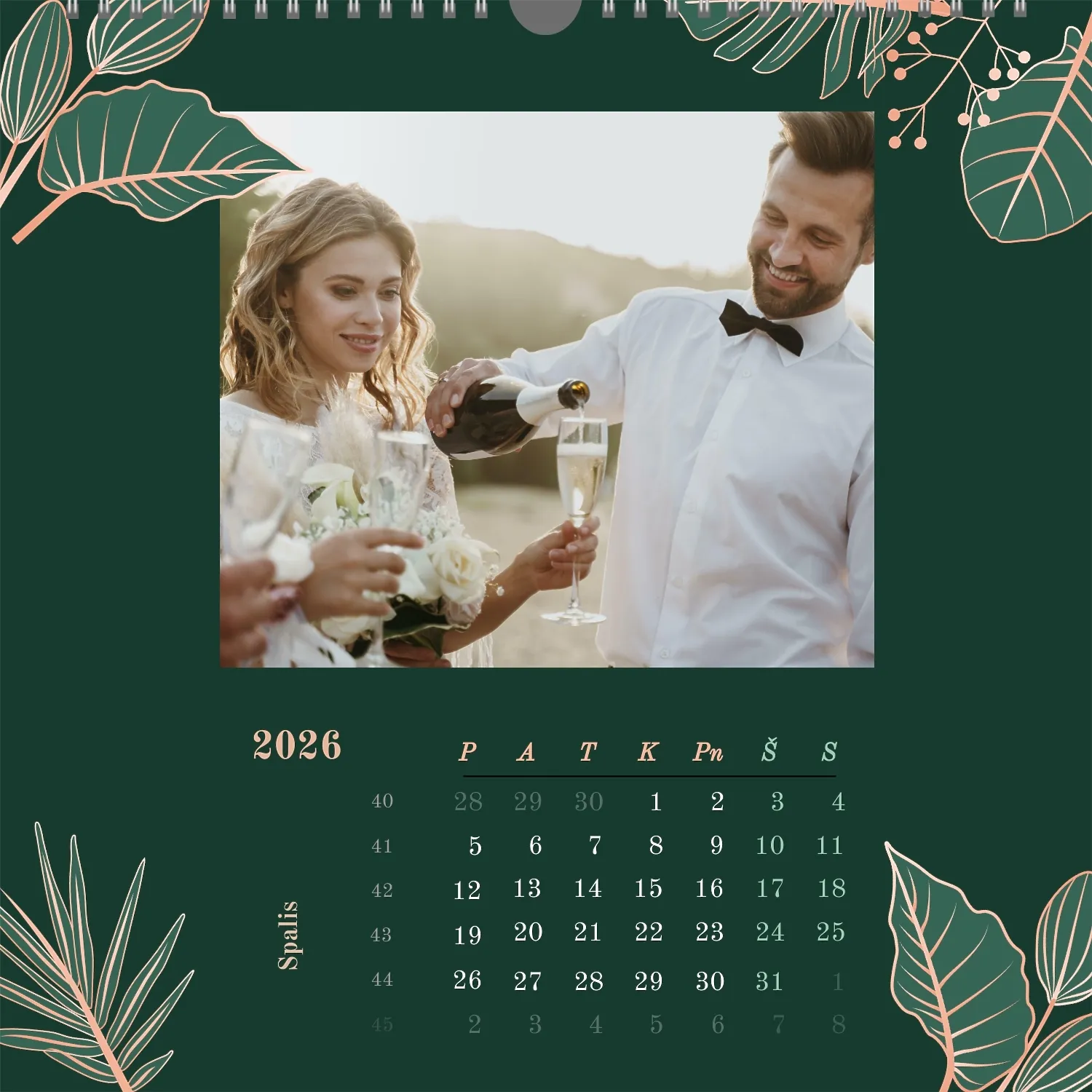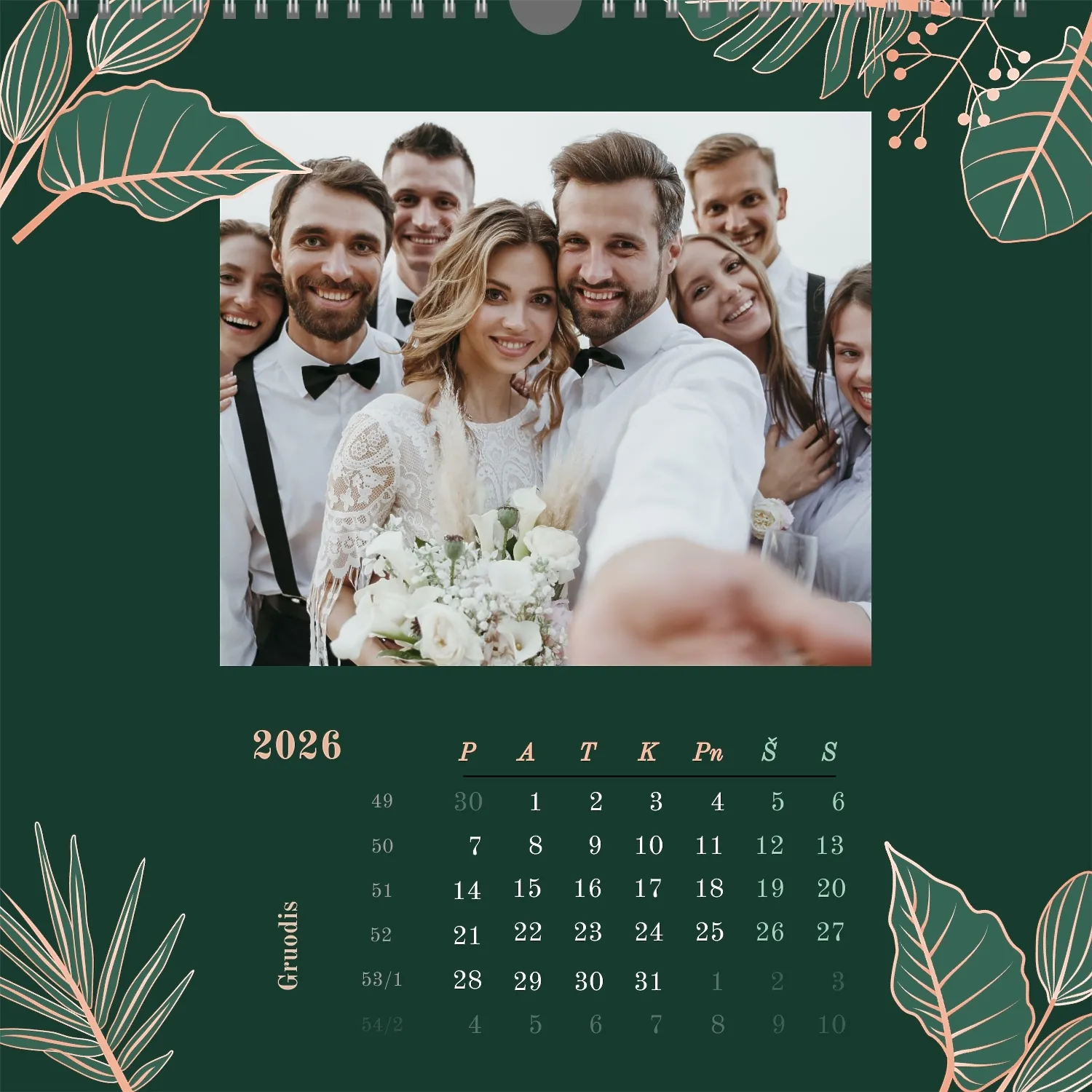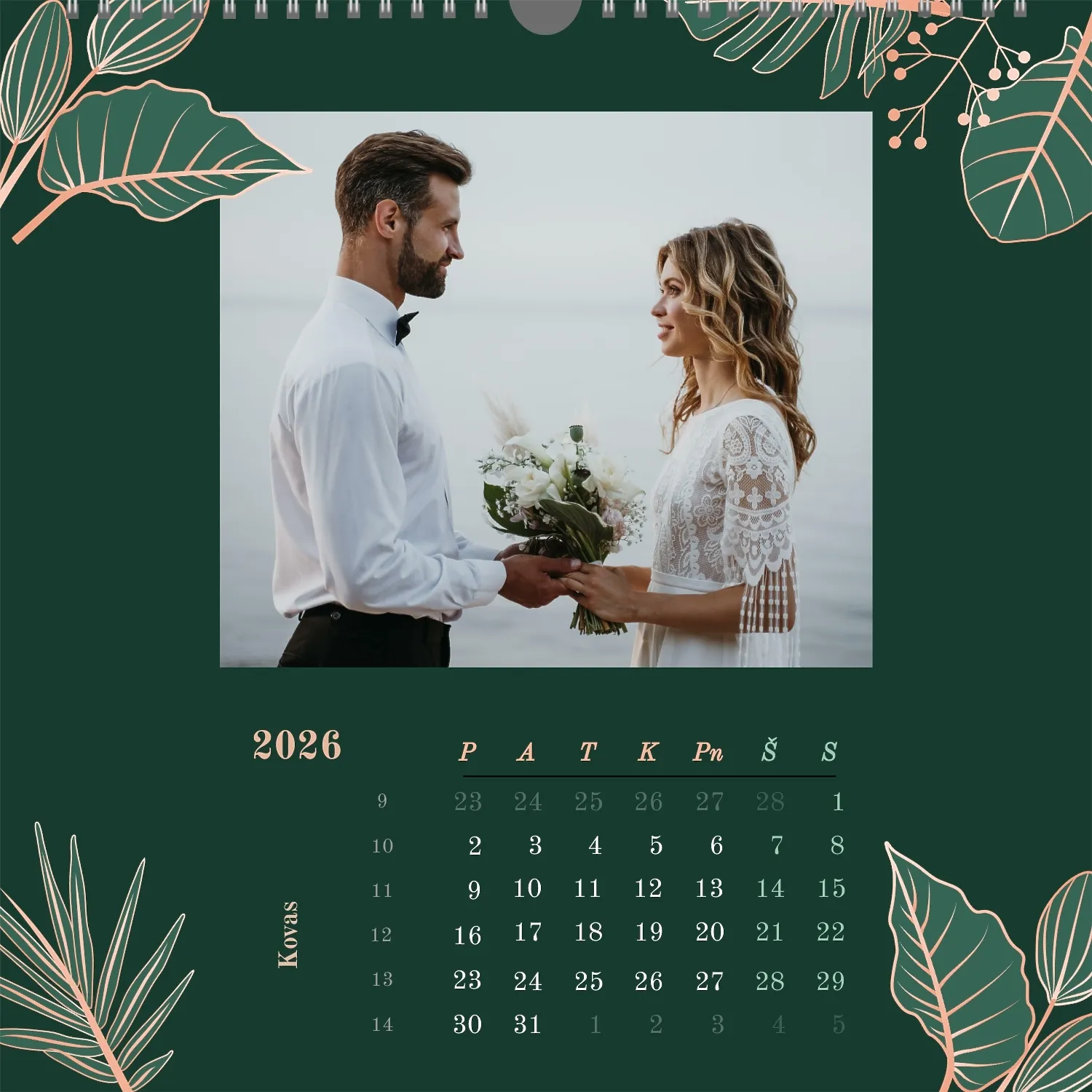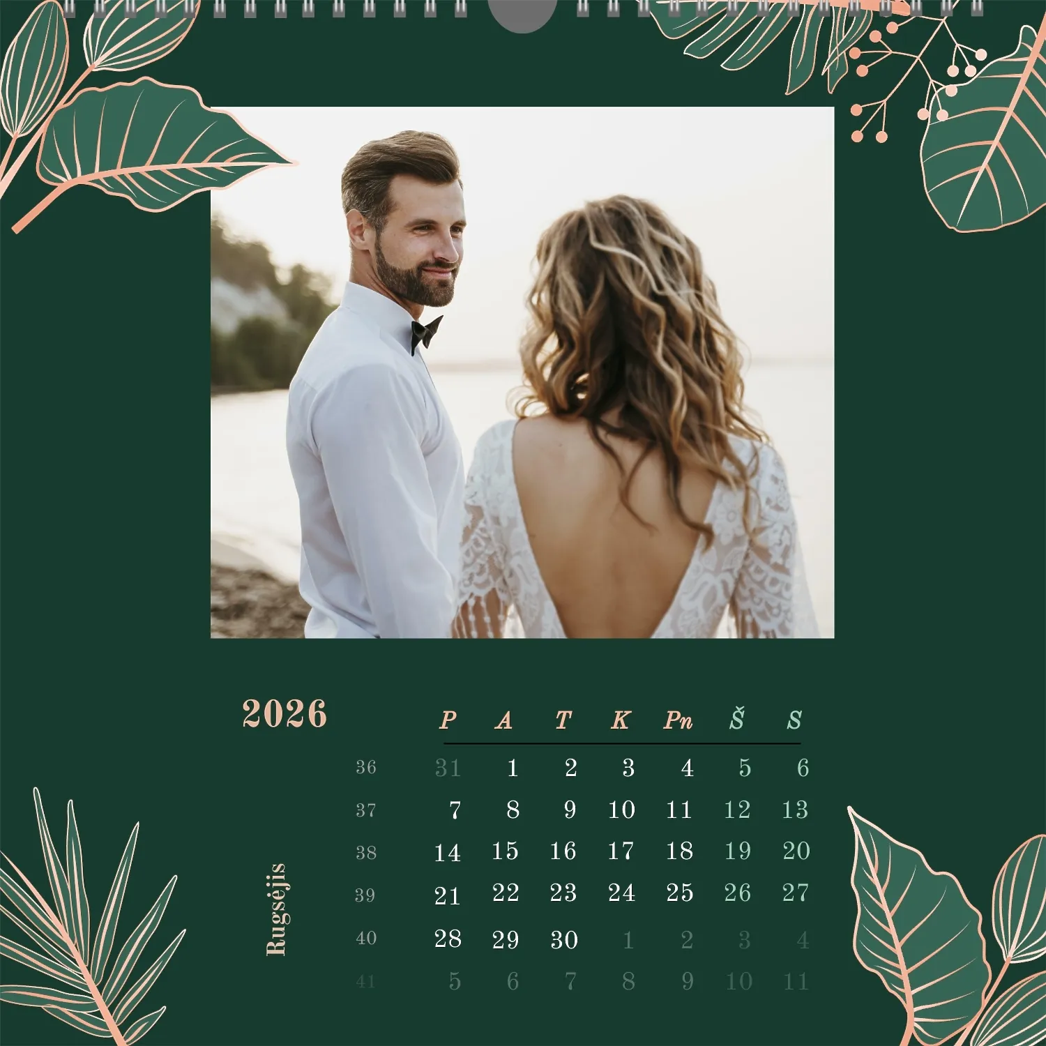 Baigtas kvadratinio kalendoriaus šablonas su vestuvių nuotraukomis yra universalus pagrindas, sukurtas specialiai tiems, kurie nori išsaugoti šventės atmosferą gražiu ir funkcionaliu formatu. Internetiniame dizaineryje šis šablonas yra visiškai redaguojamas, todėl jį galima pritaikyti bet kokiai istorijai ar vestuvių stiliui. Galite pakeisti foną, keisti nuotraukų vietą, koreguoti spalvų schemą, pridėti užrašus, svarbias datas ir individualius pageidavimus. Visi elementai lengvai perkeliami, išplečiami ir pritaikomi kompozicijai - tai daro kūrimo procesą kuo patogesnį net tiems, kurie neturi dizaino patirties. Jei reikia, galite pridėti dekoratyvinių elementų, firminių šriftų ar net stilizuoti maketą tam tikrai vestuvių temai, ar tai būtų klasika, Boho, minimalizmas ar derlius. Naudodamiesi mūsų internetiniu dizaineriu galite sukurti tikrai unikalų sienų kalendorių, kuris taps gražiu priminimu apie svarbią dieną ir džiugins visus metus.