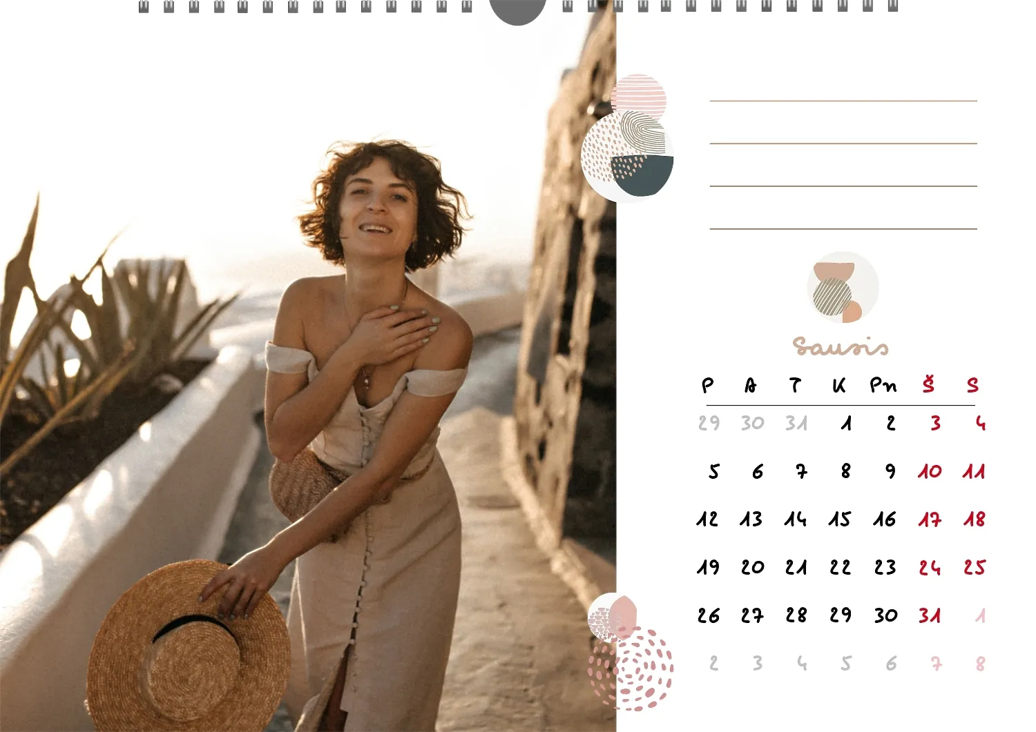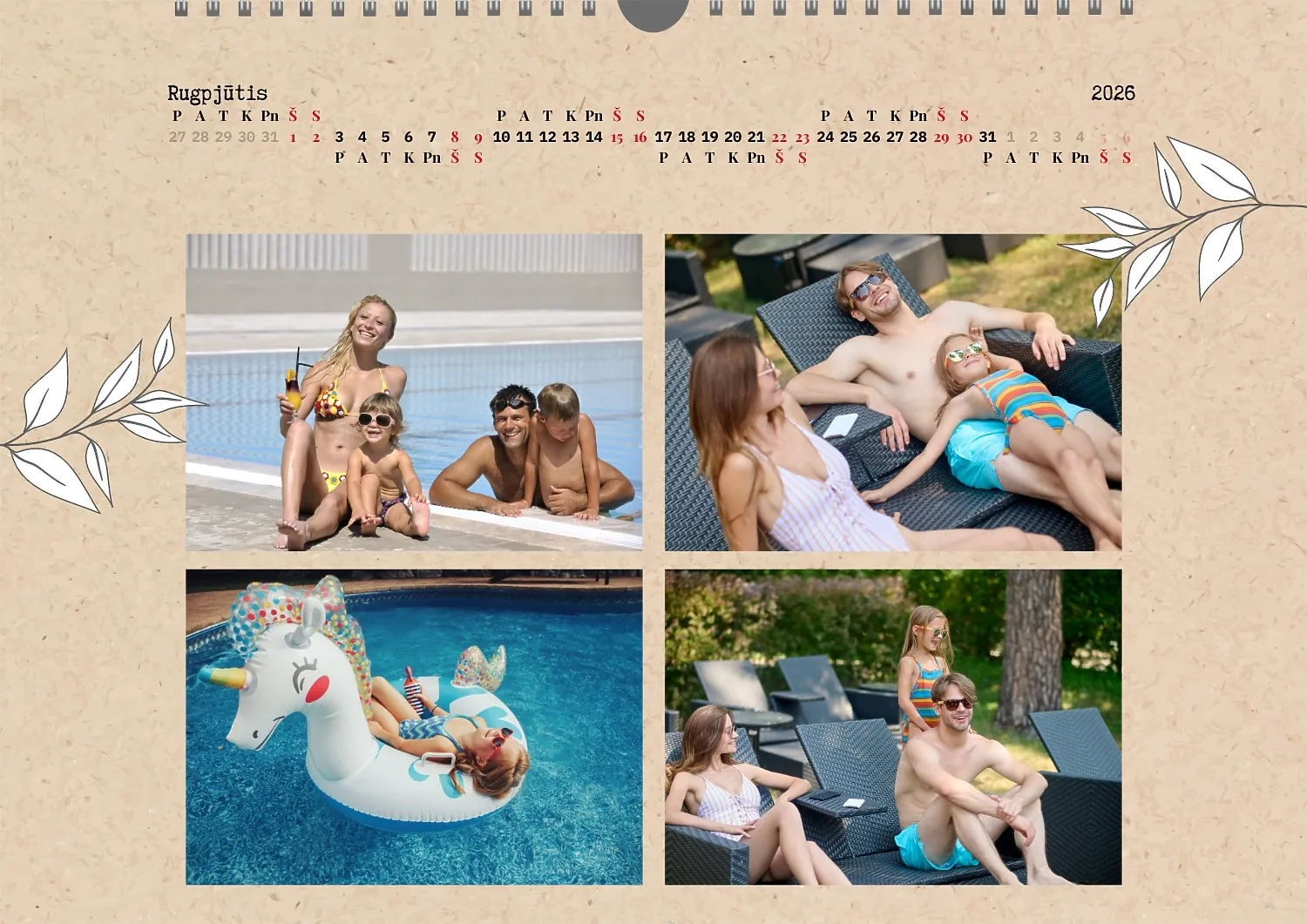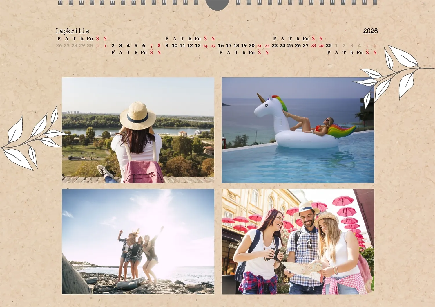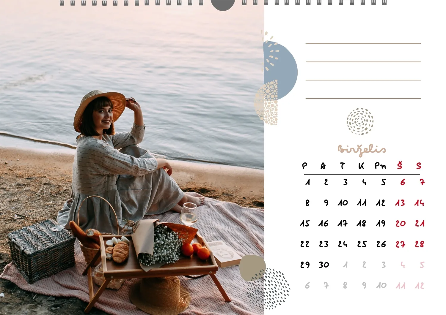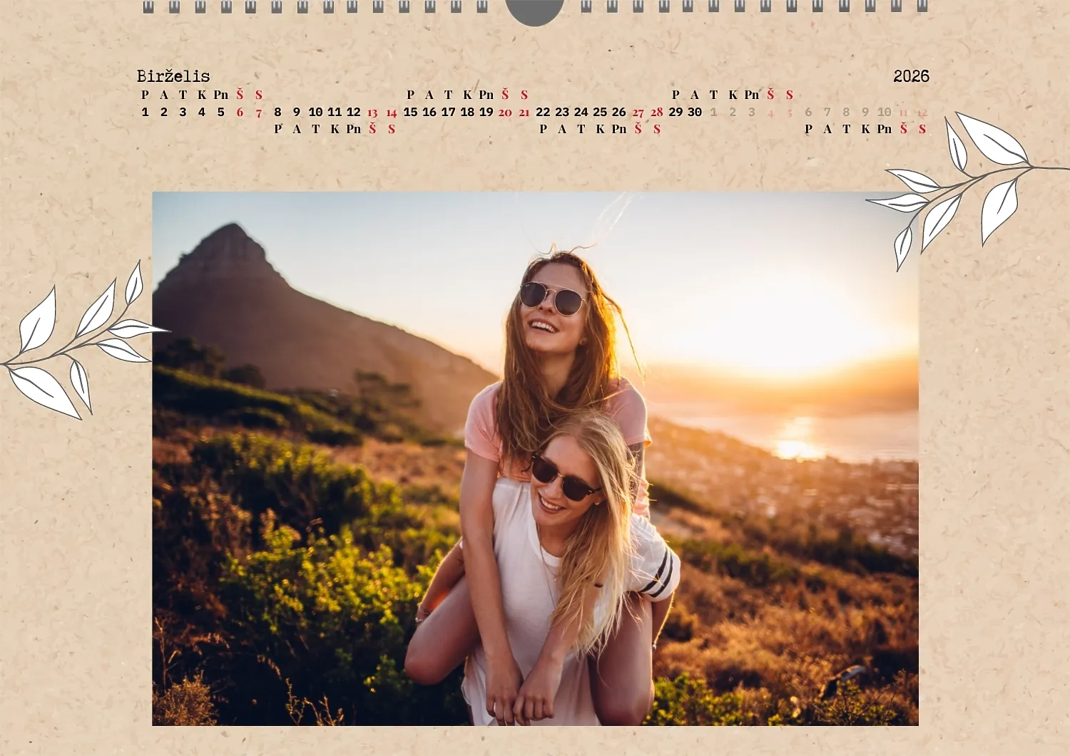 Gatavas horizontalaus kalendoriaus "prisiminimai" šablonas sukurtas tiems, kurie vertina šiltus momentus ir nori juos išsaugoti kasdieniame gyvenime. Jo minkšta kompozicija, šviesi paletė ir tvarkingos dekoratyvinės detalės leidžia pabrėžti šeimos komforto, kelionių, renginių ir brangių susitikimų atmosferą. Šis šablonas tinka tėvams, mokytojams, fotografams, kūrybinėms studijoms, mažų prekių ženklų savininkams, taip pat visiems, kurie nori sukurti asmenines ar darbo erdves su dvasiniu akcentu. Jis vienodai tinka tiek namuose, tiek biure — tiek studijoje-visur, kur svarbios emocijos ir vizualinė estetika. Internetiniame dizaineryje šis kalendorius gali būti lengvai pritaikytas prie jūsų stiliaus. Kiekvieną puslapį galima užpildyti savo nuotraukomis - nuo šeimos nuotraukų iki mokinių portretų ar renginių personalo. Parašai ir datos redaguojami: galite pakeisti mėnesių pavadinimus, pridėti svarbių įvykių, pažymėti gimtadienius, įsimintinas datas ar kultūrinius renginius savo organizacijoje. Užrašų šriftai ir spalvos taip pat nustatomi, kad kalendorius būtų ryškesnis, griežtesnis arba, atvirkščiai, kuo švelnesnis. Jei pageidaujate, galite pridėti įmonės logotipą, šūkį, kontaktinę informaciją arba palikti dizainą visiškai asmeninį ir namų dizainą.