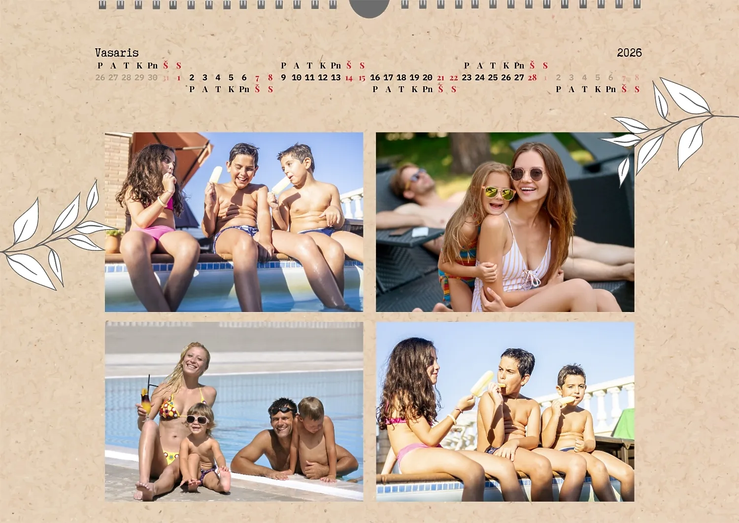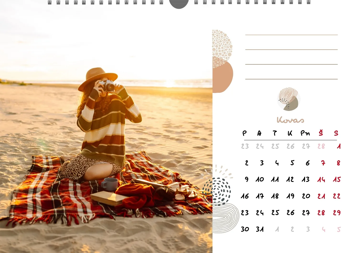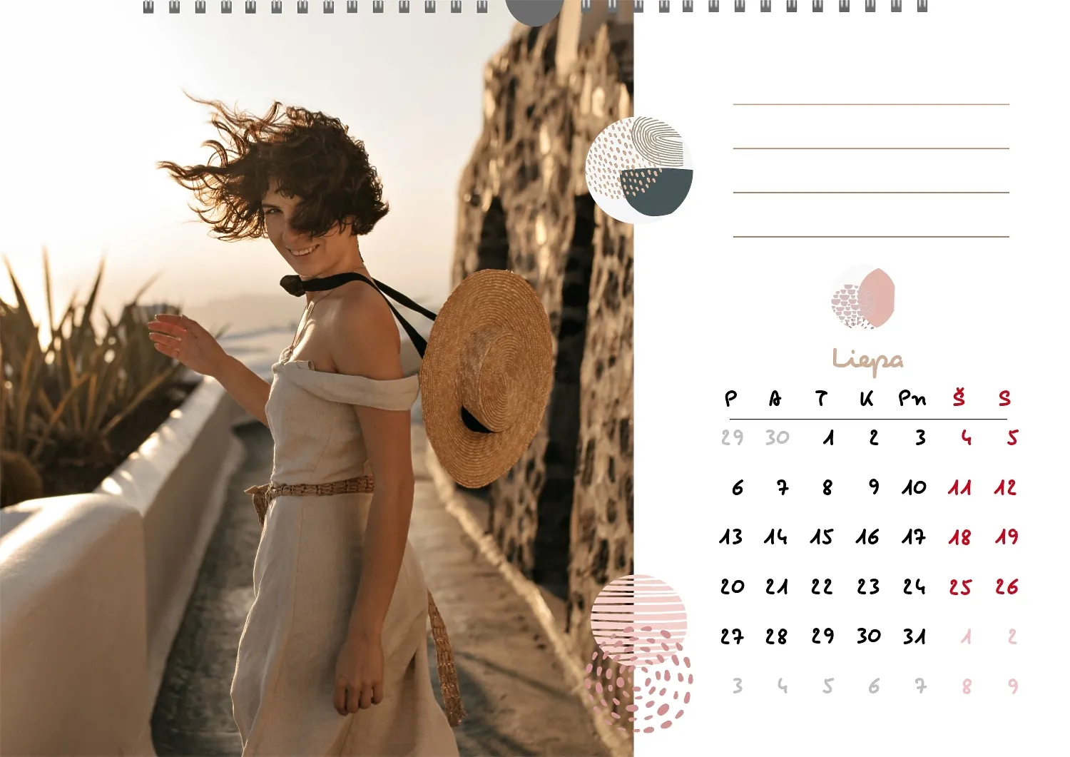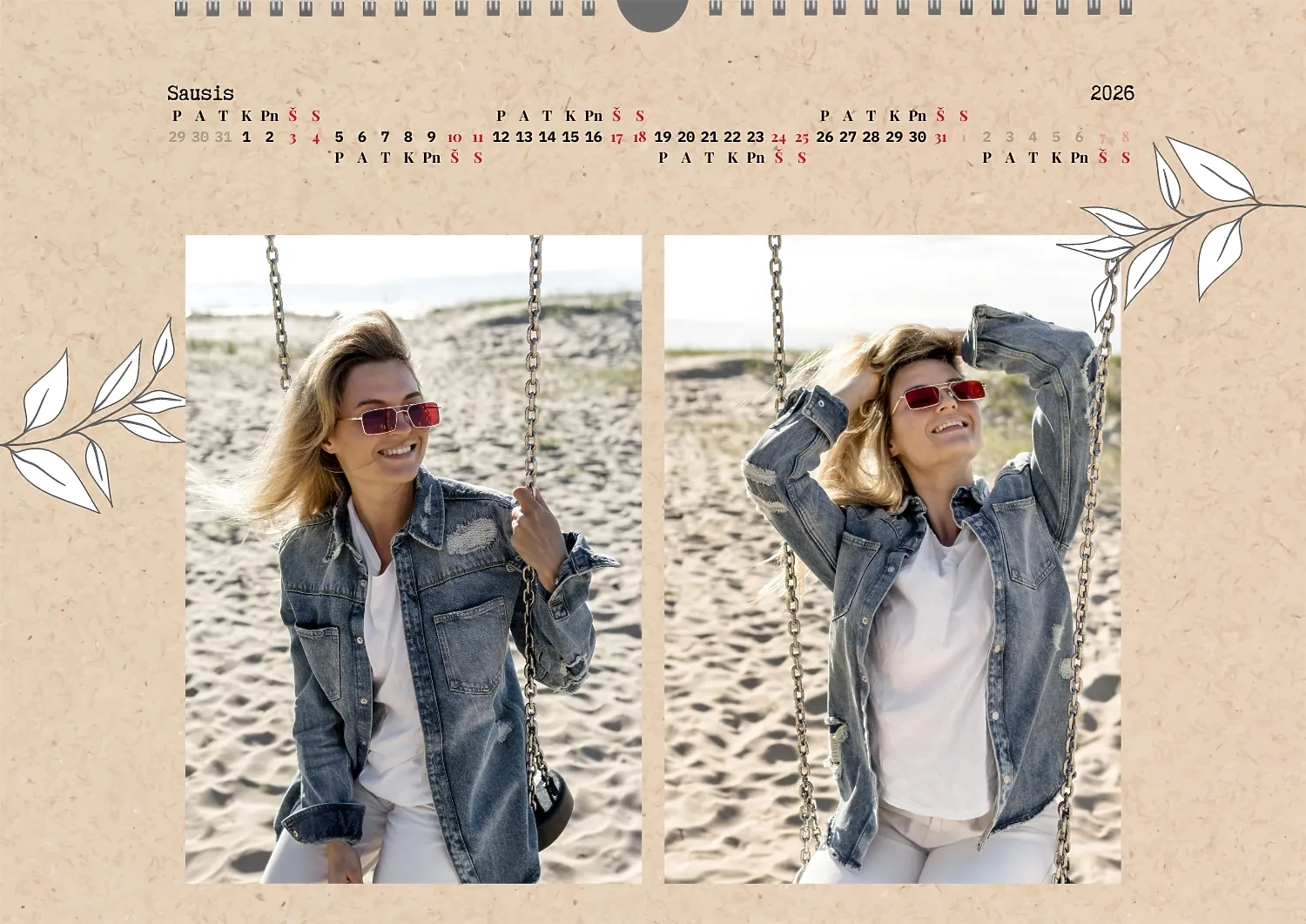 Gatavas horizontalaus kalendoriaus "prisiminimai" šablonas sukurtas tiems, kurie vertina šiltus momentus ir nori juos išsaugoti kasdieniame gyvenime. Jo minkšta kompozicija, šviesi paletė ir tvarkingos dekoratyvinės detalės leidžia pabrėžti šeimos komforto, kelionių, renginių ir brangių susitikimų atmosferą. Šis šablonas tinka tėvams, mokytojams, fotografams, kūrybinėms studijoms, mažų prekių ženklų savininkams, taip pat visiems, kurie nori sukurti asmenines ar darbo erdves su dvasiniu akcentu. Jis vienodai tinka tiek namuose, tiek biure — tiek studijoje-visur, kur svarbios emocijos ir vizualinė estetika. Internetiniame dizaineryje šis kalendorius gali būti lengvai pritaikytas prie jūsų stiliaus. Kiekvieną puslapį galima užpildyti savo nuotraukomis - nuo šeimos nuotraukų iki mokinių portretų ar renginių personalo. Parašai ir datos redaguojami: galite pakeisti mėnesių pavadinimus, pridėti svarbių įvykių, pažymėti gimtadienius, įsimintinas datas ar kultūrinius renginius savo organizacijoje. Užrašų šriftai ir spalvos taip pat nustatomi, kad kalendorius būtų ryškesnis, griežtesnis arba, atvirkščiai, kuo švelnesnis. Jei pageidaujate, galite pridėti įmonės logotipą, šūkį, kontaktinę informaciją arba palikti dizainą visiškai asmeninį ir namų dizainą.