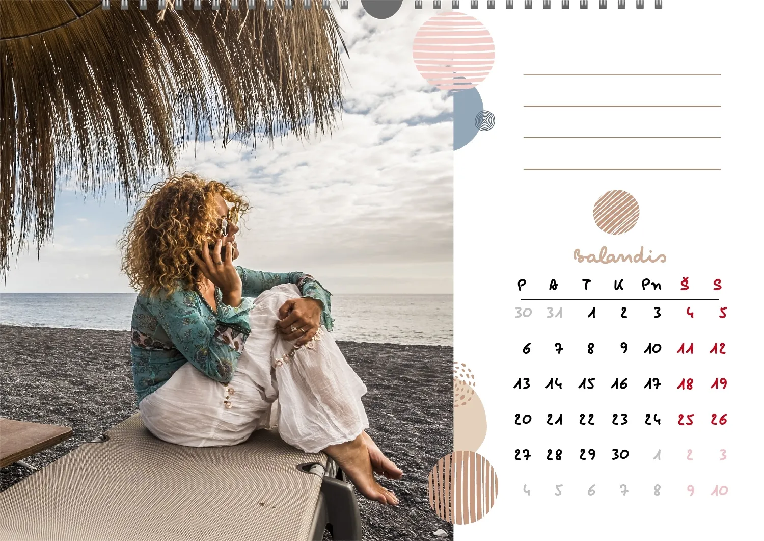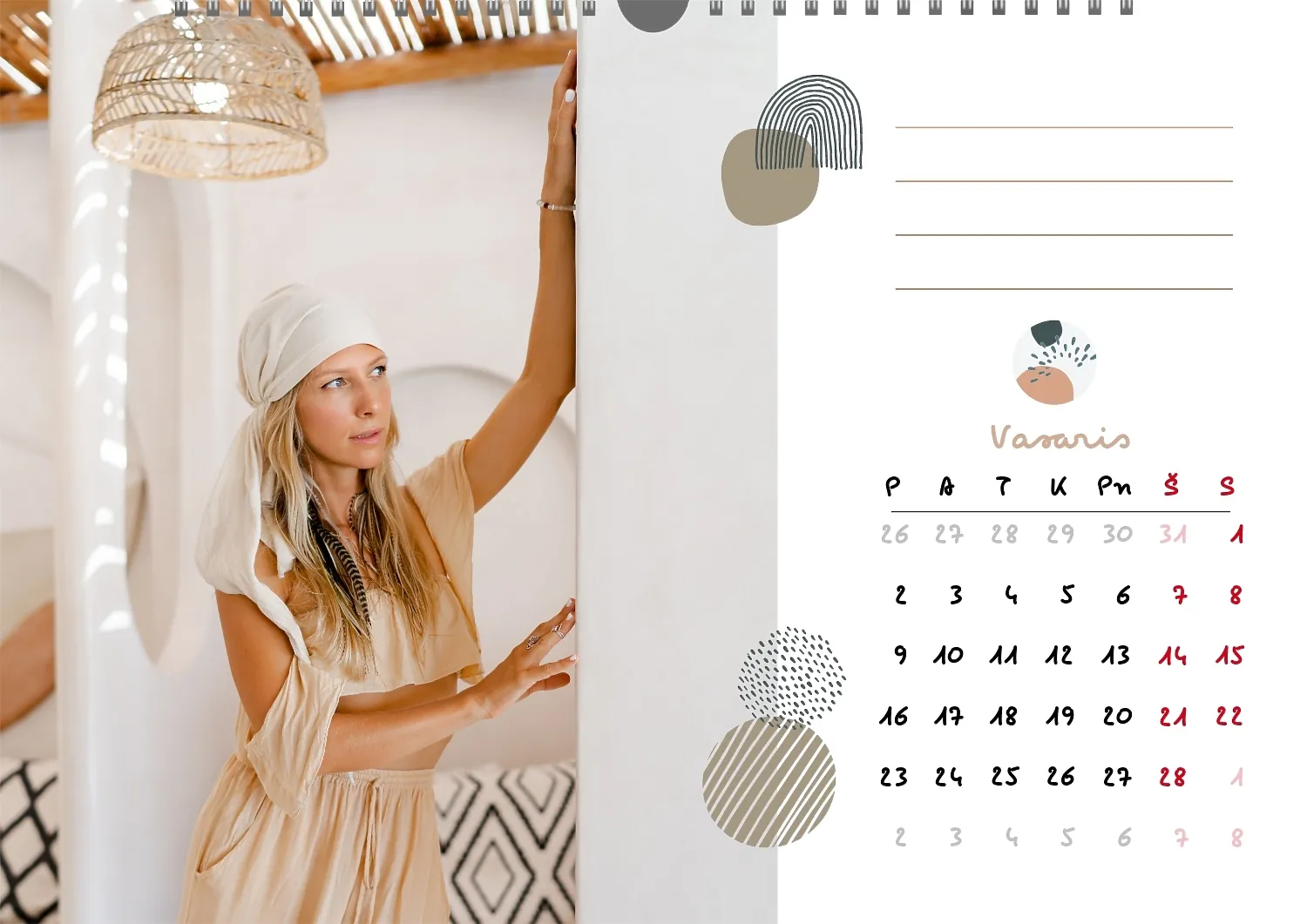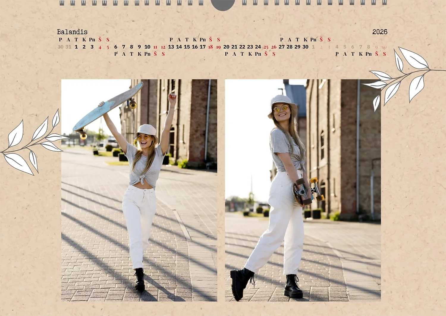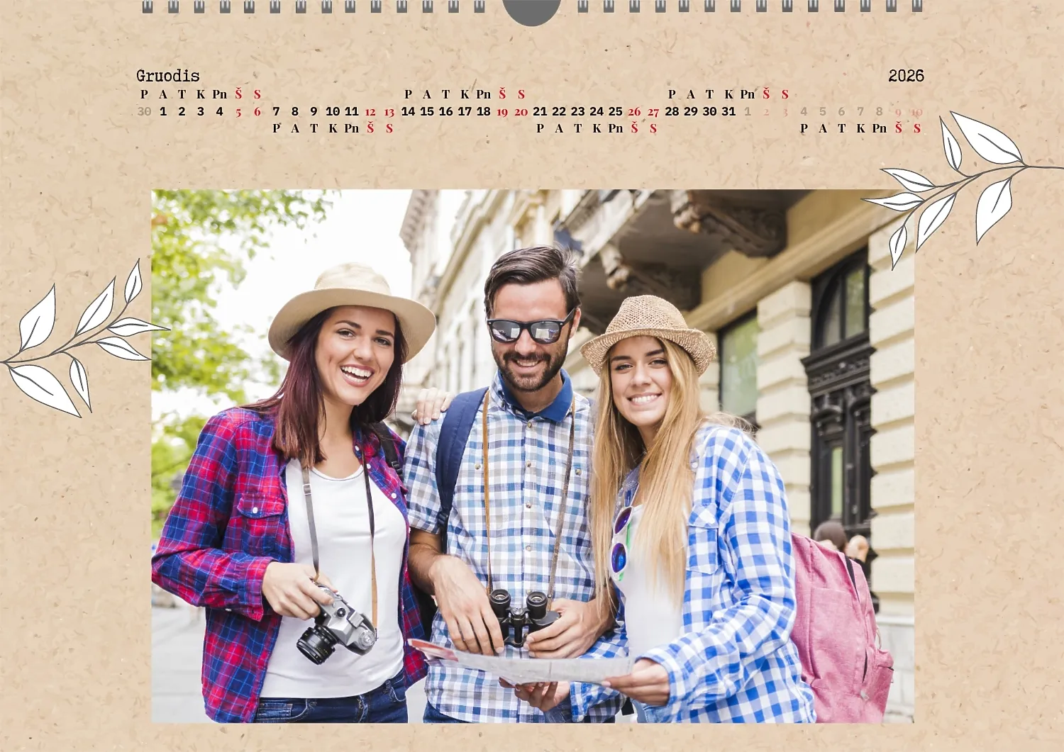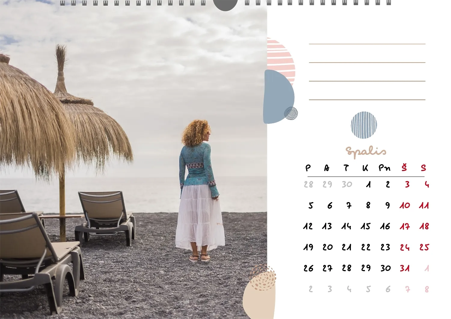 Gatavas horizontalaus kalendoriaus "prisiminimai" šablonas sukurtas tiems, kurie vertina šiltus momentus ir nori juos išsaugoti kasdieniame gyvenime. Jo minkšta kompozicija, šviesi paletė ir tvarkingos dekoratyvinės detalės leidžia pabrėžti šeimos komforto, kelionių, renginių ir brangių susitikimų atmosferą. Šis šablonas tinka tėvams, mokytojams, fotografams, kūrybinėms studijoms, mažų prekių ženklų savininkams, taip pat visiems, kurie nori sukurti asmenines ar darbo erdves su dvasiniu akcentu. Jis vienodai tinka tiek namuose, tiek biure — tiek studijoje-visur, kur svarbios emocijos ir vizualinė estetika. Internetiniame dizaineryje šis kalendorius gali būti lengvai pritaikytas prie jūsų stiliaus. Kiekvieną puslapį galima užpildyti savo nuotraukomis - nuo šeimos nuotraukų iki mokinių portretų ar renginių personalo. Parašai ir datos redaguojami: galite pakeisti mėnesių pavadinimus, pridėti svarbių įvykių, pažymėti gimtadienius, įsimintinas datas ar kultūrinius renginius savo organizacijoje. Užrašų šriftai ir spalvos taip pat nustatomi, kad kalendorius būtų ryškesnis, griežtesnis arba, atvirkščiai, kuo švelnesnis. Jei pageidaujate, galite pridėti įmonės logotipą, šūkį, kontaktinę informaciją arba palikti dizainą visiškai asmeninį ir namų dizainą.