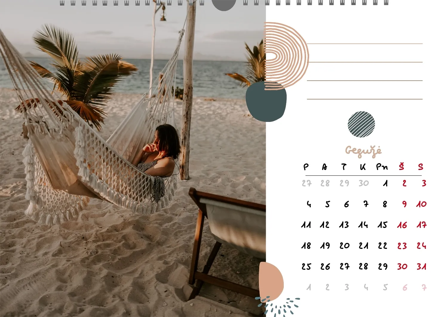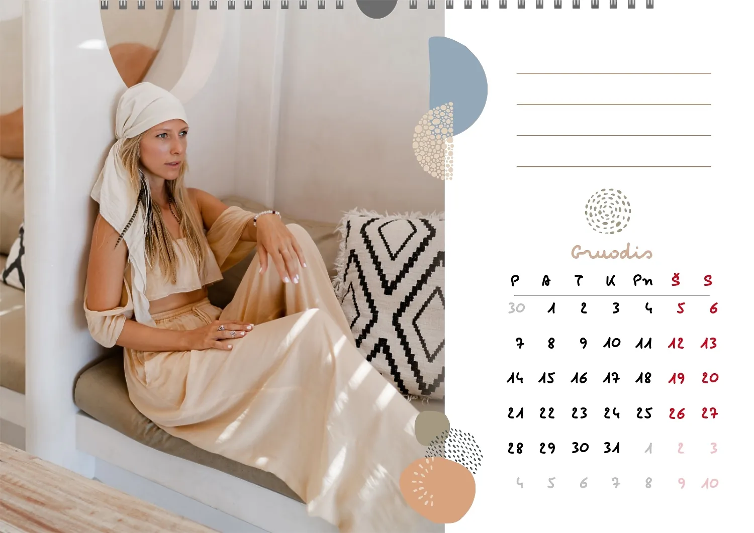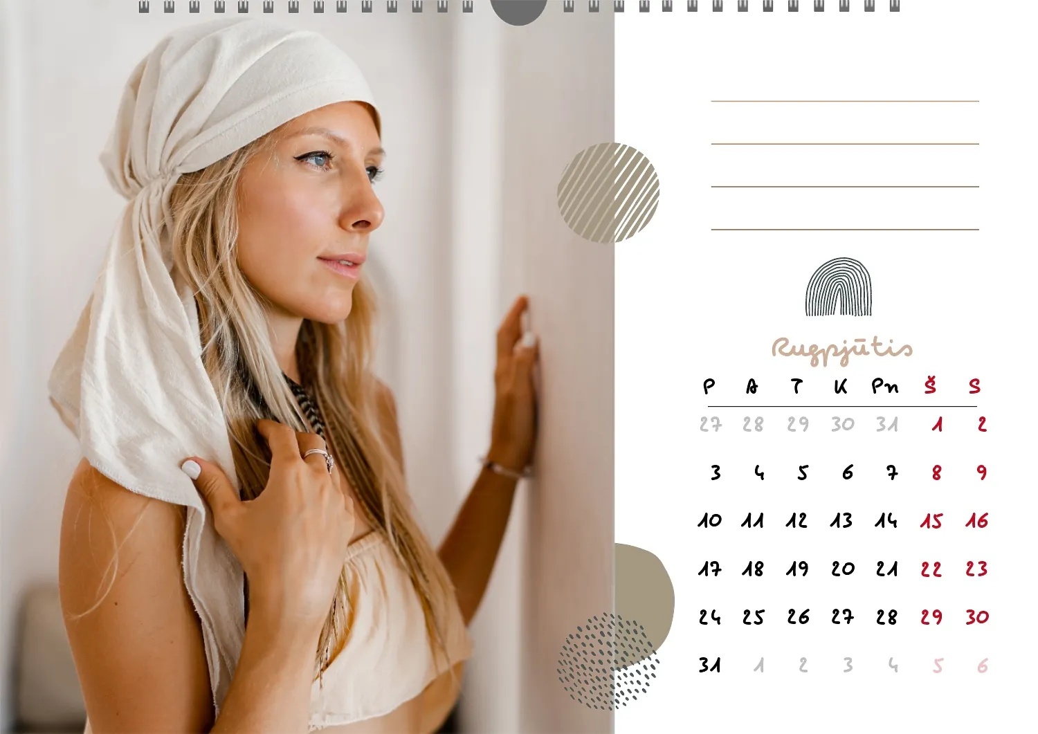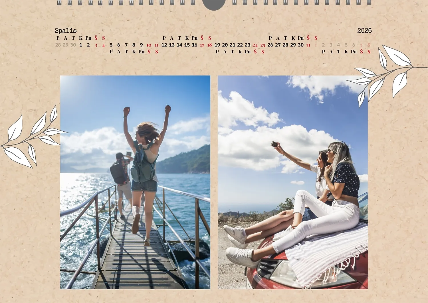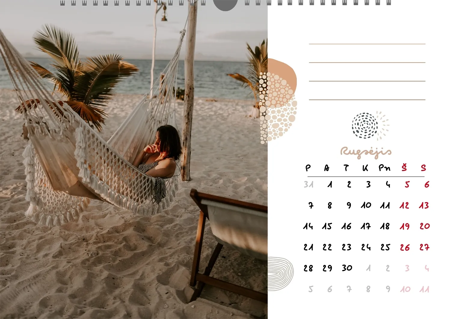 Gatavas horizontalaus kalendoriaus "prisiminimai" šablonas sukurtas tiems, kurie vertina šiltus momentus ir nori juos išsaugoti kasdieniame gyvenime. Jo minkšta kompozicija, šviesi paletė ir tvarkingos dekoratyvinės detalės leidžia pabrėžti šeimos komforto, kelionių, renginių ir brangių susitikimų atmosferą. Šis šablonas tinka tėvams, mokytojams, fotografams, kūrybinėms studijoms, mažų prekių ženklų savininkams, taip pat visiems, kurie nori sukurti asmenines ar darbo erdves su dvasiniu akcentu. Jis vienodai tinka tiek namuose, tiek biure — tiek studijoje-visur, kur svarbios emocijos ir vizualinė estetika. Internetiniame dizaineryje šis kalendorius gali būti lengvai pritaikytas prie jūsų stiliaus. Kiekvieną puslapį galima užpildyti savo nuotraukomis - nuo šeimos nuotraukų iki mokinių portretų ar renginių personalo. Parašai ir datos redaguojami: galite pakeisti mėnesių pavadinimus, pridėti svarbių įvykių, pažymėti gimtadienius, įsimintinas datas ar kultūrinius renginius savo organizacijoje. Užrašų šriftai ir spalvos taip pat nustatomi, kad kalendorius būtų ryškesnis, griežtesnis arba, atvirkščiai, kuo švelnesnis. Jei pageidaujate, galite pridėti įmonės logotipą, šūkį, kontaktinę informaciją arba palikti dizainą visiškai asmeninį ir namų dizainą.
