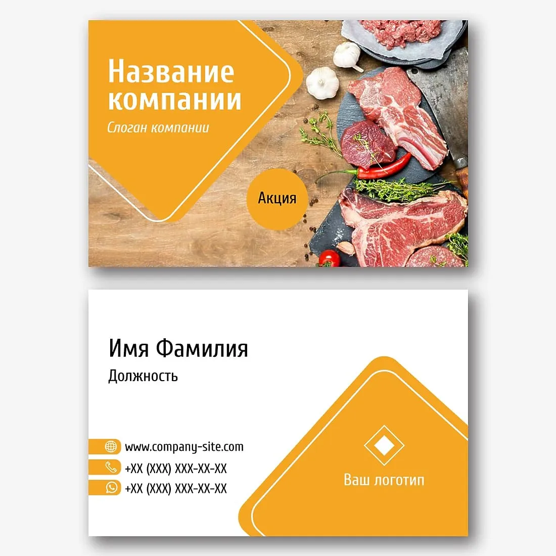 Бесплатный шаблон визитки поставщика мяса, мясного павильона, дистрибьютора мяса. Создайте макет своими руками в конструкторе визиток.