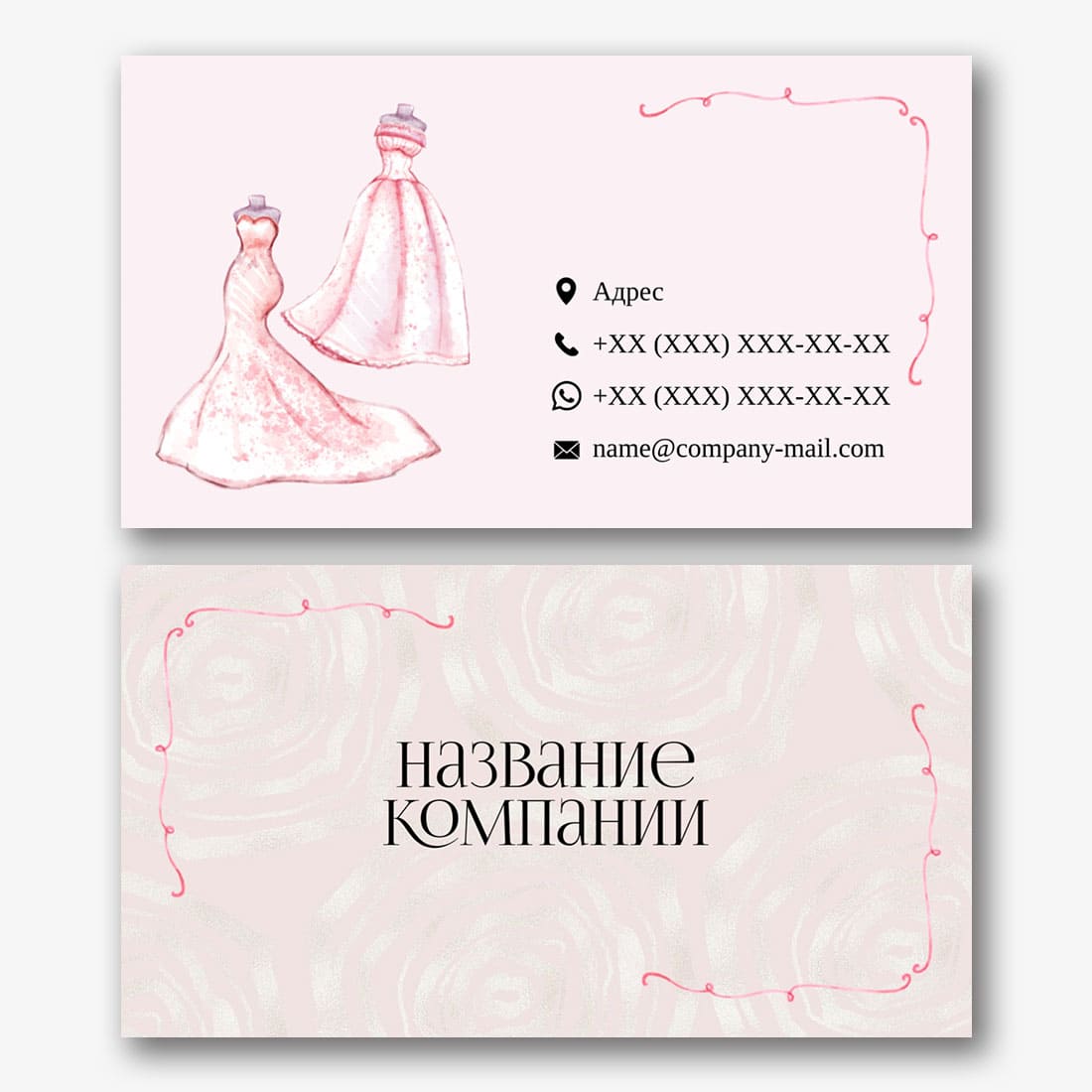Бесплатный шаблон визитки для свадебного салона, магазина свадебных платьев, проката свадебных платьев. Создайте макет своими руками в конструкторе визиток.