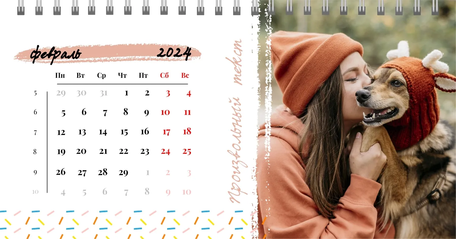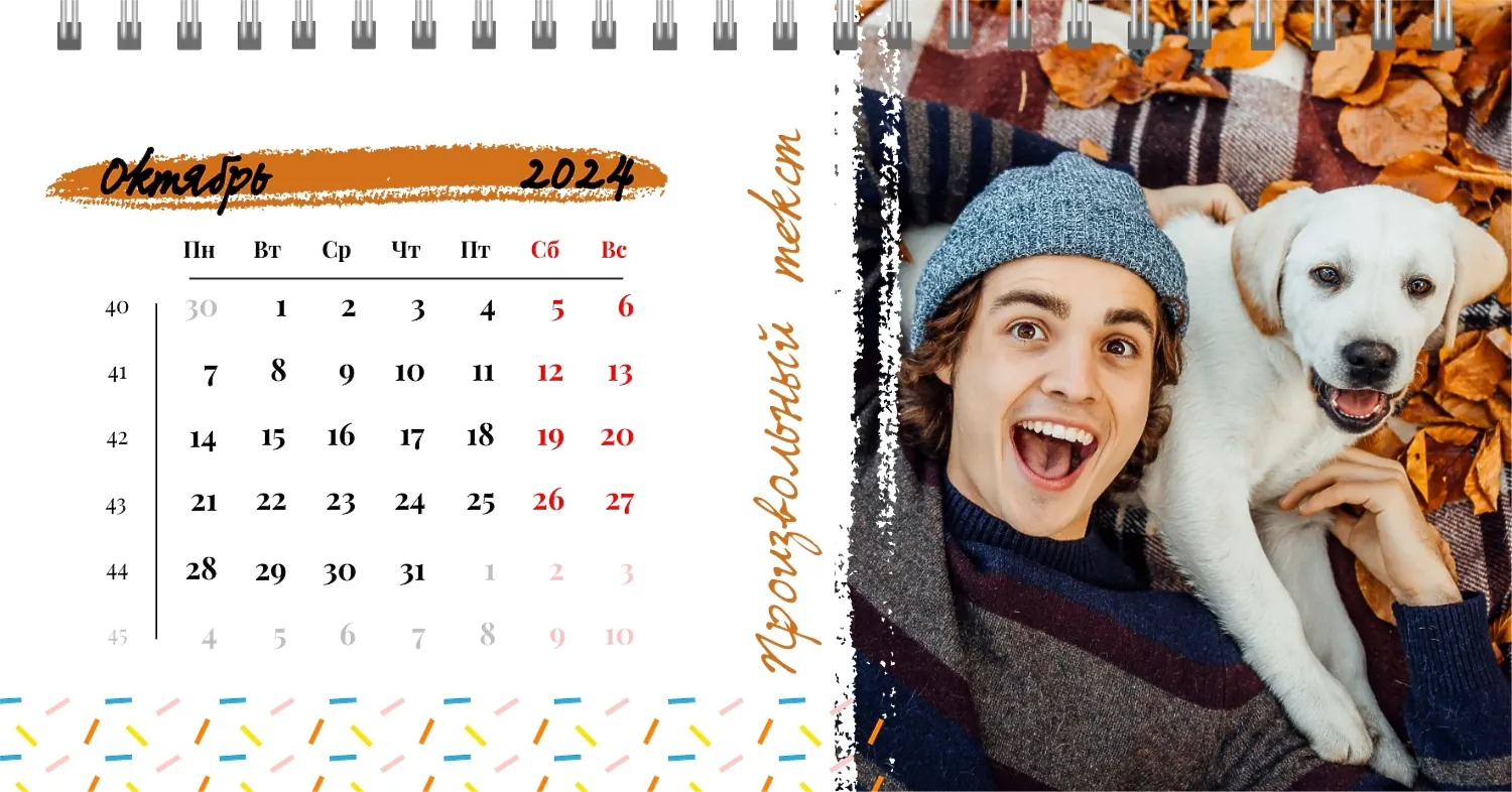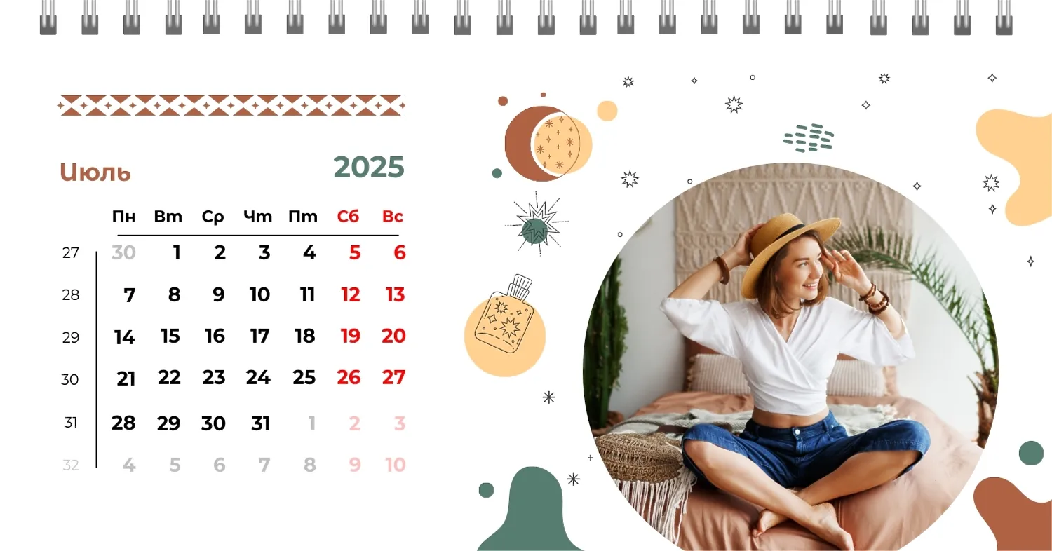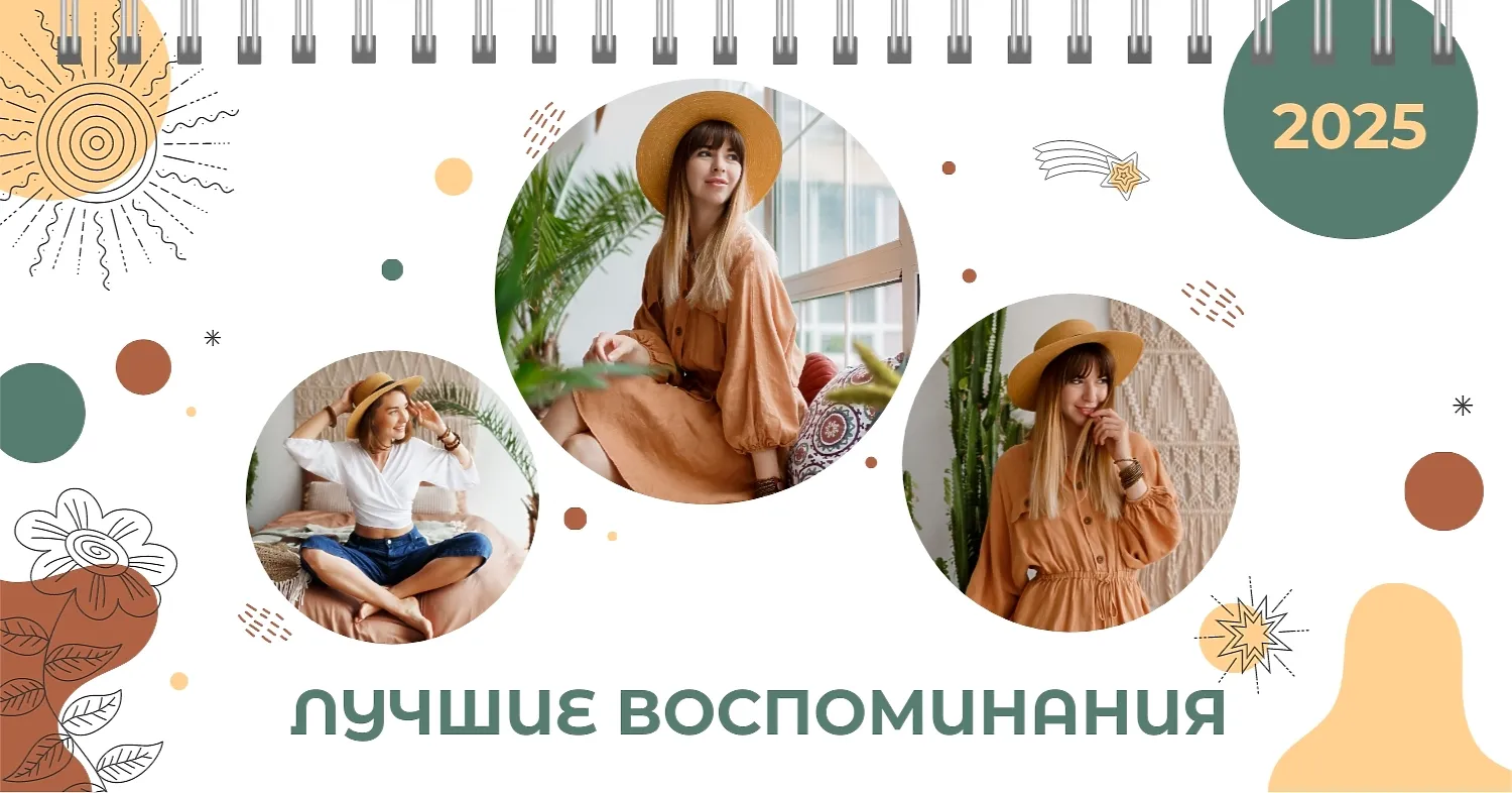 Шаблон "Лучшие воспоминания" для настольного горизонтального календаря в нашем онлайн-конструкторе предоставляет уникальную возможность создать яркий и персональный широкий календарь, который будет наполнен вашими самыми запоминающимися моментами. Весь дизайн ориентирован на визуализацию ваших лучших воспоминаний, чтобы каждый месяц приносил вам радость при взгляде на календарь. Цветовая палитра и стиль шрифтов также настраиваются по вашему вкусу, позволяя подчеркнуть тему и настроение ваших воспоминаний. Благодаря удобному интерфейсу конструктора, вы можете легко перетаскивать и изменять элементы дизайна, создавая календарь, который отражает ваш уникальный стиль.Создавайте свой календарь с нами, чтобы каждый день был наполнен вдохновением и воспоминаниями.