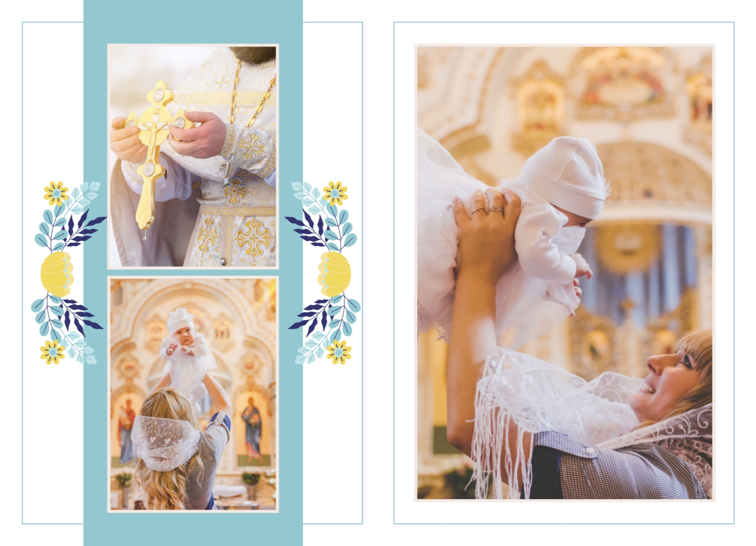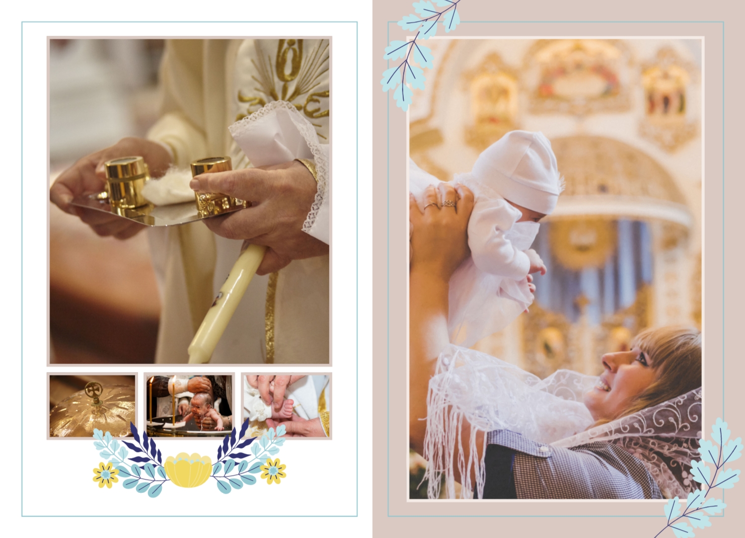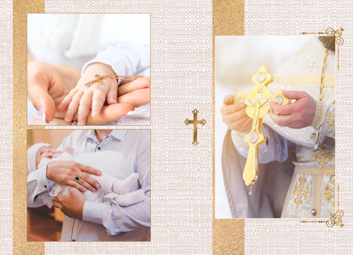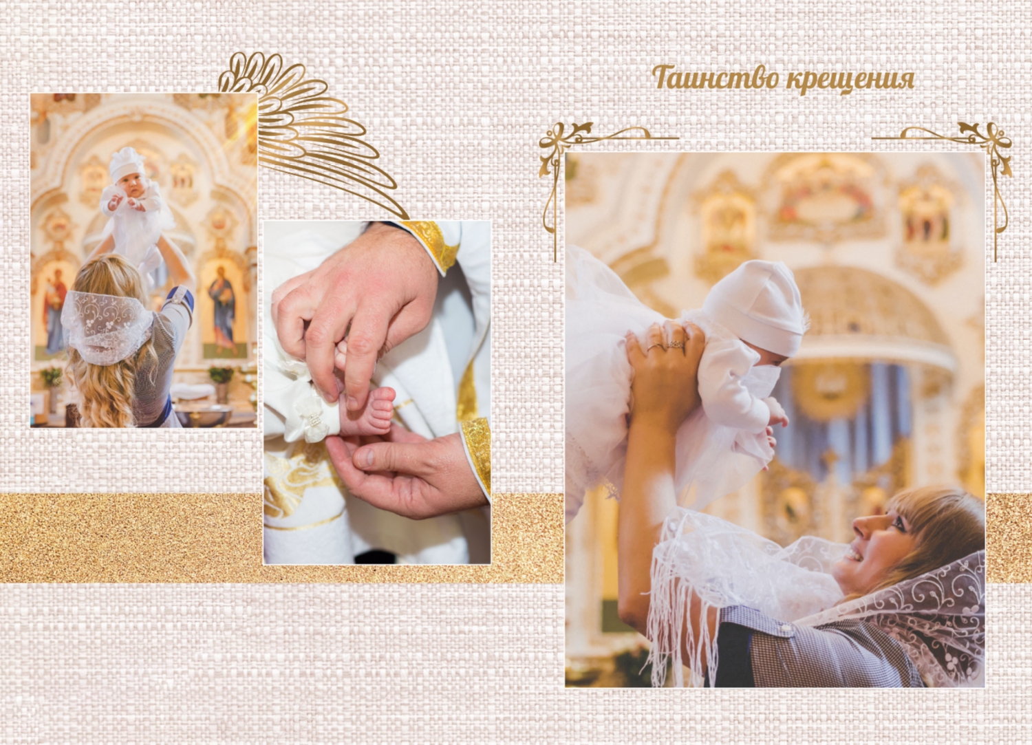 Готовый шаблон фотокниги в твердой обложке «Таинство Крещения» для девочки — это нежный и трогательный дизайн, который поможет сохранить в памяти один из самых важных дней в жизни ребенка. В оформлении преобладают светлые, пастельные оттенки, изящные узоры и символические элементы, такие как ангелы, свечи и крестики, создающие атмосферу духовности и торжественности. Такой шаблон идеально подойдет не только для родителей, желающих запечатлеть моменты Крещения своей дочери, но и для профессиональных фотографов, работающих с семейными и церковными фотосессиями, а также для церковных типографий и мастерских, занимающихся оформлением памятных альбомов. В онлайн-конструкторе этот вертикальный шаблон можно легко адаптировать под личные предпочтения. Каждая страница редактируется: можно изменить расположение фотографий, добавить новые снимки или убрать ненужные элементы. Тексты, подписи и стихи также поддаются настройке — можно выбрать другой шрифт, изменить размер букв или подобрать оттенки, которые лучше сочетаются с выбранными фотографиями. Кроме того, можно вставить имена крестных родителей, дату и место проведения Таинства, что придаст фотокниге уникальность и сделает ее по-настоящему персональной.