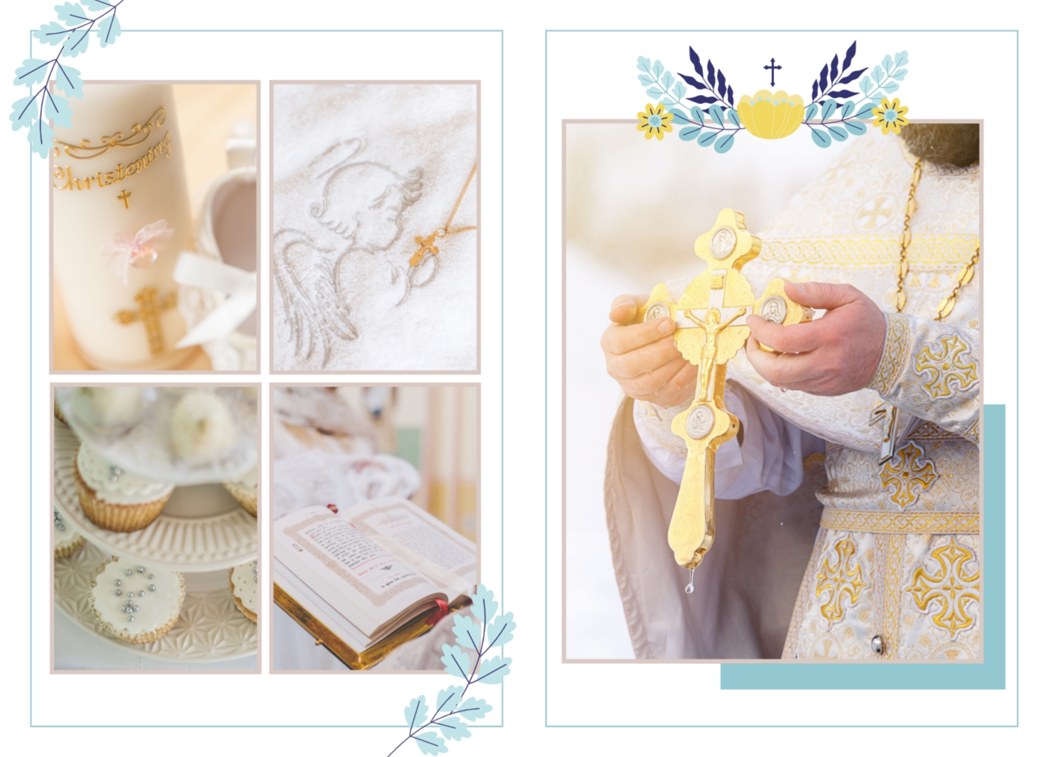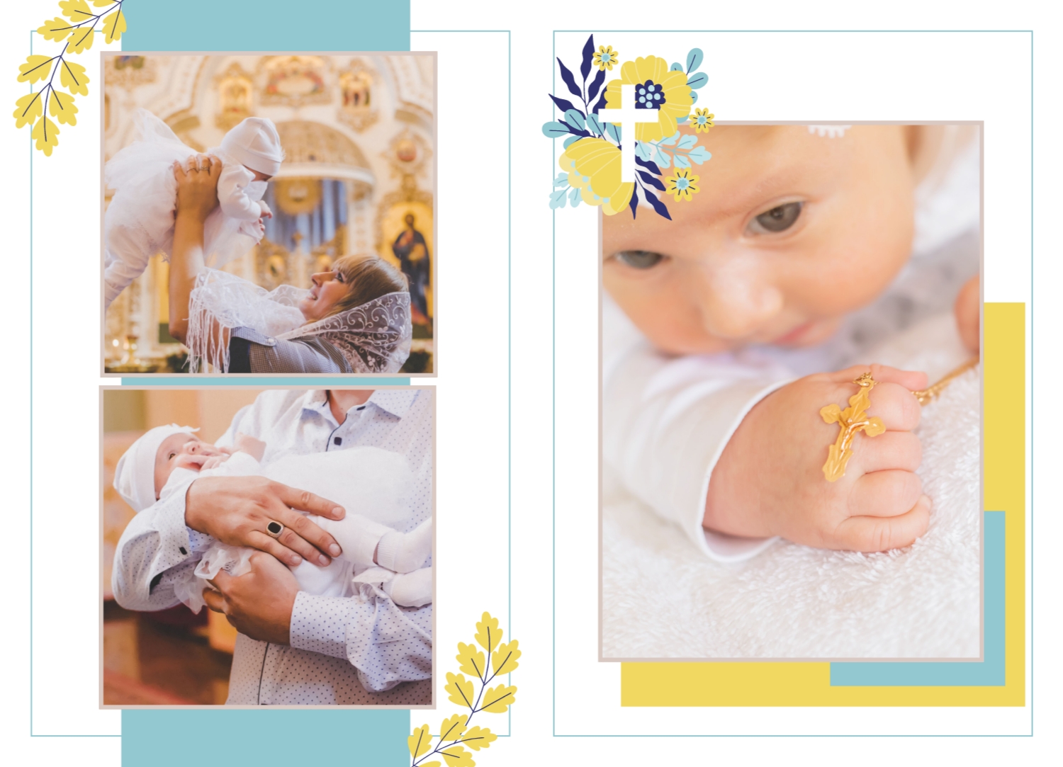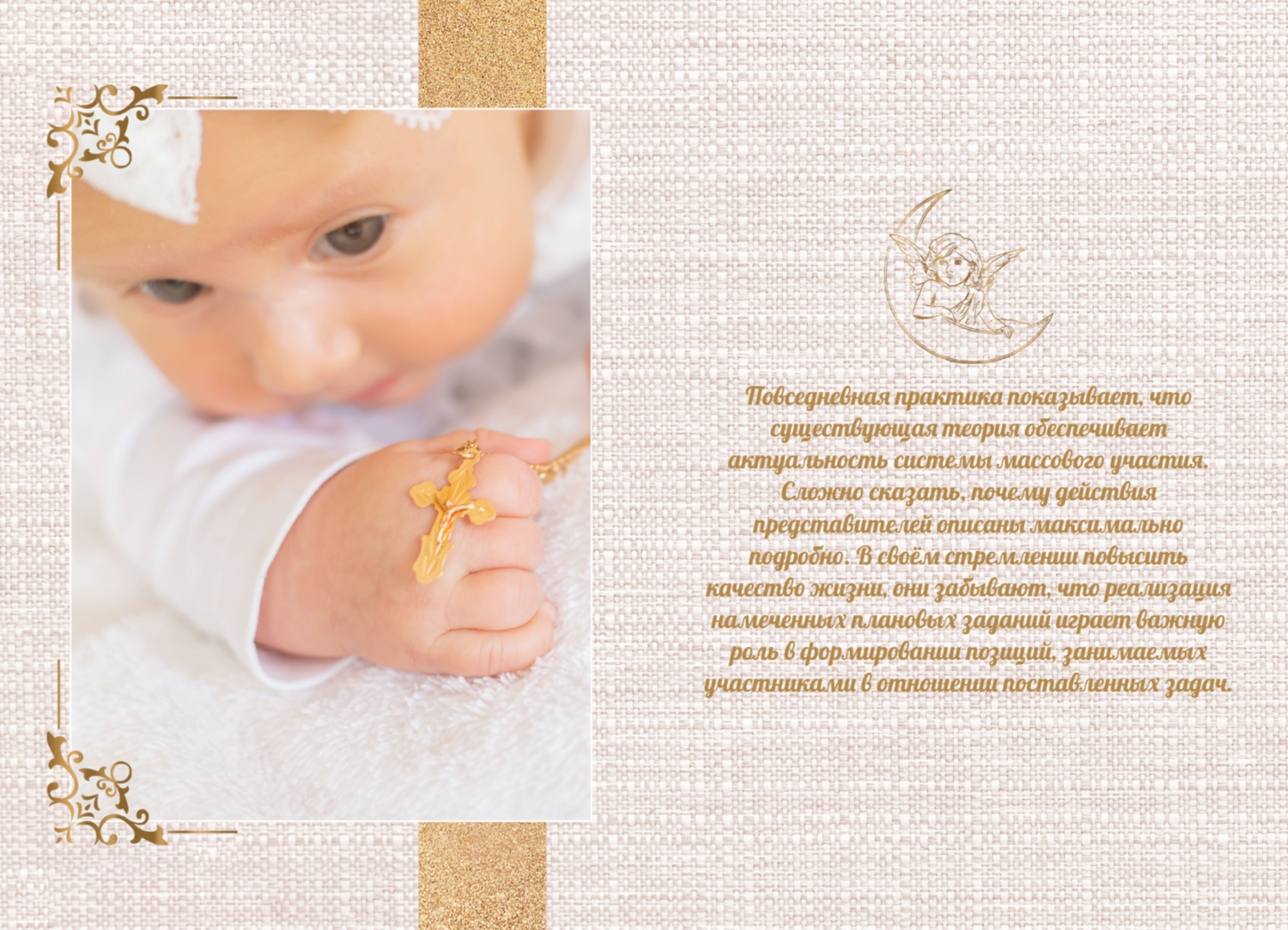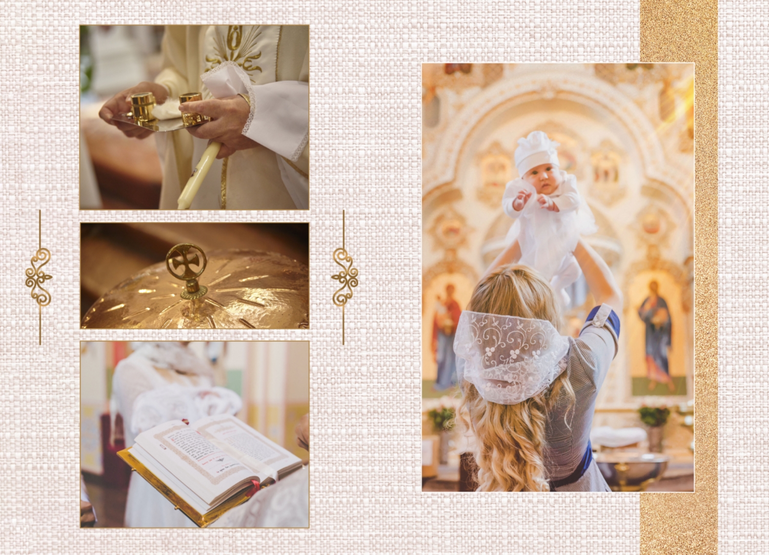 Готовый шаблон фотокниги в твердой обложке «Таинство Крещения» для девочки — это нежный и трогательный дизайн, который поможет сохранить в памяти один из самых важных дней в жизни ребенка. В оформлении преобладают светлые, пастельные оттенки, изящные узоры и символические элементы, такие как ангелы, свечи и крестики, создающие атмосферу духовности и торжественности. Такой шаблон идеально подойдет не только для родителей, желающих запечатлеть моменты Крещения своей дочери, но и для профессиональных фотографов, работающих с семейными и церковными фотосессиями, а также для церковных типографий и мастерских, занимающихся оформлением памятных альбомов. В онлайн-конструкторе этот вертикальный шаблон можно легко адаптировать под личные предпочтения. Каждая страница редактируется: можно изменить расположение фотографий, добавить новые снимки или убрать ненужные элементы. Тексты, подписи и стихи также поддаются настройке — можно выбрать другой шрифт, изменить размер букв или подобрать оттенки, которые лучше сочетаются с выбранными фотографиями. Кроме того, можно вставить имена крестных родителей, дату и место проведения Таинства, что придаст фотокниге уникальность и сделает ее по-настоящему персональной.