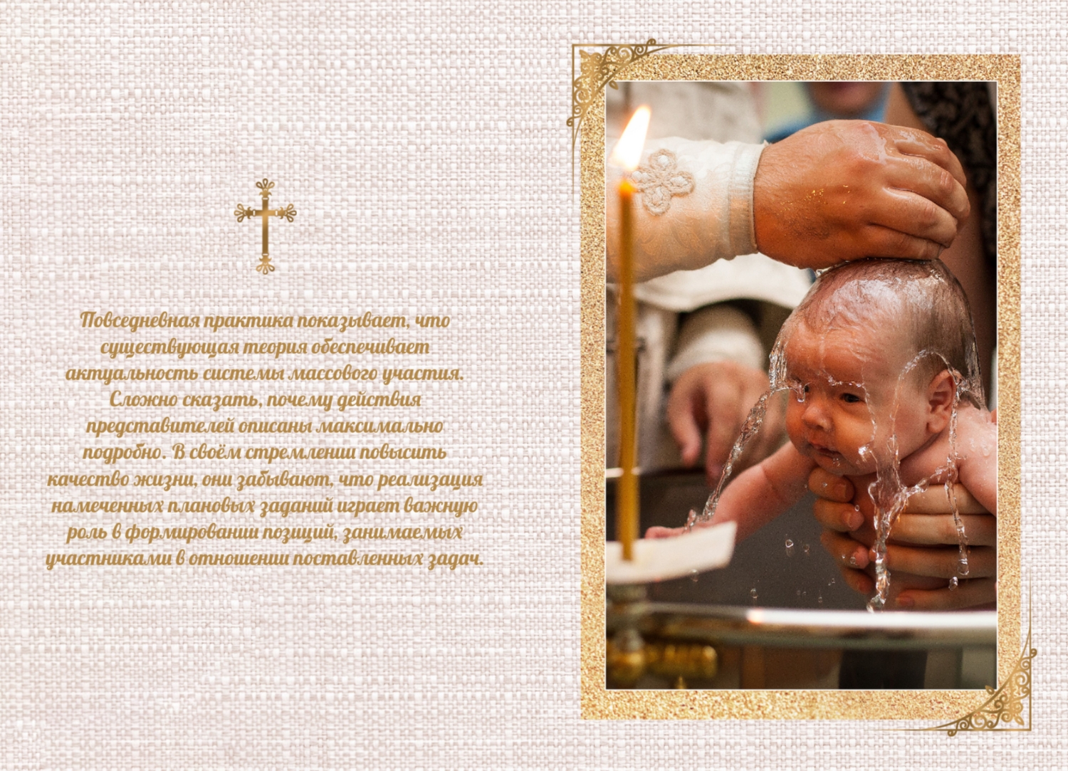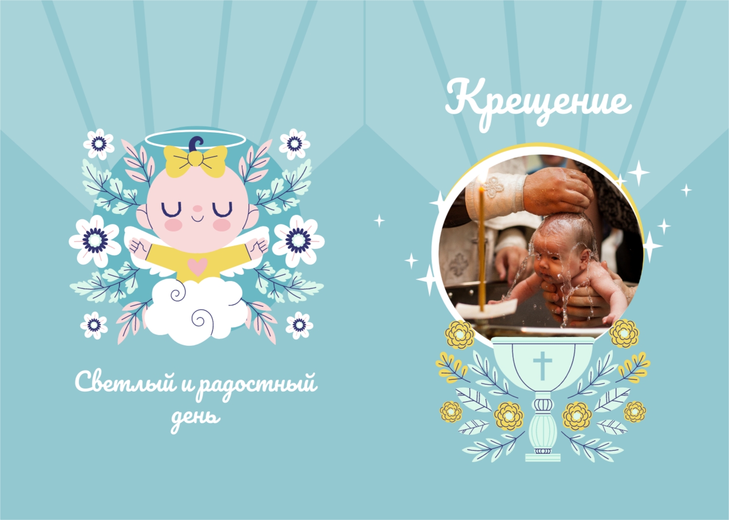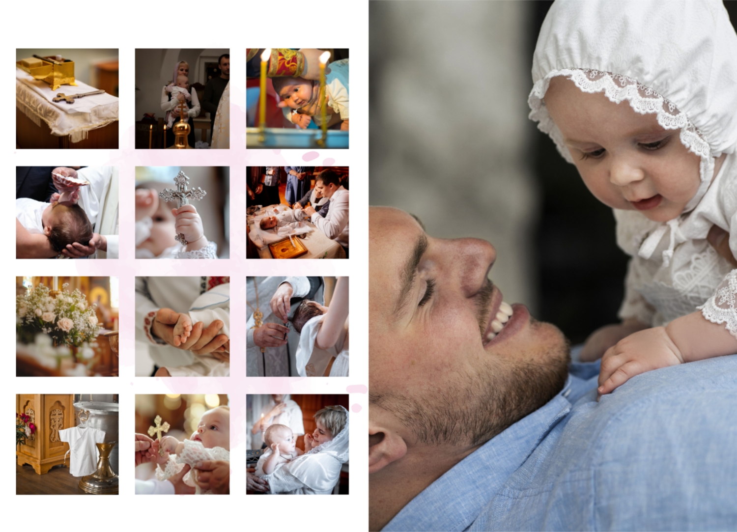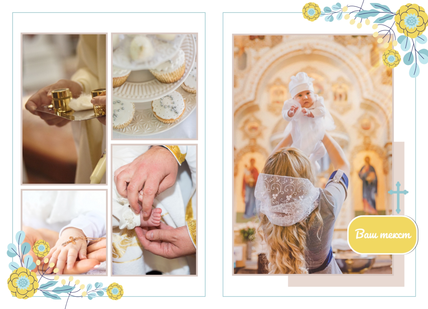 Готовый шаблон фотокниги в твердой обложке «Таинство Крещения» для девочки — это нежный и трогательный дизайн, который поможет сохранить в памяти один из самых важных дней в жизни ребенка. В оформлении преобладают светлые, пастельные оттенки, изящные узоры и символические элементы, такие как ангелы, свечи и крестики, создающие атмосферу духовности и торжественности. Такой шаблон идеально подойдет не только для родителей, желающих запечатлеть моменты Крещения своей дочери, но и для профессиональных фотографов, работающих с семейными и церковными фотосессиями, а также для церковных типографий и мастерских, занимающихся оформлением памятных альбомов. В онлайн-конструкторе этот вертикальный шаблон можно легко адаптировать под личные предпочтения. Каждая страница редактируется: можно изменить расположение фотографий, добавить новые снимки или убрать ненужные элементы. Тексты, подписи и стихи также поддаются настройке — можно выбрать другой шрифт, изменить размер букв или подобрать оттенки, которые лучше сочетаются с выбранными фотографиями. Кроме того, можно вставить имена крестных родителей, дату и место проведения Таинства, что придаст фотокниге уникальность и сделает ее по-настоящему персональной.