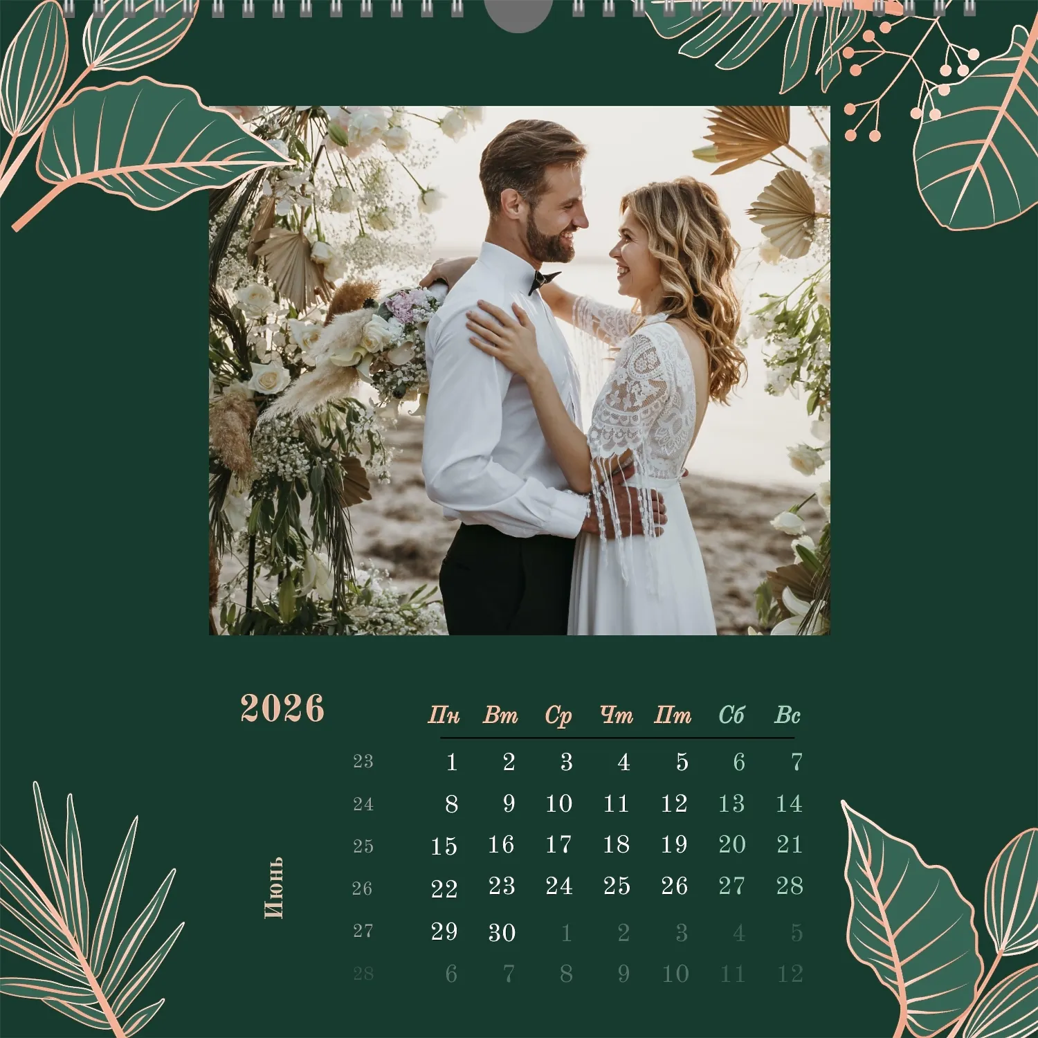 Готовый шаблон настенного квадратного календаря со свадебными фото — это универсальная основа, созданная специально для тех, кто хочет сохранить атмосферу торжества в красивом и функциональном формате. В онлайн-конструкторе этот шаблон полностью поддаётся редактированию, что позволяет адаптировать его под любую историю или стиль свадьбы. Можно заменить фон, изменять расположение фотографий, корректировать цветовую гамму, добавлять надписи, важные даты и индивидуальные пожелания. Все элементы легко перемещаются, масштабируются и подстраиваются под композицию — это делает процесс создания максимально удобным даже для тех, кто не имеет опыта в дизайне. При необходимости можно добавить декоративные элементы, фирменные шрифты или даже стилизовать макет под определённую тематику свадьбы, будь то классика, бохо, минимализм или винтаж. Используя наш онлайн-конструктор, можно создать по-настоящему уникальный настенный календарь, который станет красивым напоминанием о важном дне и будет радовать весь год.