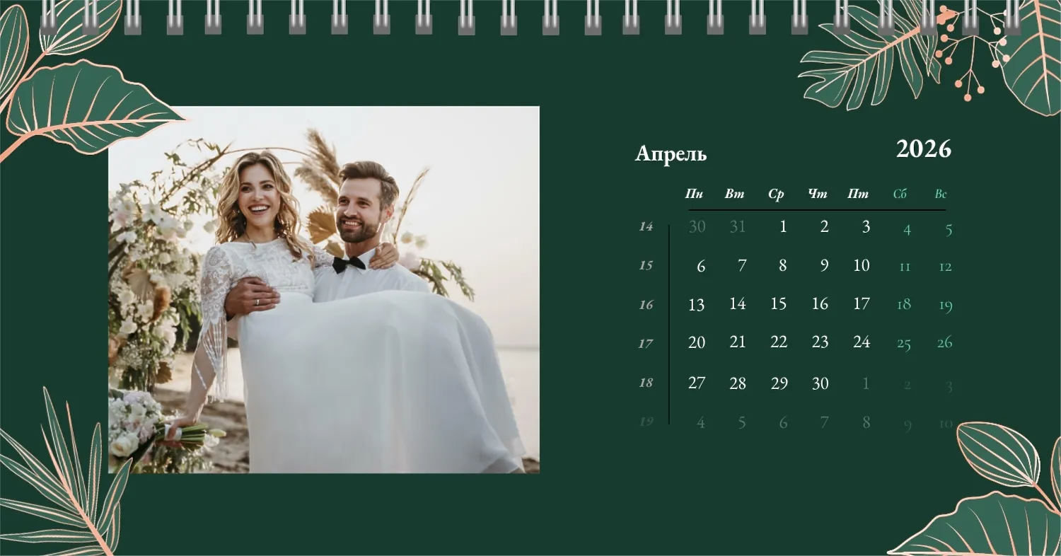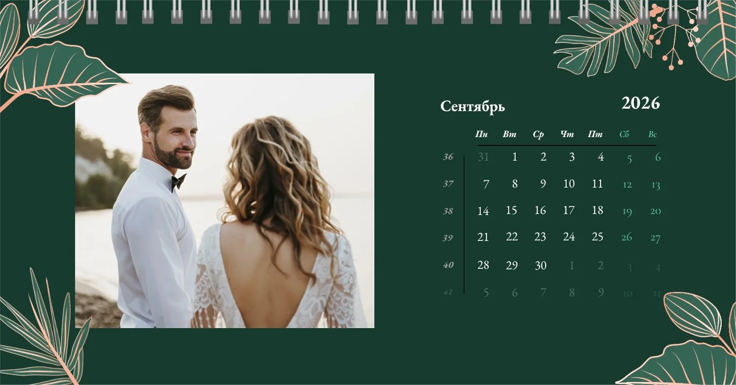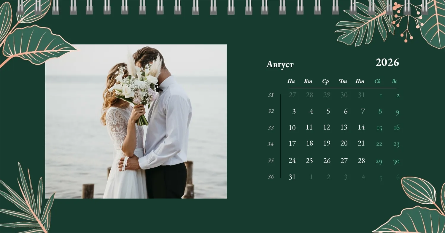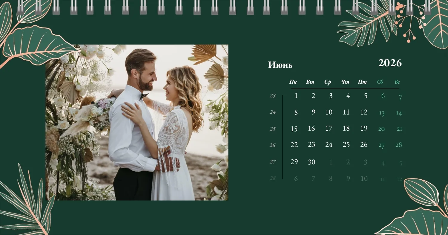 Готовый шаблон настольного перекидного горизонтального календаря со свадебными фото — это универсальная основа, созданная специально для тех, кто хочет сохранить атмосферу торжества в красивом и функциональном формате. Он особенно подходит фотографам, свадебным агентствам, декораторам, а также специалистам, которые создают персонализированные подарки или сувениры для молодожёнов. В онлайн-конструкторе этот шаблон полностью поддаётся редактированию, что позволяет адаптировать его под любую историю или стиль свадьбы. Можно заменить фон, изменять расположение фотографий, корректировать цветовую гамму, добавлять надписи, важные даты и индивидуальные пожелания. Все элементы легко перемещаются, масштабируются и подстраиваются под композицию — это делает процесс создания максимально удобным даже для тех, кто не имеет опыта в дизайне. При необходимости можно добавить декоративные элементы, фирменные шрифты или даже стилизовать макет под определённую тематику свадьбы, будь то классика, бохо, минимализм или винтаж.