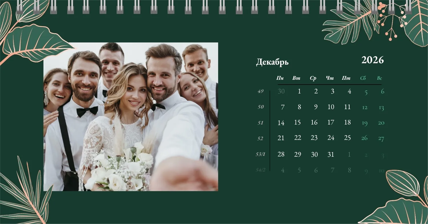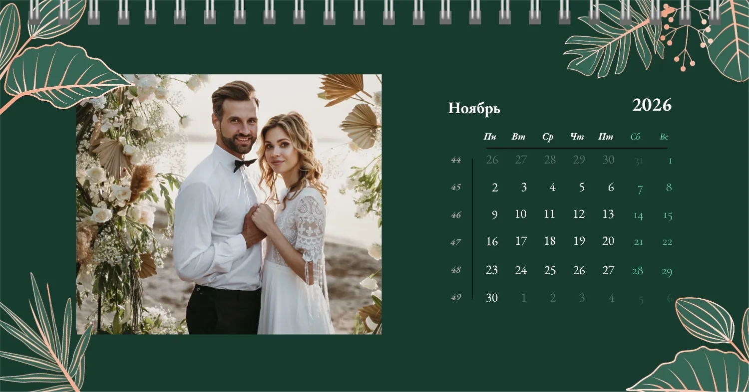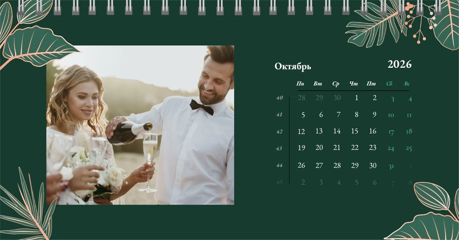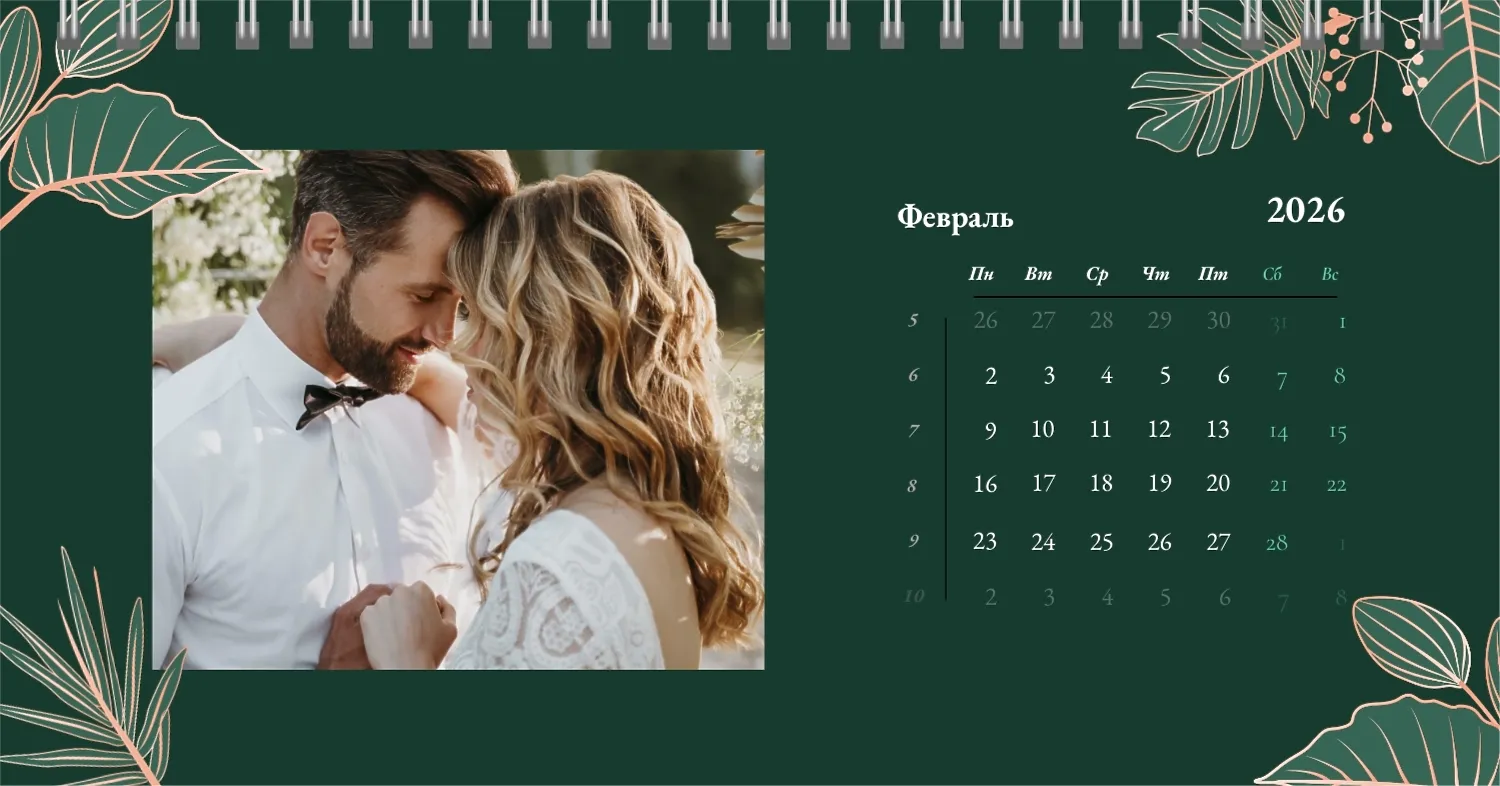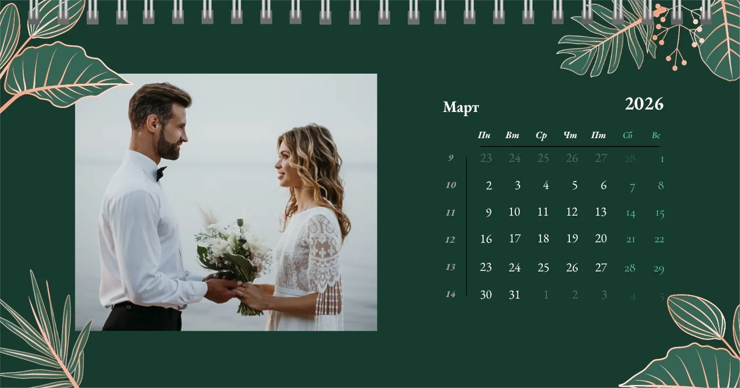 Готовый шаблон настольного перекидного горизонтального календаря со свадебными фото — это универсальная основа, созданная специально для тех, кто хочет сохранить атмосферу торжества в красивом и функциональном формате. Он особенно подходит фотографам, свадебным агентствам, декораторам, а также специалистам, которые создают персонализированные подарки или сувениры для молодожёнов. В онлайн-конструкторе этот шаблон полностью поддаётся редактированию, что позволяет адаптировать его под любую историю или стиль свадьбы. Можно заменить фон, изменять расположение фотографий, корректировать цветовую гамму, добавлять надписи, важные даты и индивидуальные пожелания. Все элементы легко перемещаются, масштабируются и подстраиваются под композицию — это делает процесс создания максимально удобным даже для тех, кто не имеет опыта в дизайне. При необходимости можно добавить декоративные элементы, фирменные шрифты или даже стилизовать макет под определённую тематику свадьбы, будь то классика, бохо, минимализм или винтаж.