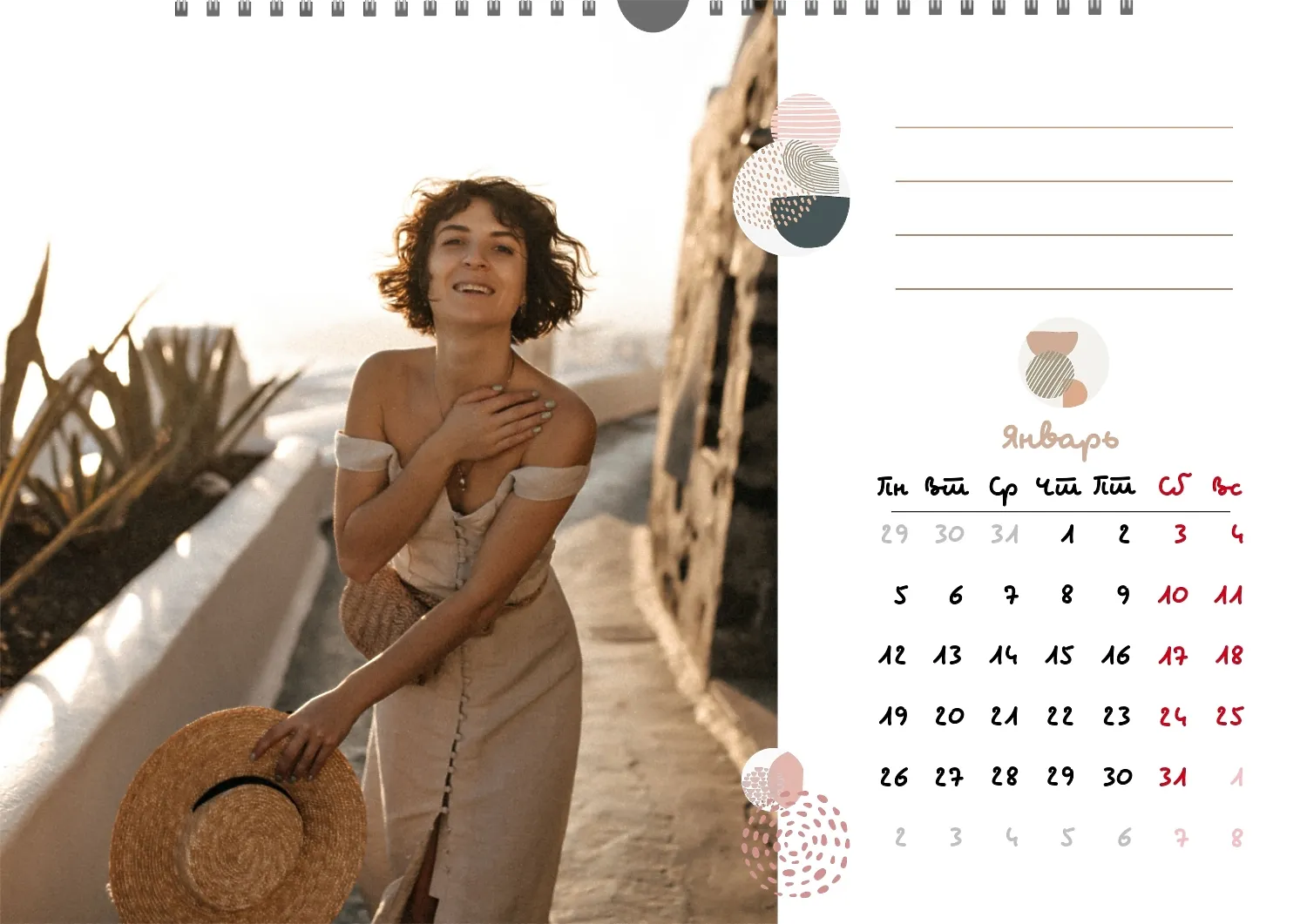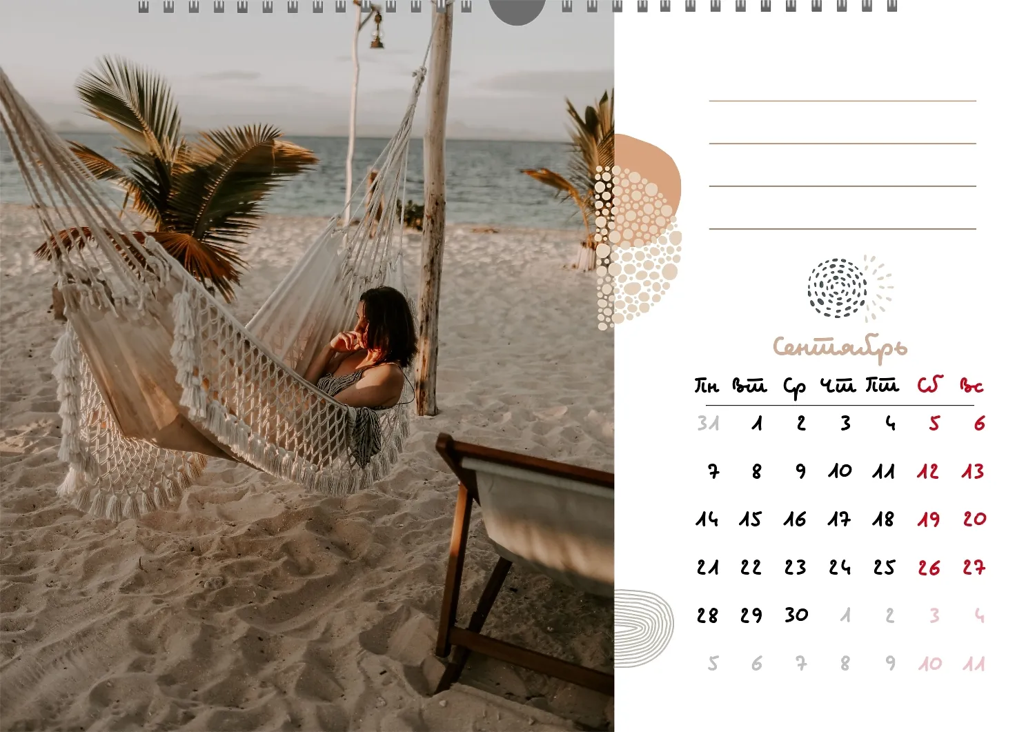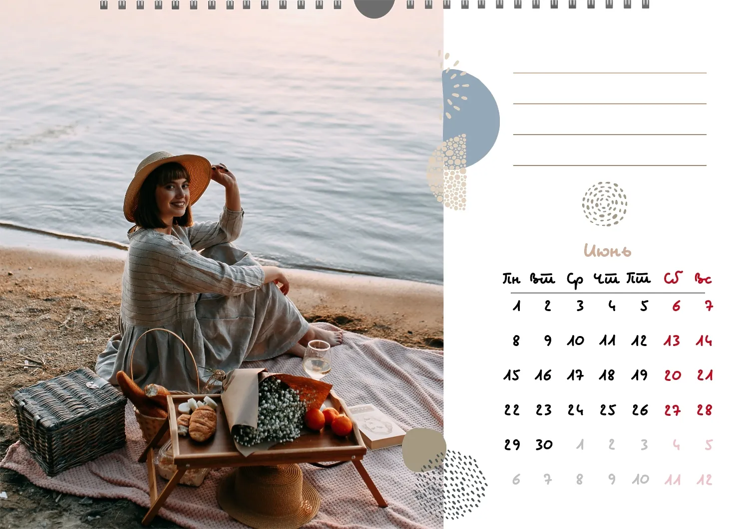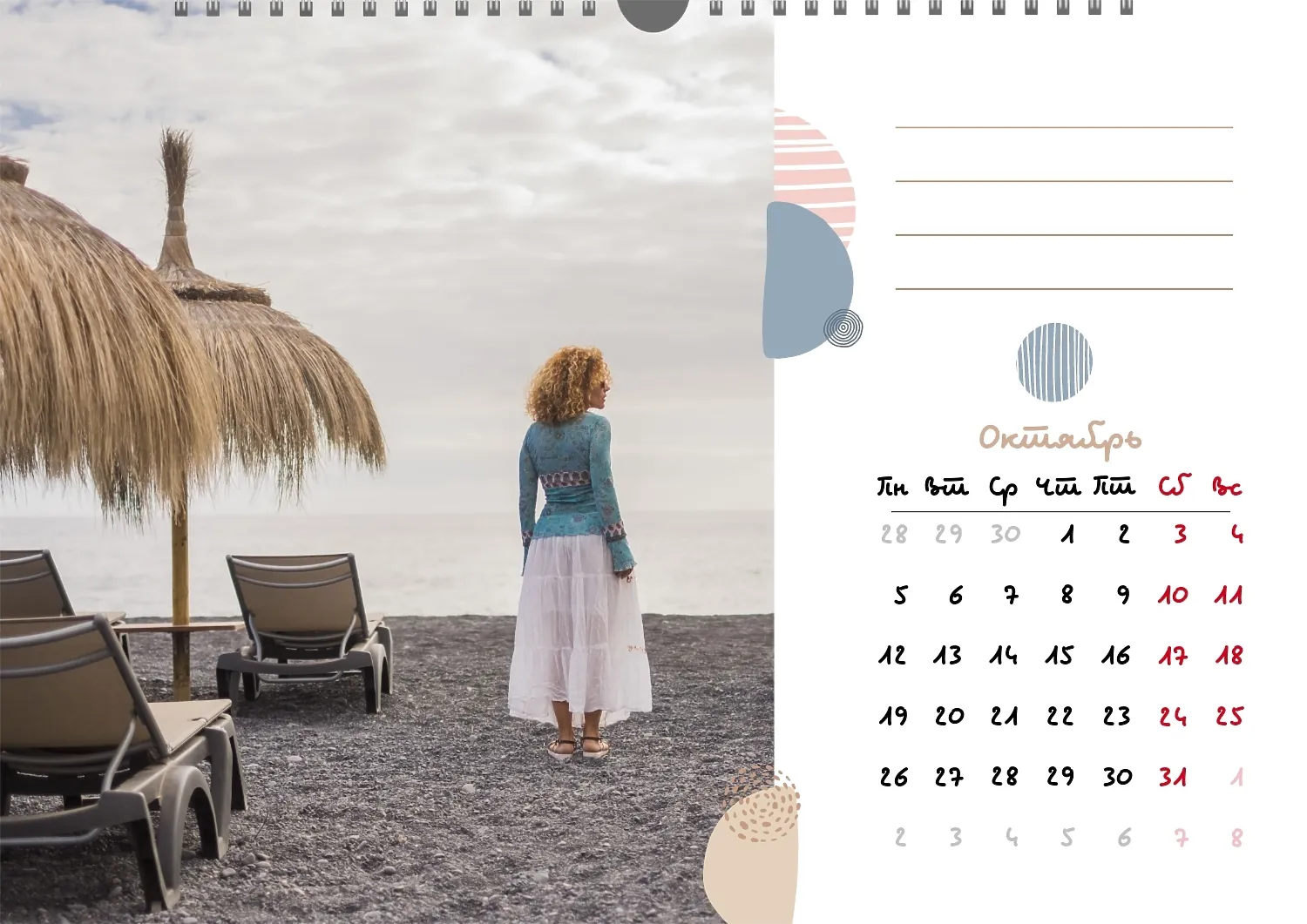 Готовый шаблон настенного горизонтального календаря «Воспоминания» создан для тех, кто ценит теплые моменты и хочет сохранить их в повседневной жизни. Его мягкая композиция, светлая палитра и аккуратные декоративные детали позволяют подчеркнуть атмосферу семейного уюта, путешествий, событий и дорогих сердцу встреч. Такой шаблон подходит родителям, учителям, фотографам, творческим студиям, владельцам небольших брендов, а также всем, кто хочет оформить личные или рабочие пространства с душевным акцентом. Он одинаково уместен и дома, и в офисе, и в студии — везде, где важны эмоции и визуальная эстетика. В онлайн-конструкторе этот календарь можно легко адаптировать под свой стиль. Каждую страницу можно наполнить собственными фотографиями — от семейных снимков до портретов учеников или кадров с мероприятий. Подписи и даты редактируются: вы можете изменить названия месяцев, добавить важные события, выделить дни рождения, памятные даты или культурные мероприятия вашей организации. Шрифты и цвета надписей также настраиваются, позволяя сделать календарь более ярким, более строгим или, наоборот, максимально нежным. При желании можно добавить логотип компании, слоган, контактную информацию или оставить дизайн полностью личным и домашним.